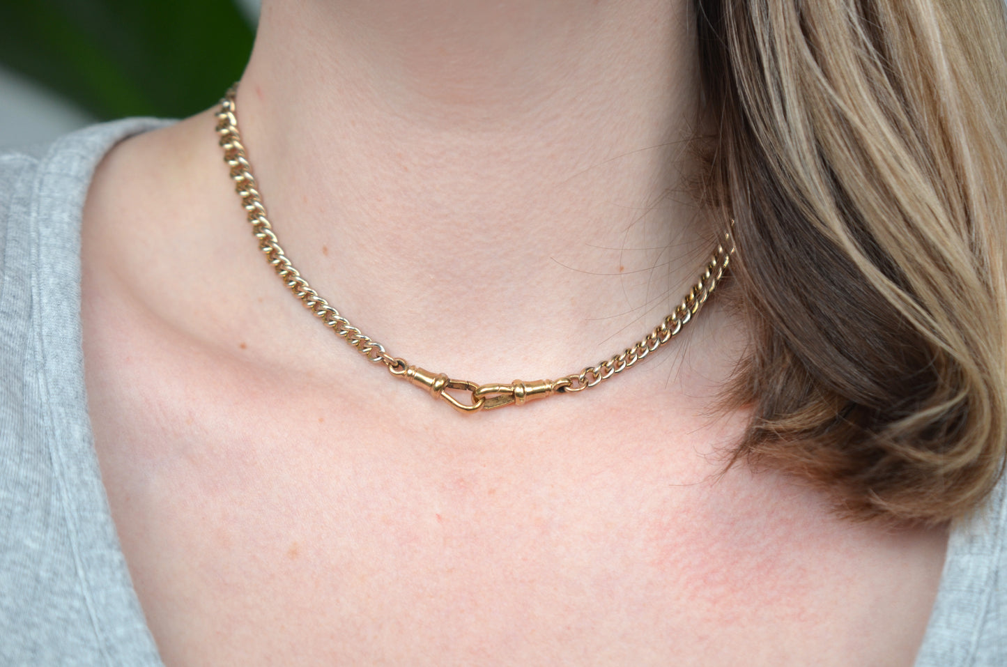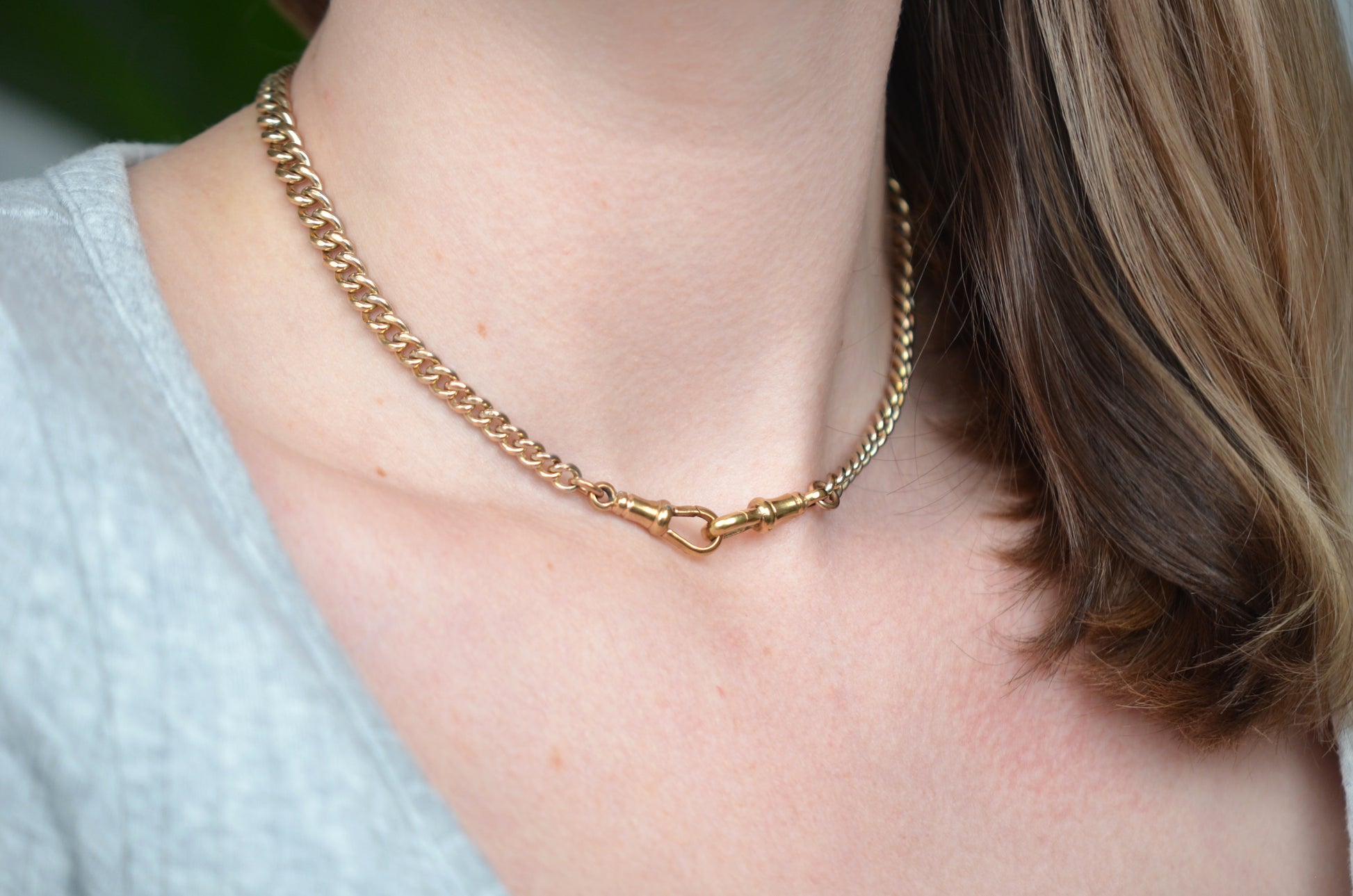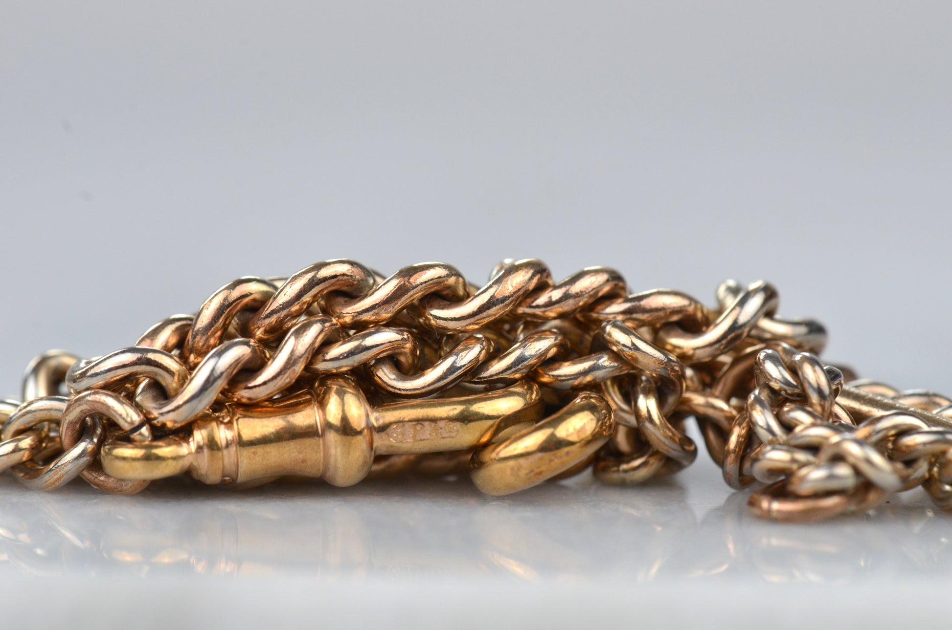 A gorgeous antique double Albert chain, these are a challenge to find in lengths long enough to wear as necklaces - and at affordable prices! Originally intended for use as watch chains, the t-bar was meant to slide through a vest's buttonhole to anchor the chain, while dogclips at either end were used to secure pocket watches, fobs, keys and the like. While they can certainly still be worn in this way today, we also love to use them as necklaces now - the dogclips perfect to attach charms alone or on a charm ring. Crafted in rolled gold - extremely common for chains (especially men's chains) in the early 20th century, the gold plate is mechanically fused to a base metal core (rather than thinly deposited as in plating). This piece was certainly heavily worn and loved - much of the gold layer has worn away, but combined with the soft patina it still has a lovely tone.