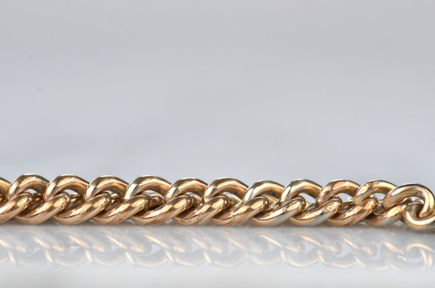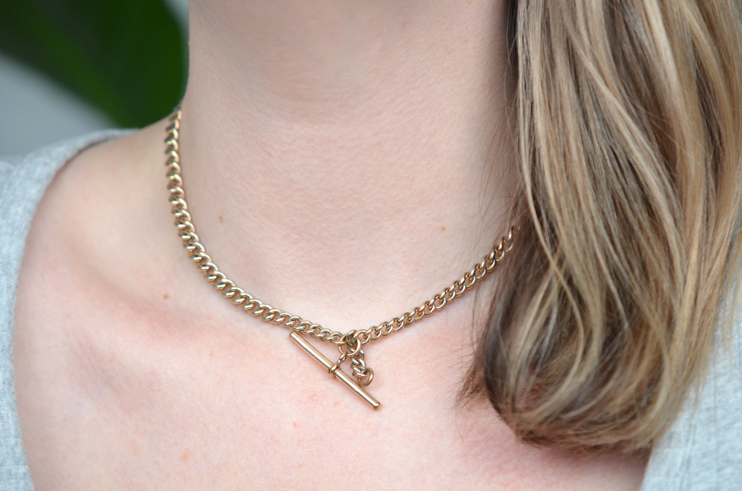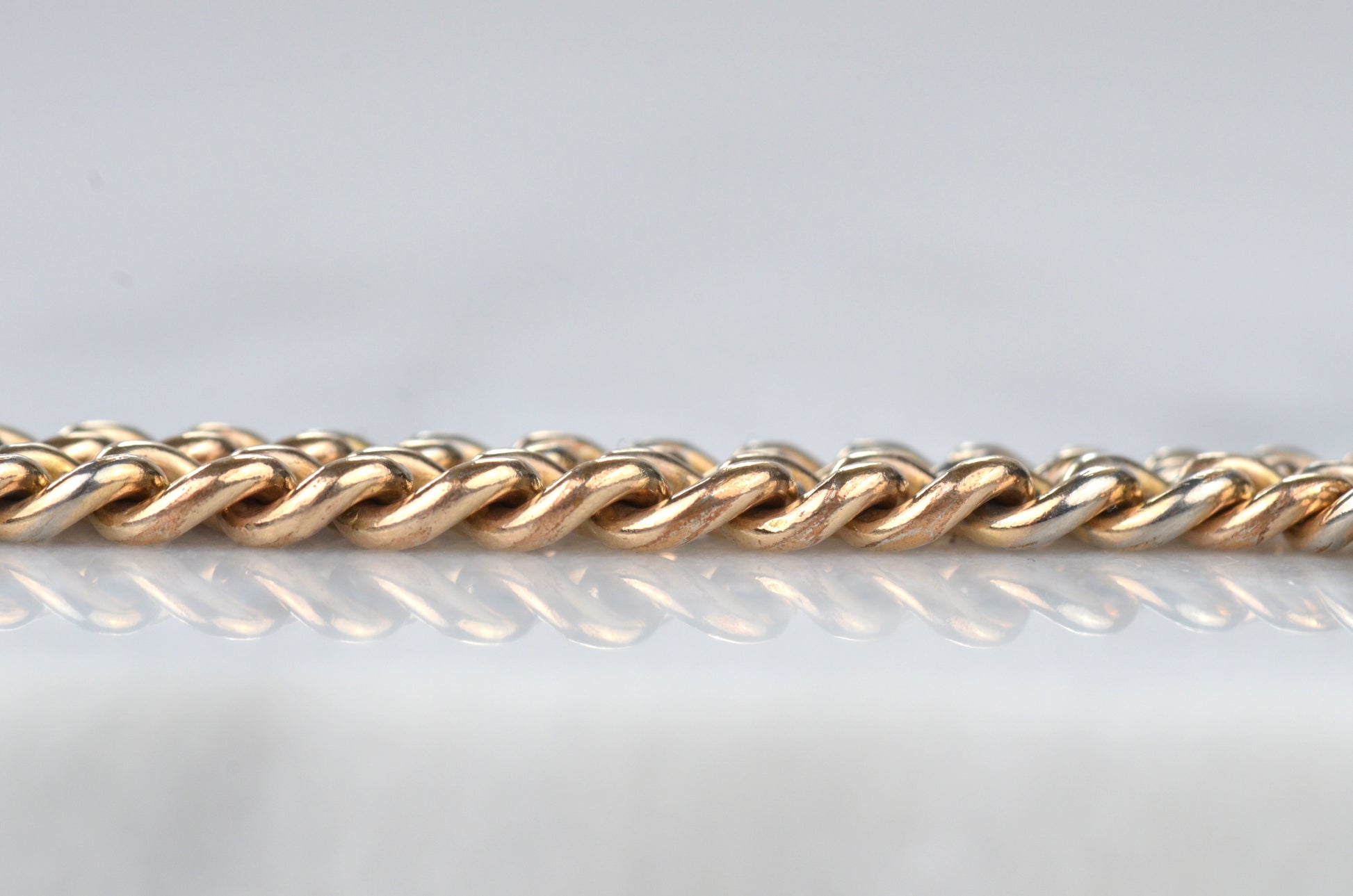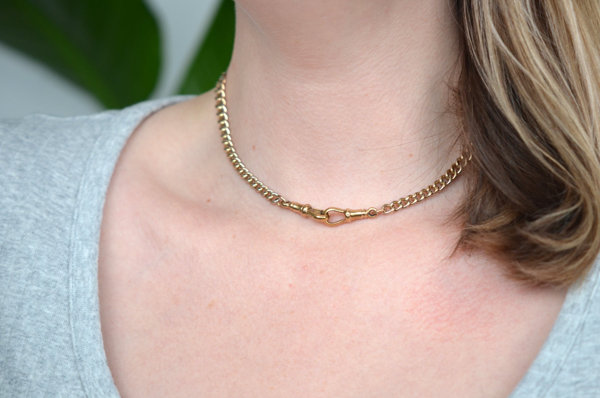 A gorgeous antique double Albert chain, these are a challenge to find in lengths long enough to wear as necklaces - and at affordable prices! Originally intended for use as watch chains, the t-bar was meant to slide through a vest's buttonhole to anchor the chain, while dogclips at either end were used to secure pocket watches, fobs, keys and the like. While they can certainly still be worn in this way today, we also love to use them as necklaces now - the dogclips perfect to attach charms alone or on a charm ring. Crafted in rolled gold - extremely common for chains (especially men's chains) in the early 20th century, the gold plate is mechanically fused to a base metal core (rather than thinly deposited as in plating). This piece was certainly heavily worn and loved - much of the gold layer has worn away, but combined with the soft patina it still has a lovely tone.