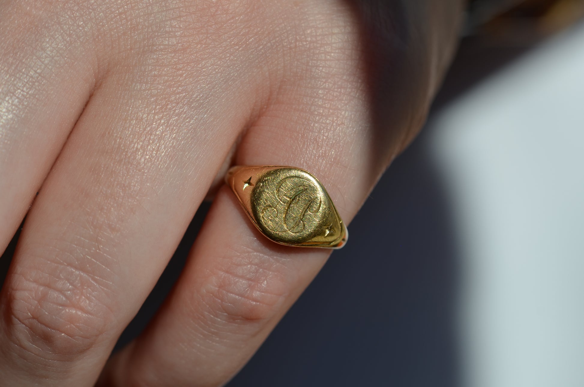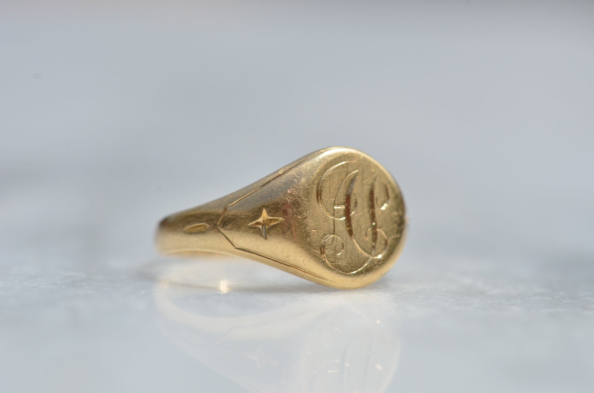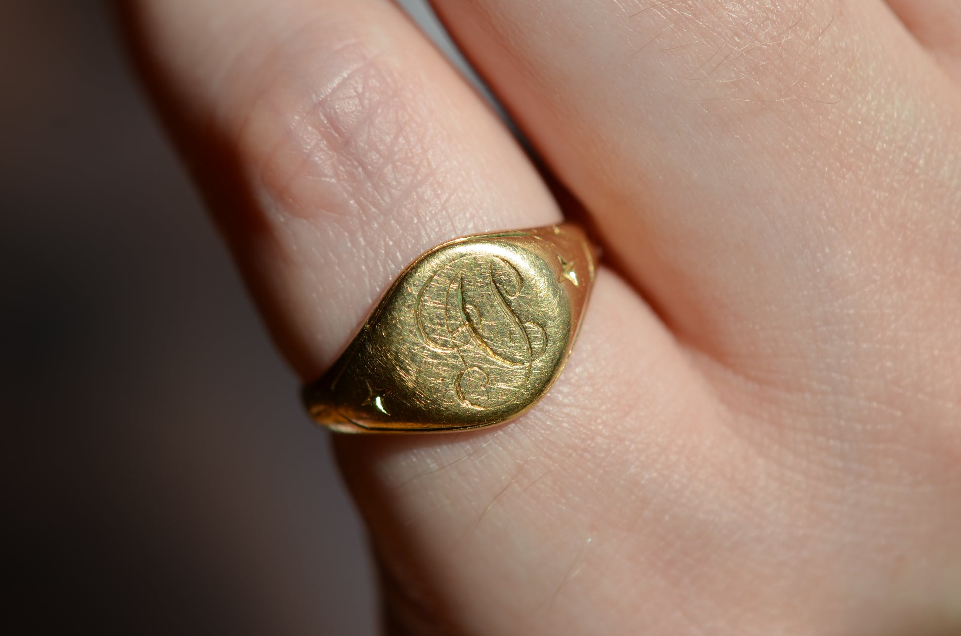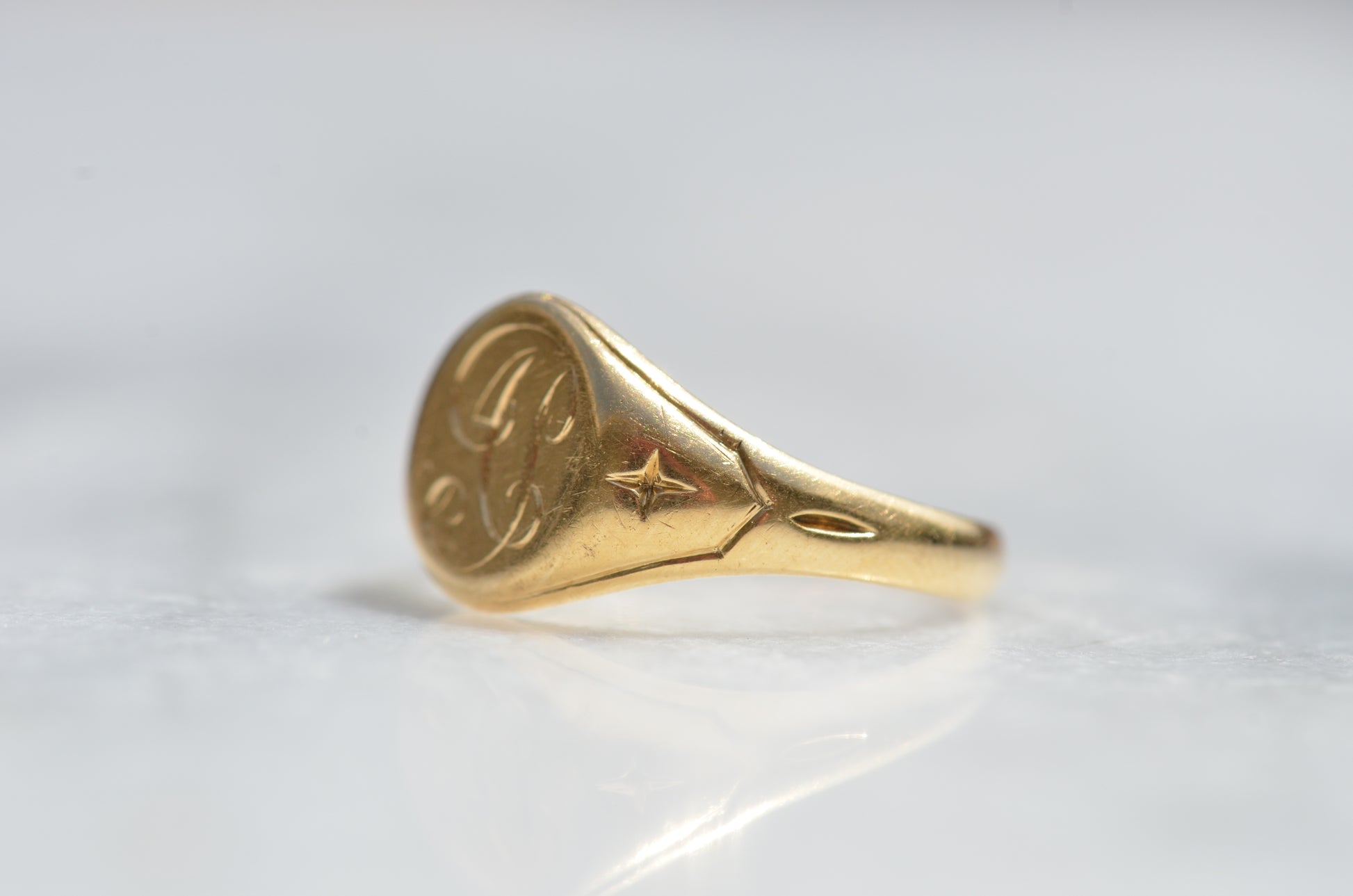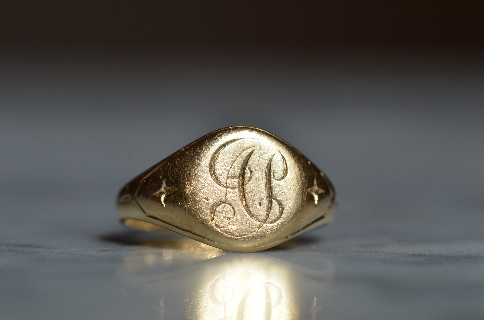 One of our favourite signet rings yet, we can’t get enough of the soft face, swirling script, and star-like details on this Edwardian beauty. There's such a special feeling in finding a preloved piece that already has letters on it that are meaningful to you, that we play pretty fast and loose - maybe it's the first or last initials of you and your lover, or your own in another order, or the initials of a loved one: no matter what, it will feel sentimental every time it catches your eye.