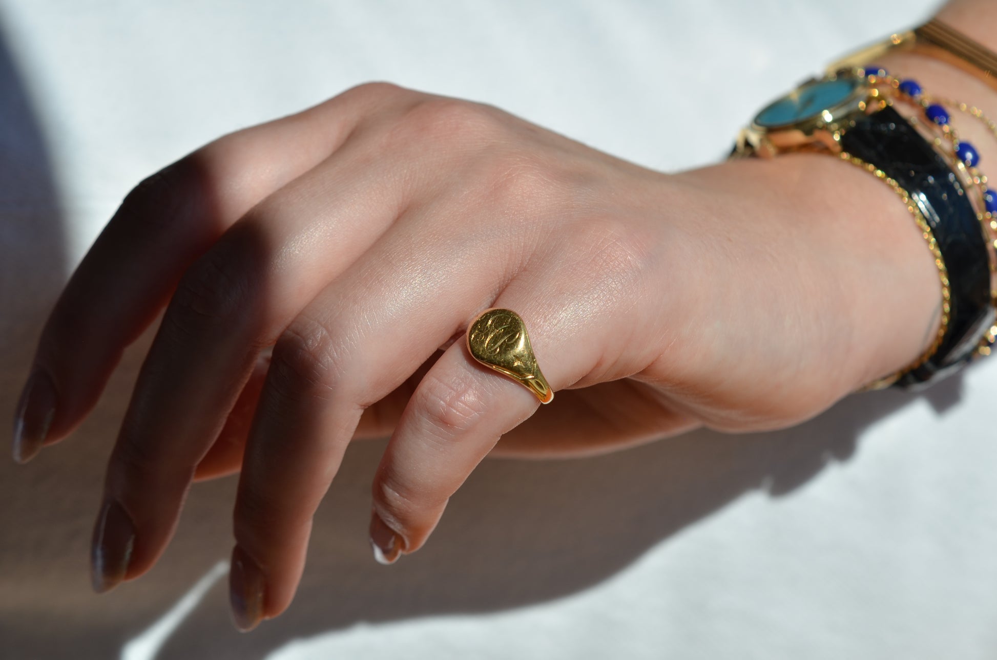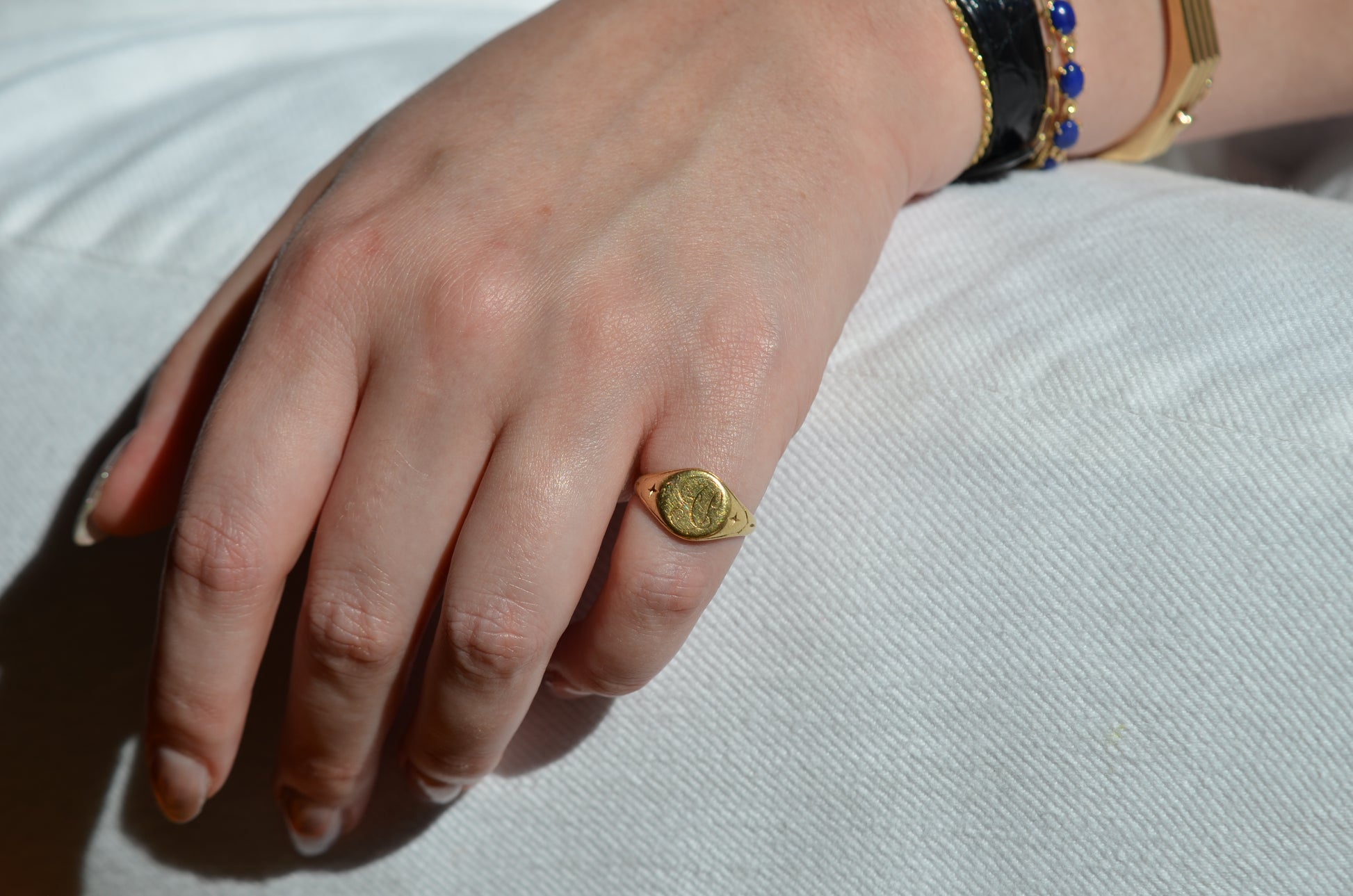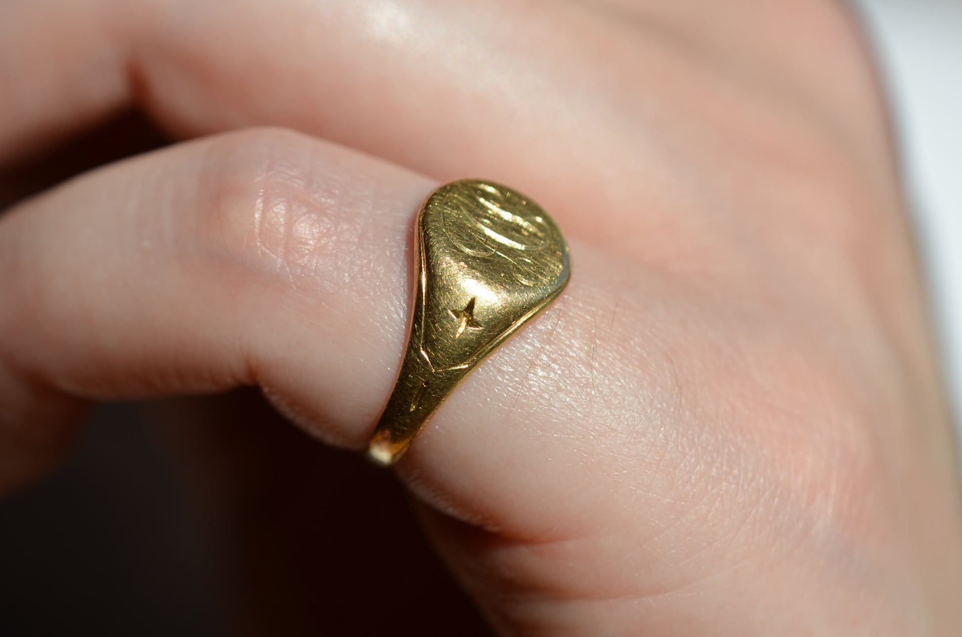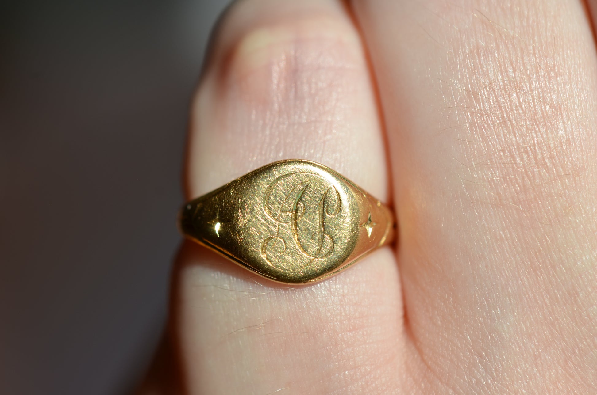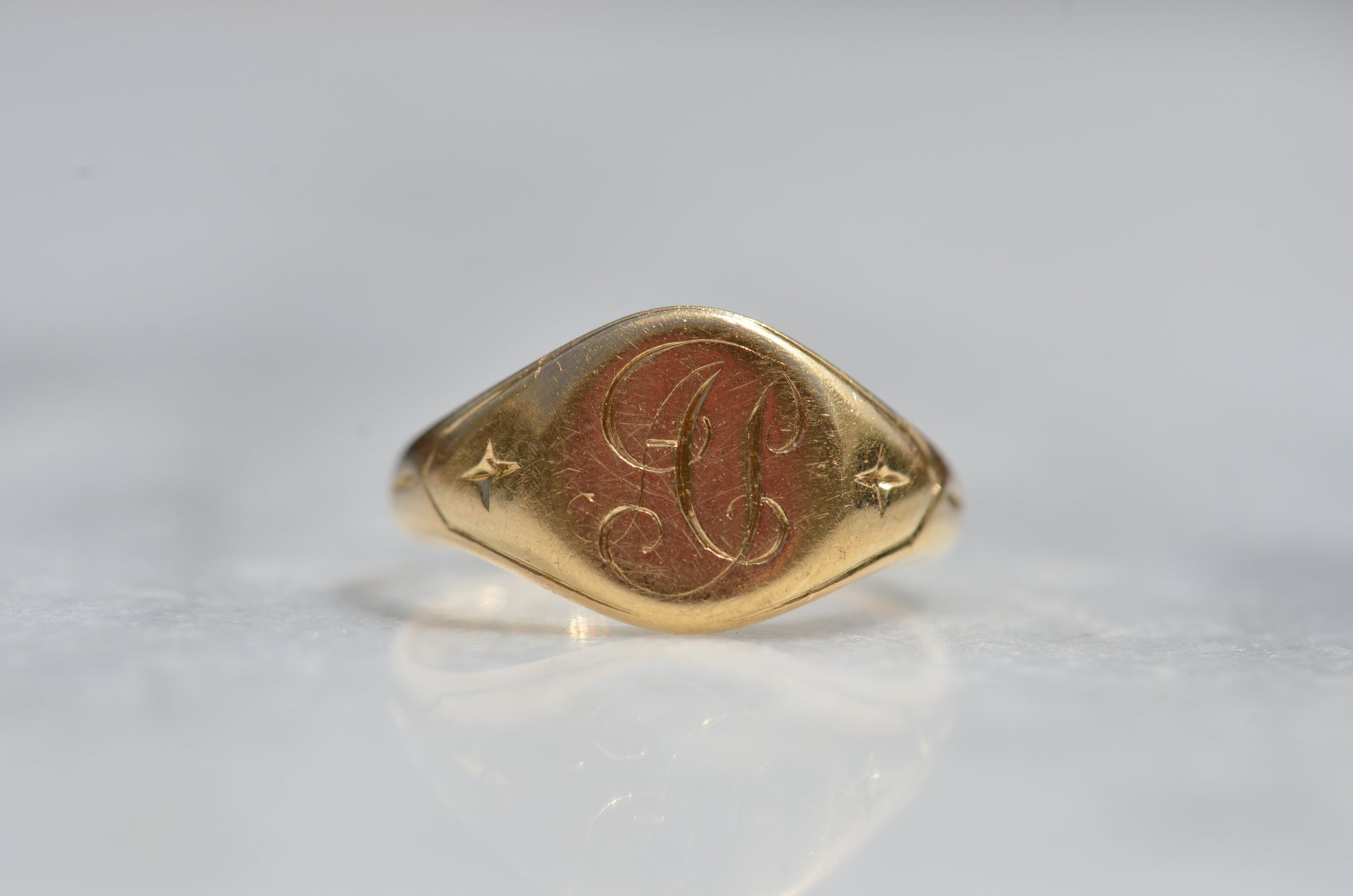 One of our favourite signet rings yet, we can’t get enough of the soft face, swirling script, and star-like details on this Edwardian beauty. There's such a special feeling in finding a preloved piece that already has letters on it that are meaningful to you, that we play pretty fast and loose - maybe it's the first or last initials of you and your lover, or your own in another order, or the initials of a loved one: no matter what, it will feel sentimental every time it catches your eye.
