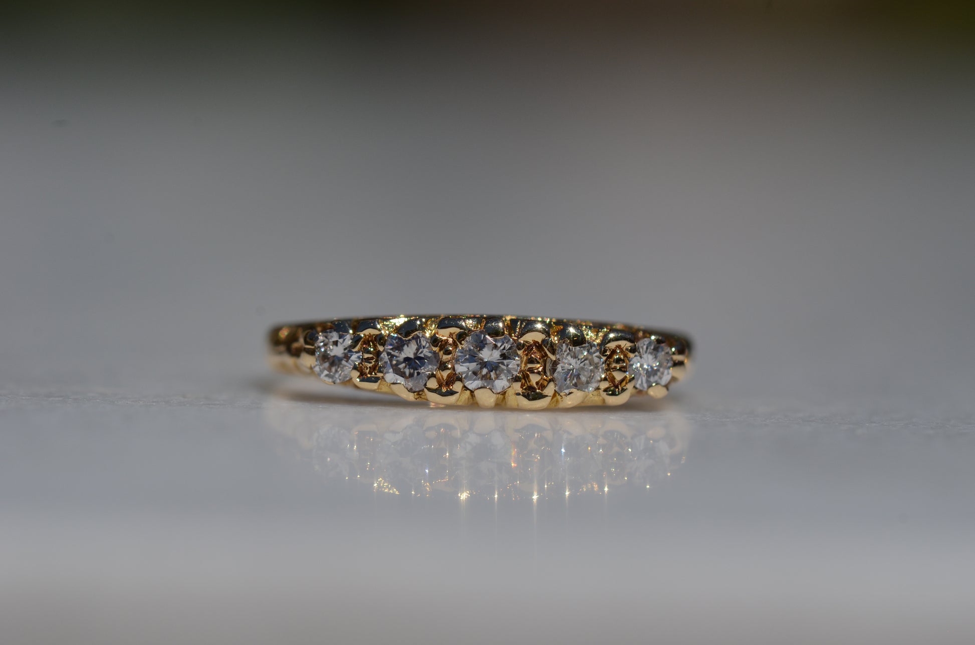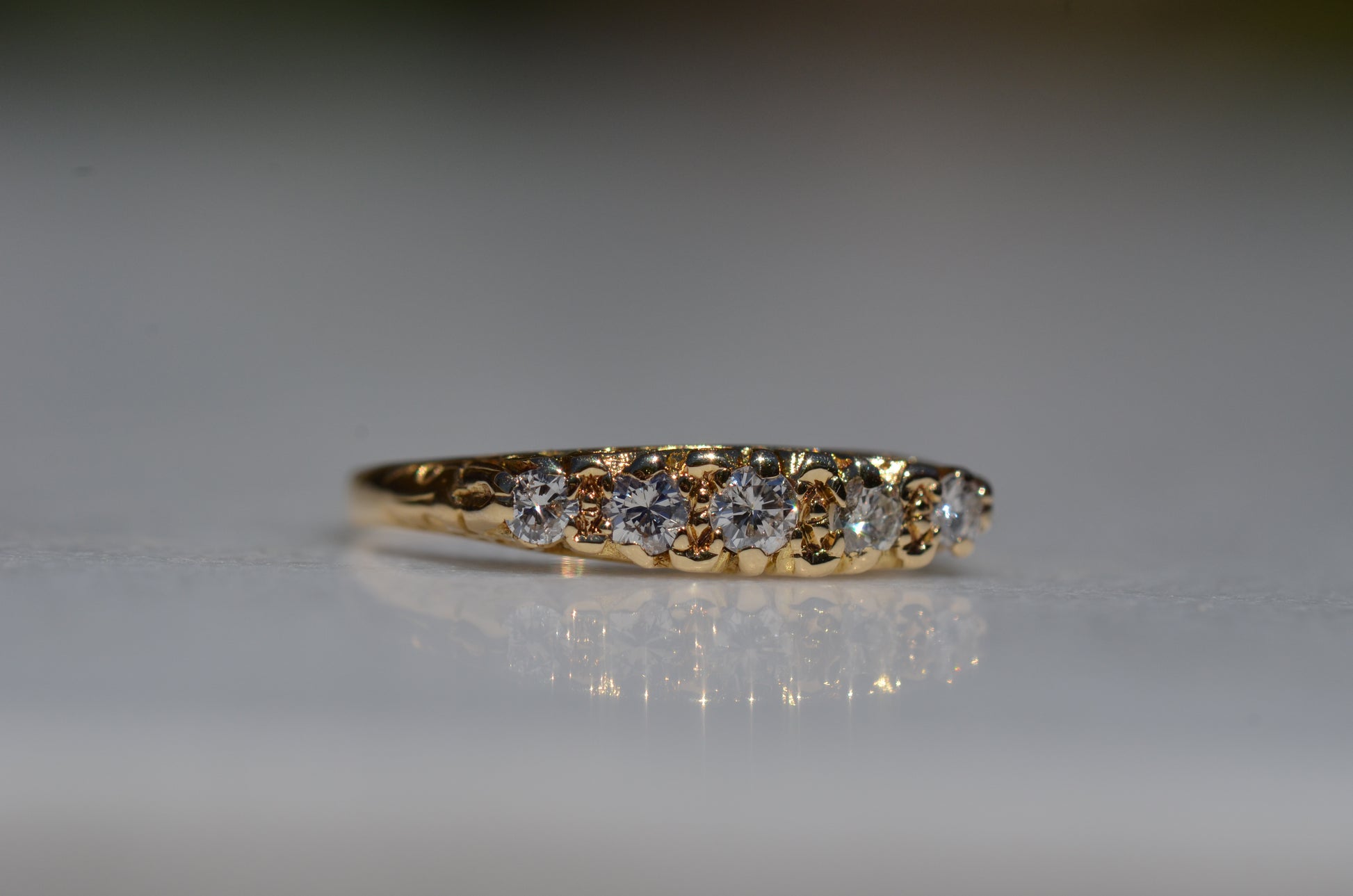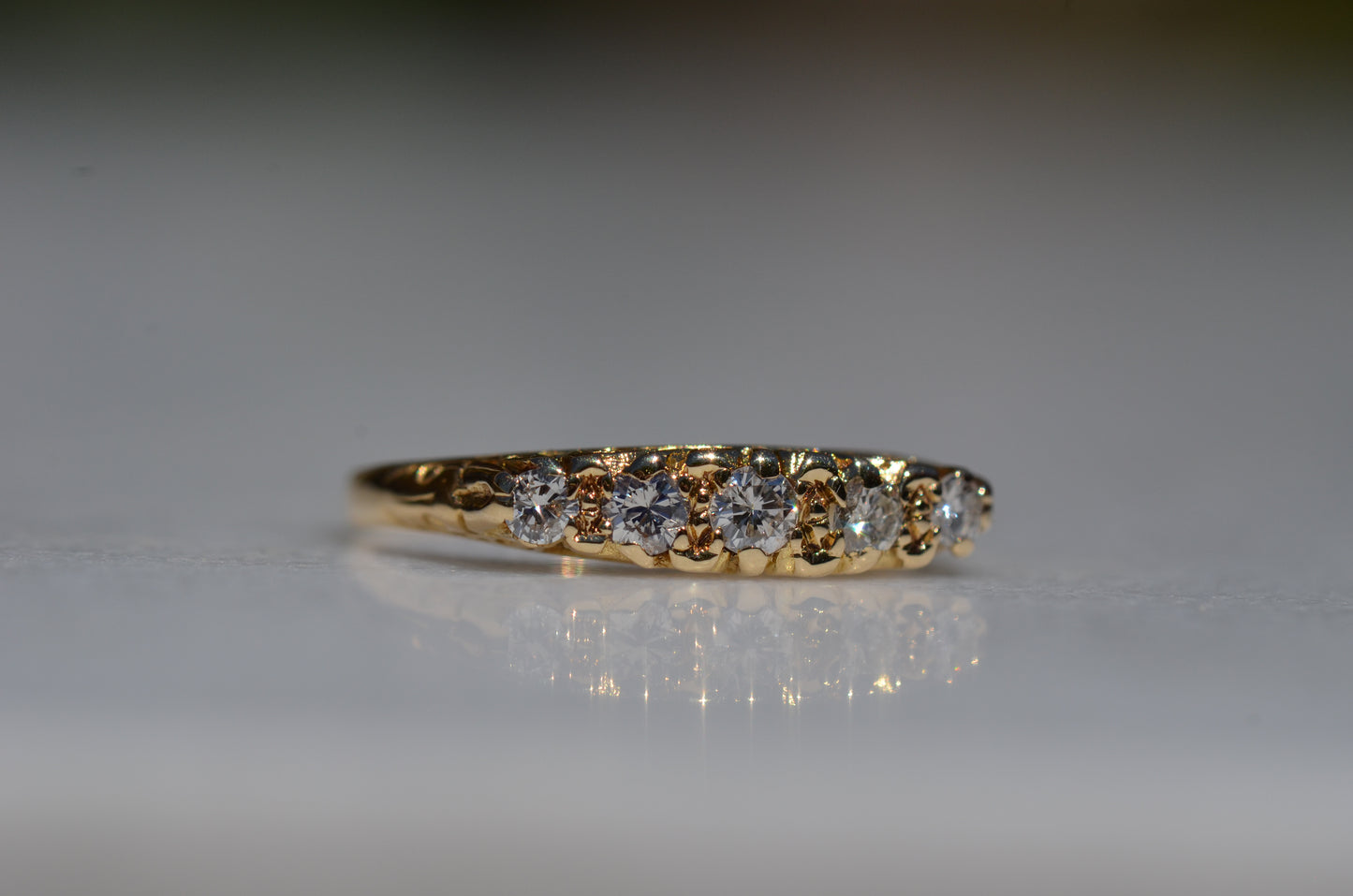 Though its British hallmarks have been all but erased through time and resizing, this lovely ring was most likely crafted in the 1960s and features five bright brilliant cut diamonds, rather than the old cuts that would have been common in the styles that inspired it. This would make a beautiful stacking ring, engagement ring, wedding band, or 2-in-1 engagement/wedding ring.