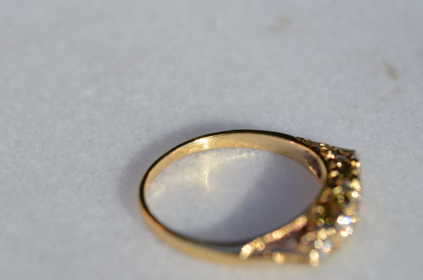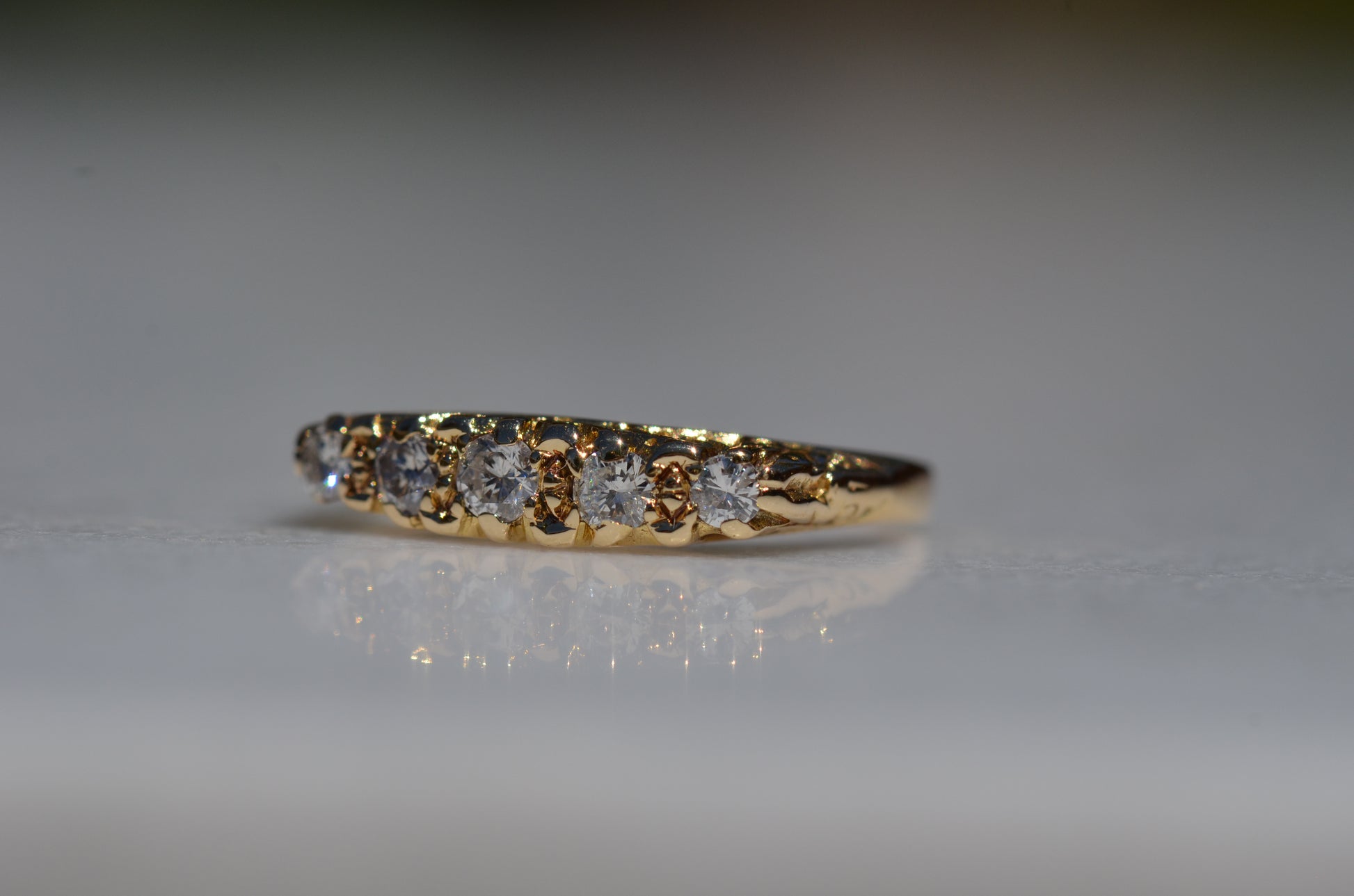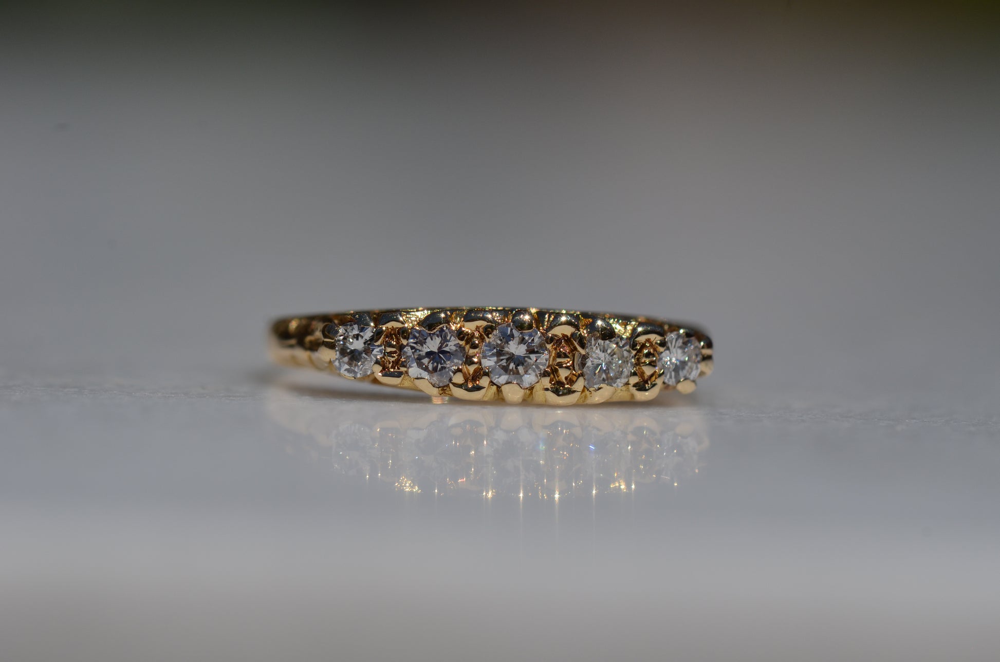 Though its British hallmarks have been all but erased through time and resizing, this lovely ring was most likely crafted in the 1960s and features five bright brilliant cut diamonds, rather than the old cuts that would have been common in the styles that inspired it. This would make a beautiful stacking ring, engagement ring, wedding band, or 2-in-1 engagement/wedding ring.
