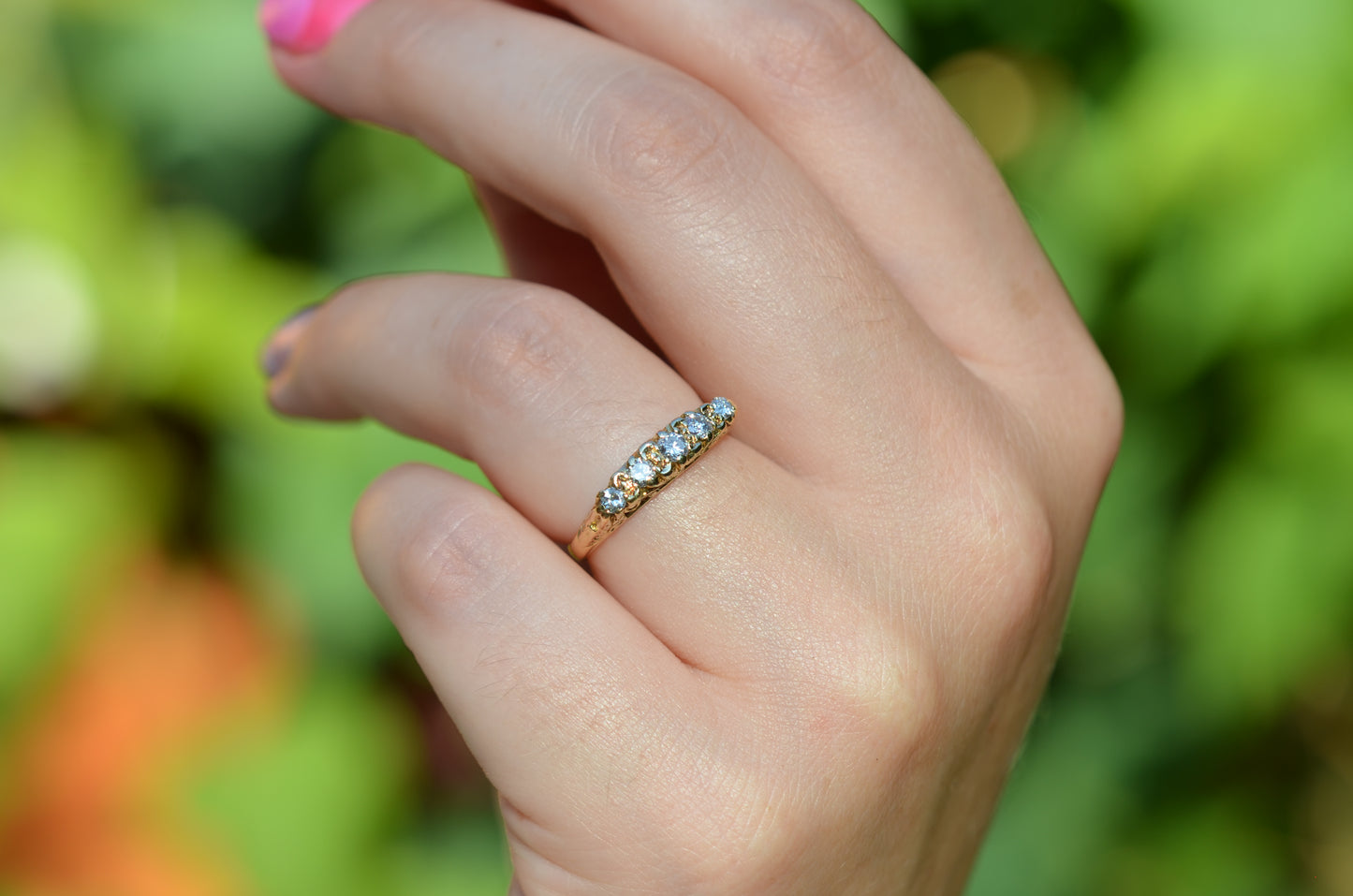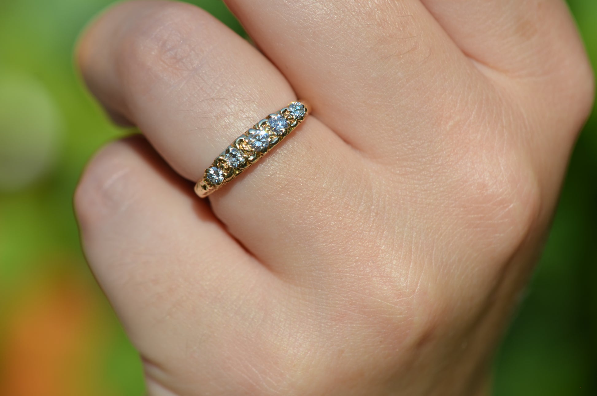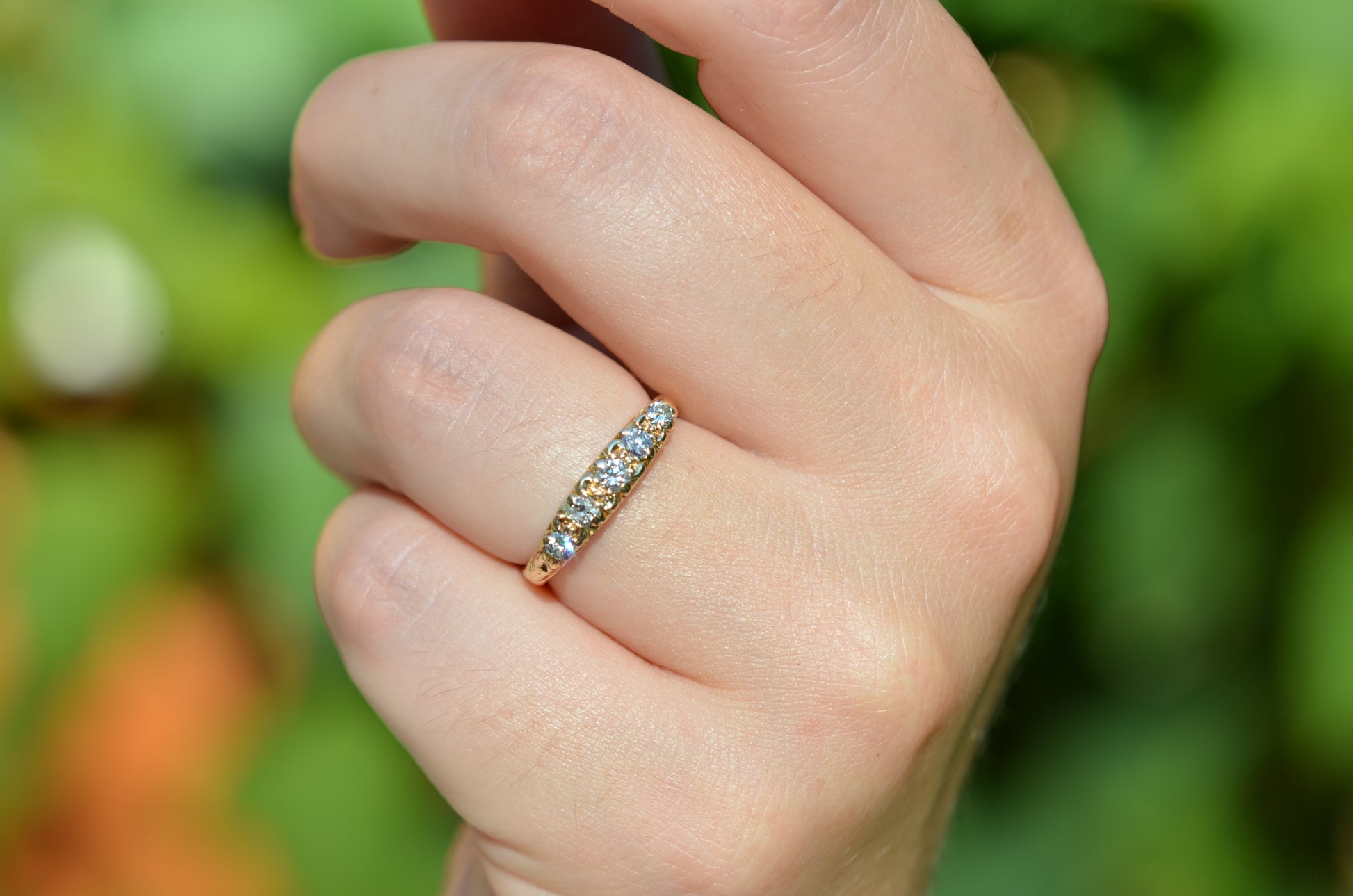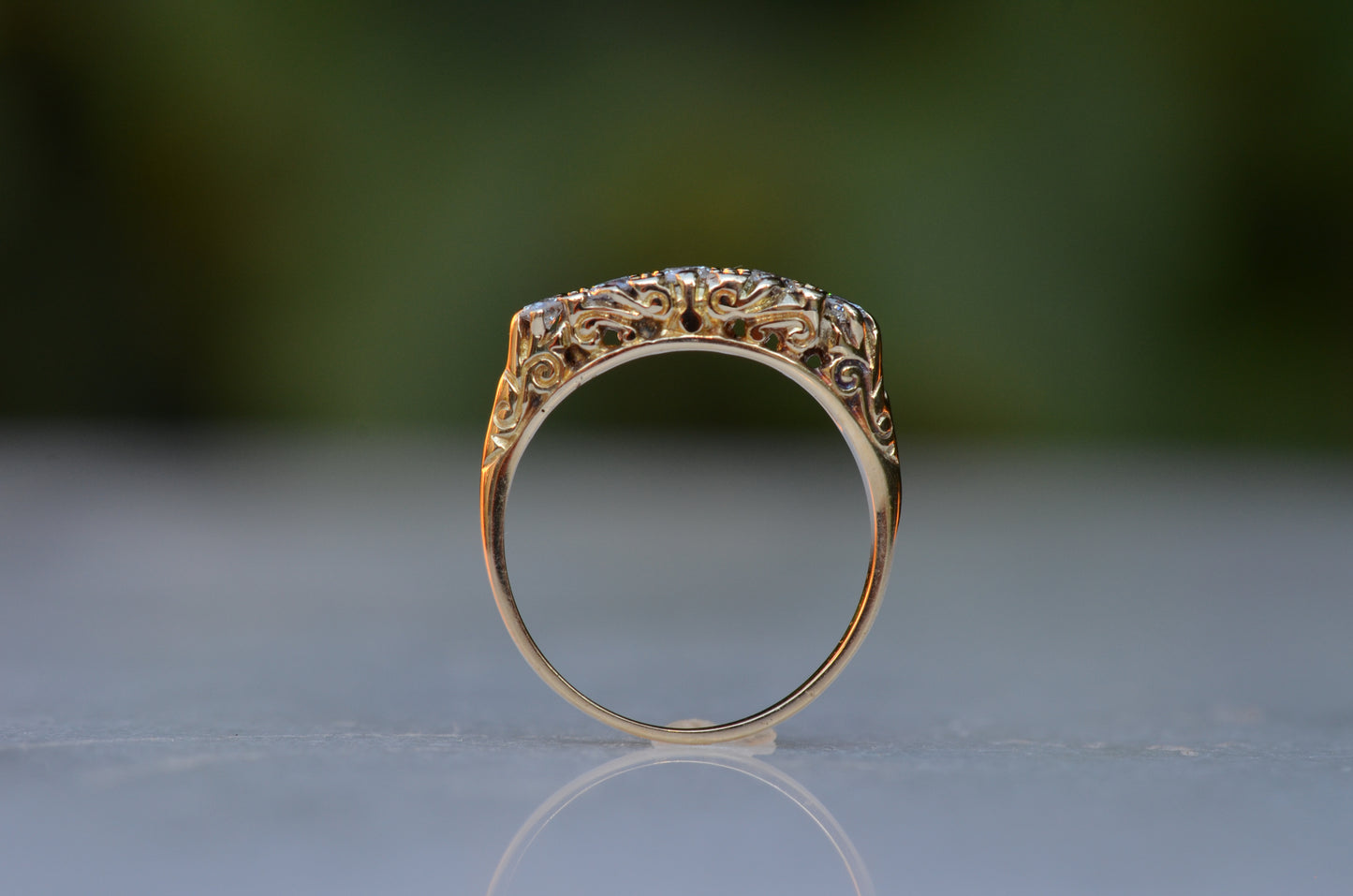We're weak in the knees over this sweet and tender five stone ring. We love the style for the flattering finger coverage, and the five stones are a lovely way to mark milestones or anniversaries. The five stone ring was a beloved style in the Victorian period, and this is a 20th century revival style perfectly charming rendition.