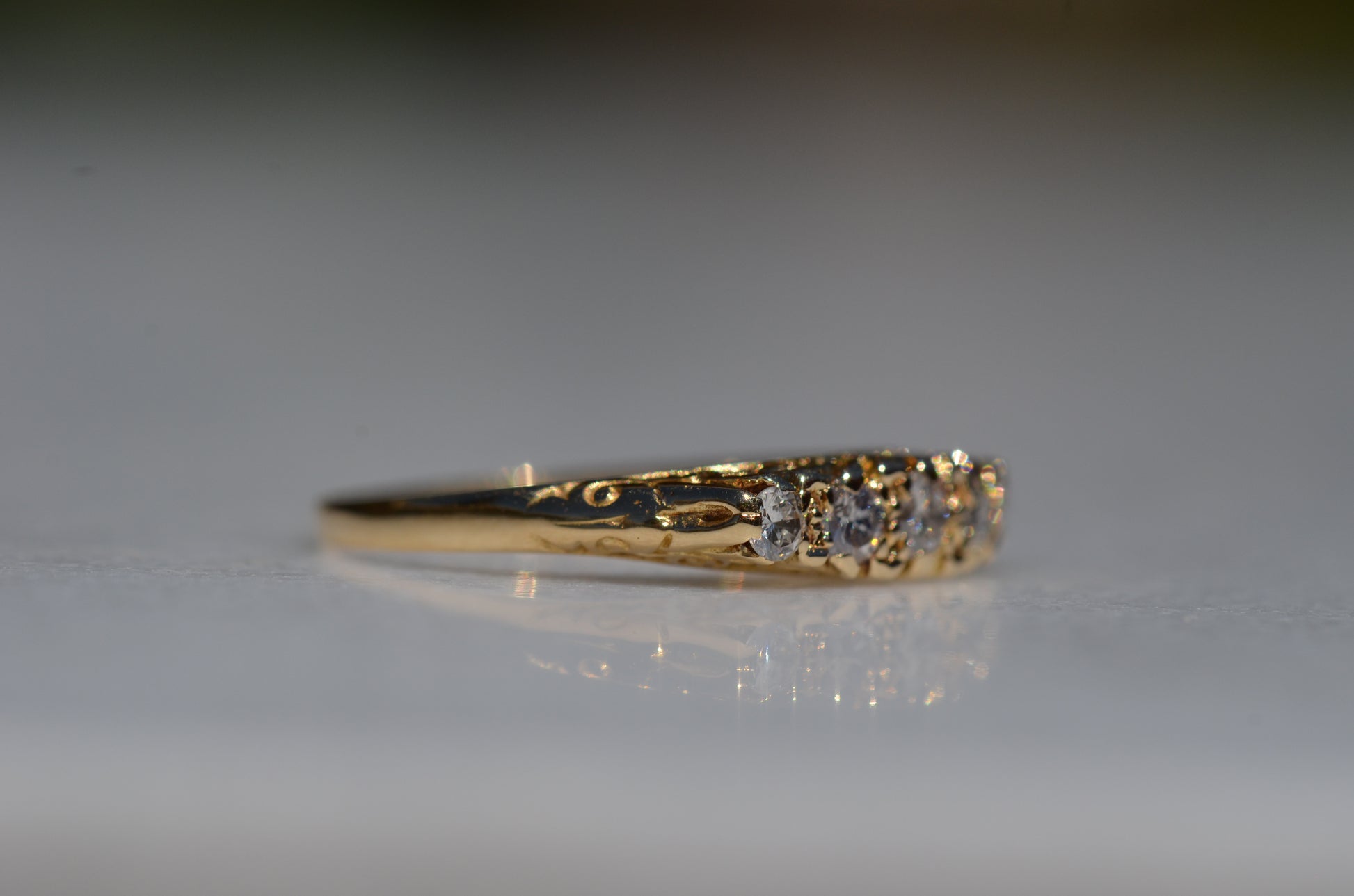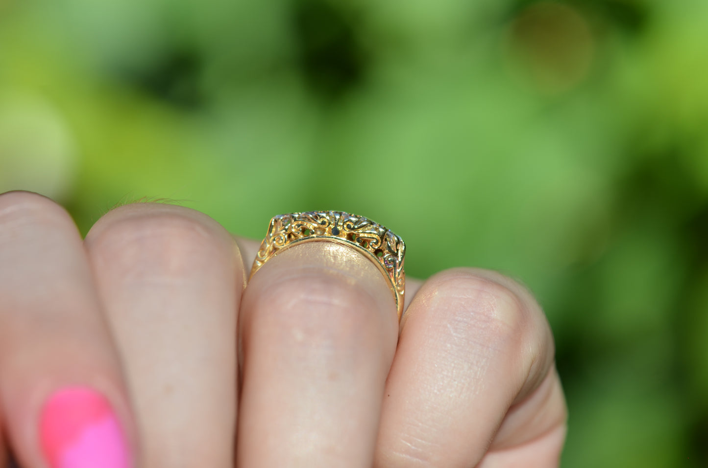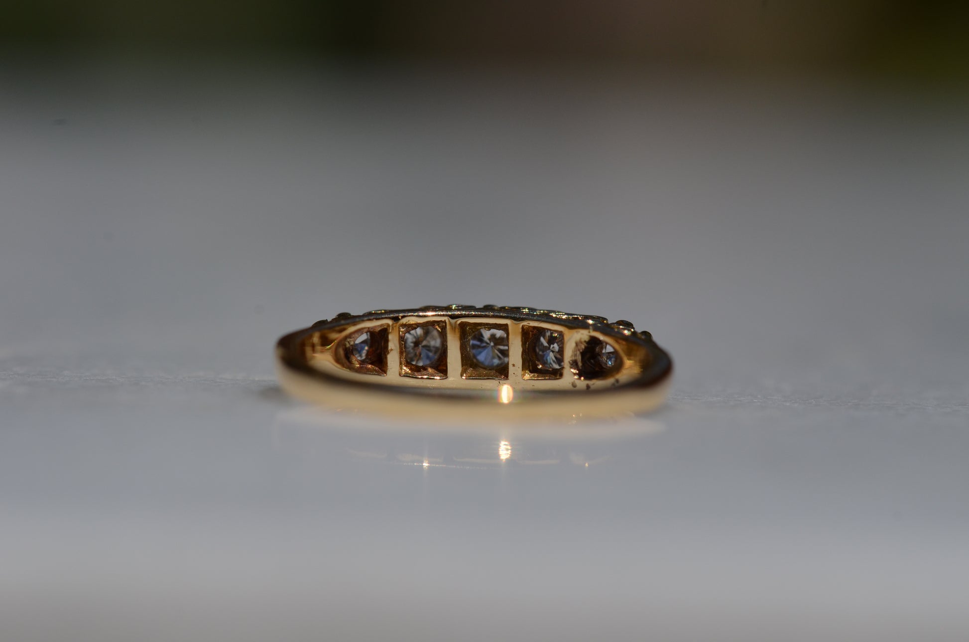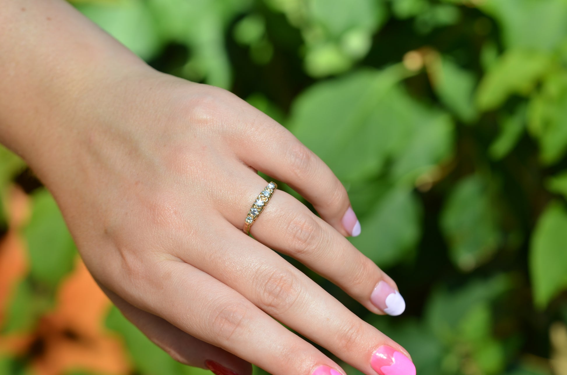 We're weak in the knees over this sweet and tender five stone ring. We love the style for the flattering finger coverage, and the five stones are a lovely way to mark milestones or anniversaries. The five stone ring was a beloved style in the Victorian period, and this is a 20th century revival style perfectly charming rendition.