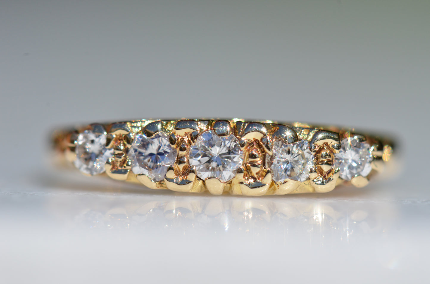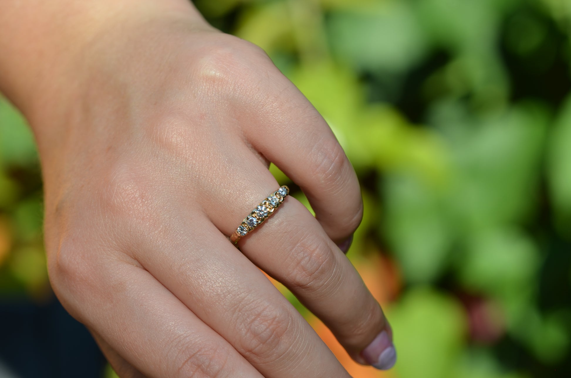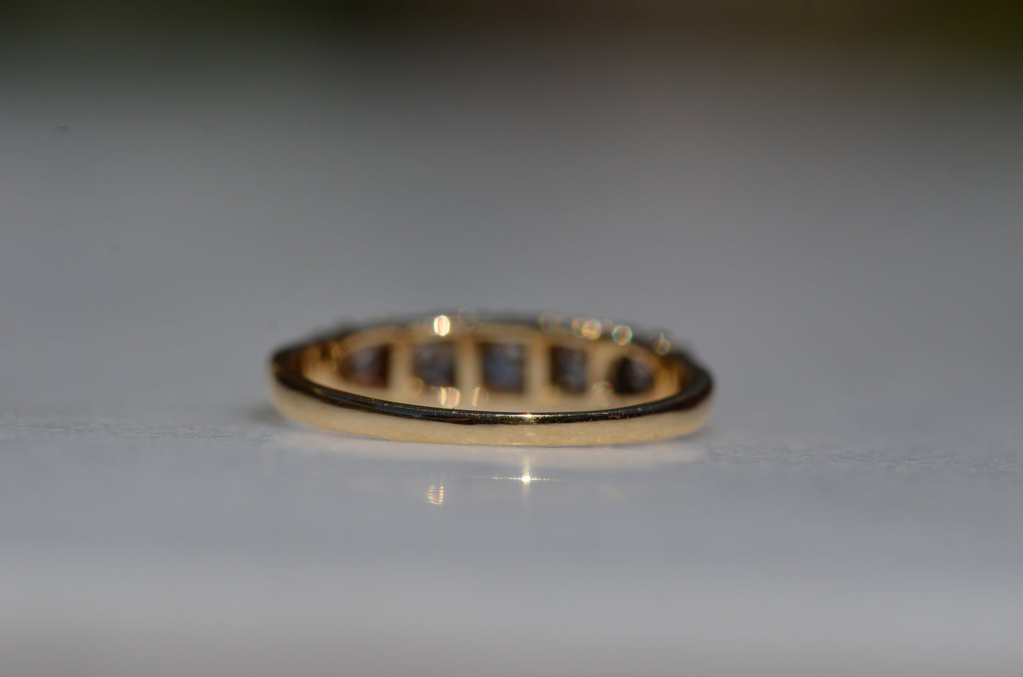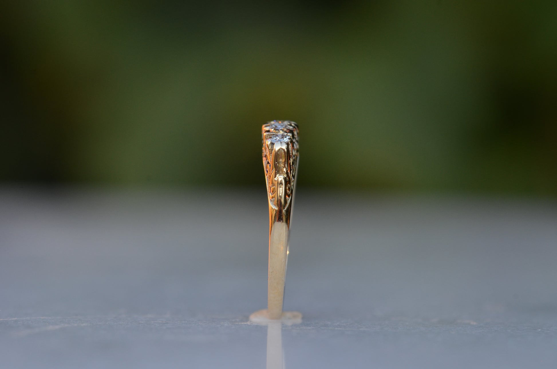 We're weak in the knees over this sweet and tender five stone ring. We love the style for the flattering finger coverage, and the five stones are a lovely way to mark milestones or anniversaries. The five stone ring was a beloved style in the Victorian period, and this is a 20th century revival style perfectly charming rendition.
