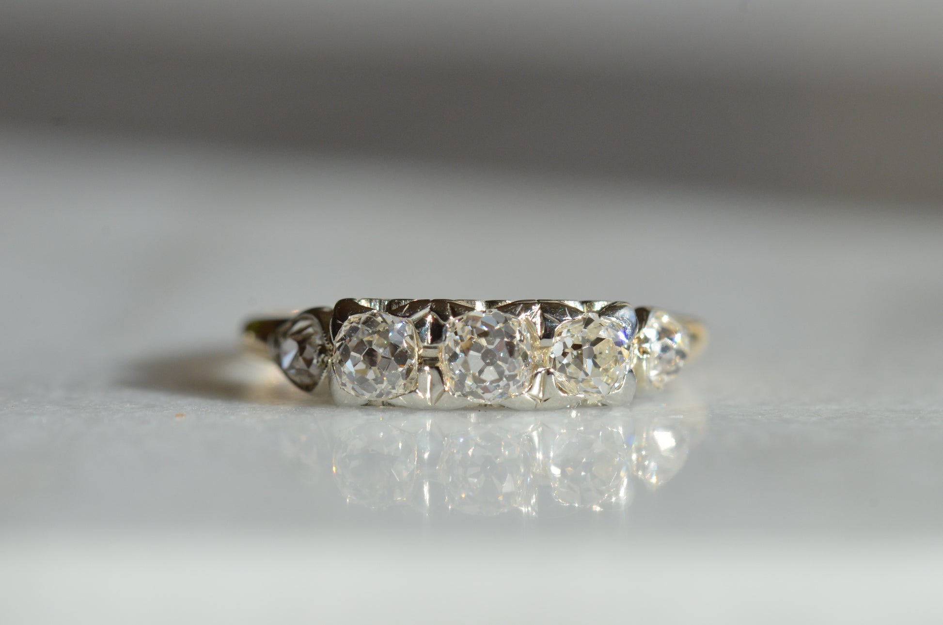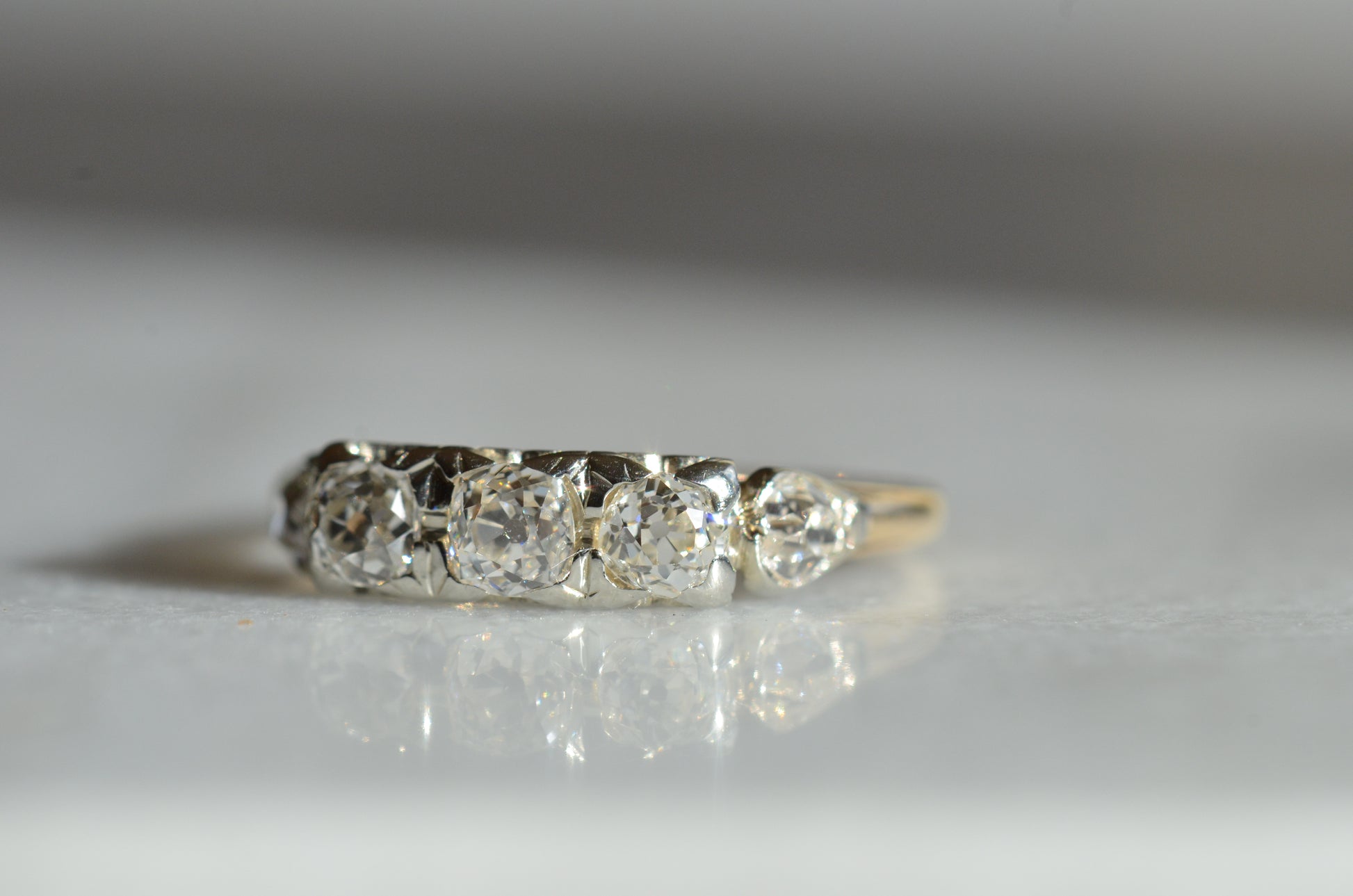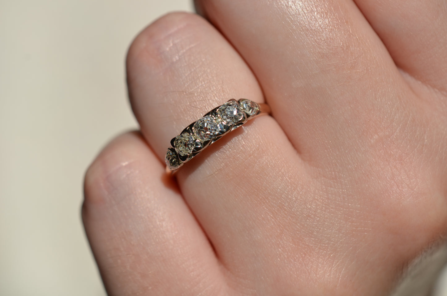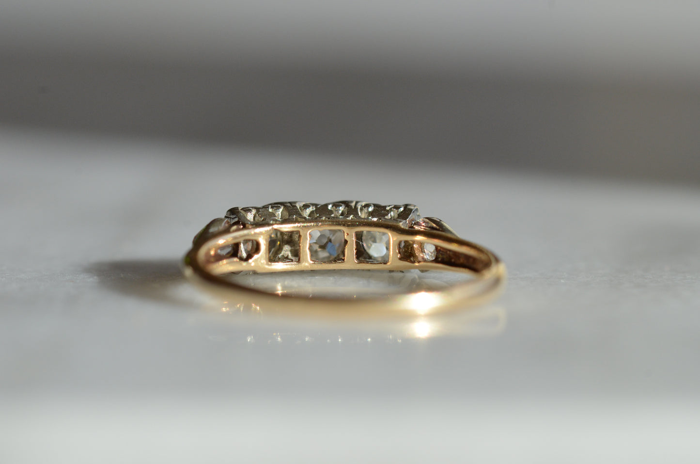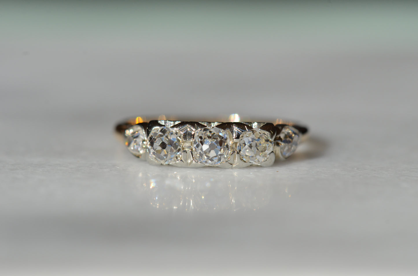 A quintet of fiery old mine cut diamonds lull you into a sense of modesty in this classic c1930s band - until the light even dares to slink over them, when the sparkle simply can't be contained. With a yellow band and white gold mount, this ring would have been right on trend in seeing out the all-white styles of the Deco period, even if the diamonds themselves would have been rather old fashioned for the time. These old miners - with some of the tallest crowns we've seen! - would predate the mount by at least a generation if not a little more. This isn't uncommon for the period, and we love to think that these stones may have been inherited and repurposed for a new life - either as an anniversary gift or to mark a new marriage. The sleek shape of the sides of the band indicates it would have had a matched partner, and also means it stacks beautifully, especially with a band. With enough sparkle to serve as an engagement ring, this ring would also work beautifully as a wedding band, anniversary stacker, or all-in-one delight - just as well as it would a gift to yourself.