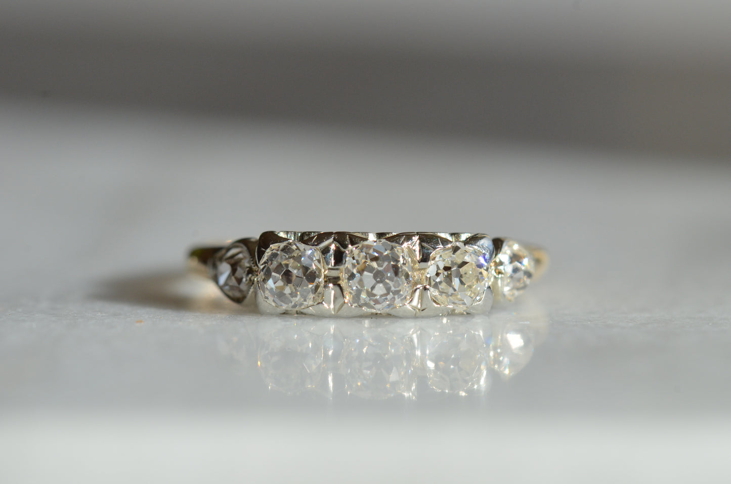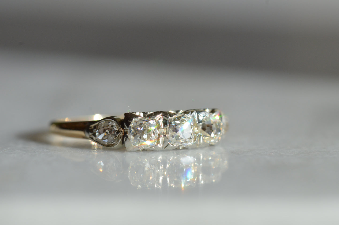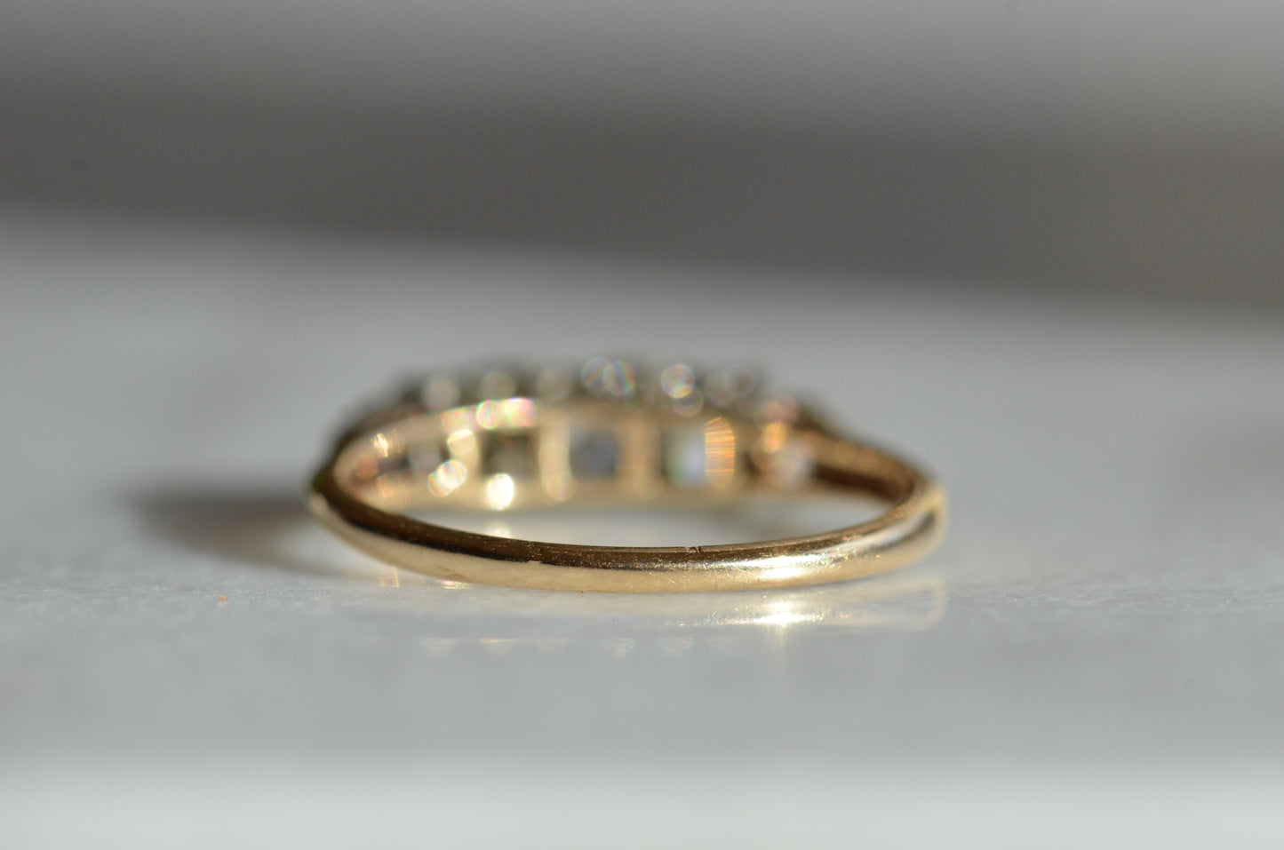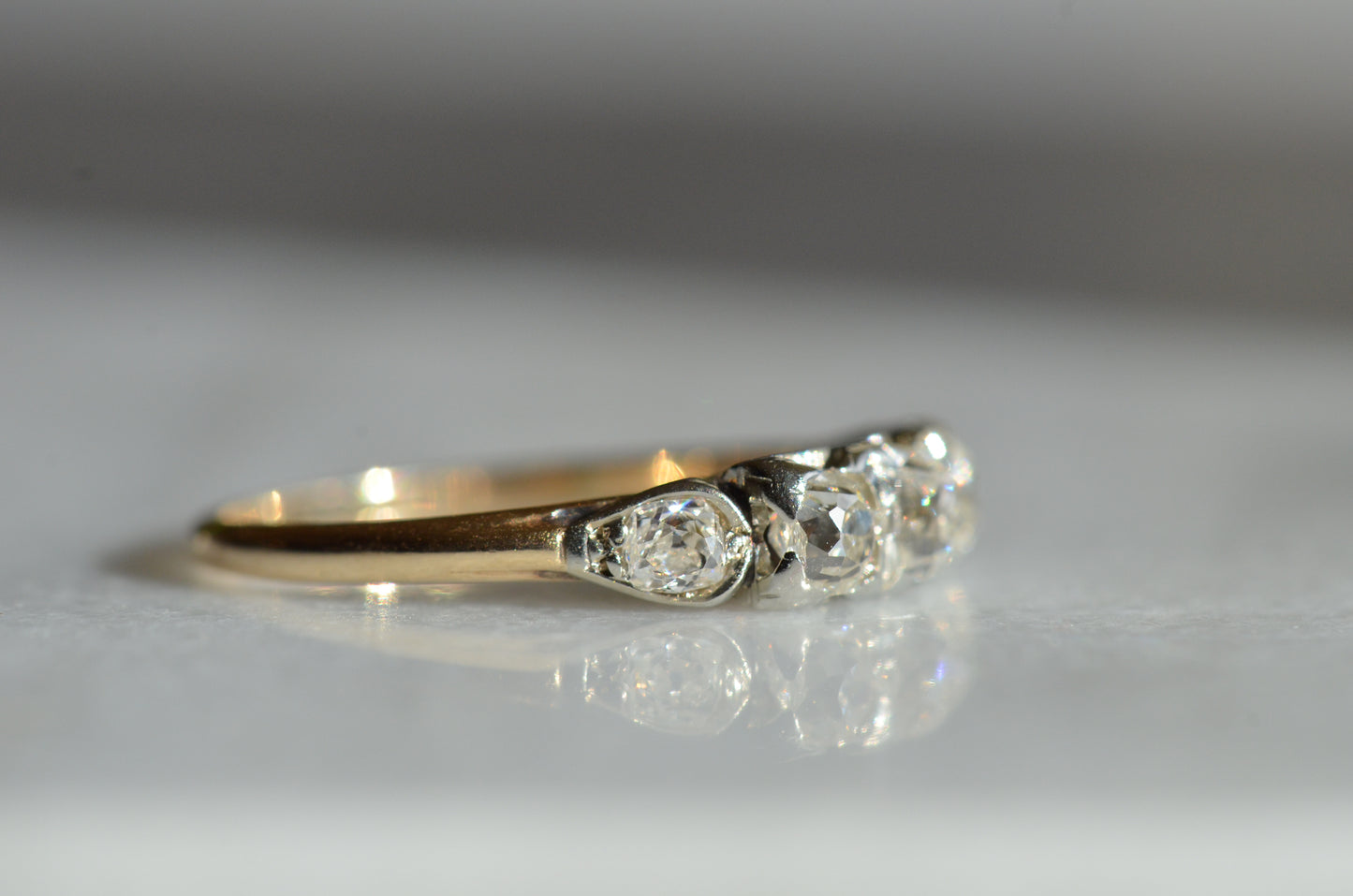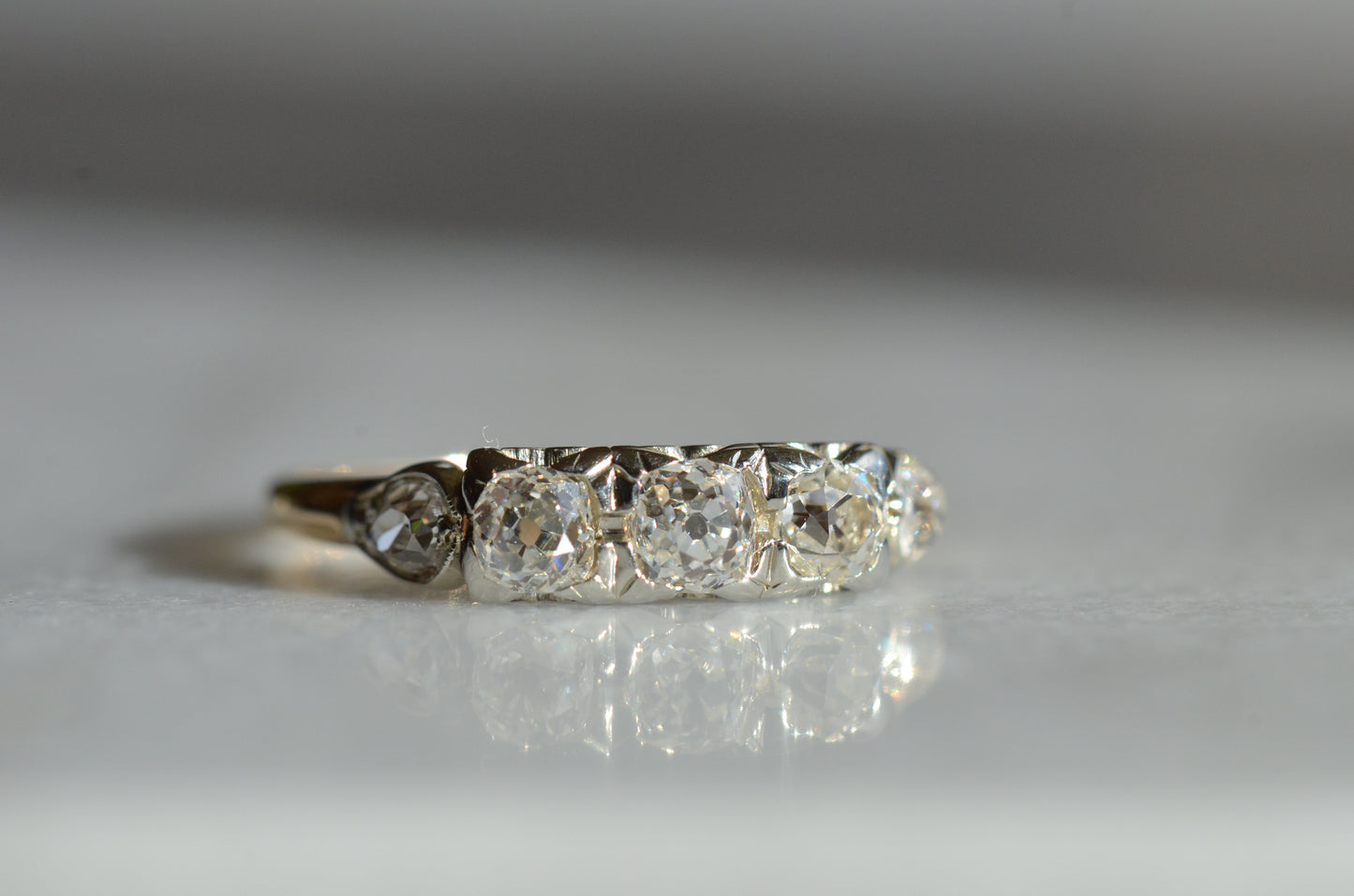 A quintet of fiery old mine cut diamonds lull you into a sense of modesty in this classic c1930s band - until the light even dares to slink over them, when the sparkle simply can't be contained. With a yellow band and white gold mount, this ring would have been right on trend in seeing out the all-white styles of the Deco period, even if the diamonds themselves would have been rather old fashioned for the time. These old miners - with some of the tallest crowns we've seen! - would predate the mount by at least a generation if not a little more. This isn't uncommon for the period, and we love to think that these stones may have been inherited and repurposed for a new life - either as an anniversary gift or to mark a new marriage. The sleek shape of the sides of the band indicates it would have had a matched partner, and also means it stacks beautifully, especially with a band. With enough sparkle to serve as an engagement ring, this ring would also work beautifully as a wedding band, anniversary stacker, or all-in-one delight - just as well as it would a gift to yourself.