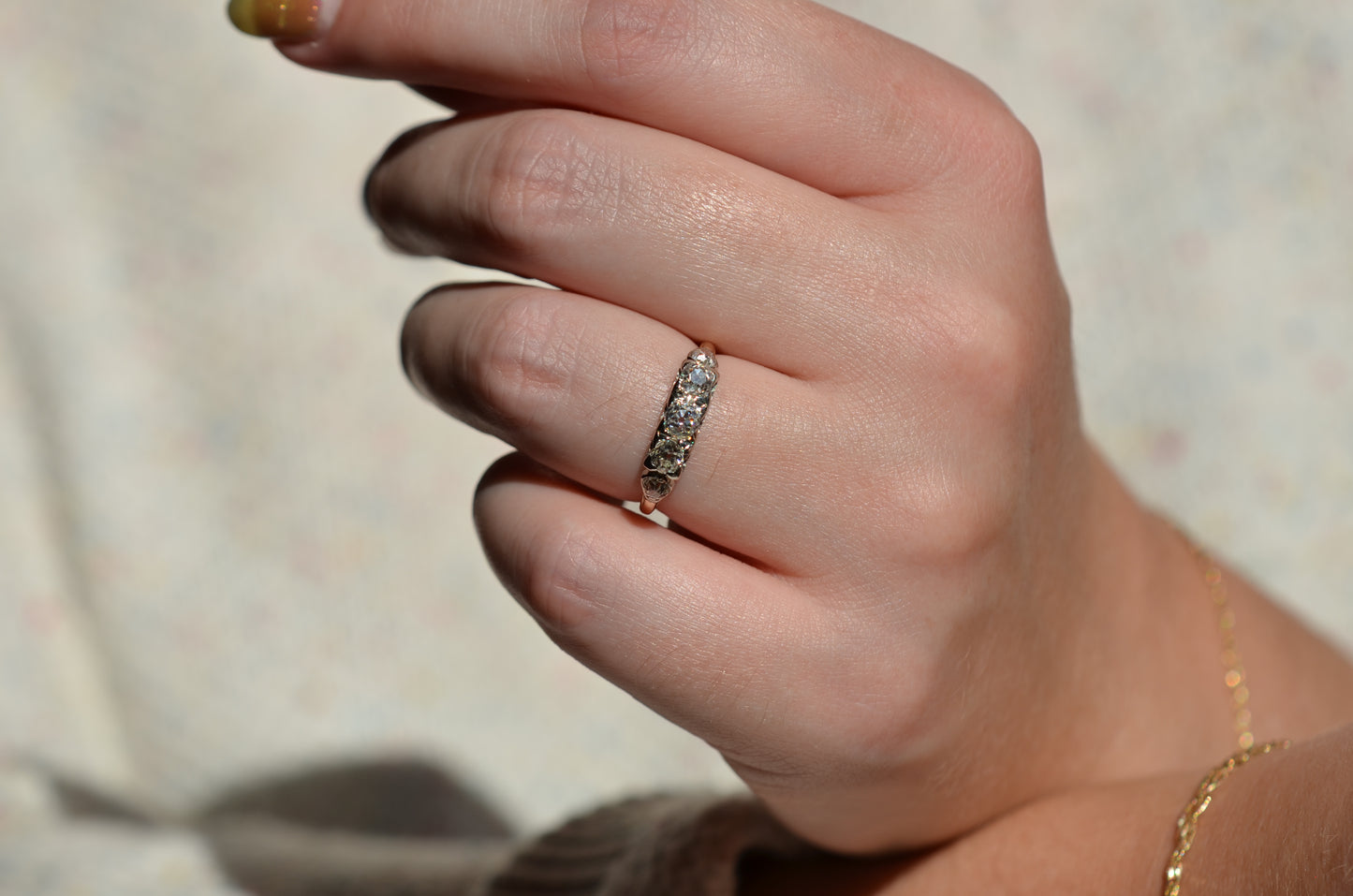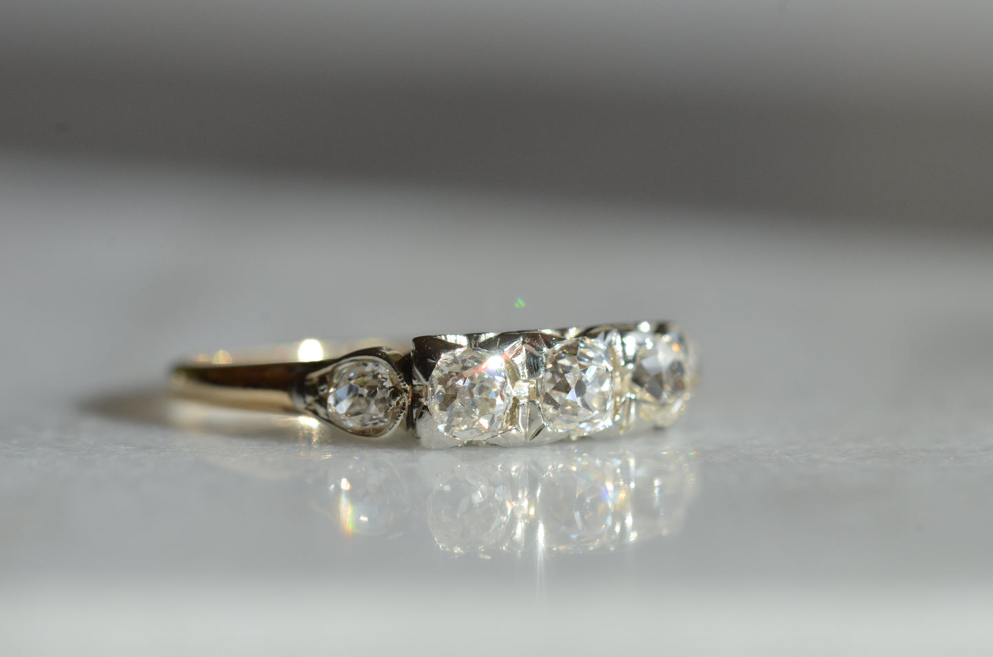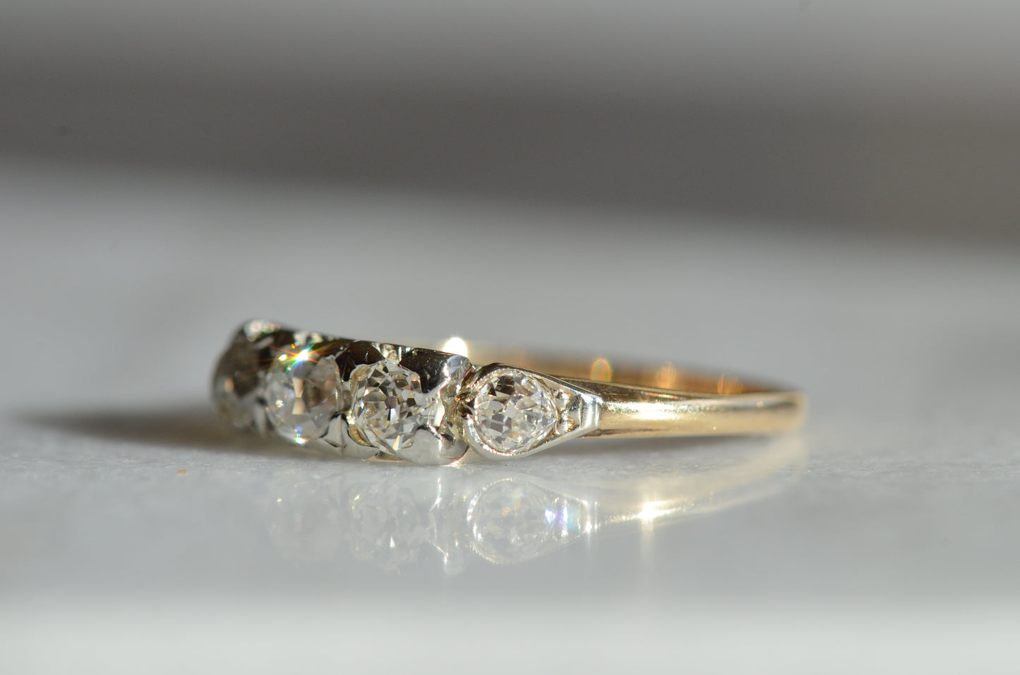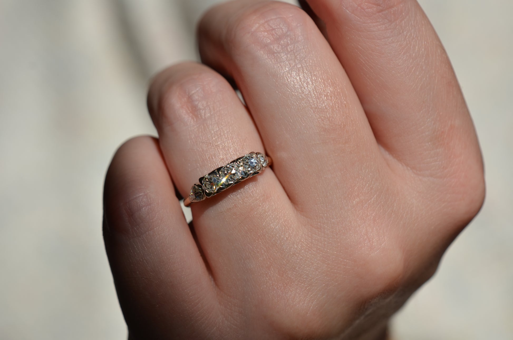 A quintet of fiery old mine cut diamonds lull you into a sense of modesty in this classic c1930s band - until the light even dares to slink over them, when the sparkle simply can't be contained. With a yellow band and white gold mount, this ring would have been right on trend in seeing out the all-white styles of the Deco period, even if the diamonds themselves would have been rather old fashioned for the time. These old miners - with some of the tallest crowns we've seen! - would predate the mount by at least a generation if not a little more. This isn't uncommon for the period, and we love to think that these stones may have been inherited and repurposed for a new life - either as an anniversary gift or to mark a new marriage. The sleek shape of the sides of the band indicates it would have had a matched partner, and also means it stacks beautifully, especially with a band. With enough sparkle to serve as an engagement ring, this ring would also work beautifully as a wedding band, anniversary stacker, or all-in-one delight - just as well as it would a gift to yourself.