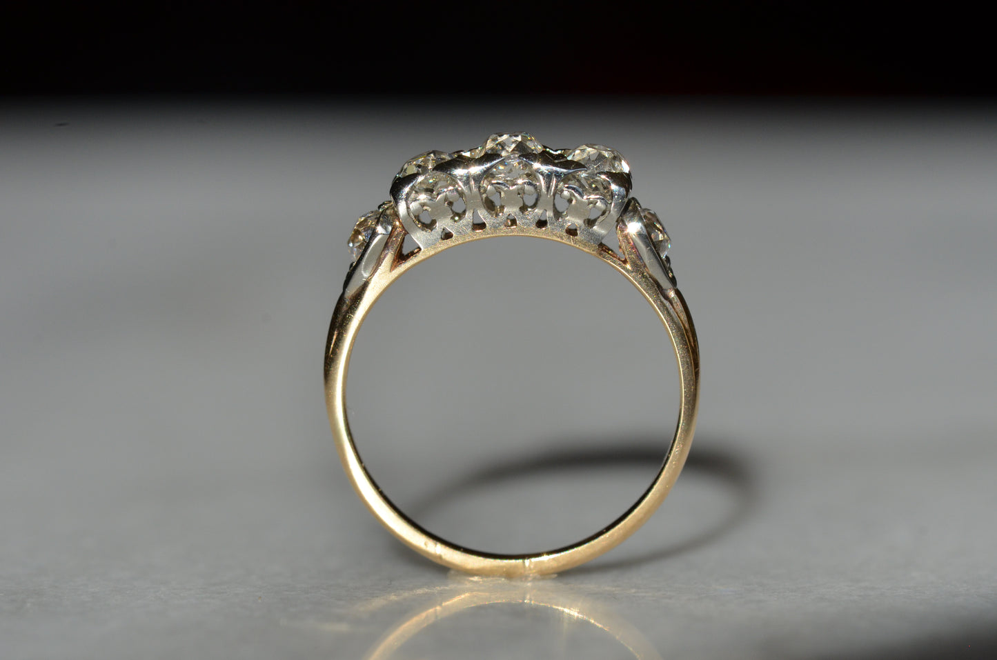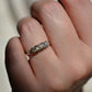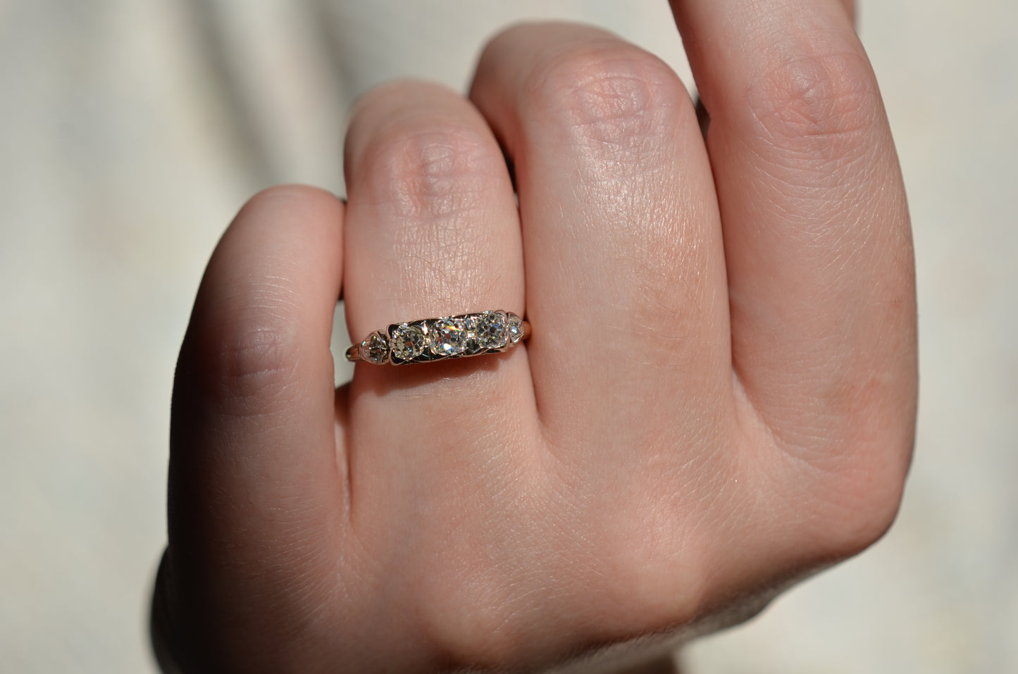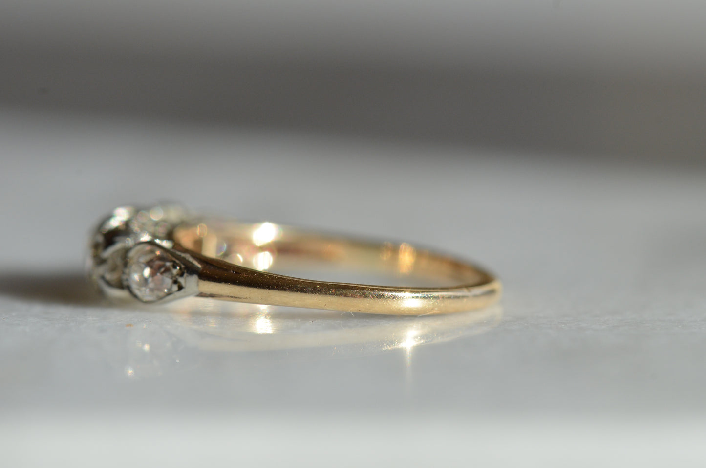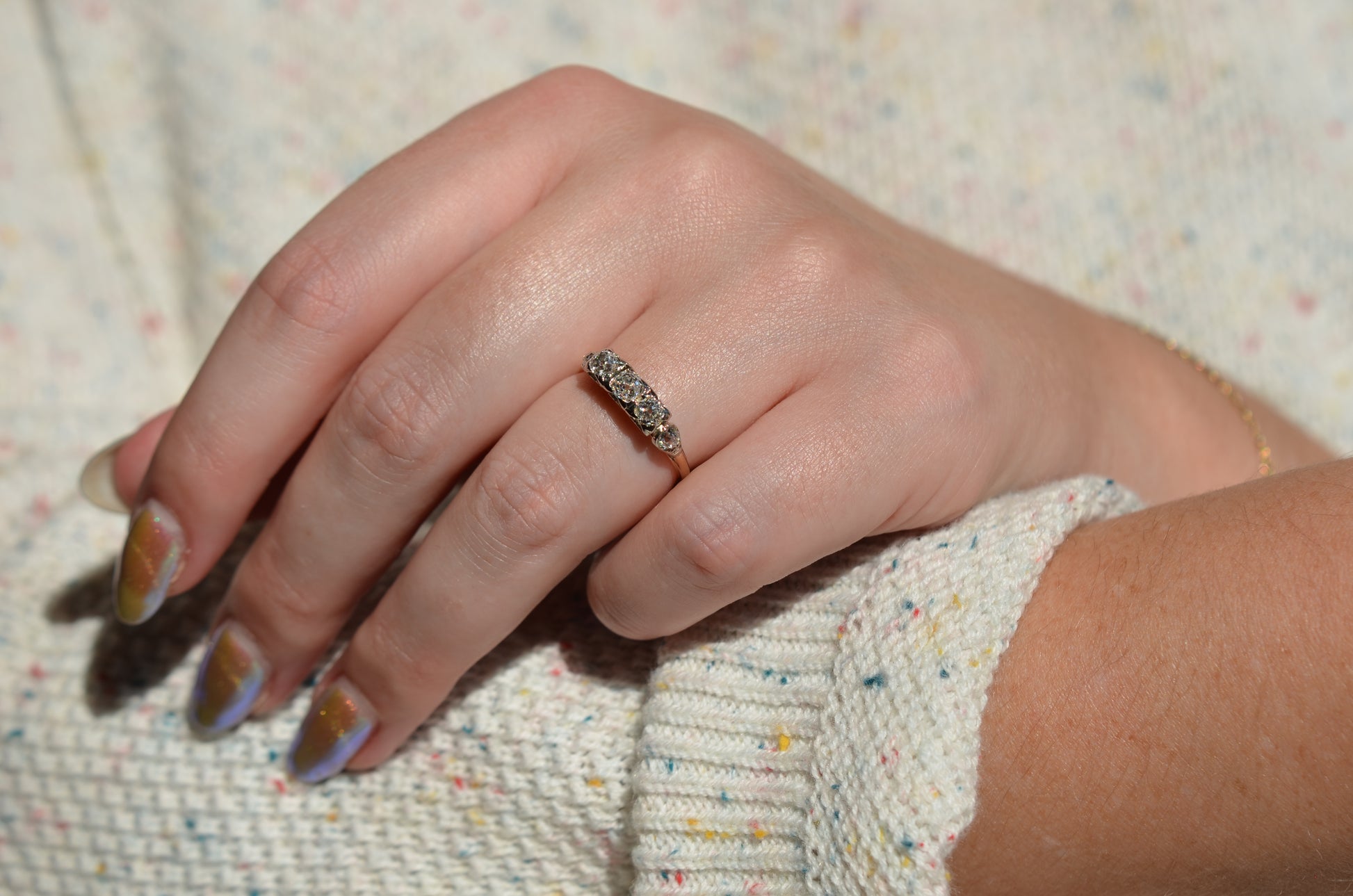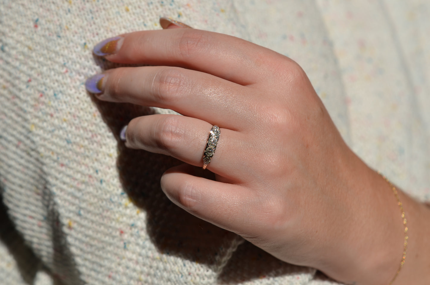 A quintet of fiery old mine cut diamonds lull you into a sense of modesty in this classic c1930s band - until the light even dares to slink over them, when the sparkle simply can't be contained. With a yellow band and white gold mount, this ring would have been right on trend in seeing out the all-white styles of the Deco period, even if the diamonds themselves would have been rather old fashioned for the time. These old miners - with some of the tallest crowns we've seen! - would predate the mount by at least a generation if not a little more. This isn't uncommon for the period, and we love to think that these stones may have been inherited and repurposed for a new life - either as an anniversary gift or to mark a new marriage. The sleek shape of the sides of the band indicates it would have had a matched partner, and also means it stacks beautifully, especially with a band. With enough sparkle to serve as an engagement ring, this ring would also work beautifully as a wedding band, anniversary stacker, or all-in-one delight - just as well as it would a gift to yourself.