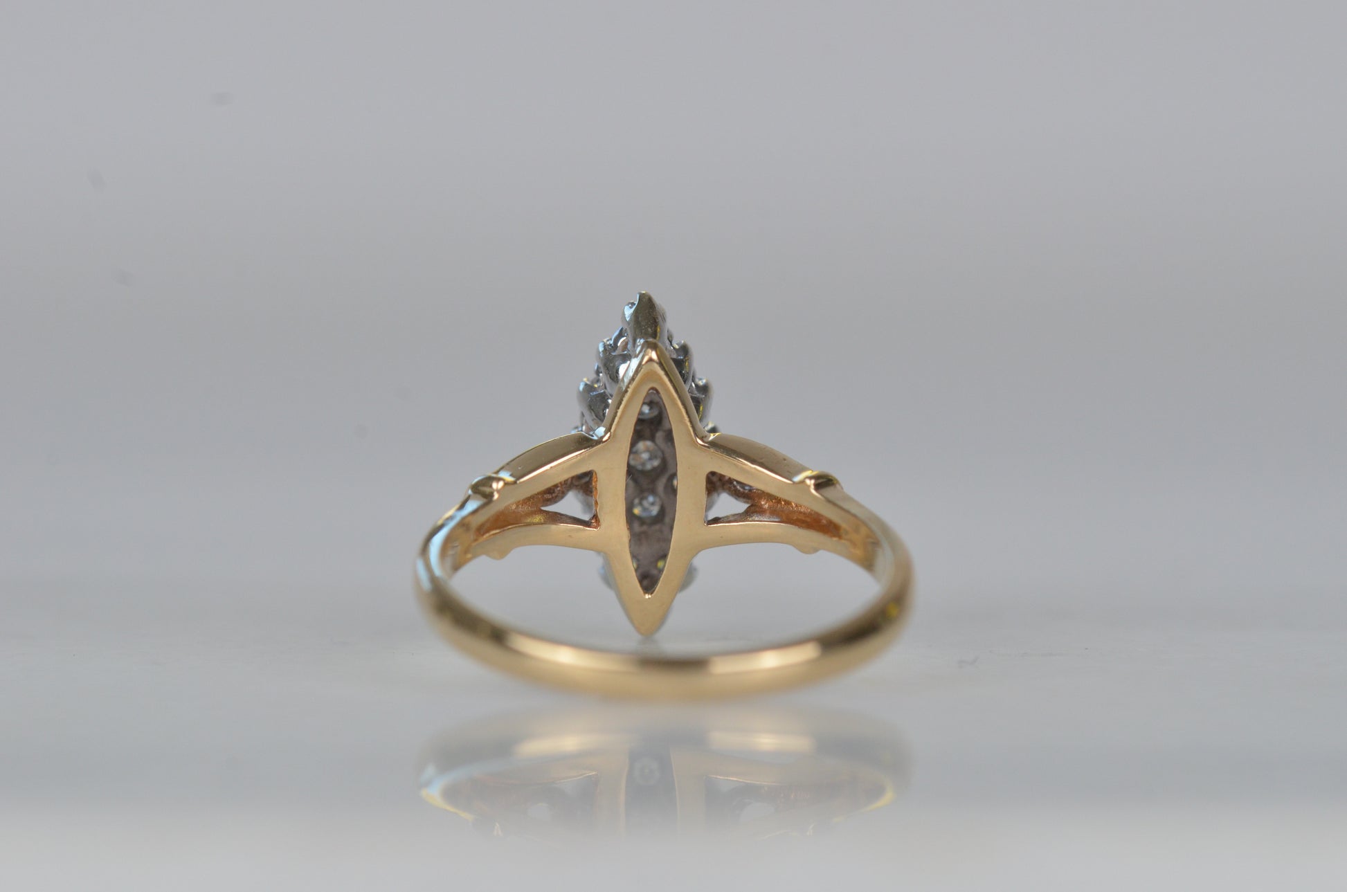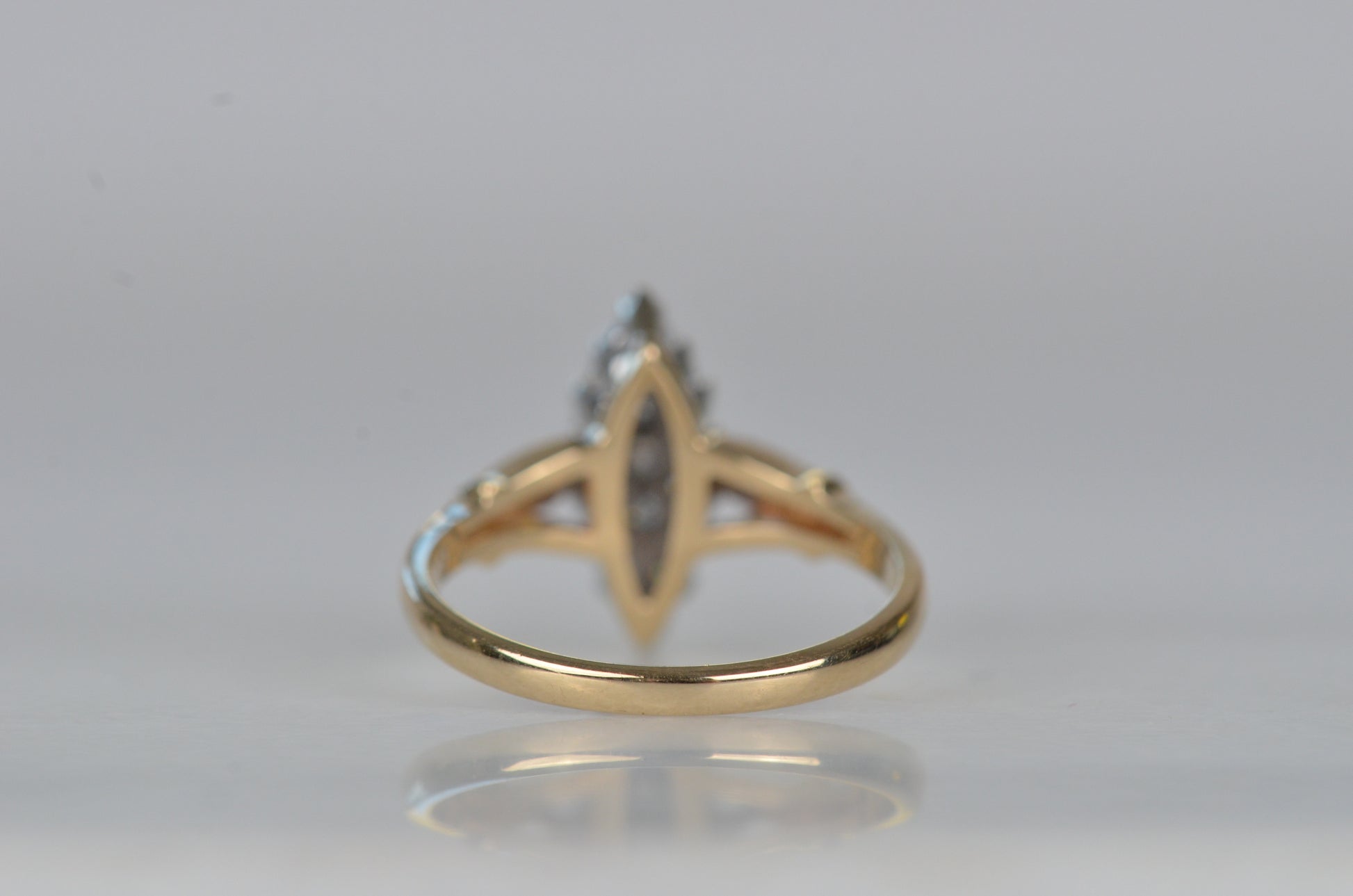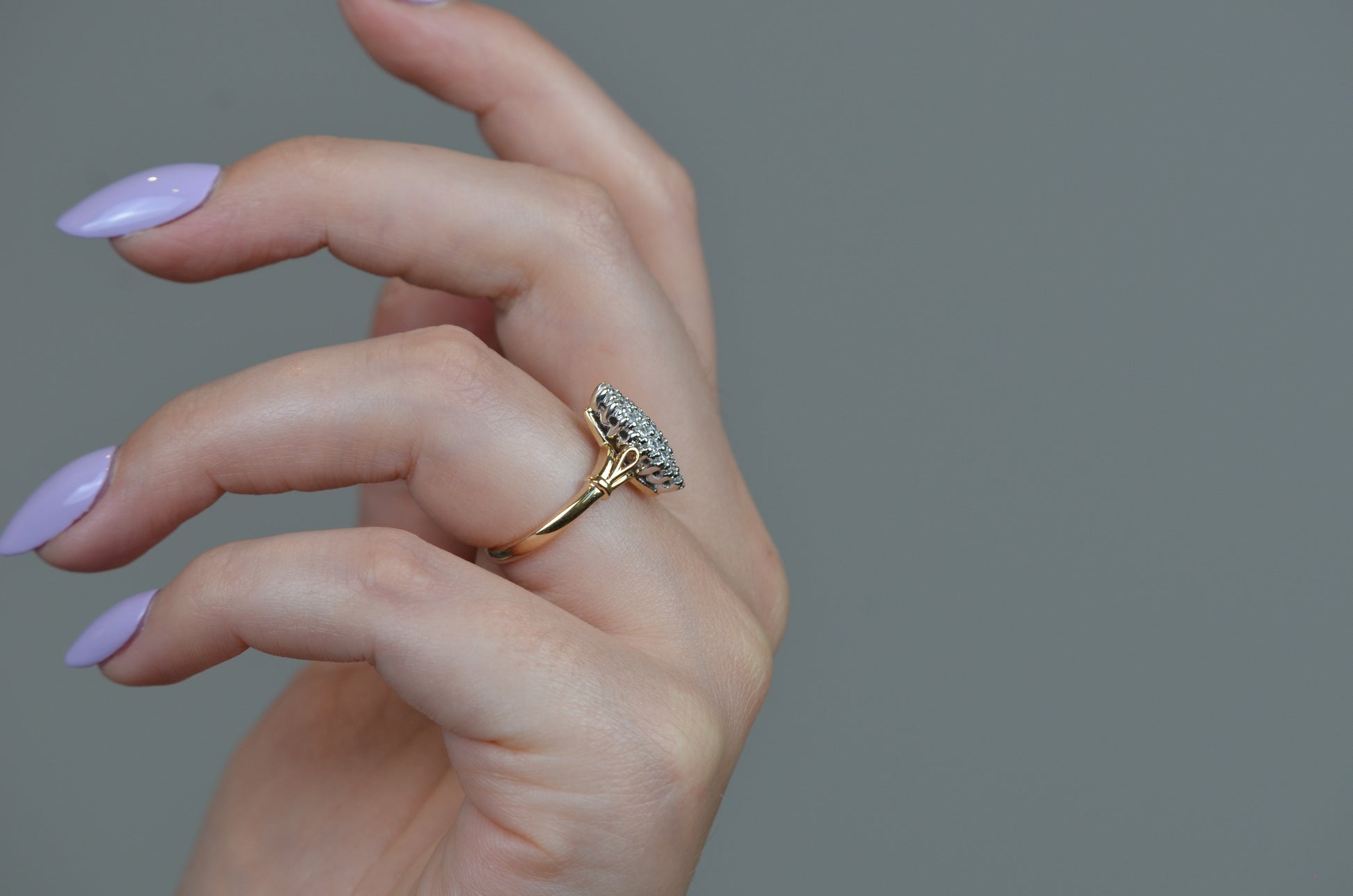 A delightful vintage take on a classic antique favourite: the navette - French for little ship - is a style where the clustered gems take on the gently tapered shape of a boat. With a sprinkling of small diamonds, from a distance, the ring takes the appearance of a beloved marquise cut. The centre diamond is a full brilliant cut, while the surrounding stones are crisp single cuts of varying sizes. The yellow gold band (the "P" in the stamp denotes plumb, or exact karatage) has had the head rhodium plated to enhance the look of solid white sparkle on the face. This ring has classic 1980s drama with 1880s flair.