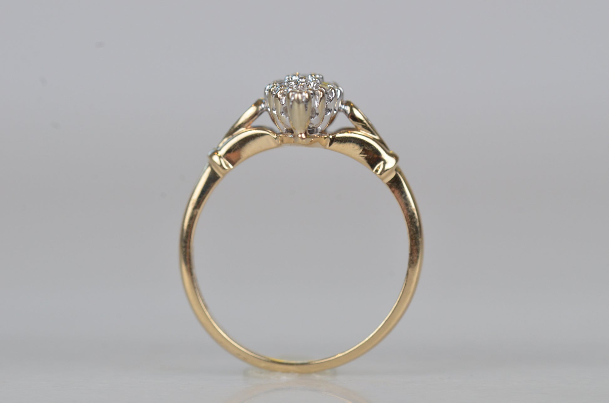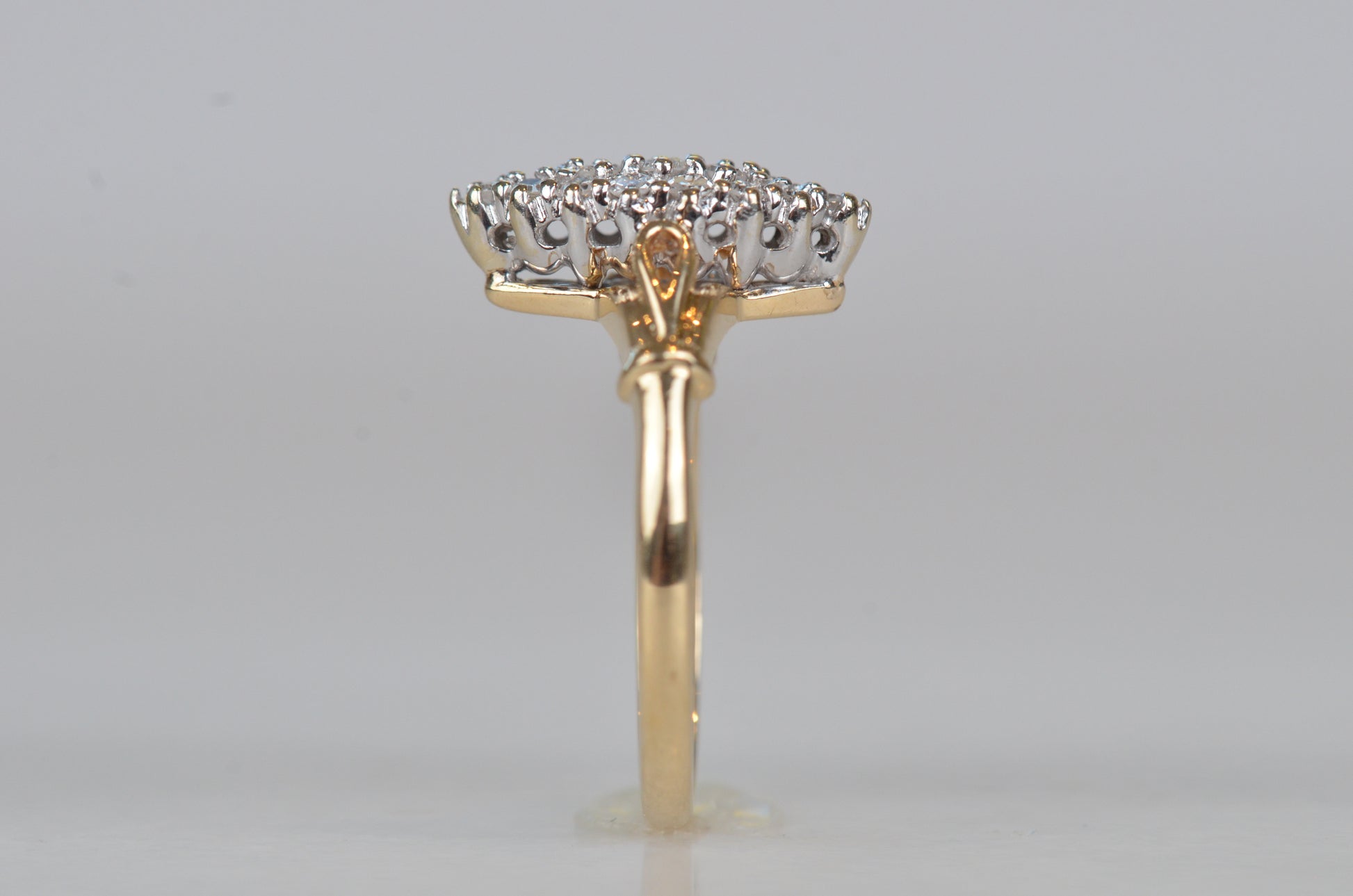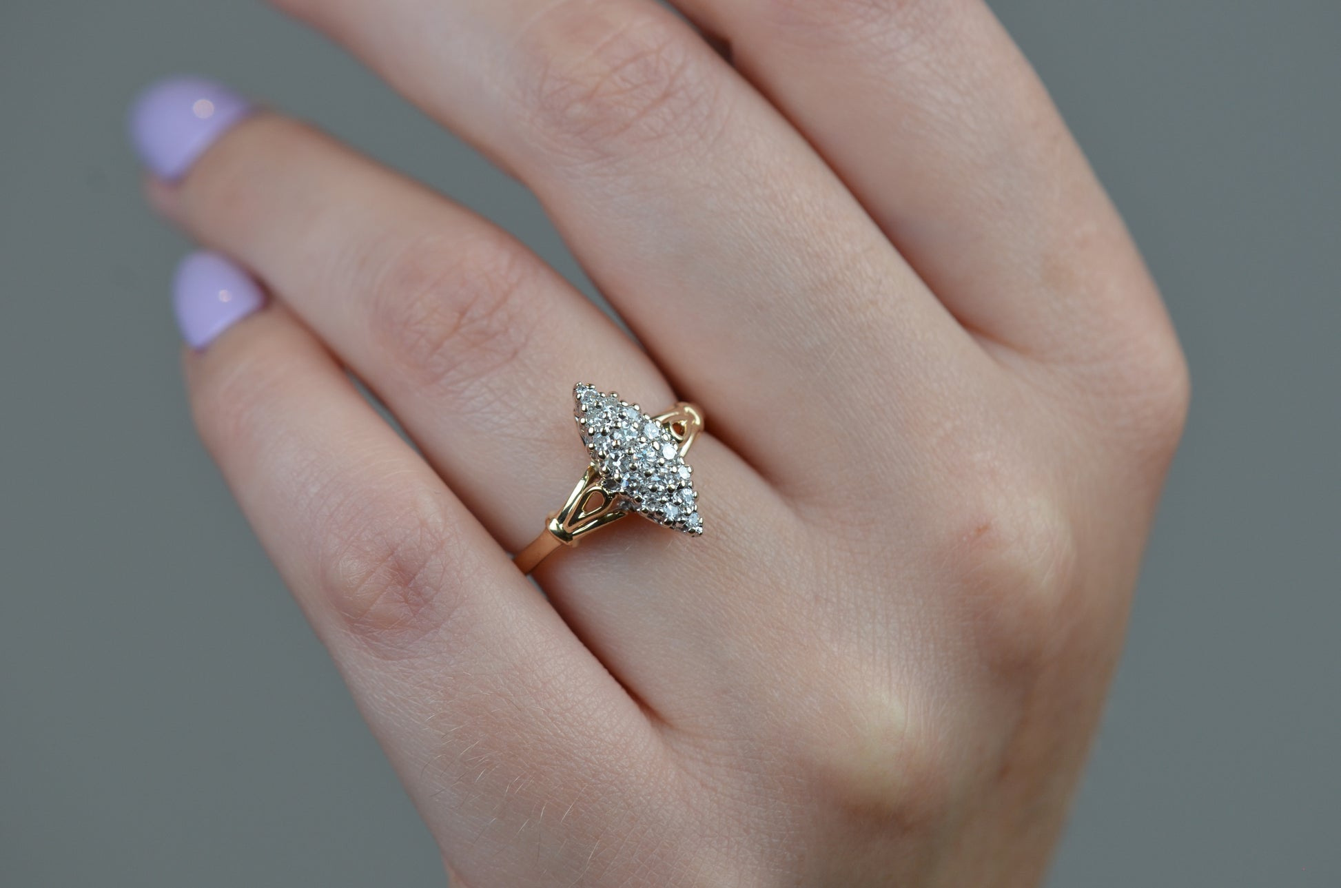 A delightful vintage take on a classic antique favourite: the navette - French for little ship - is a style where the clustered gems take on the gently tapered shape of a boat. With a sprinkling of small diamonds, from a distance, the ring takes the appearance of a beloved marquise cut. The centre diamond is a full brilliant cut, while the surrounding stones are crisp single cuts of varying sizes. The yellow gold band (the "P" in the stamp denotes plumb, or exact karatage) has had the head rhodium plated to enhance the look of solid white sparkle on the face. This ring has classic 1980s drama with 1880s flair.