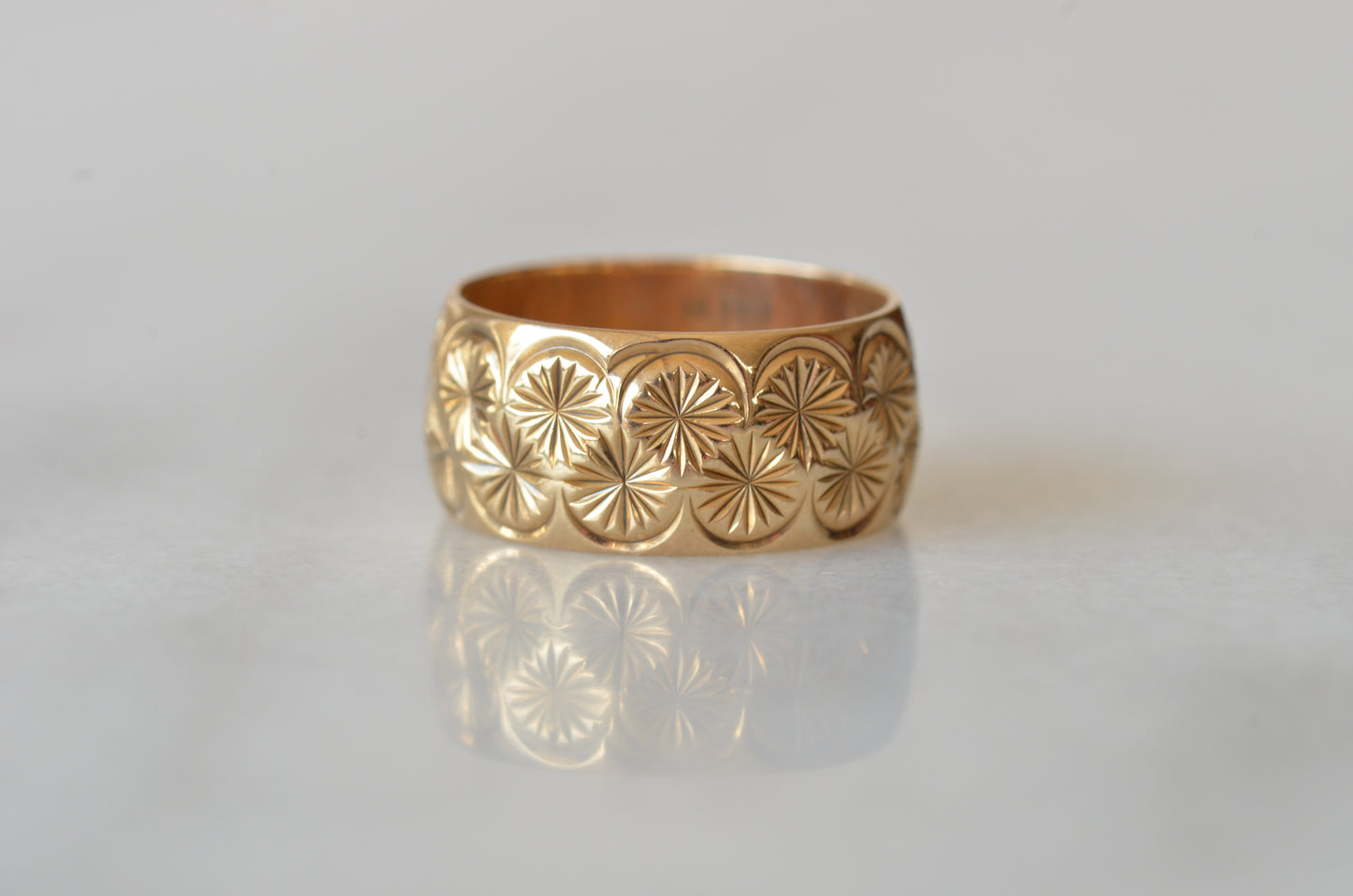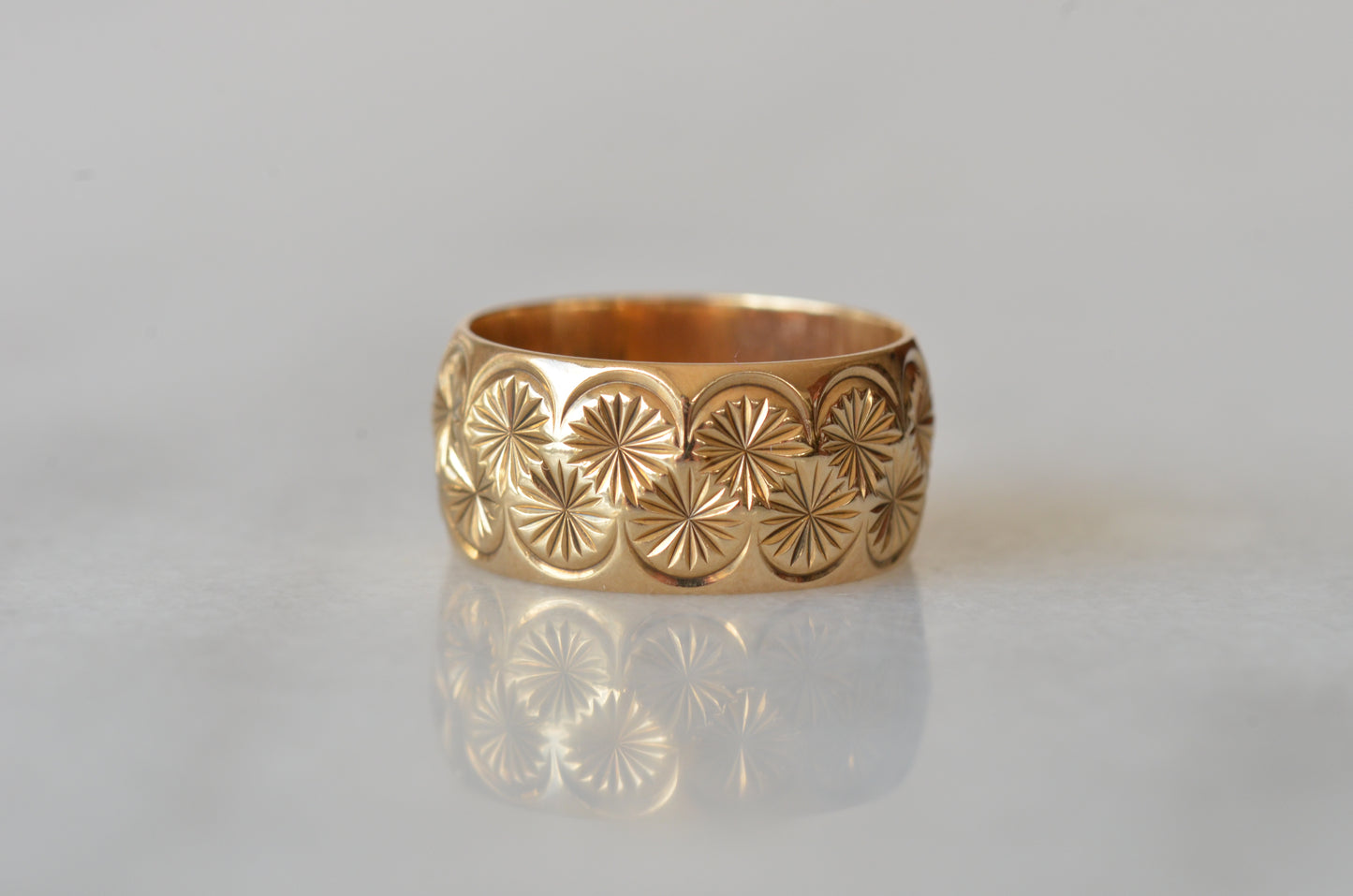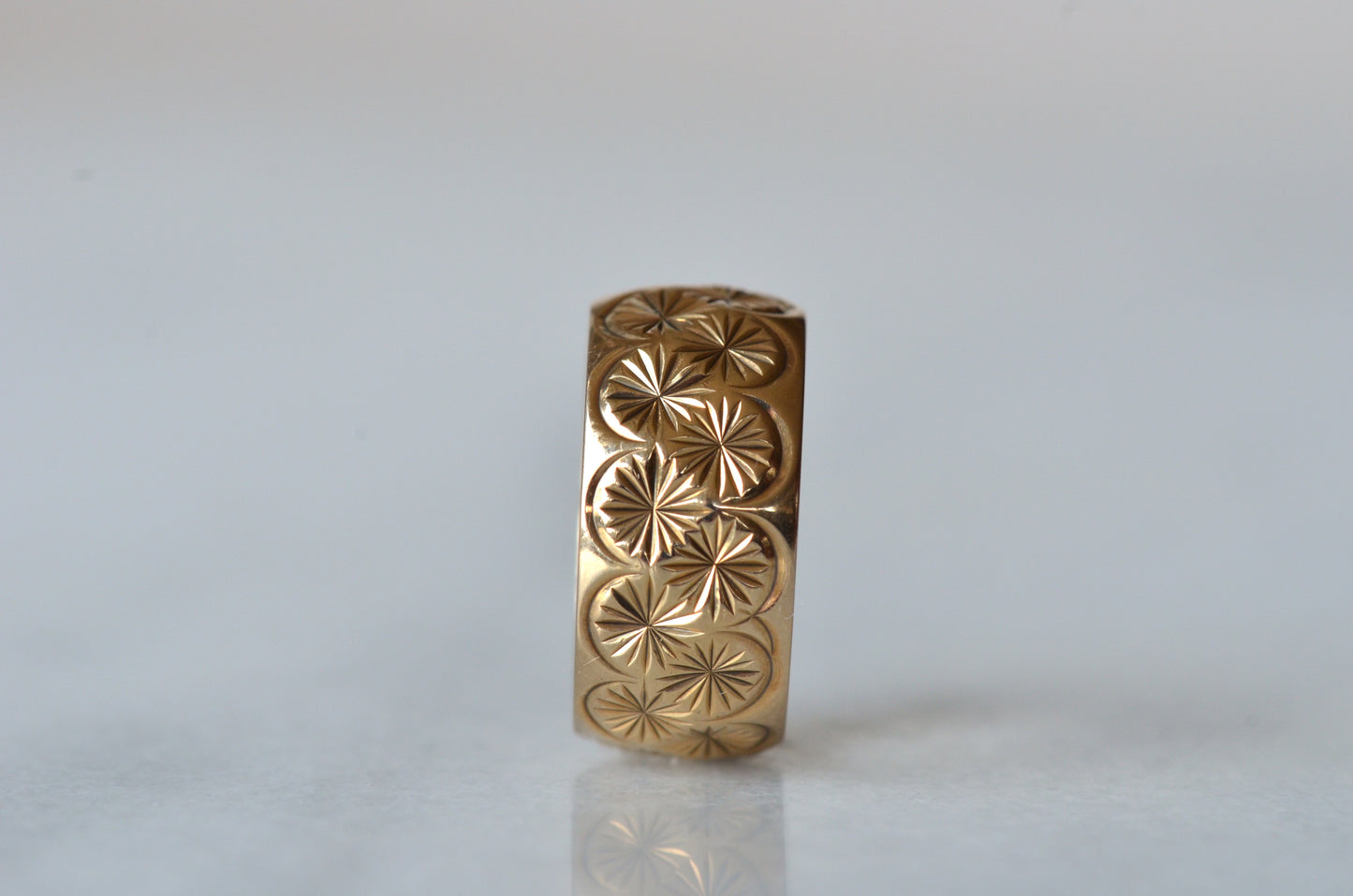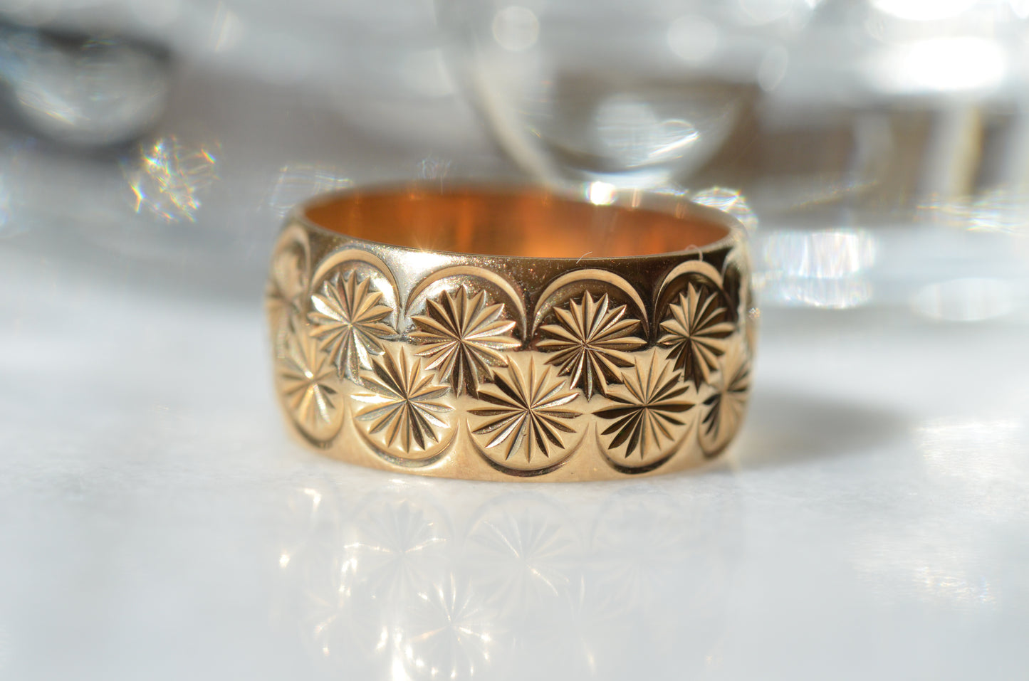 A bold and beautiful band, crafted in warm 9k gold that's developed a fine patina with age - the real star of the show is the deftly chased pattern applied all over the ring, creating a cascade of stars and rays that catch and reflect the light. The width and intricate pattern create a statement, while the simplicity of materials means you never have to fuss with this ring.