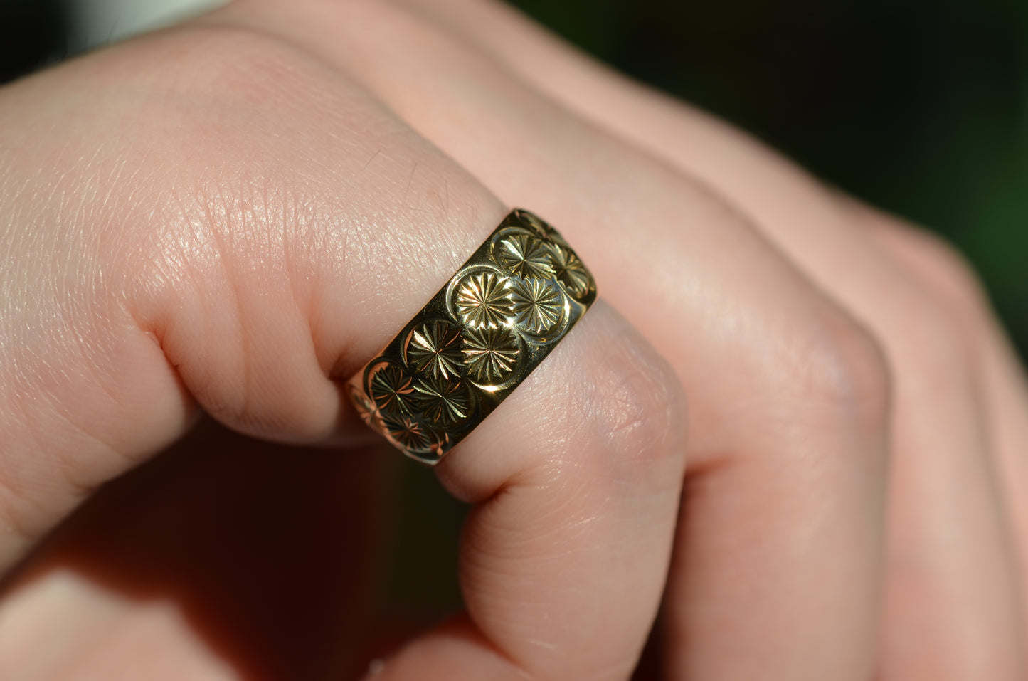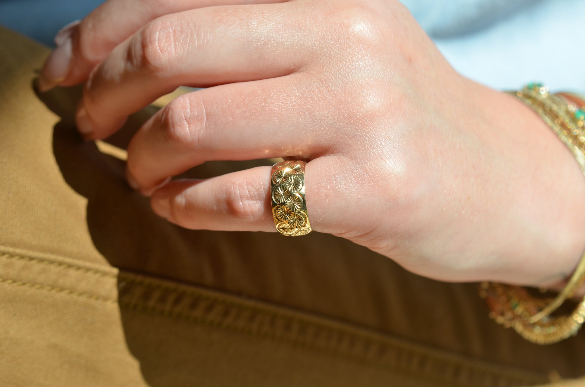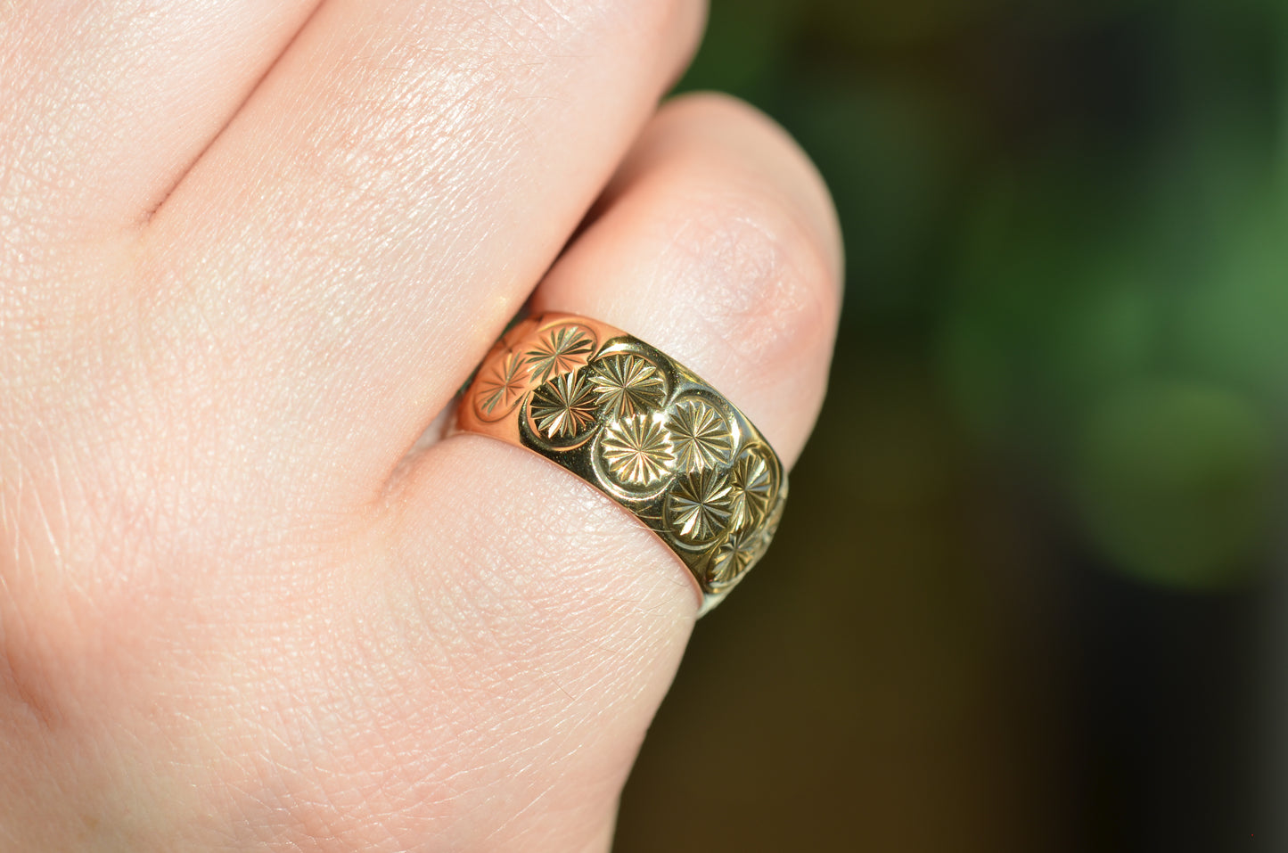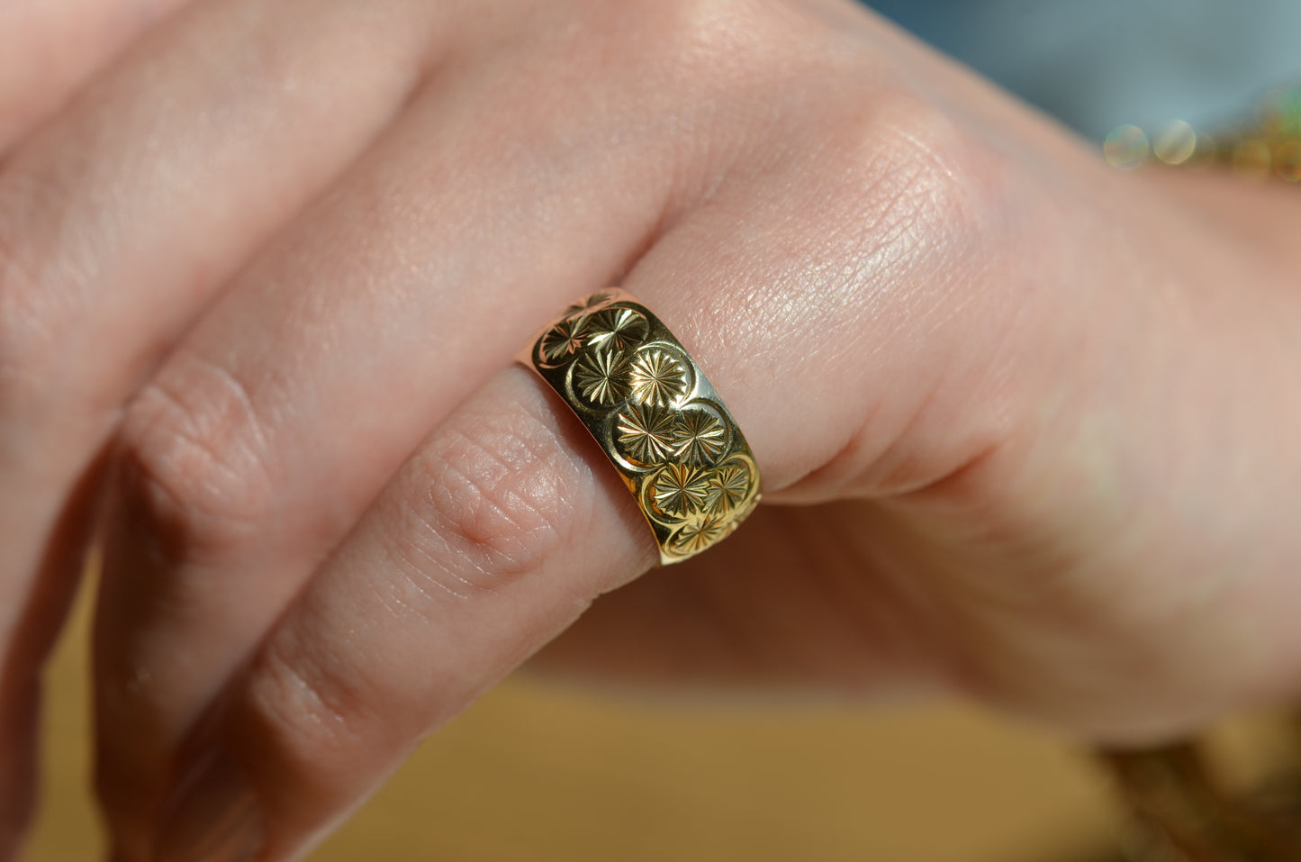 A bold and beautiful band, crafted in warm 9k gold that's developed a fine patina with age - the real star of the show is the deftly chased pattern applied all over the ring, creating a cascade of stars and rays that catch and reflect the light. The width and intricate pattern create a statement, while the simplicity of materials means you never have to fuss with this ring.