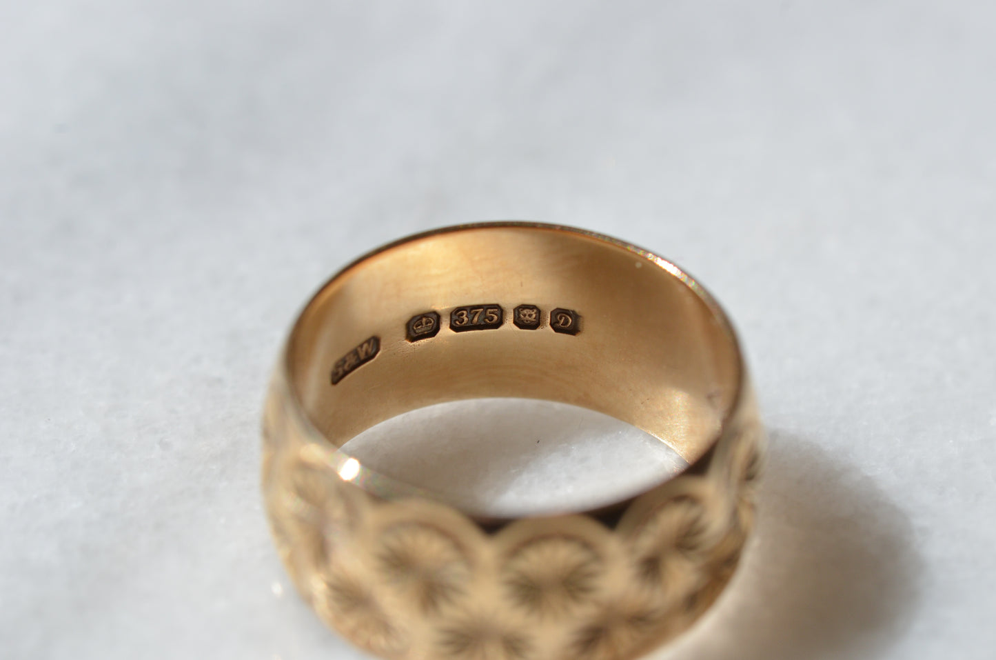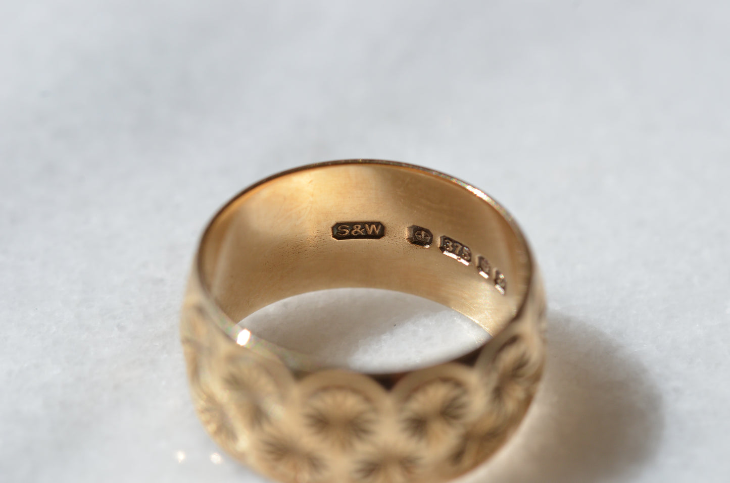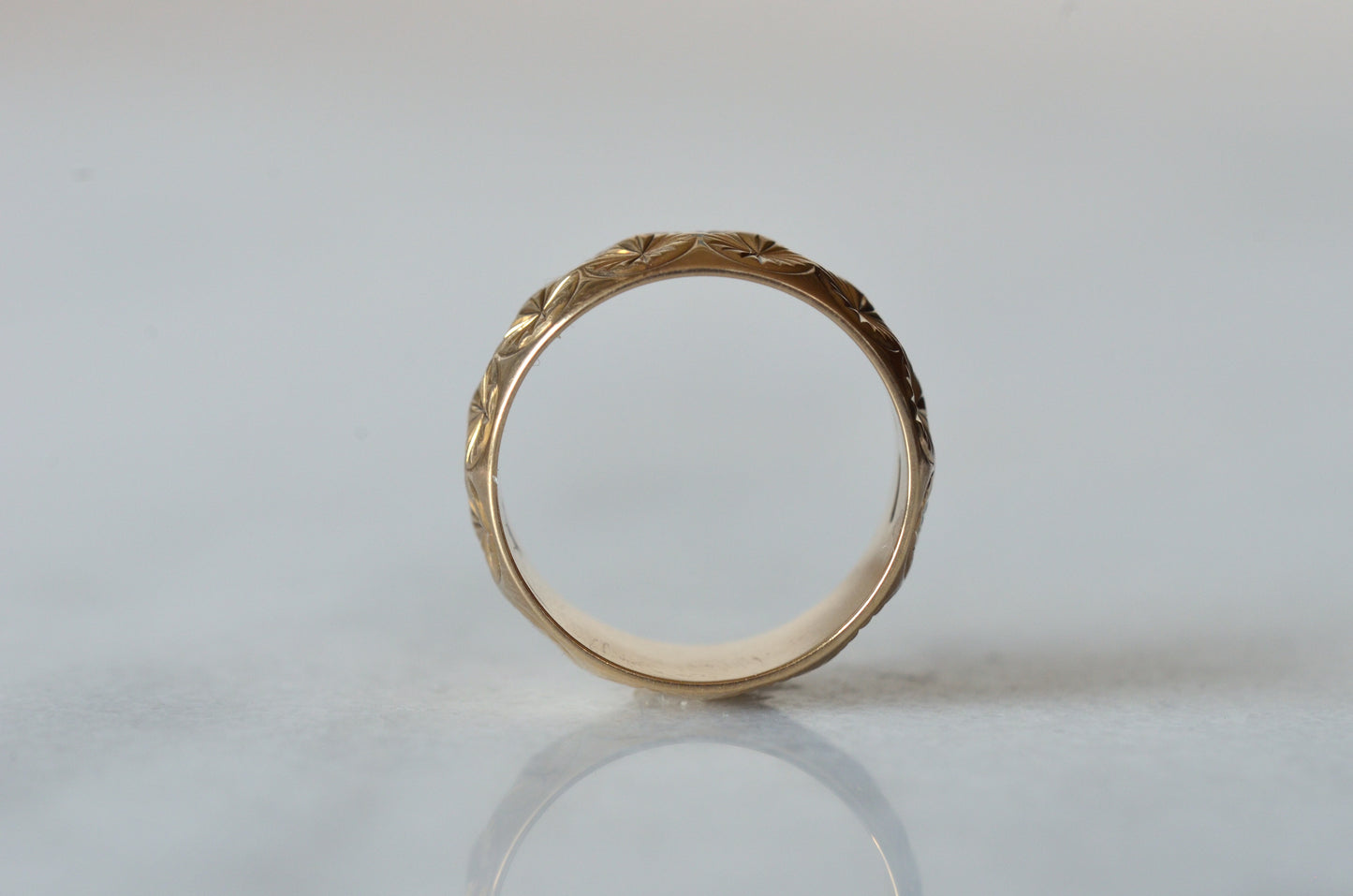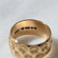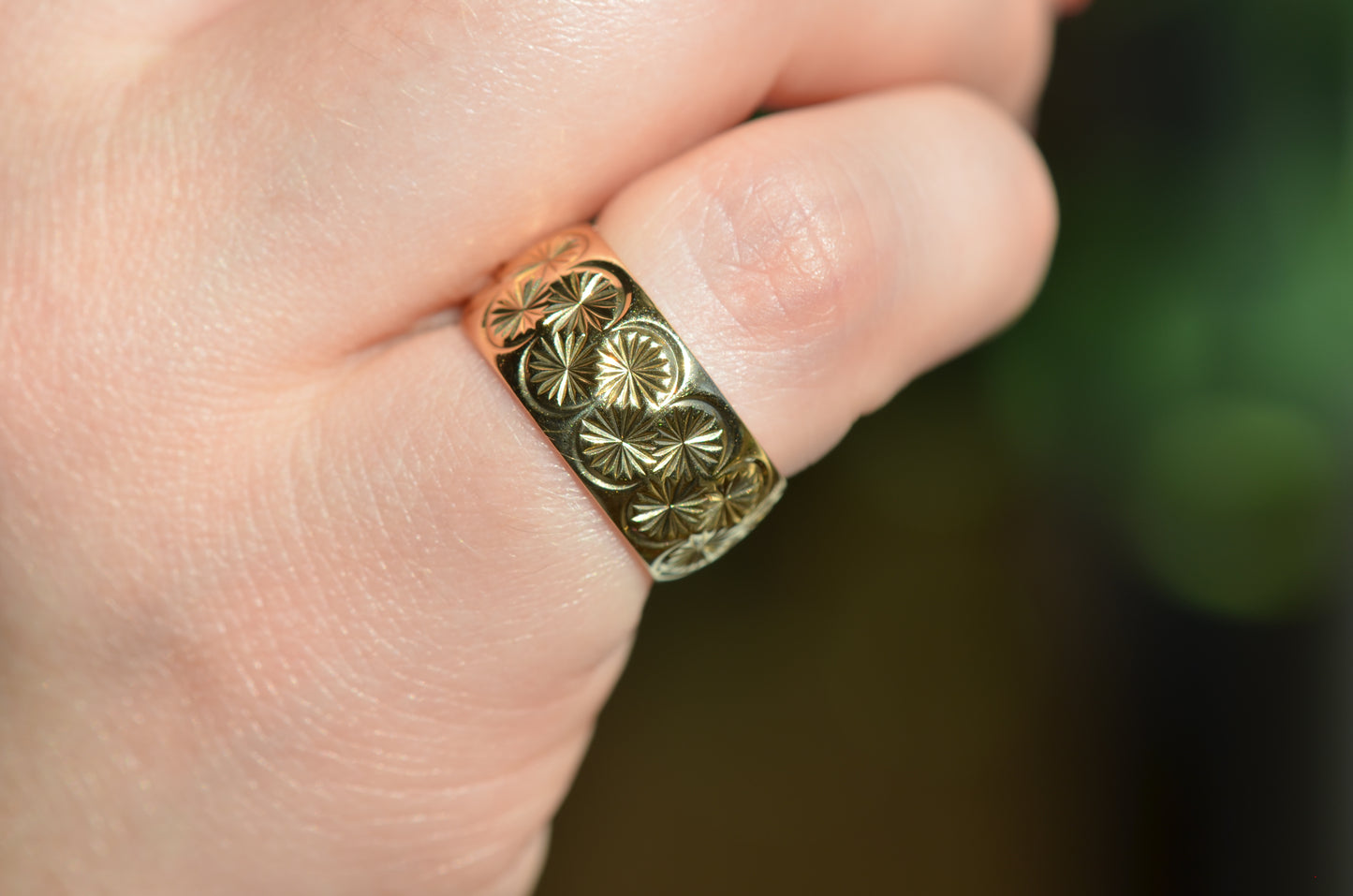 A bold and beautiful band, crafted in warm 9k gold that's developed a fine patina with age - the real star of the show is the deftly chased pattern applied all over the ring, creating a cascade of stars and rays that catch and reflect the light. The width and intricate pattern create a statement, while the simplicity of materials means you never have to fuss with this ring.