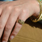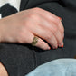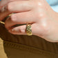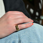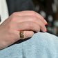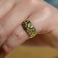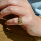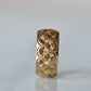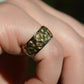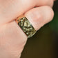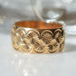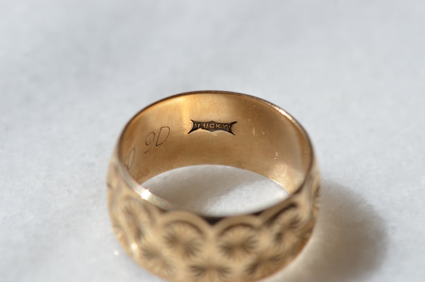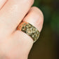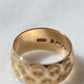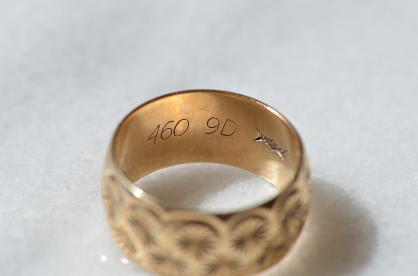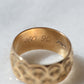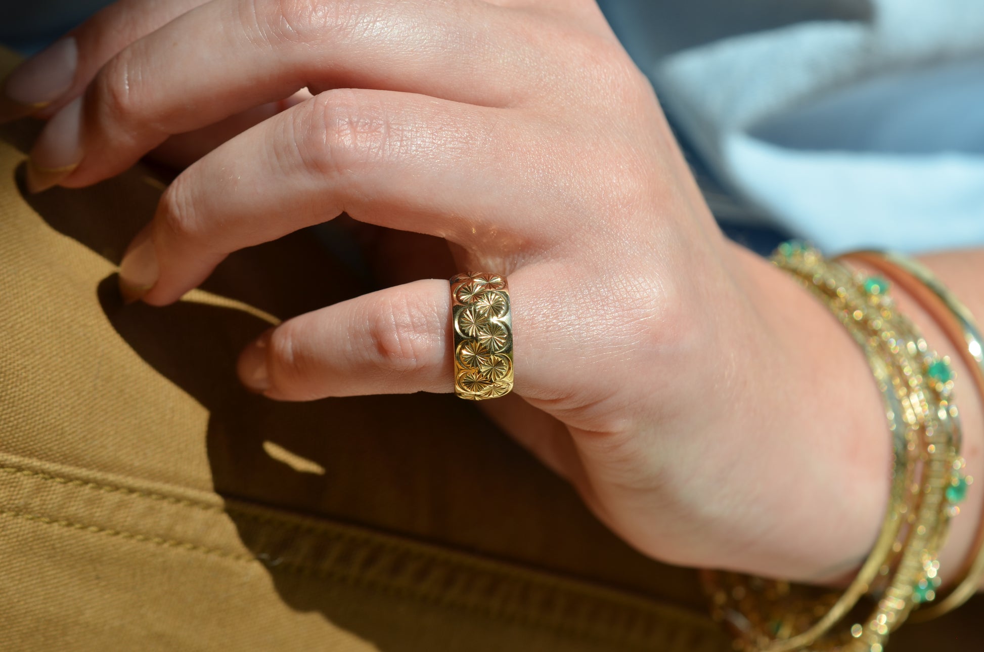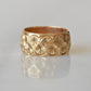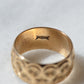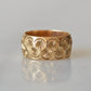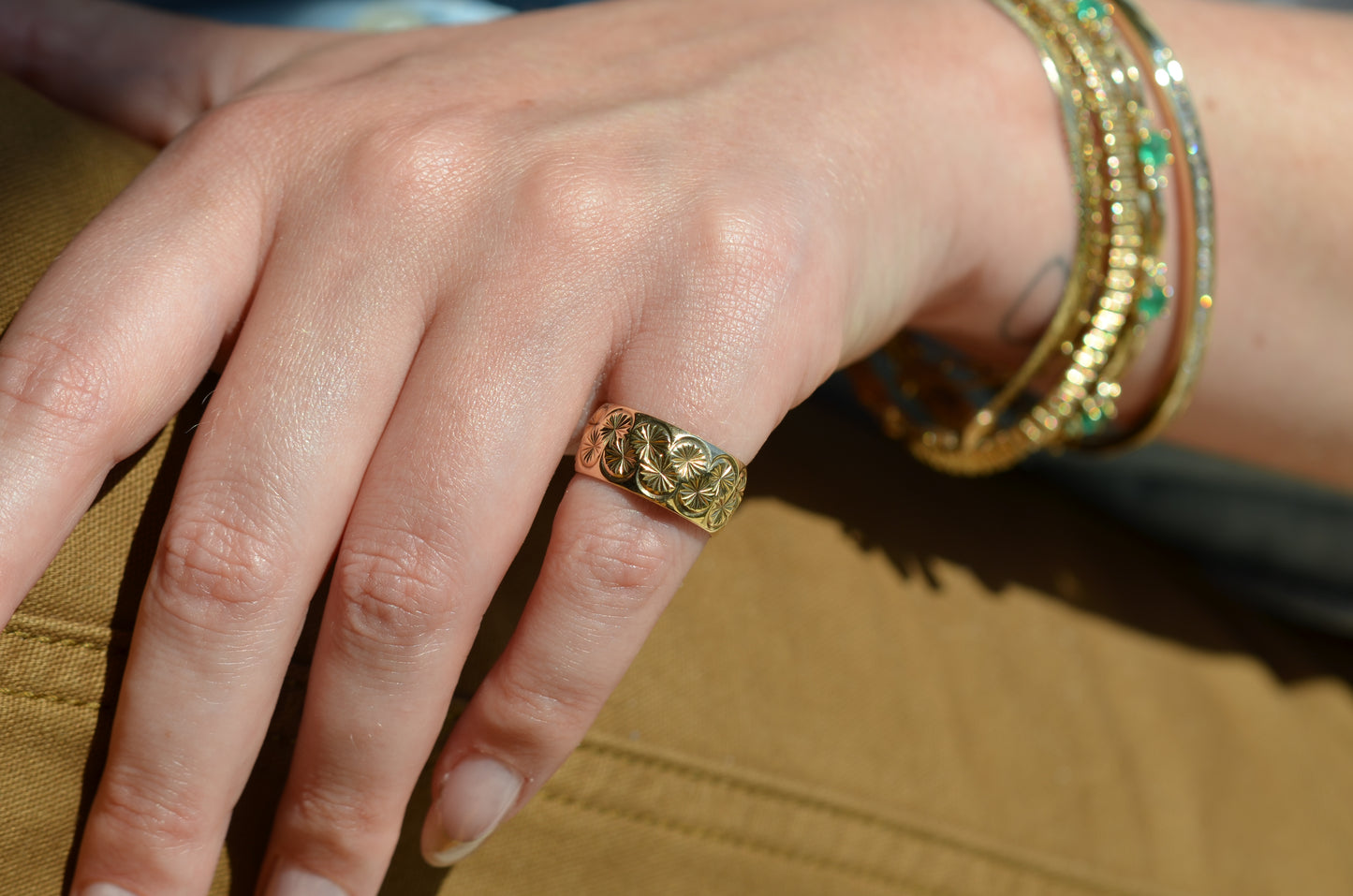 A bold and beautiful band, crafted in warm 9k gold that's developed a fine patina with age - the real star of the show is the deftly chased pattern applied all over the ring, creating a cascade of stars and rays that catch and reflect the light. The width and intricate pattern create a statement, while the simplicity of materials means you never have to fuss with this ring.