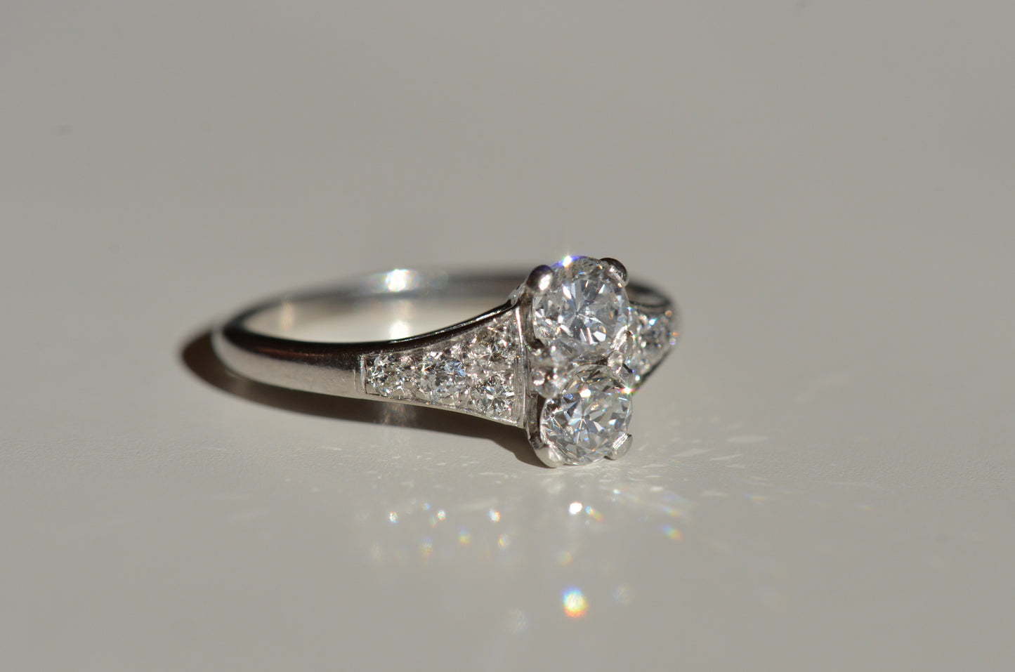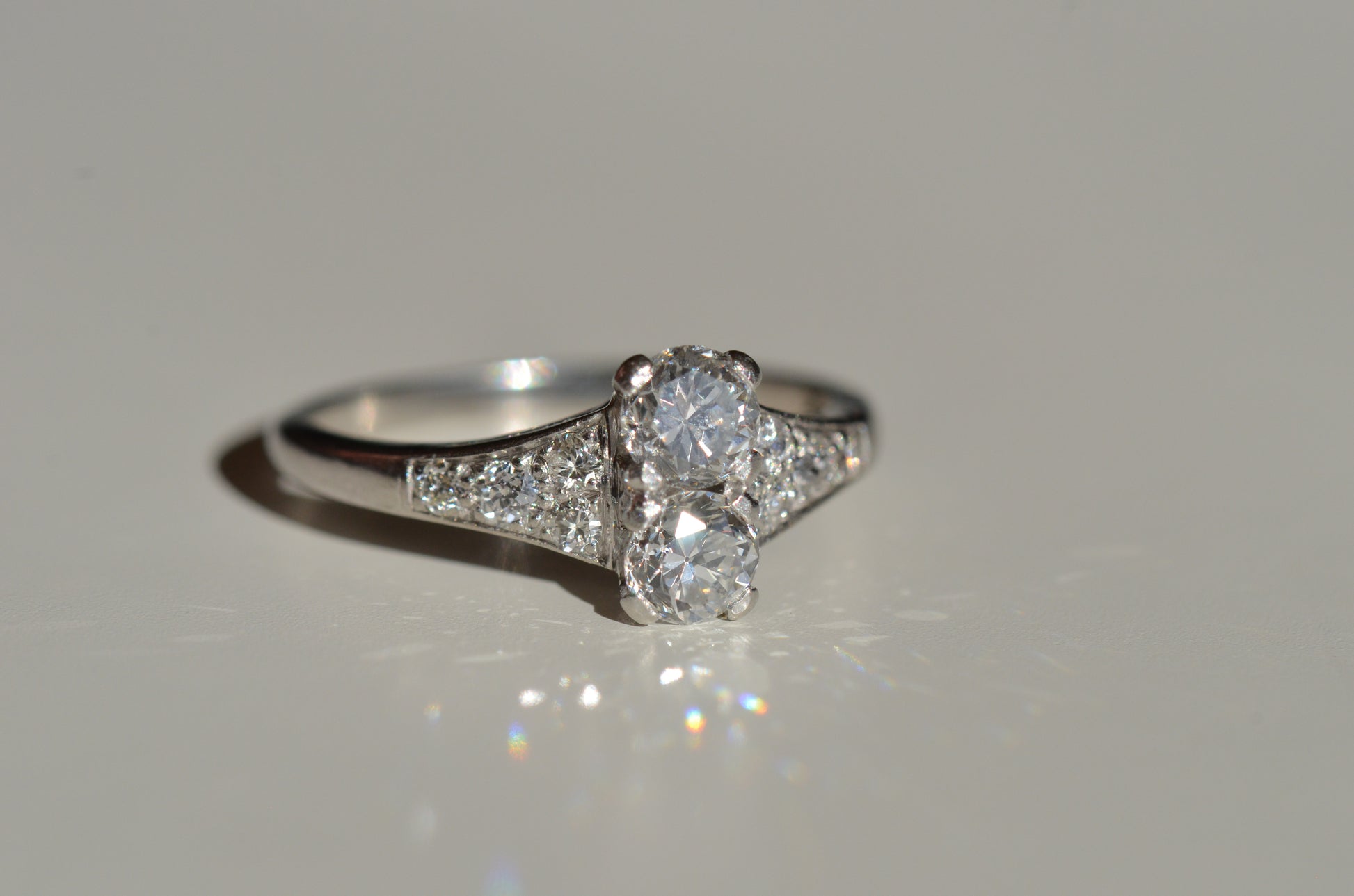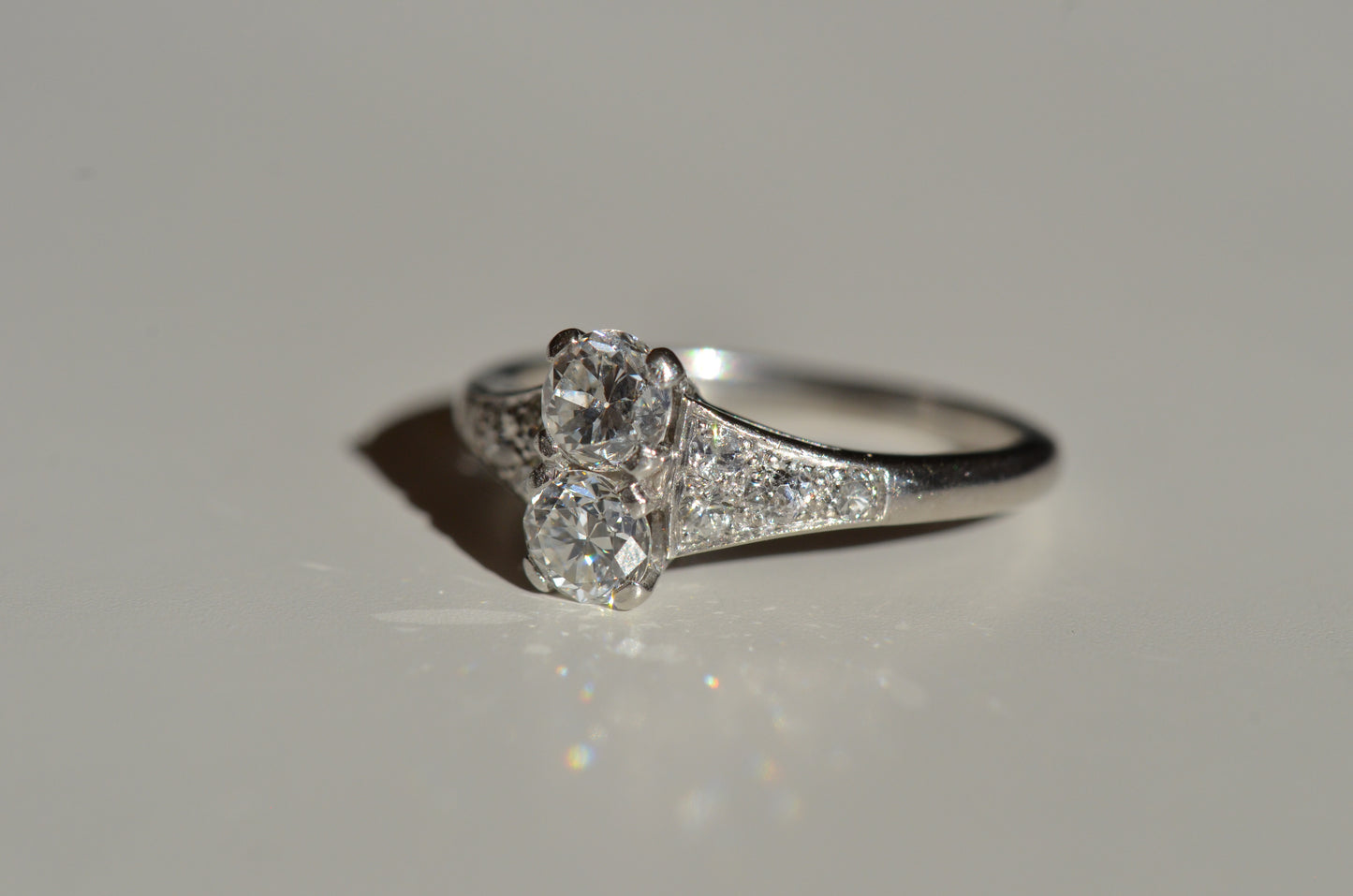 In 1796, Napoleon Bonaparte proposed to Joséphine de Beauharnais with a "toi et moi" ring (featuring a sapphire and a diamond), and the "you and me" style has remained in fashion with occasional surges in popularity to this day. Often the stones are set at an angle or in a complementary fashion, but there's something about this particular design that speaks to us - we love the way the two stones are set straight and level, appearing as two equal partners facing the world side by side.
