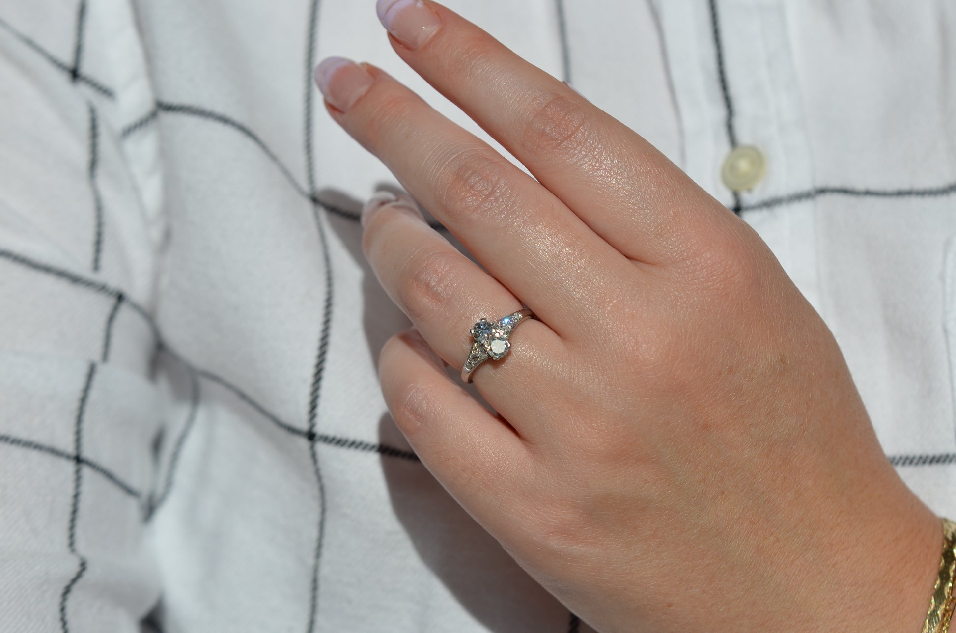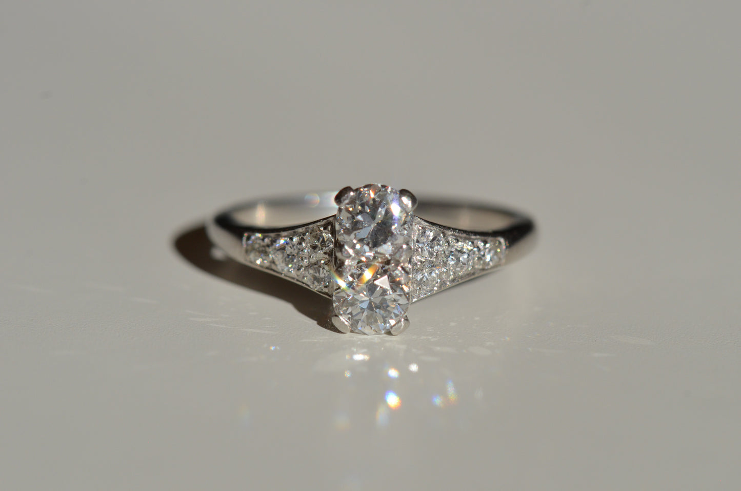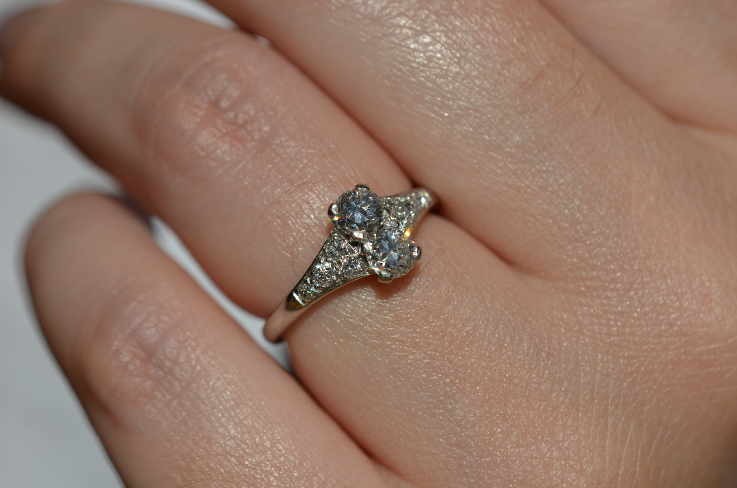 In 1796, Napoleon Bonaparte proposed to Joséphine de Beauharnais with a "toi et moi" ring (featuring a sapphire and a diamond), and the "you and me" style has remained in fashion with occasional surges in popularity to this day. Often the stones are set at an angle or in a complementary fashion, but there's something about this particular design that speaks to us - we love the way the two stones are set straight and level, appearing as two equal partners facing the world side by side.