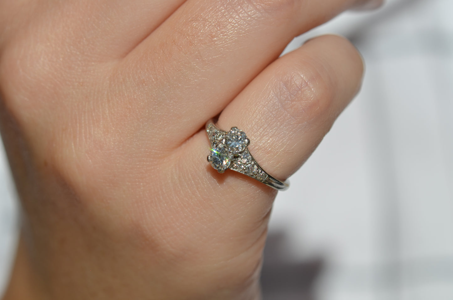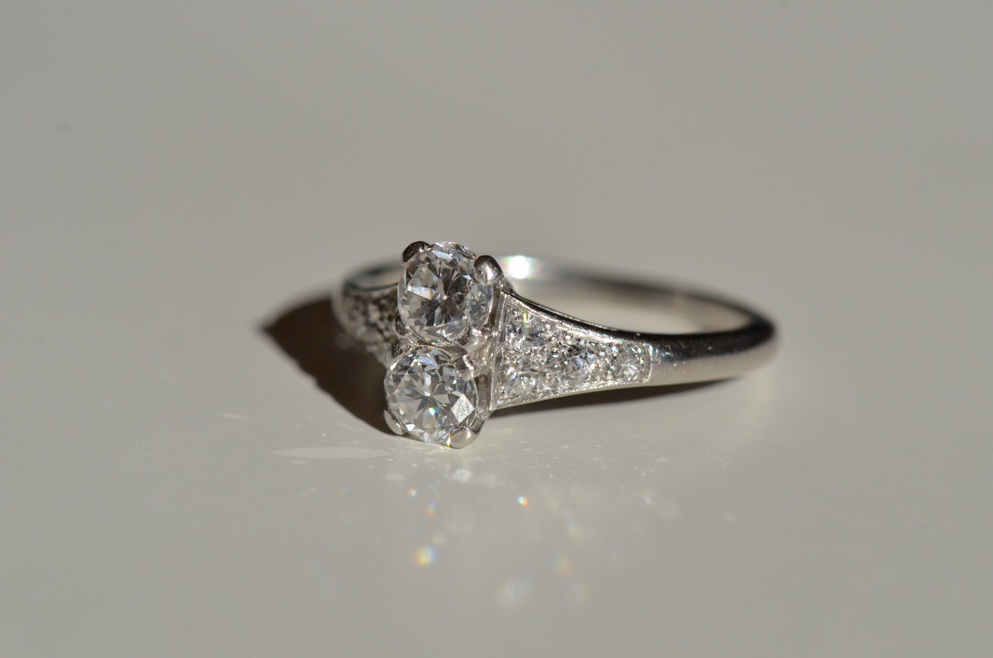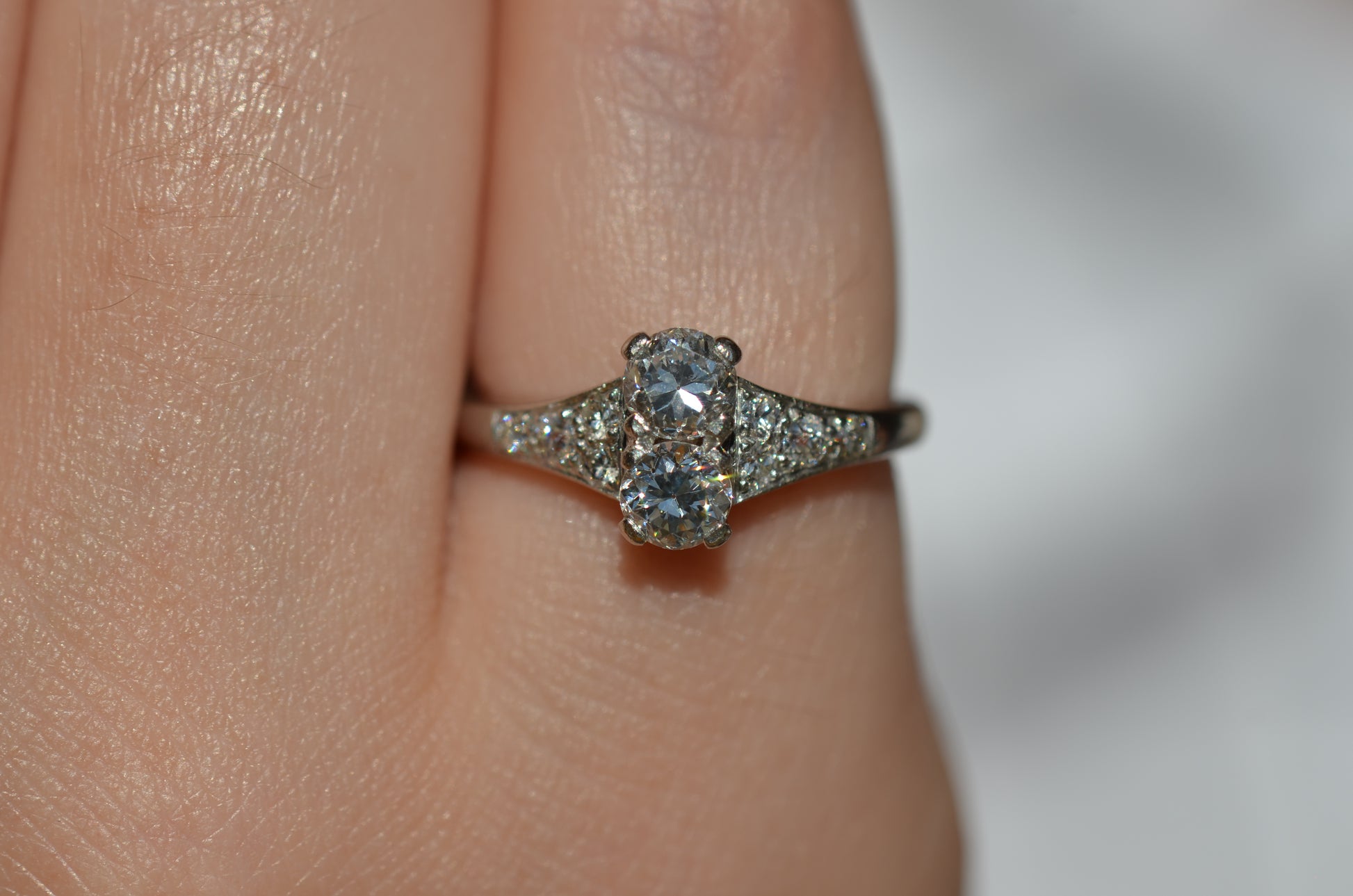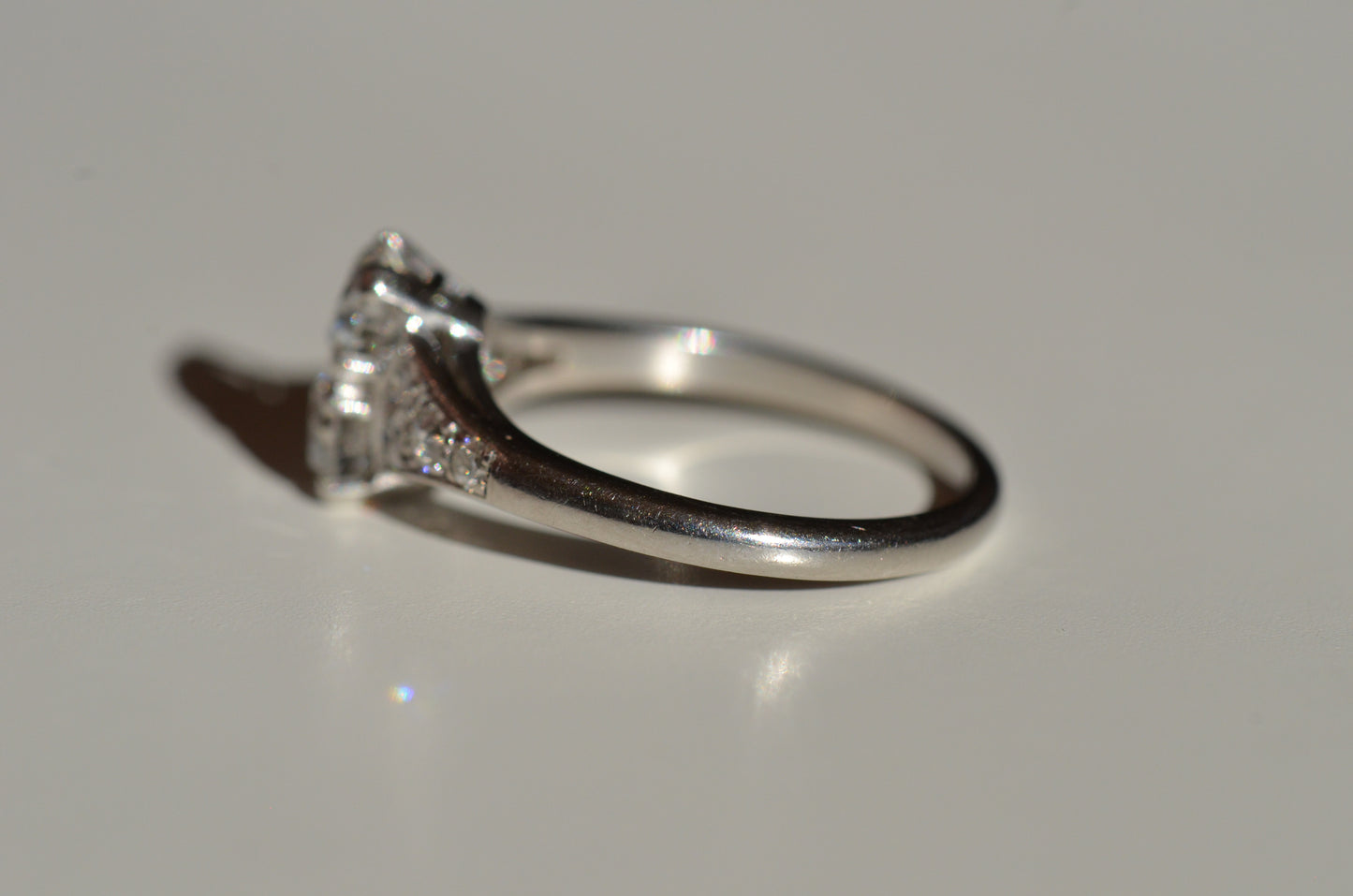 This stunning ring takes design cues from crisp, delicate symmetry of the late Edwardian and early Art Deco eras - the perfect home for its hand-cut old European diamonds - but the fabrication of the ring in palladium, a member of the platinum family, tells us this romantic piece was made slightly later. While white gold and platinum (both freshly available for jewelry use in the early 20th century) were the metals of choice in the 1910s-1930s, restrictions to civilian use of various metals during World War II meant those favourites were unavailable. Palladium was used instead from about 1939, and at a lower price than platinum and whiter than white gold, made a fine option for the time. Palladium is still occasionally used in jewelry (and in white gold alloys), but usage dropped way down once platinum and nickel were no longer considered strategic resources for war.