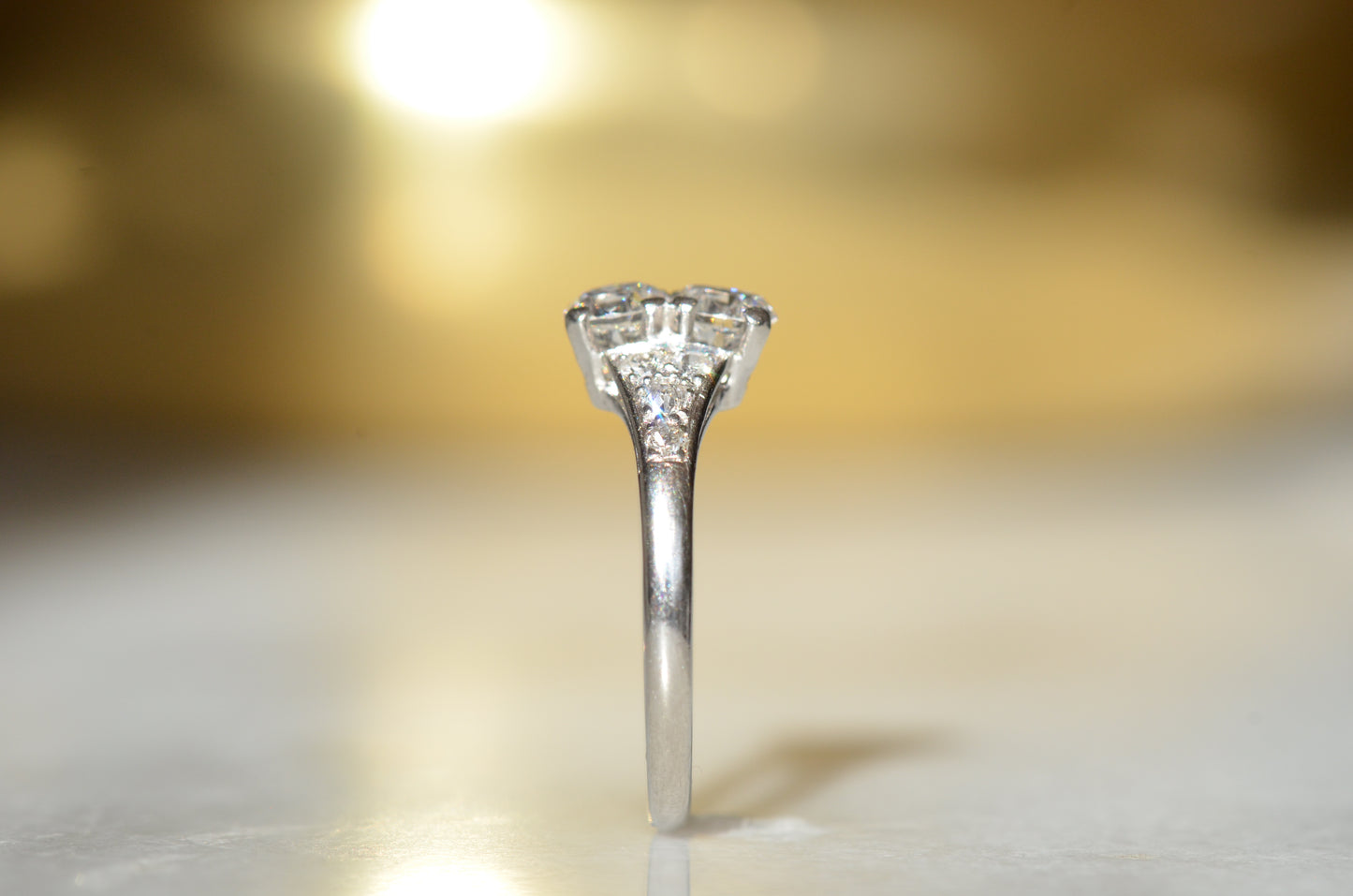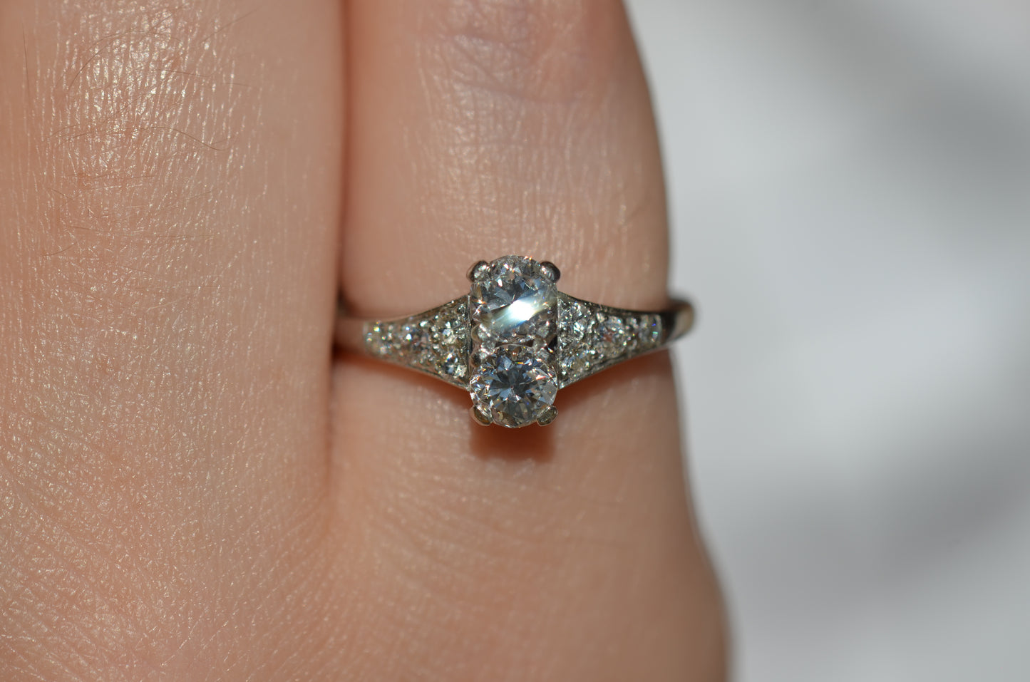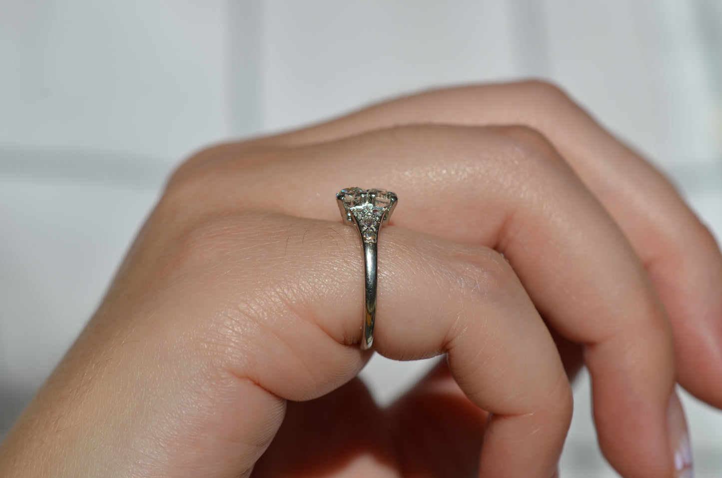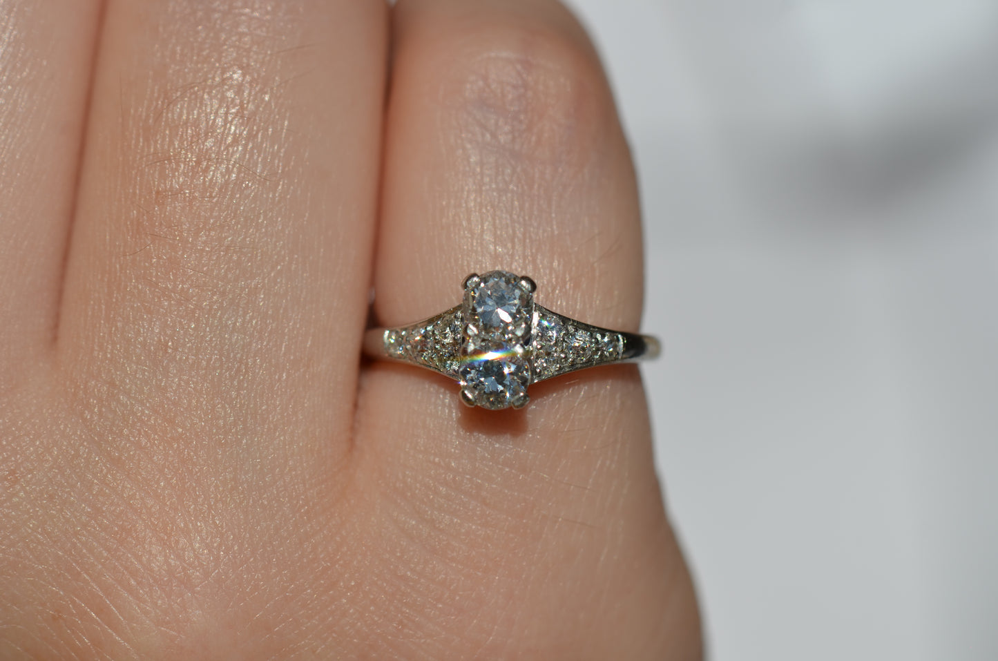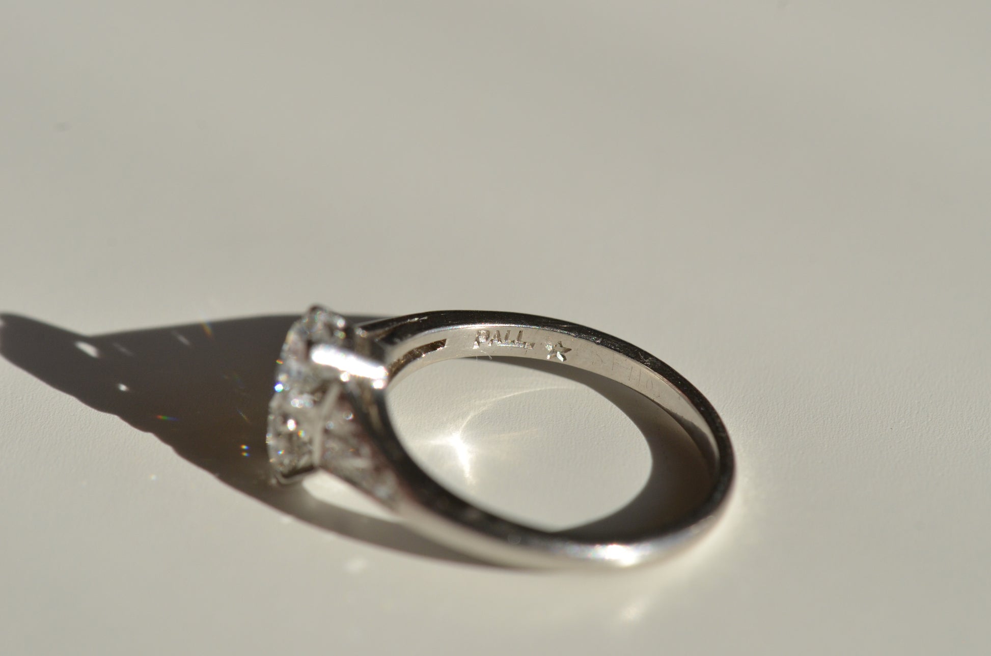 This stunning ring takes design cues from crisp, delicate symmetry of the late Edwardian and early Art Deco eras - the perfect home for its hand-cut old European diamonds - but the fabrication of the ring in palladium, a member of the platinum family, tells us this romantic piece was made slightly later. While white gold and platinum (both freshly available for jewelry use in the early 20th century) were the metals of choice in the 1910s-1930s, restrictions to civilian use of various metals during World War II meant those favourites were unavailable. Palladium was used instead from about 1939, and at a lower price than platinum and whiter than white gold, made a fine option for the time. Palladium is still occasionally used in jewelry (and in white gold alloys), but usage dropped way down once platinum and nickel were no longer considered strategic resources for war.