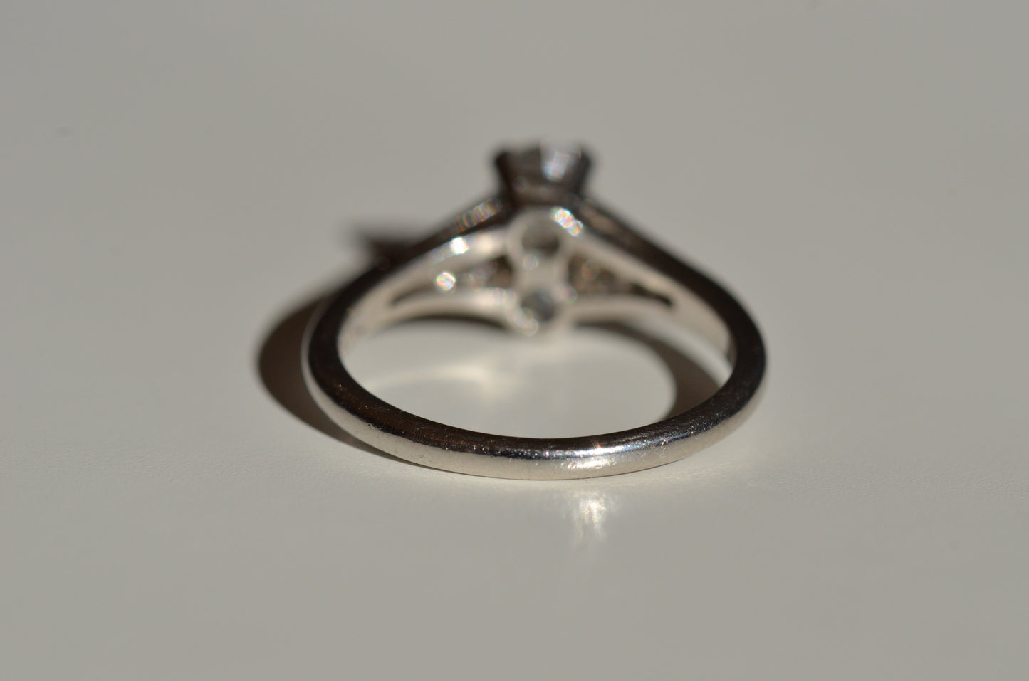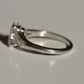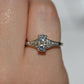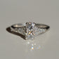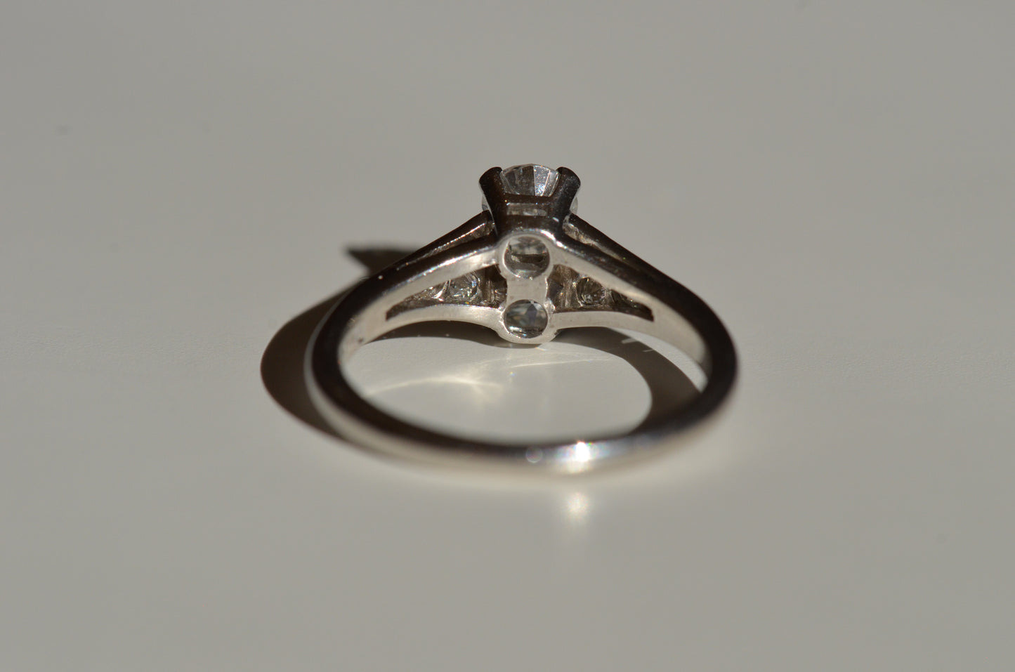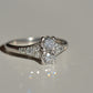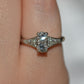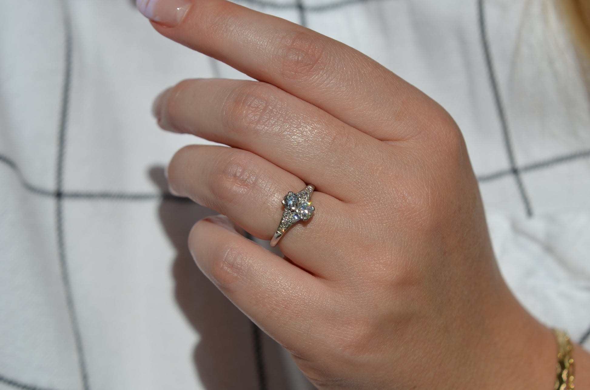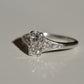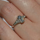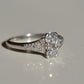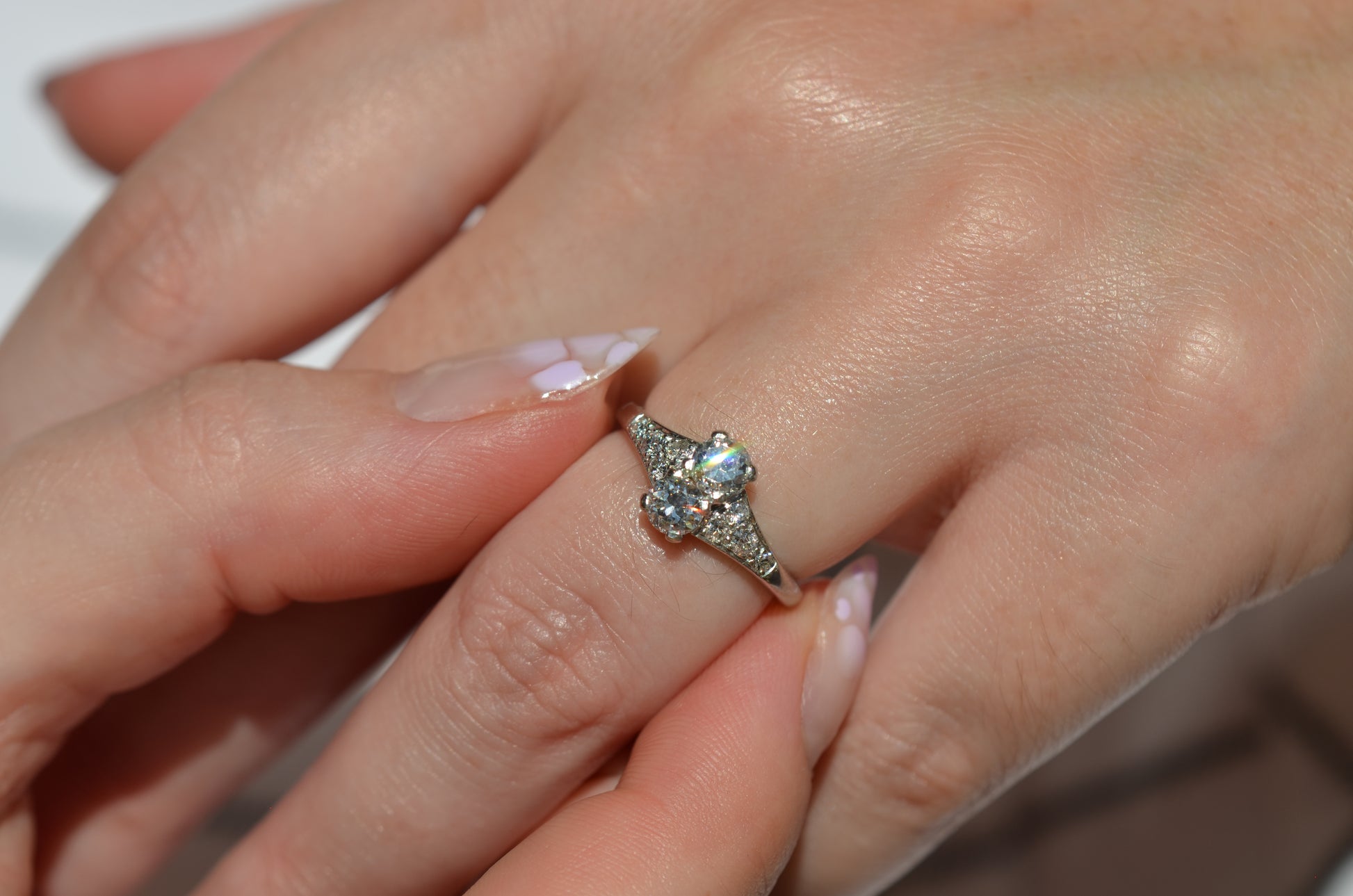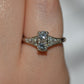 This stunning ring takes design cues from crisp, delicate symmetry of the late Edwardian and early Art Deco eras - the perfect home for its hand-cut old European diamonds - but the fabrication of the ring in palladium, a member of the platinum family, tells us this romantic piece was made slightly later. While white gold and platinum (both freshly available for jewelry use in the early 20th century) were the metals of choice in the 1910s-1930s, restrictions to civilian use of various metals during World War II meant those favourites were unavailable. Palladium was used instead from about 1939, and at a lower price than platinum and whiter than white gold, made a fine option for the time. Palladium is still occasionally used in jewelry (and in white gold alloys), but usage dropped way down once platinum and nickel were no longer considered strategic resources for war.