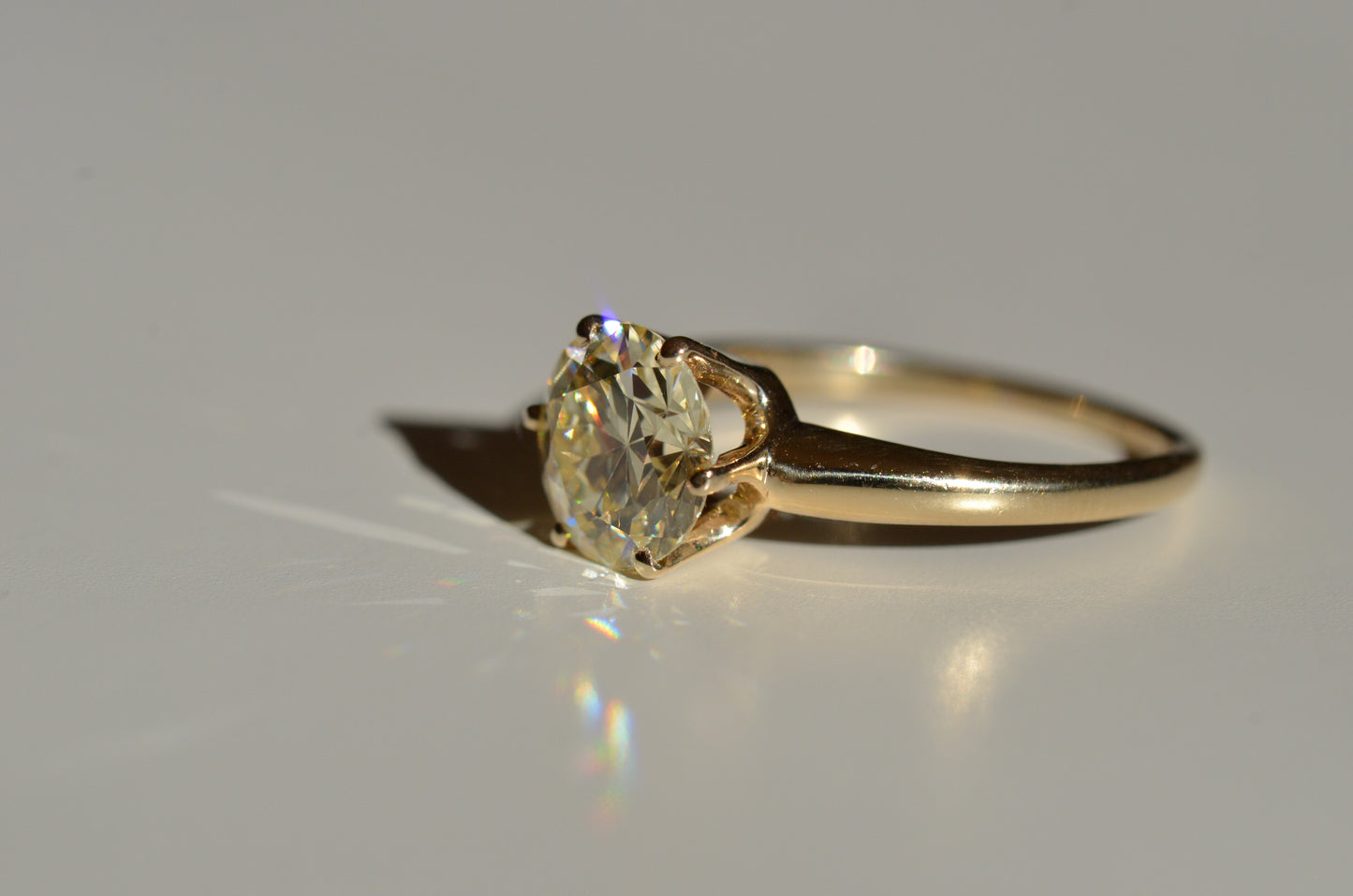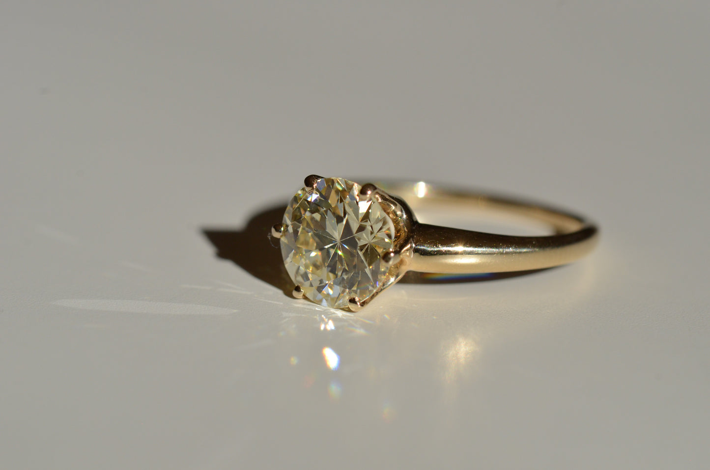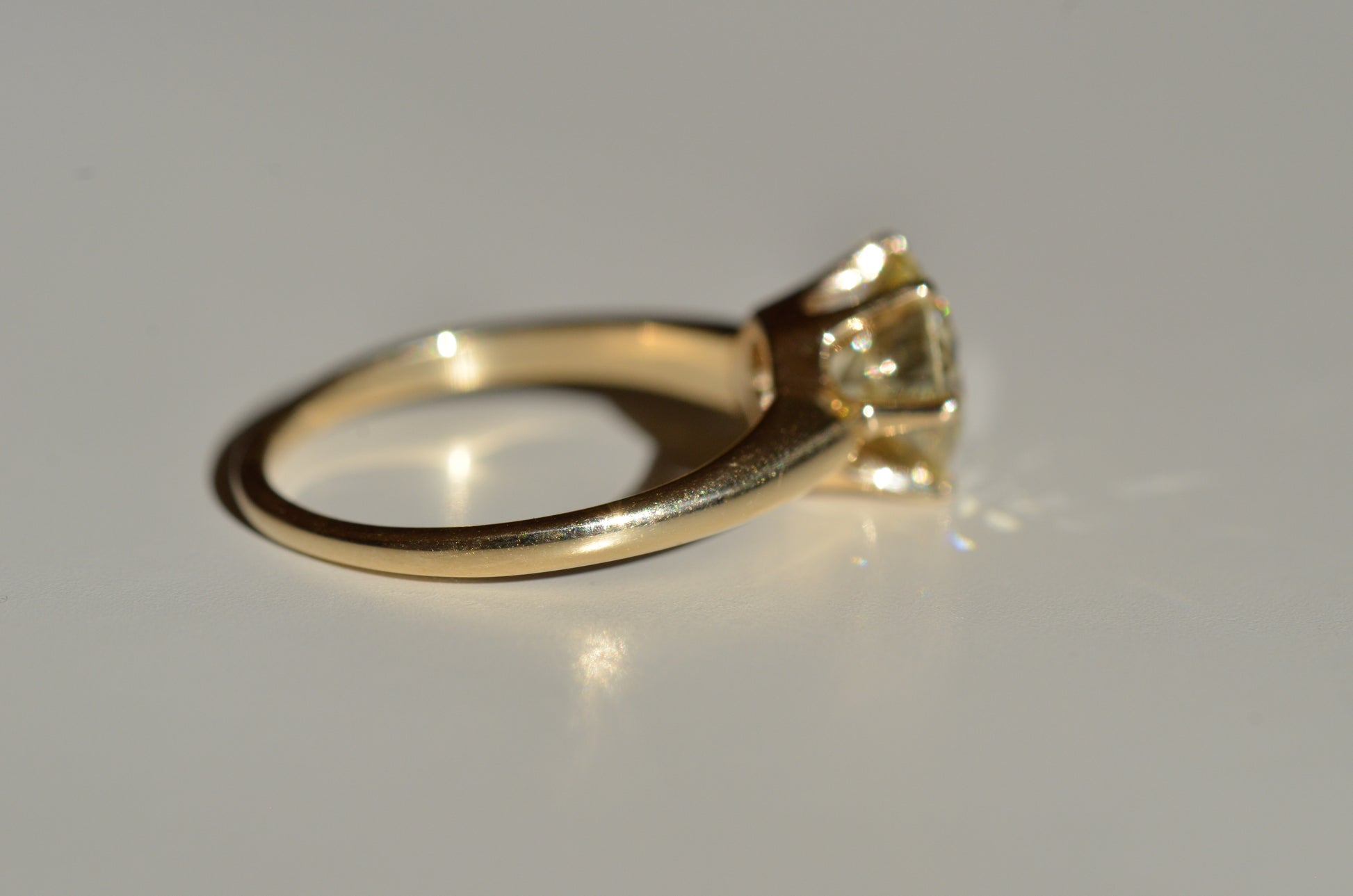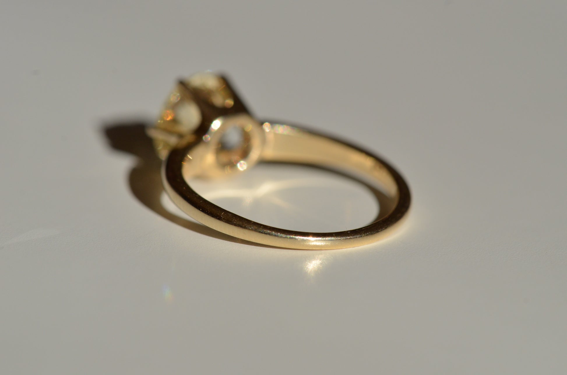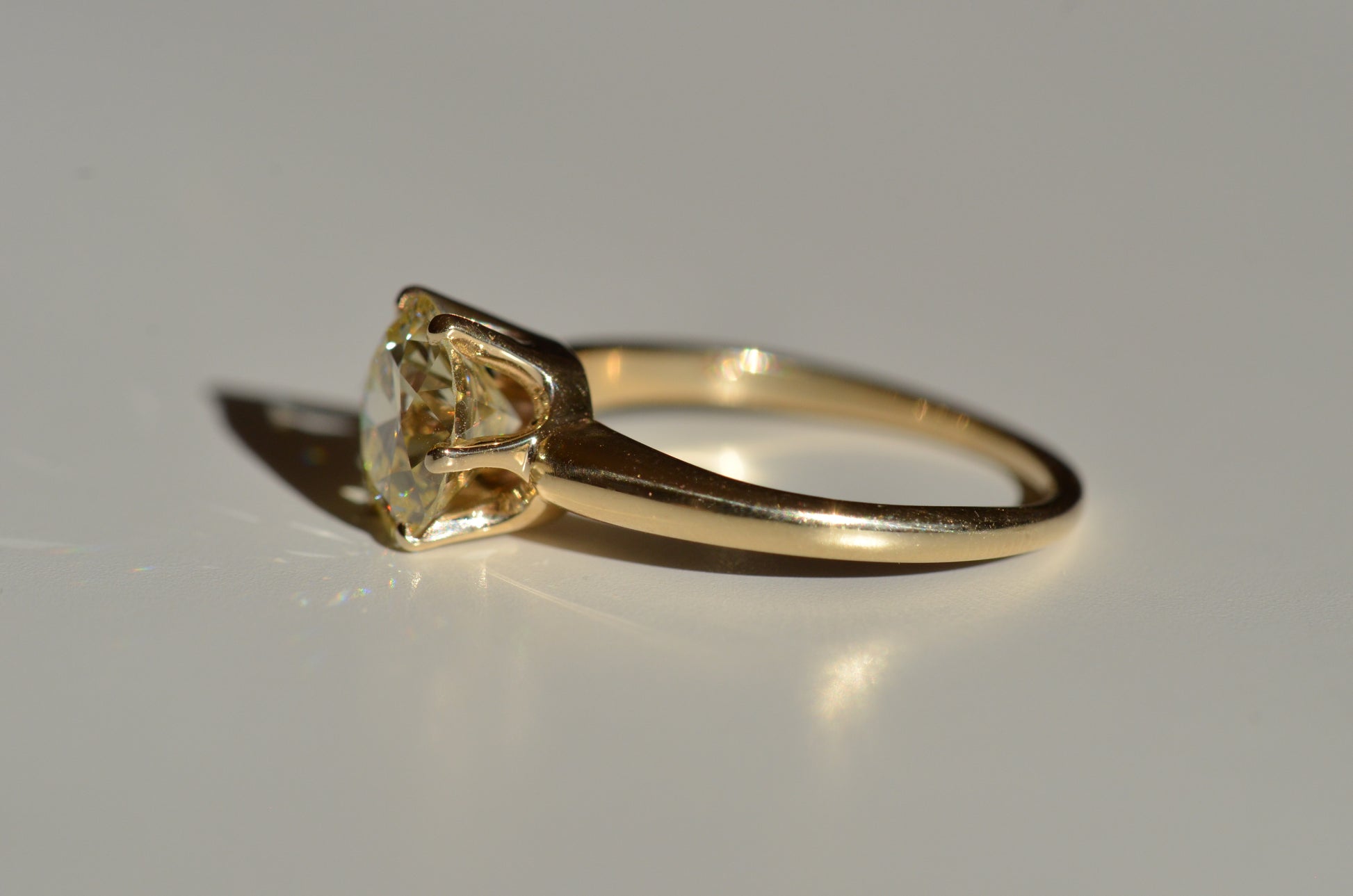 Chic, elegant, and crisply rendered, this stunning early mid-20th century ring captivates with a richly hued diamond in warm yellow gold. So named for its unique place in time and style between the old European and its most popular successor, the modern round brilliant, the transitional cut exhibits high symmetry and sees the chunkier facets and culet of the Euro tightening up toward their modern endpoint. A relic unique to about the 1920s-1940s, the stone exemplifies the ongoing attempts by diamond cutters to improve the visual appearance of stones for modern electric light as well as an increased use of diamond cutting machines starting in the early 20th century. So brief was the evolution of cuts and so varied were the results, the cut never received its own defined categorization from the (at the time newly-formed) GIA; the rare cuts now seem to confuse nearly as much as they enchant. This lovely ring offers - in shape and in history - a little bridge between antique charm and modern precision. The diamond's deep warm shade is most prevalent when viewed from the side; facing up it appears considerably whiter than its grade suggests - be sure to check instagram.com/st.eloi for video of this stunner in motion.