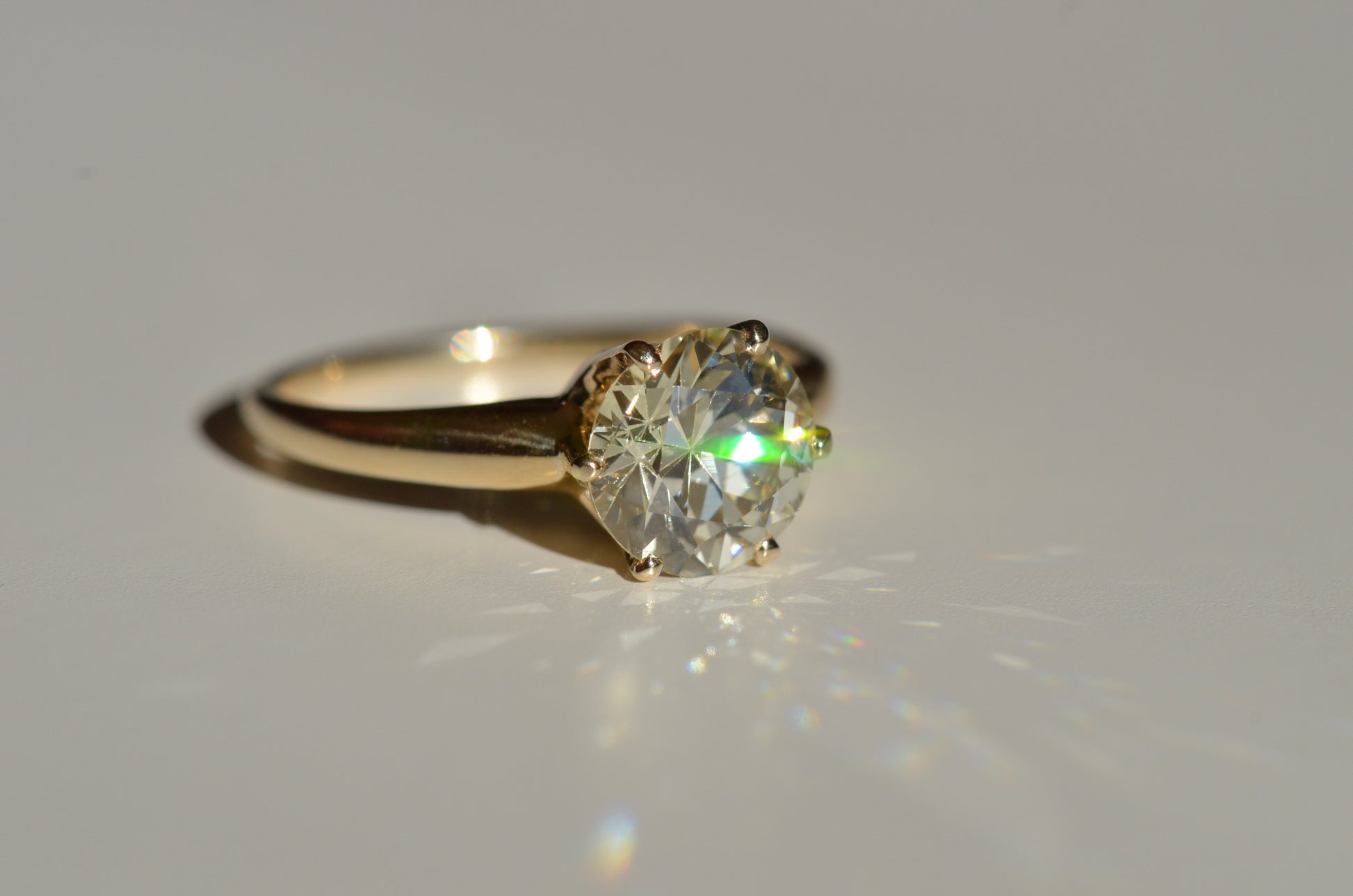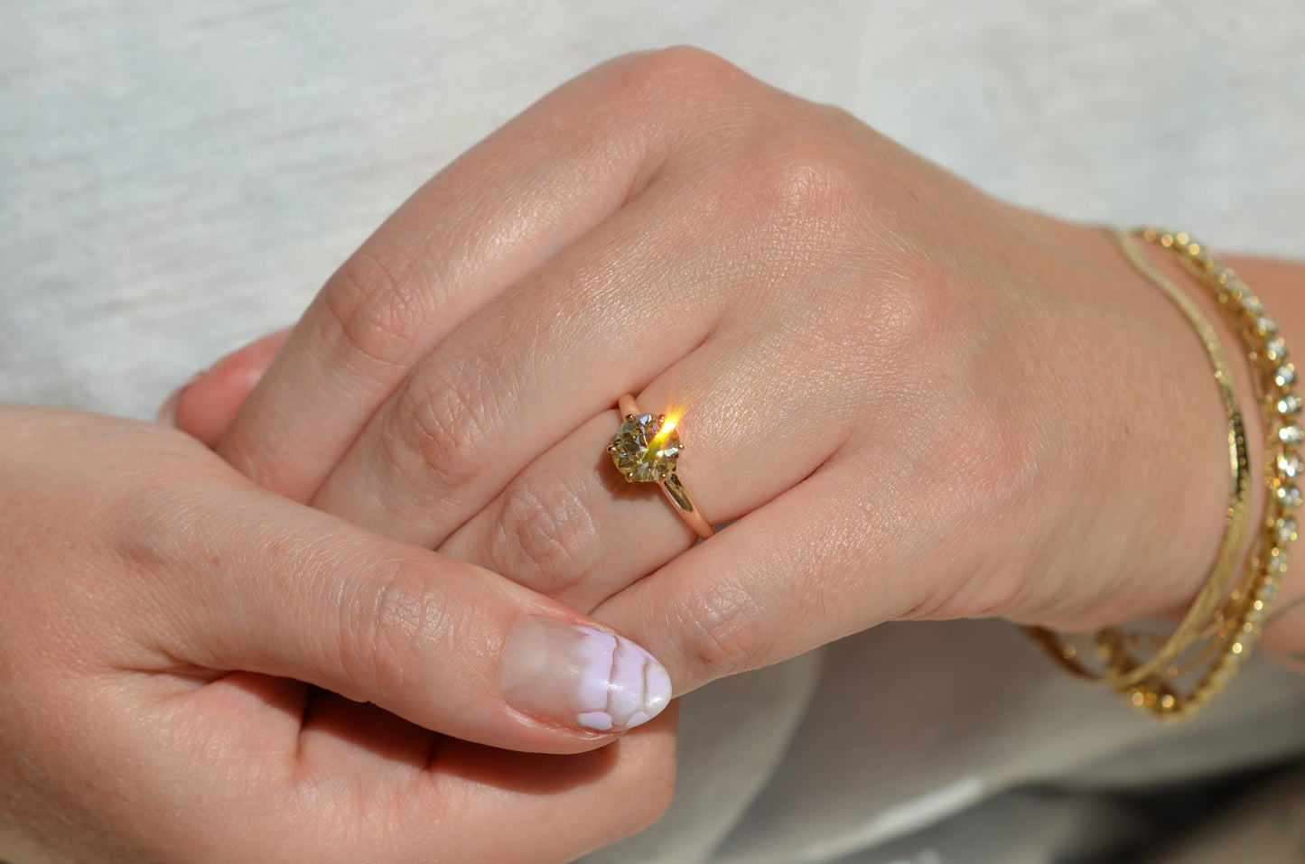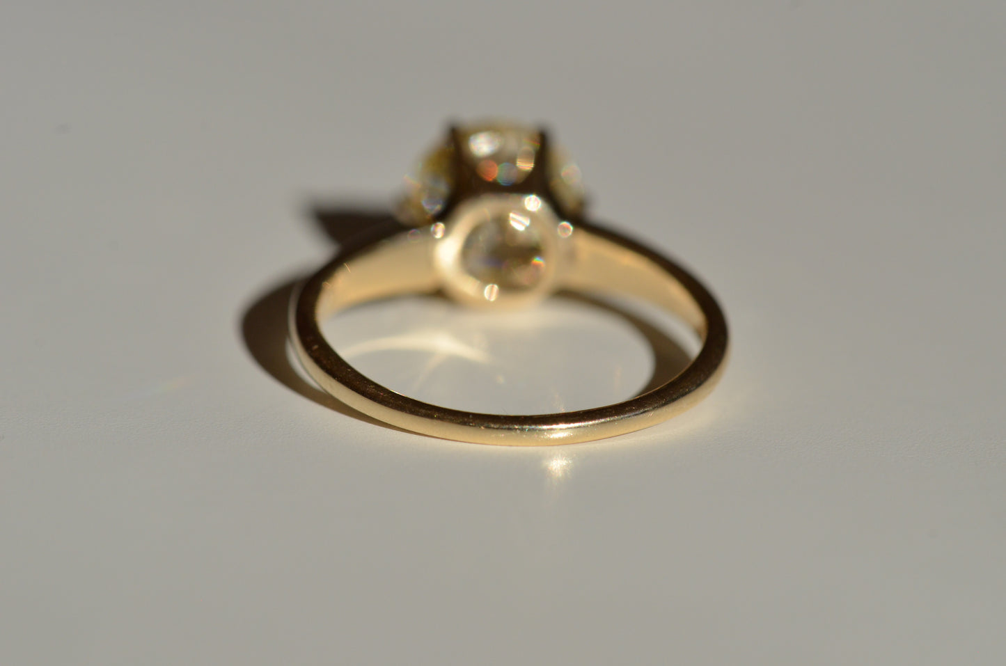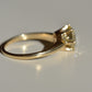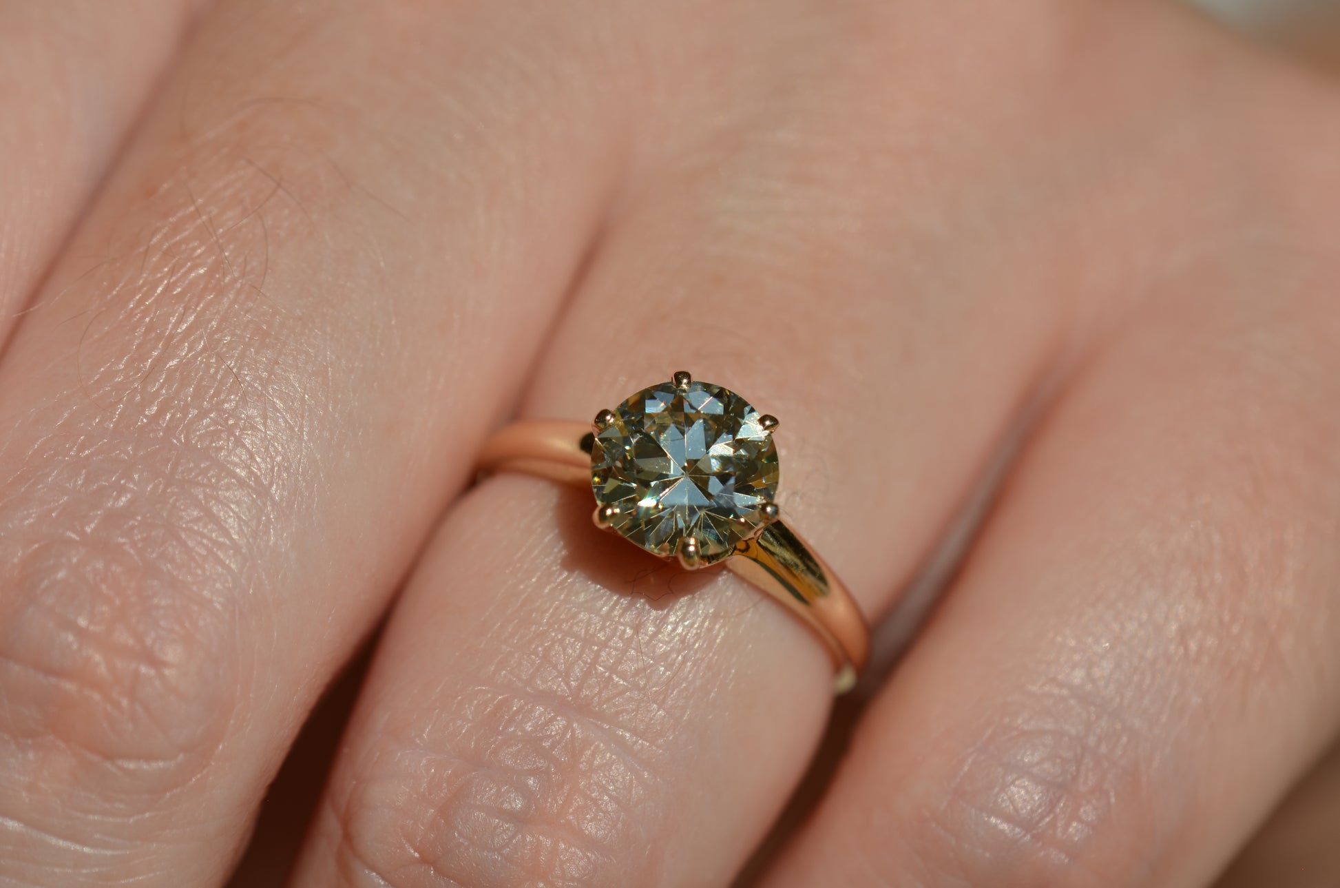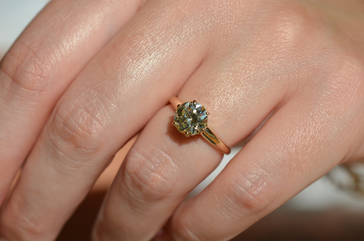 Chic, elegant, and crisply rendered, this stunning early mid-20th century ring captivates with a richly hued diamond in warm yellow gold. So named for its unique place in time and style between the old European and its most popular successor, the modern round brilliant, the transitional cut exhibits high symmetry and sees the chunkier facets and culet of the Euro tightening up toward their modern endpoint. A relic unique to about the 1920s-1940s, the stone exemplifies the ongoing attempts by diamond cutters to improve the visual appearance of stones for modern electric light as well as an increased use of diamond cutting machines starting in the early 20th century. So brief was the evolution of cuts and so varied were the results, the cut never received its own defined categorization from the (at the time newly-formed) GIA; the rare cuts now seem to confuse nearly as much as they enchant. This lovely ring offers - in shape and in history - a little bridge between antique charm and modern precision. The diamond's deep warm shade is most prevalent when viewed from the side; facing up it appears considerably whiter than its grade suggests - be sure to check instagram.com/st.eloi for video of this stunner in motion.