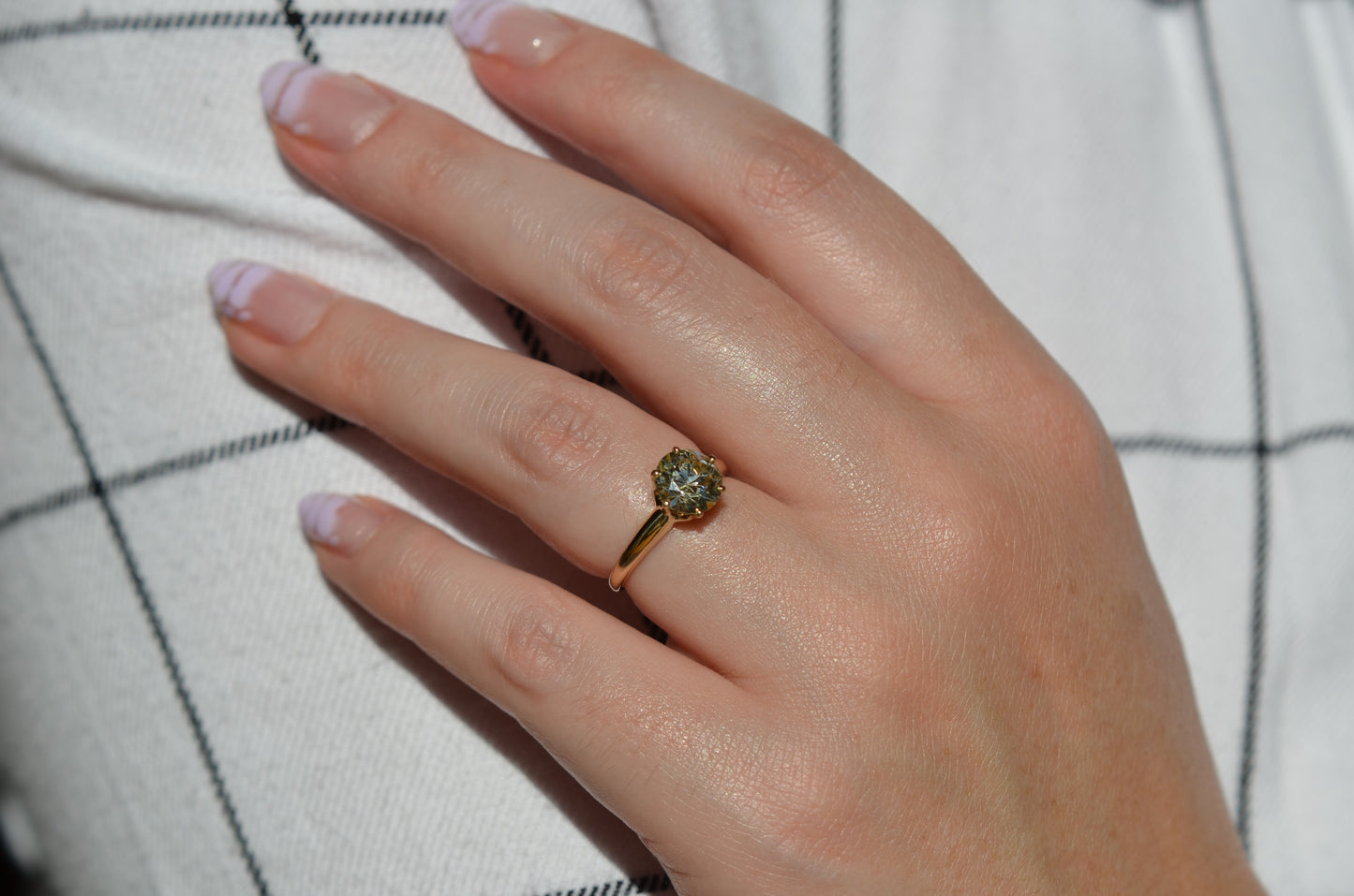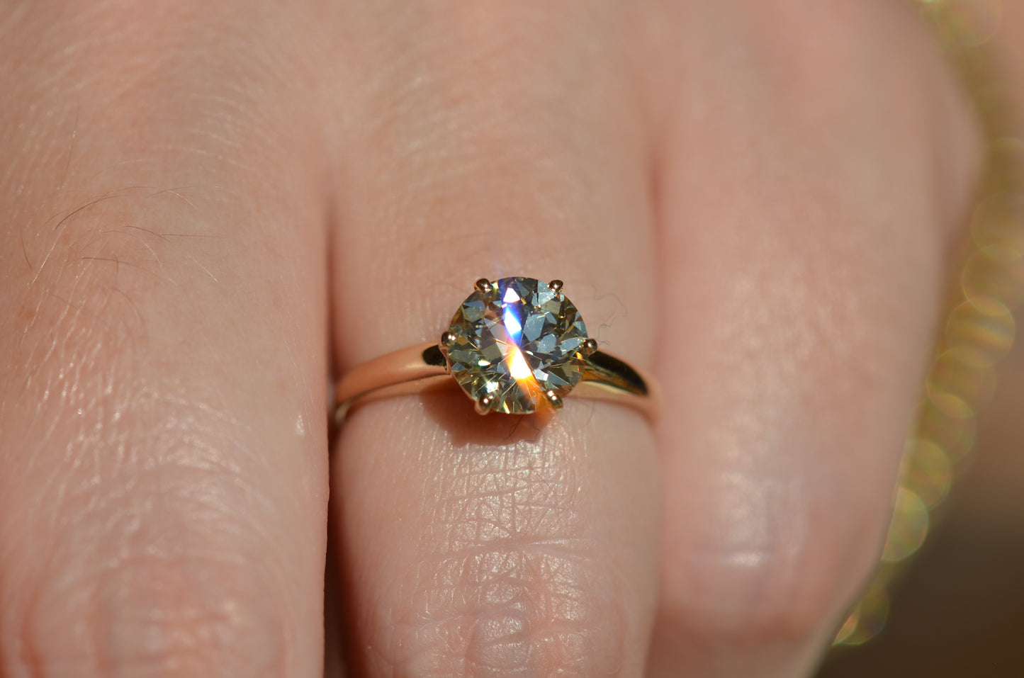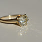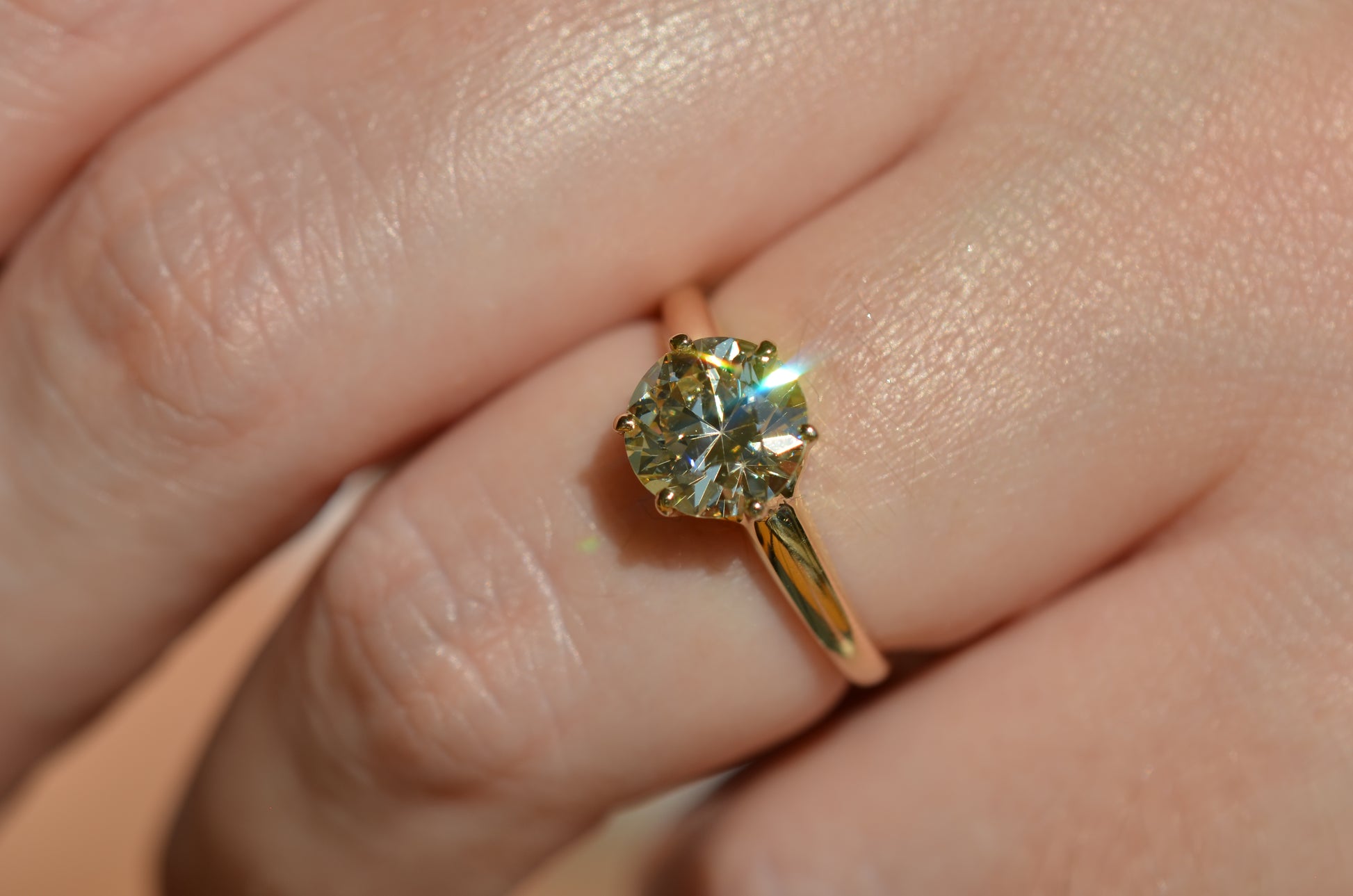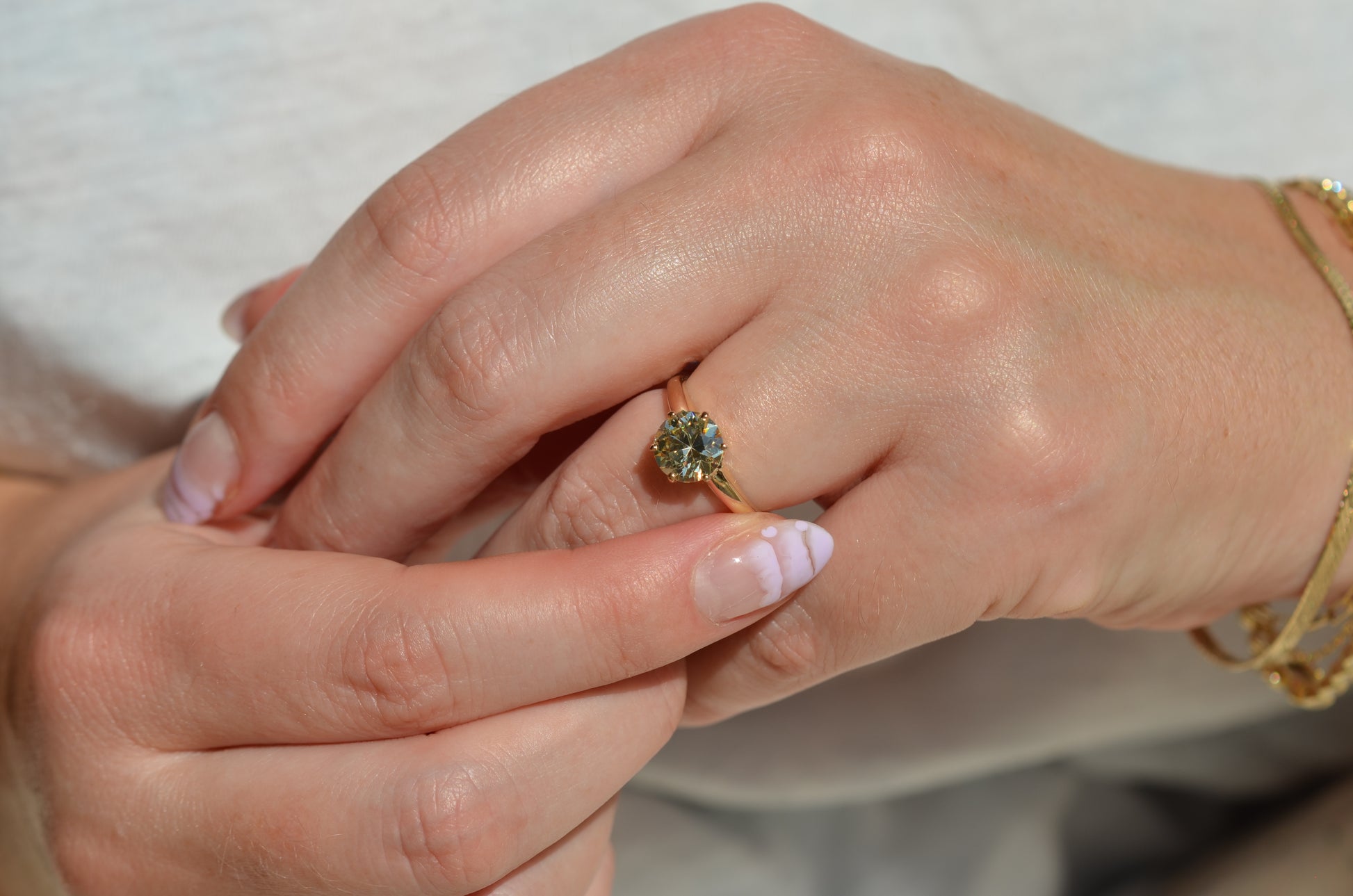 Chic, elegant, and crisply rendered, this stunning early mid-20th century ring captivates with a richly hued diamond in warm yellow gold. So named for its unique place in time and style between the old European and its most popular successor, the modern round brilliant, the transitional cut exhibits high symmetry and sees the chunkier facets and culet of the Euro tightening up toward their modern endpoint. A relic unique to about the 1920s-1940s, the stone exemplifies the ongoing attempts by diamond cutters to improve the visual appearance of stones for modern electric light as well as an increased use of diamond cutting machines starting in the early 20th century. So brief was the evolution of cuts and so varied were the results, the cut never received its own defined categorization from the (at the time newly-formed) GIA; the rare cuts now seem to confuse nearly as much as they enchant. This lovely ring offers - in shape and in history - a little bridge between antique charm and modern precision. The diamond's deep warm shade is most prevalent when viewed from the side; facing up it appears considerably whiter than its grade suggests - be sure to check instagram.com/st.eloi for video of this stunner in motion.