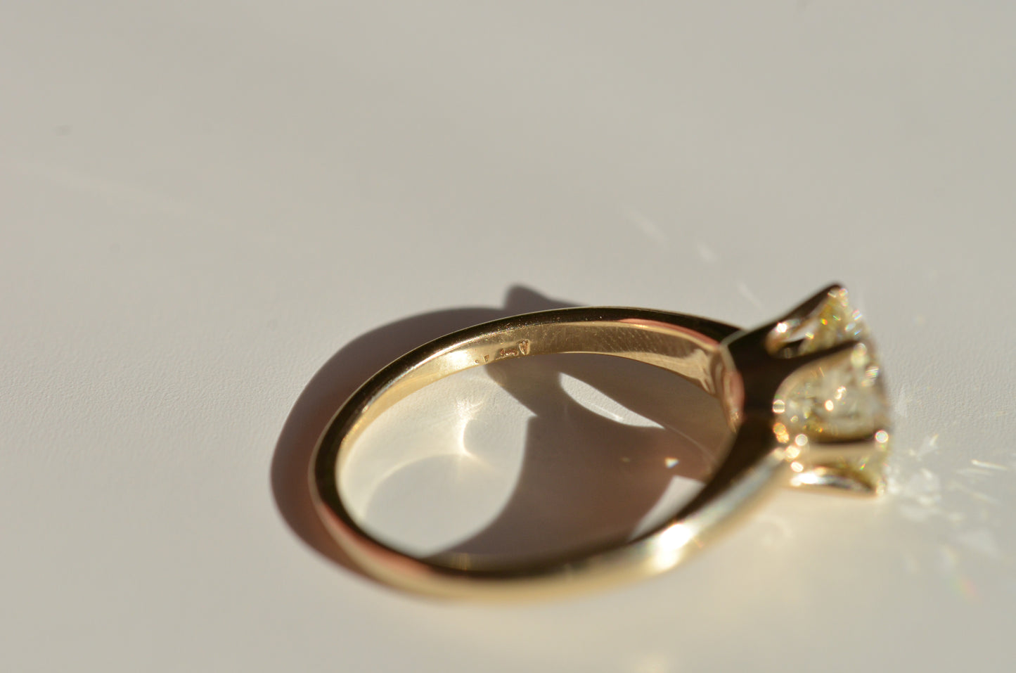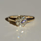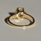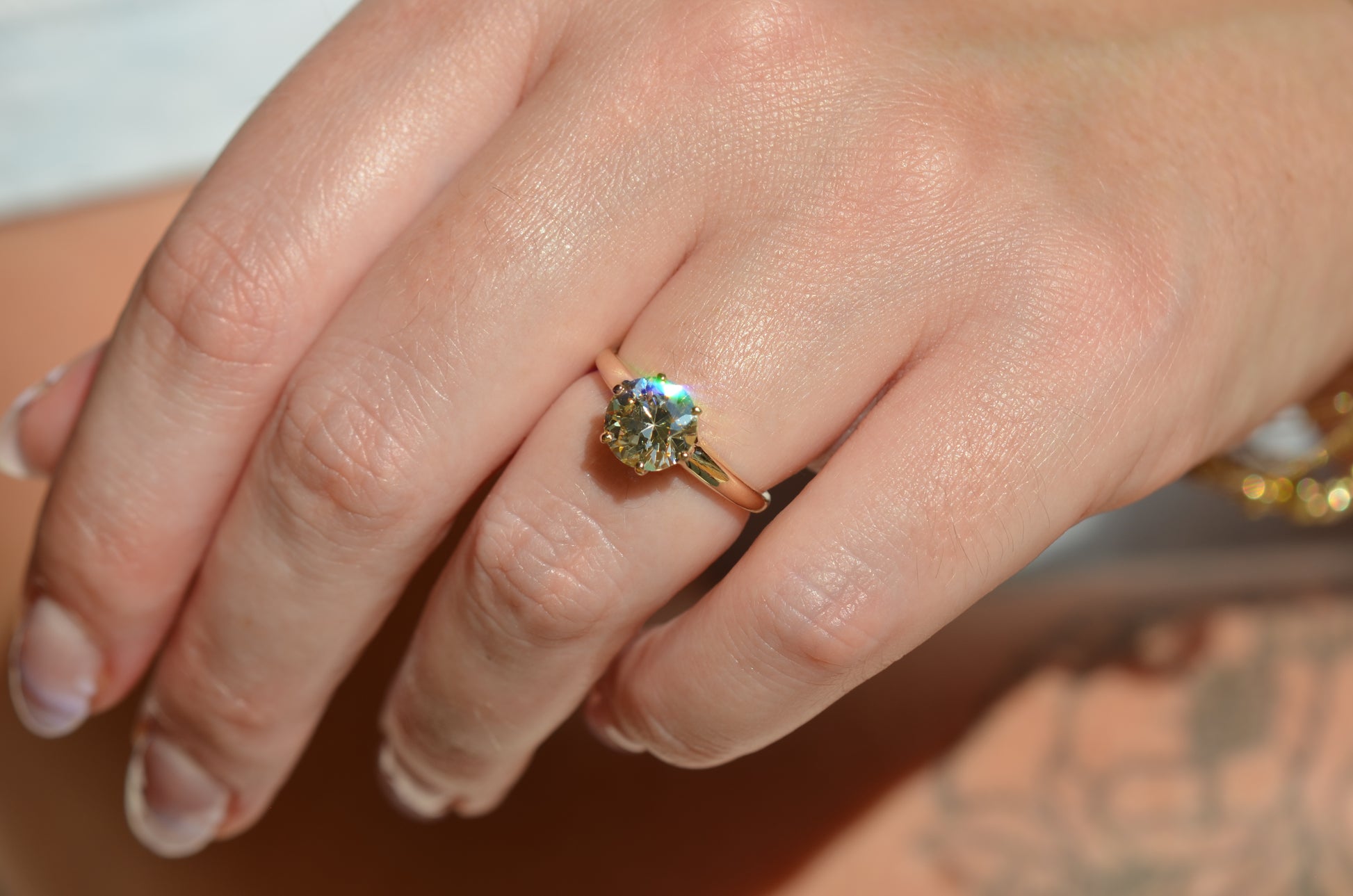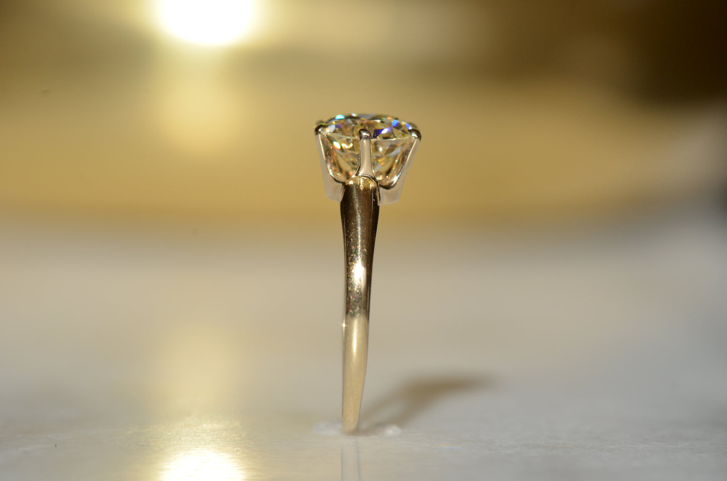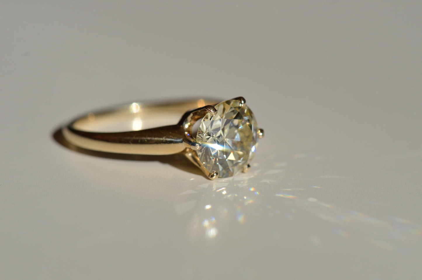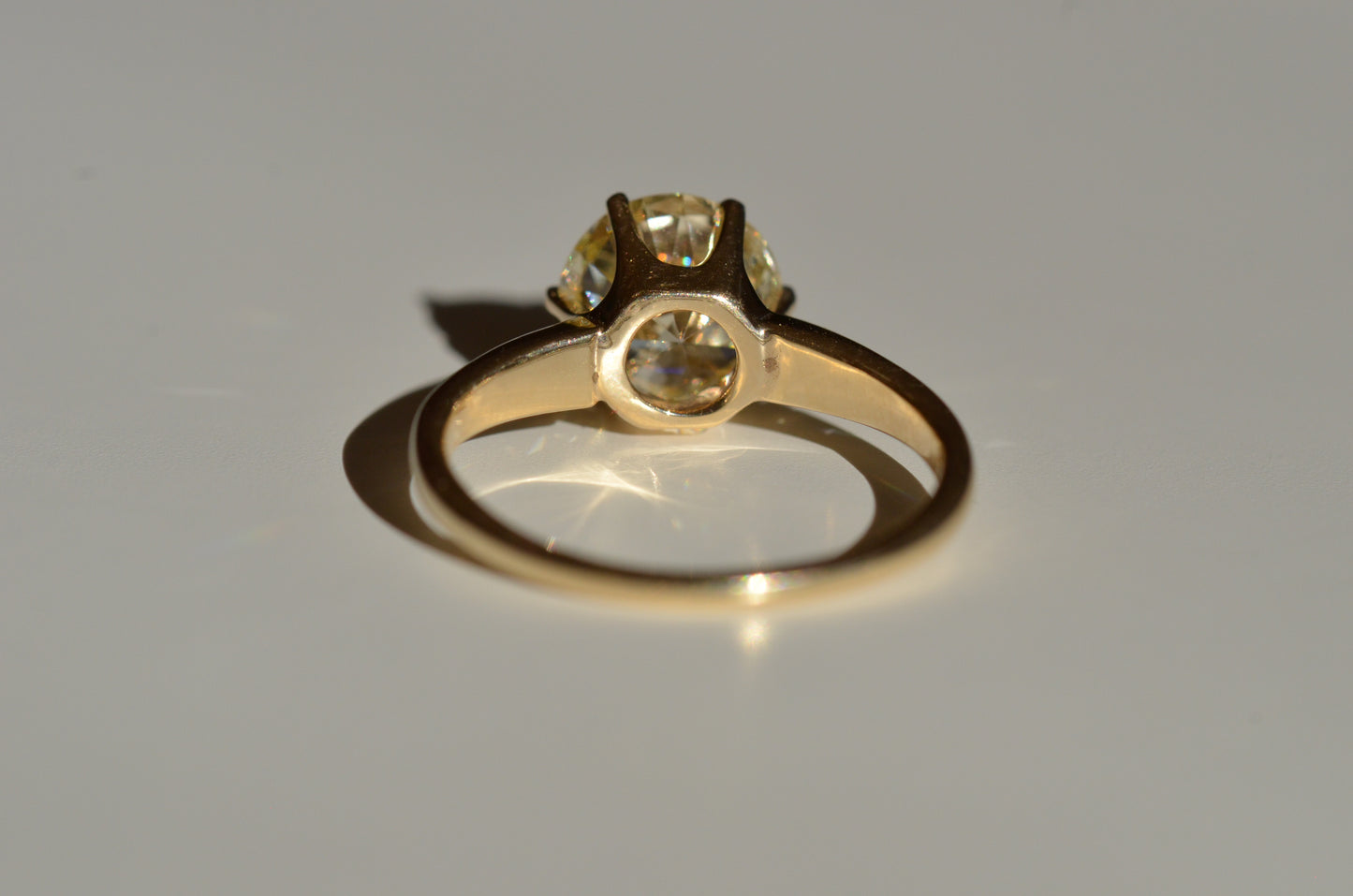 Chic, elegant, and crisply rendered, this stunning early mid-20th century ring captivates with a richly hued diamond in warm yellow gold. So named for its unique place in time and style between the old European and its most popular successor, the modern round brilliant, the transitional cut exhibits high symmetry and sees the chunkier facets and culet of the Euro tightening up toward their modern endpoint. A relic unique to about the 1920s-1940s, the stone exemplifies the ongoing attempts by diamond cutters to improve the visual appearance of stones for modern electric light as well as an increased use of diamond cutting machines starting in the early 20th century. So brief was the evolution of cuts and so varied were the results, the cut never received its own defined categorization from the (at the time newly-formed) GIA; the rare cuts now seem to confuse nearly as much as they enchant. This lovely ring offers - in shape and in history - a little bridge between antique charm and modern precision. The diamond's deep warm shade is most prevalent when viewed from the side; facing up it appears considerably whiter than its grade suggests - be sure to check instagram.com/st.eloi for video of this stunner in motion.