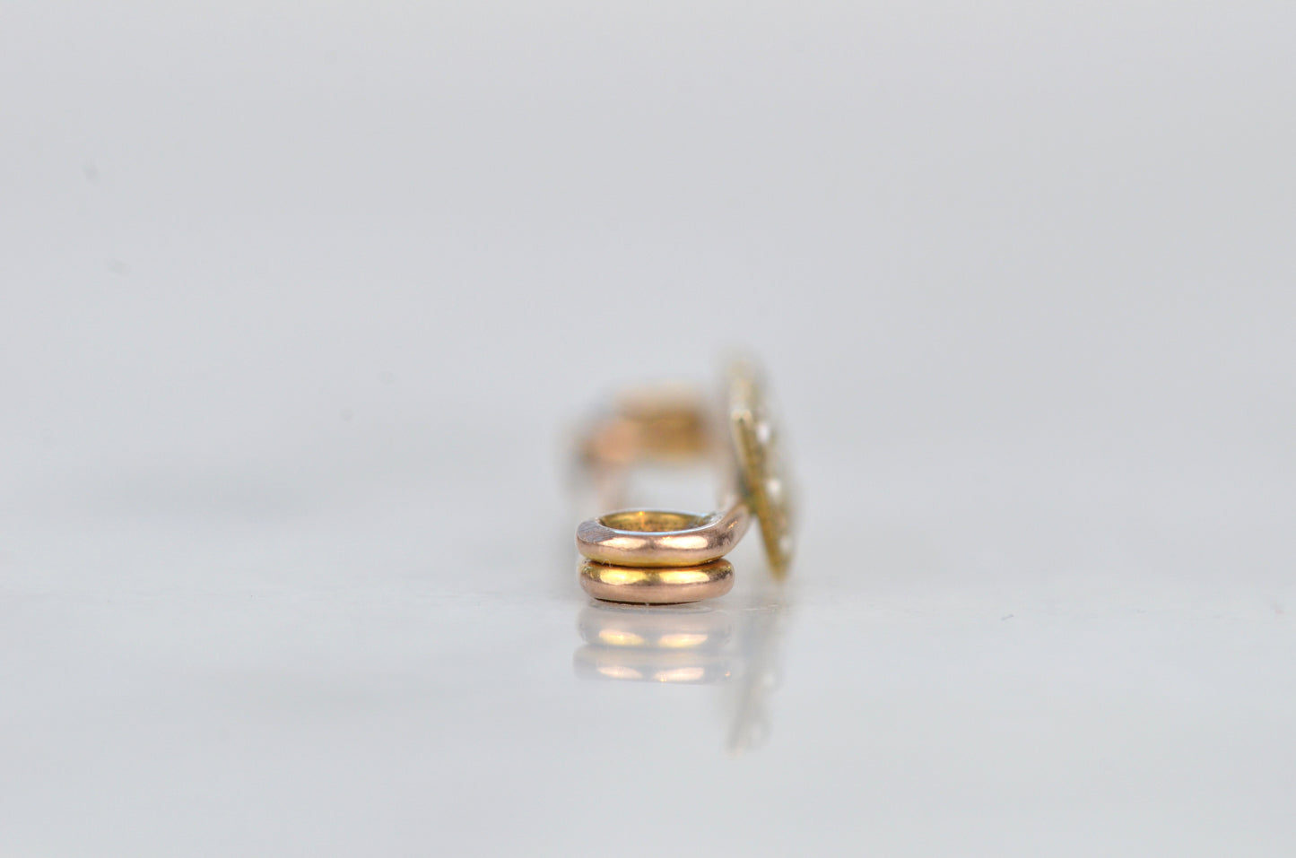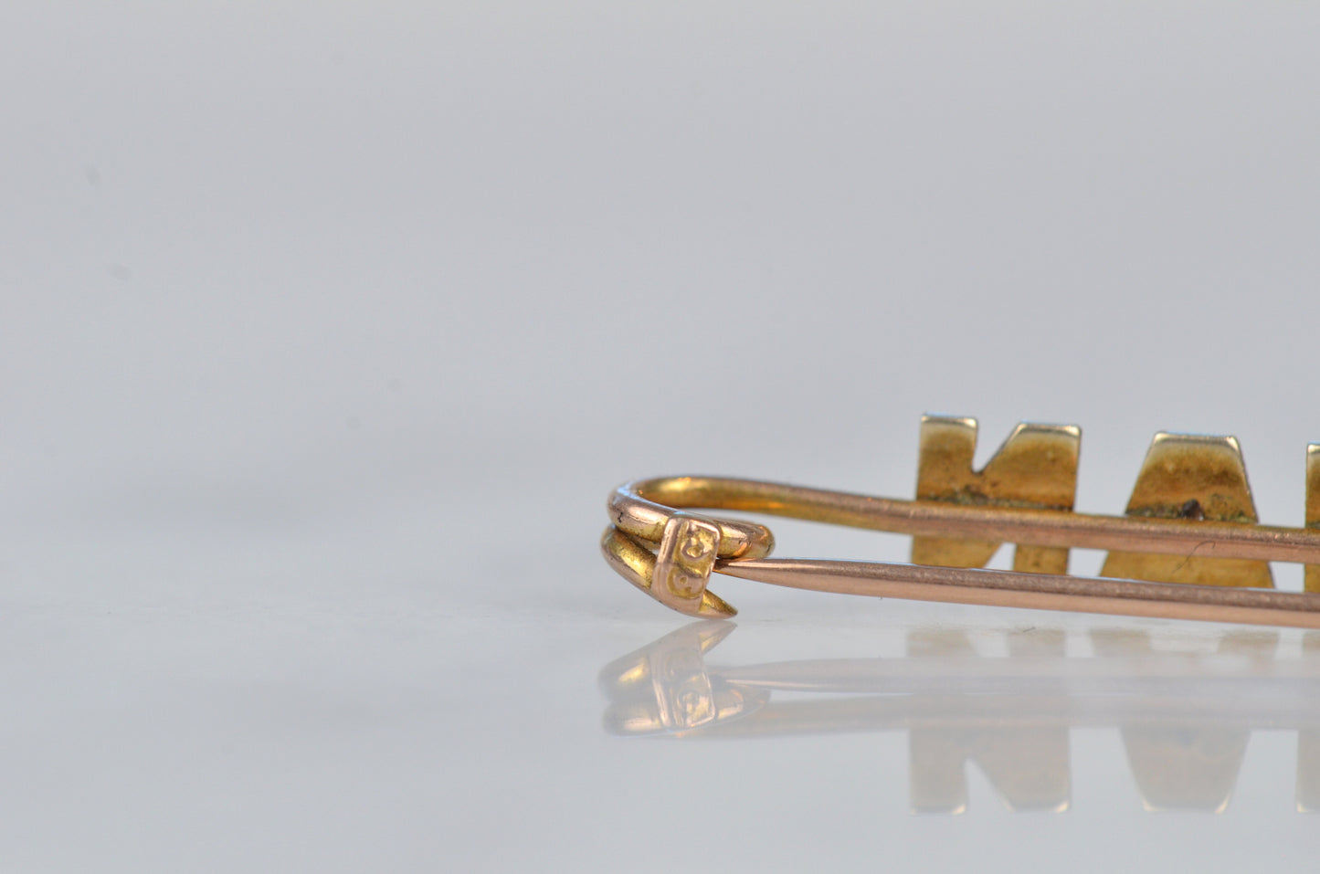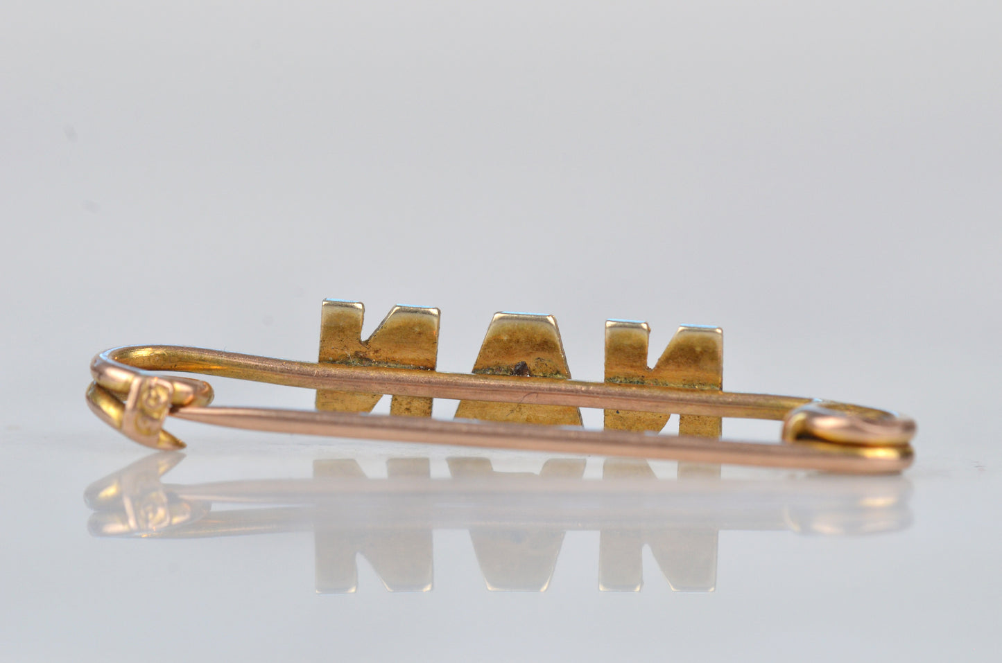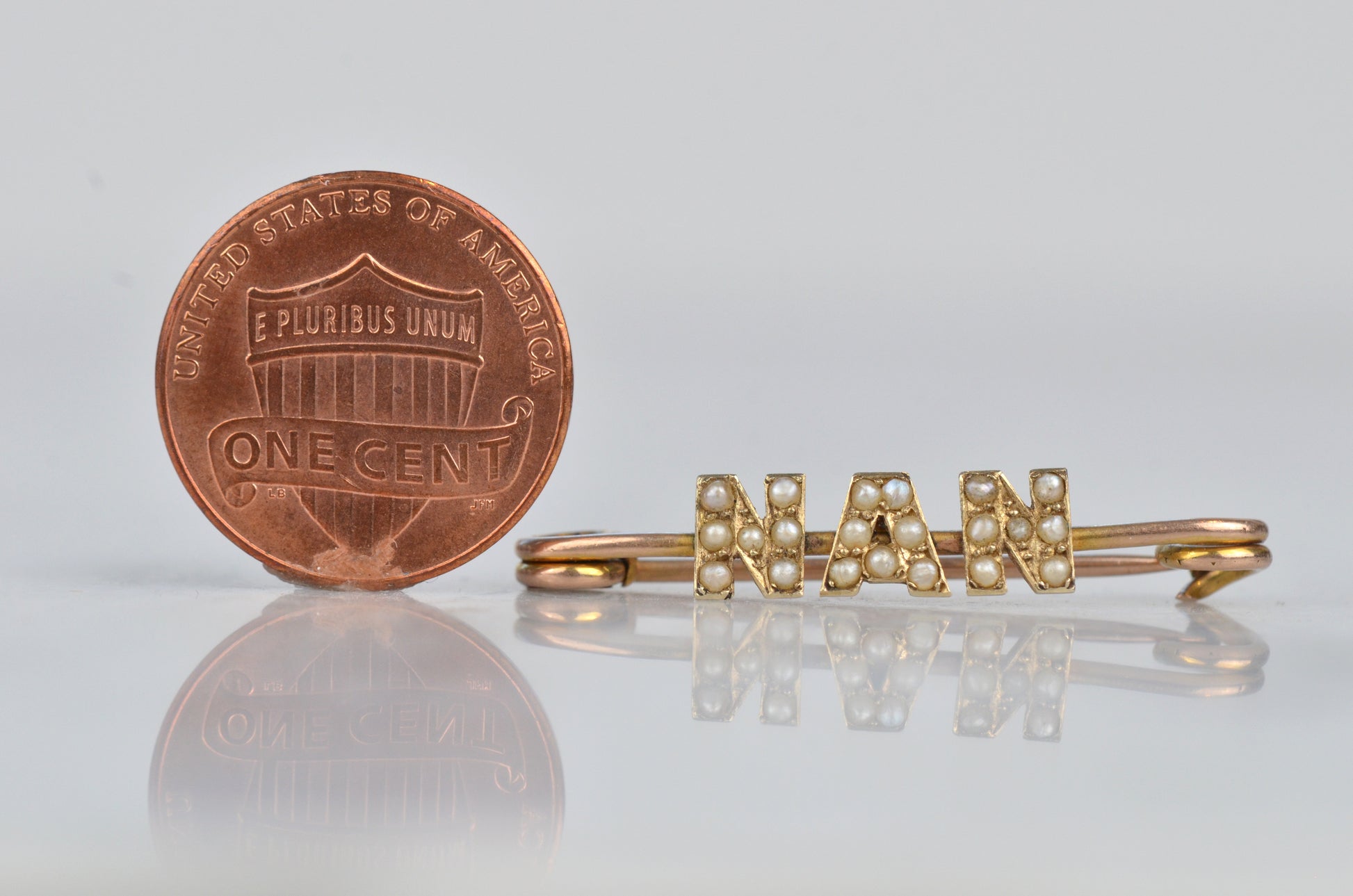 A small, perfect brooch that is utterly tender, with twenty-one seed pearls set in the gold letters NAN. We think this could be a perfect gift - for your favourite Nancy, someone with the initials N.A.N. or - fingers crossed someone thinks this is as cute as we do - a present to let your mum (or mum-in-law) know she's about to be a nan herself. The pin stem has good tension and rests securely braced against the gold tag, holding well and in ready-to-wear condition.