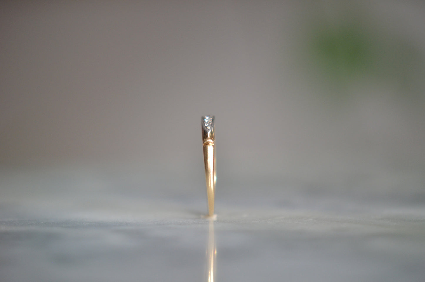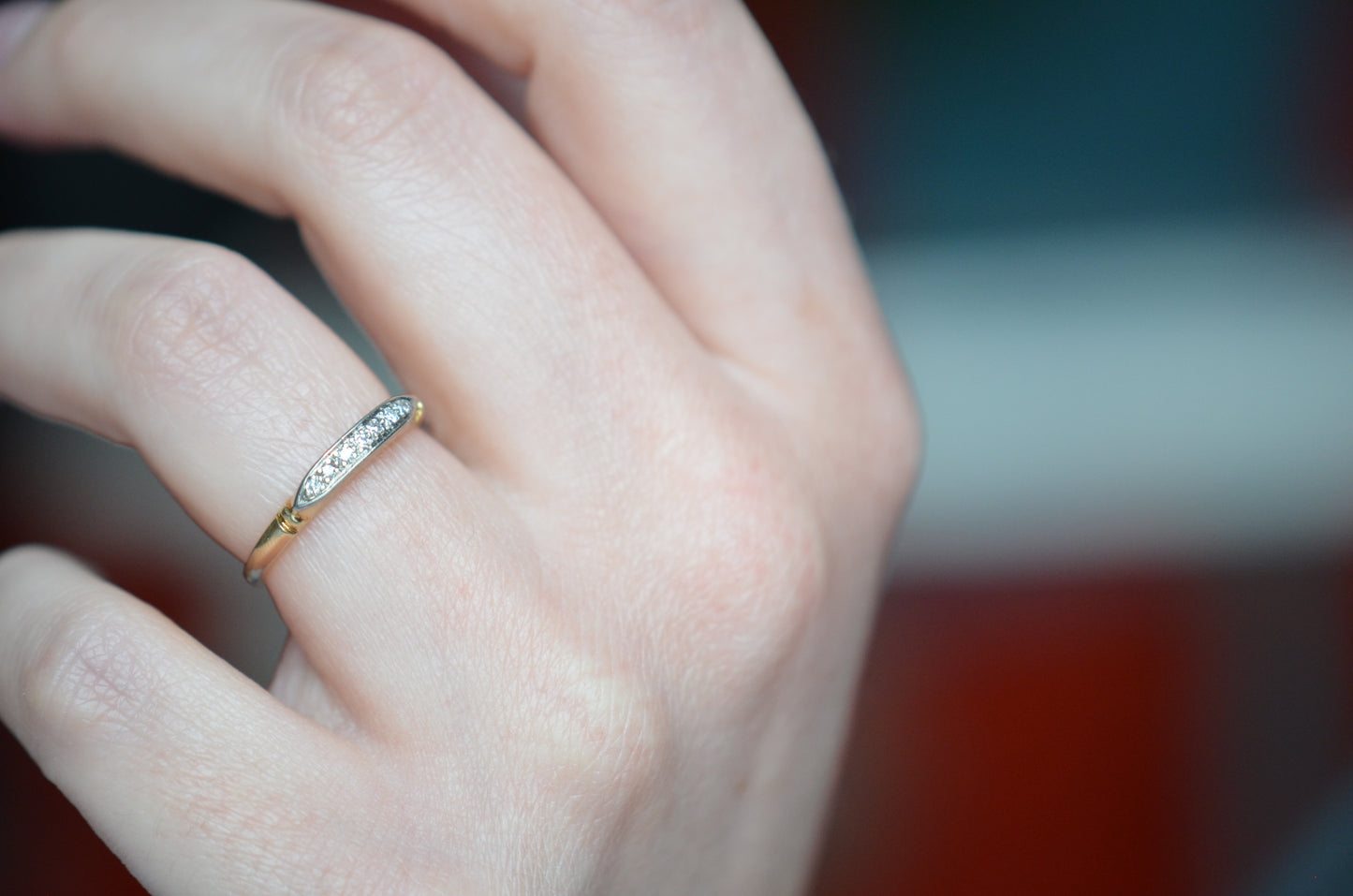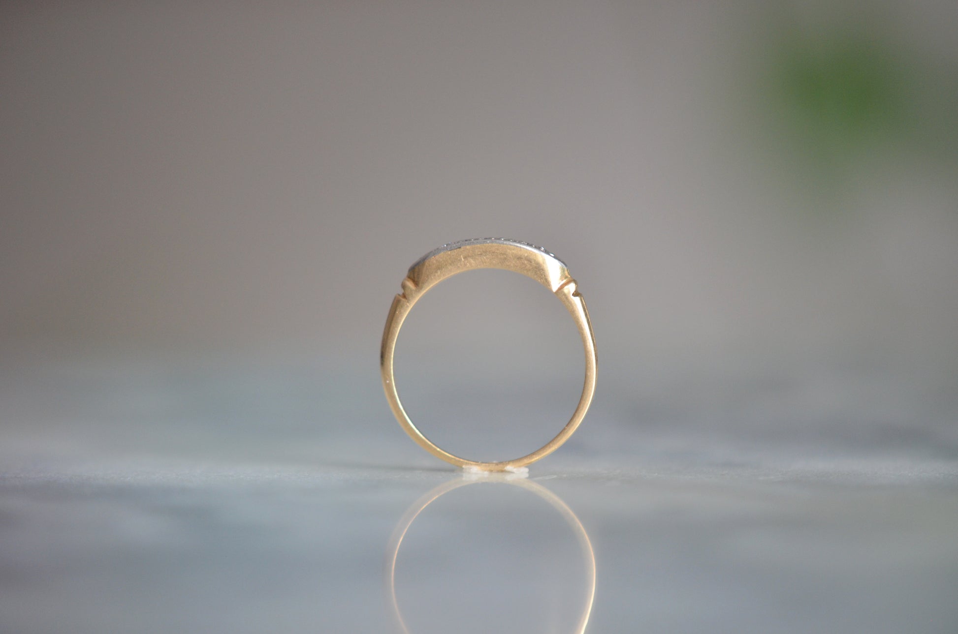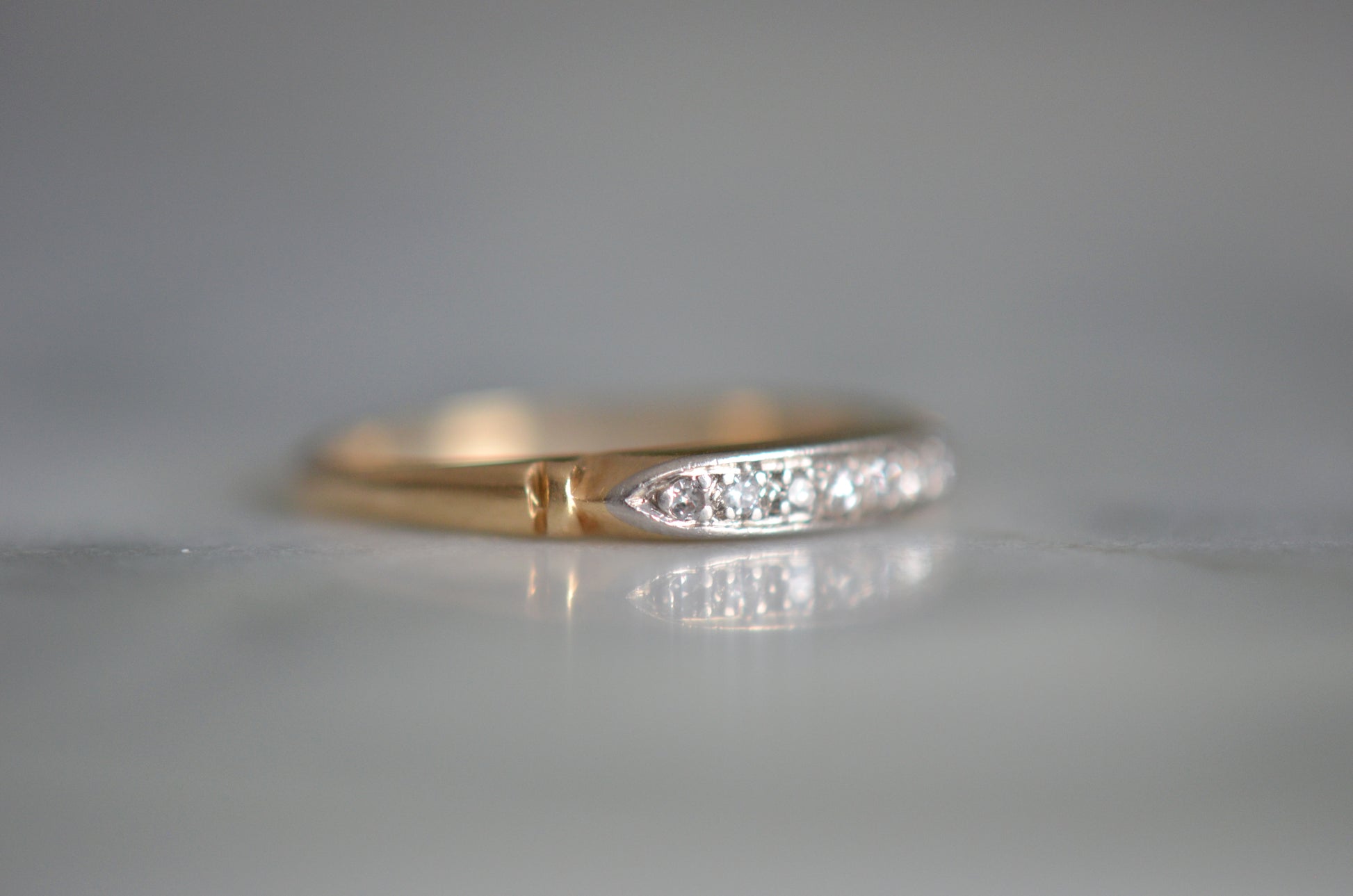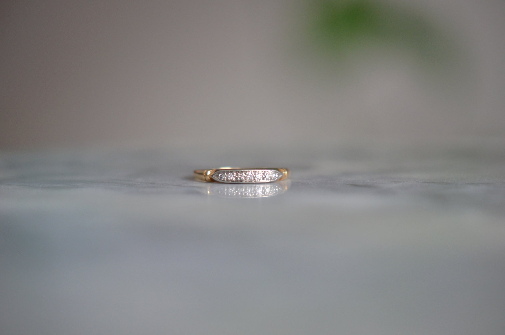 While we're admittedly suckers for yellow gold, there's nothing quite like a white metal to make diamonds shine. This mid-century ring brings the best of both worlds, with a warm yellow band topped with white gold framing seven bead-set, sparkling single cut diamonds.