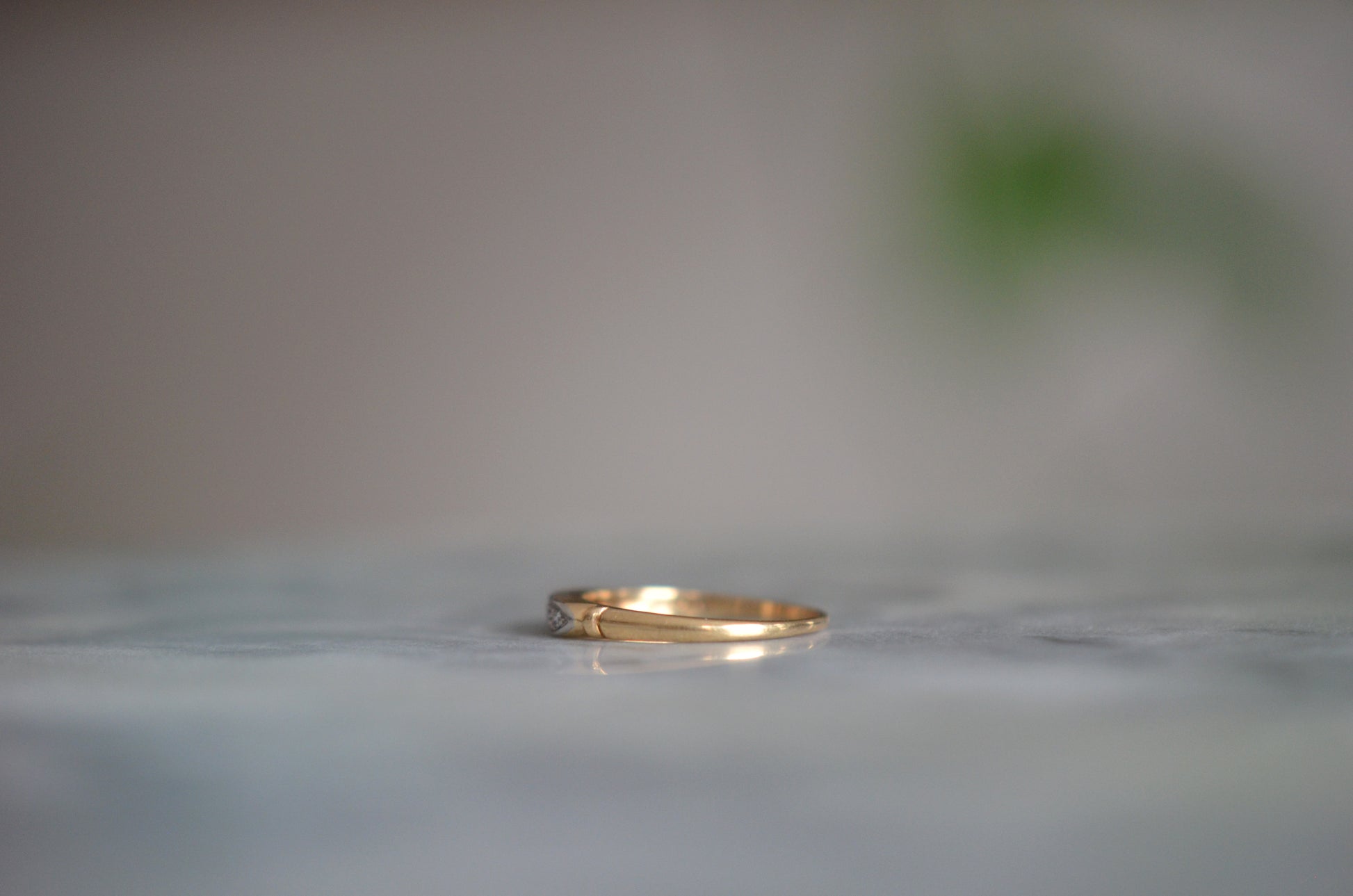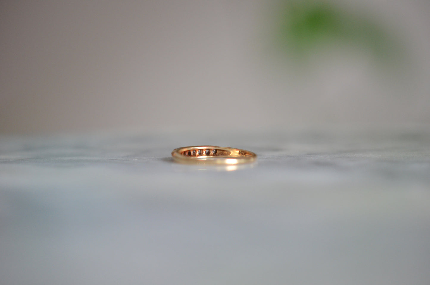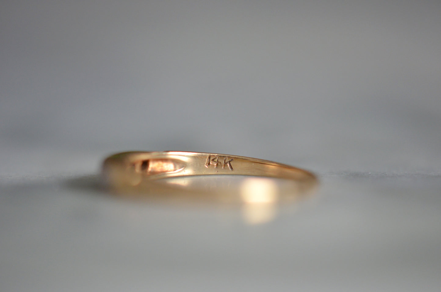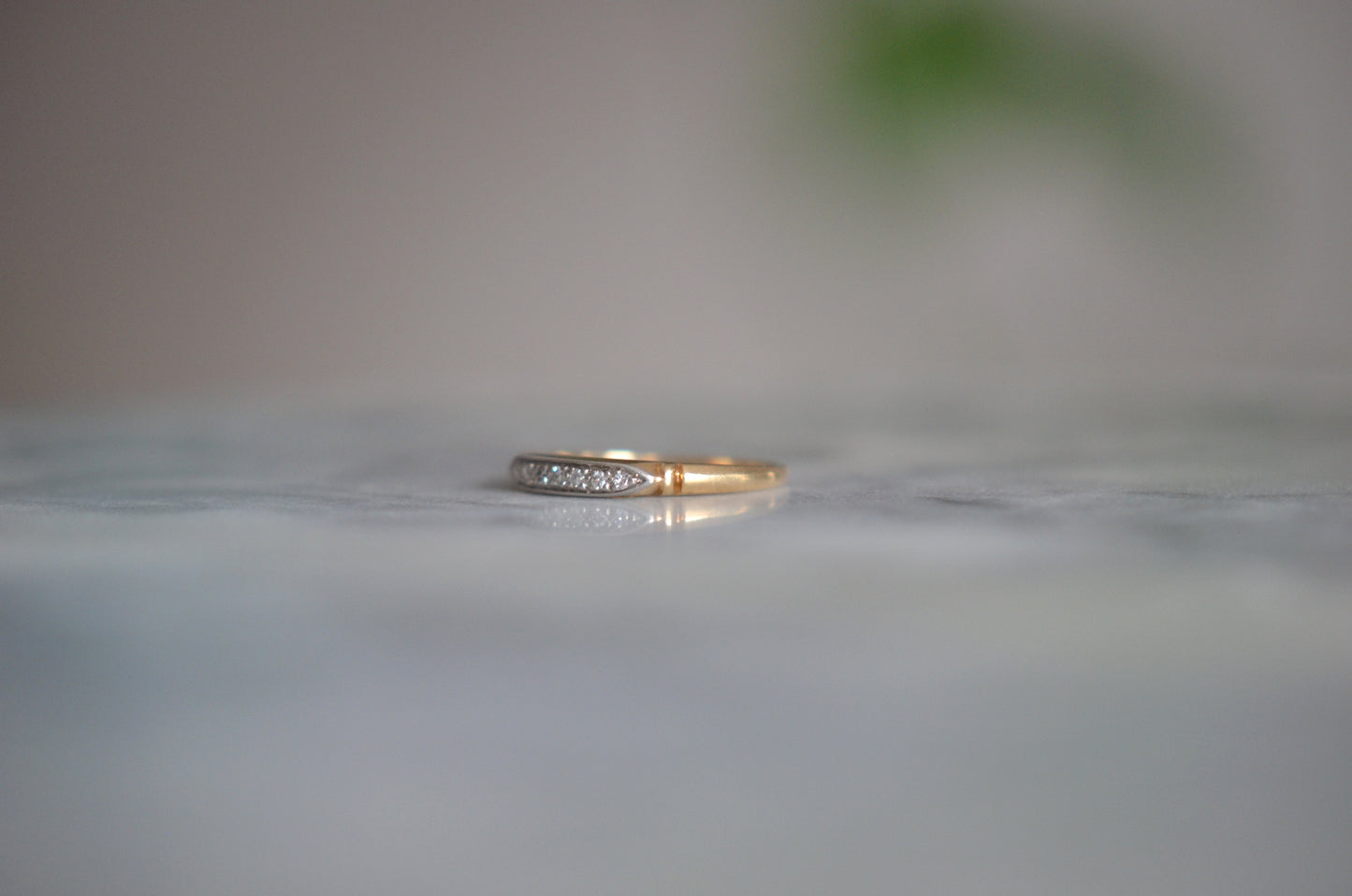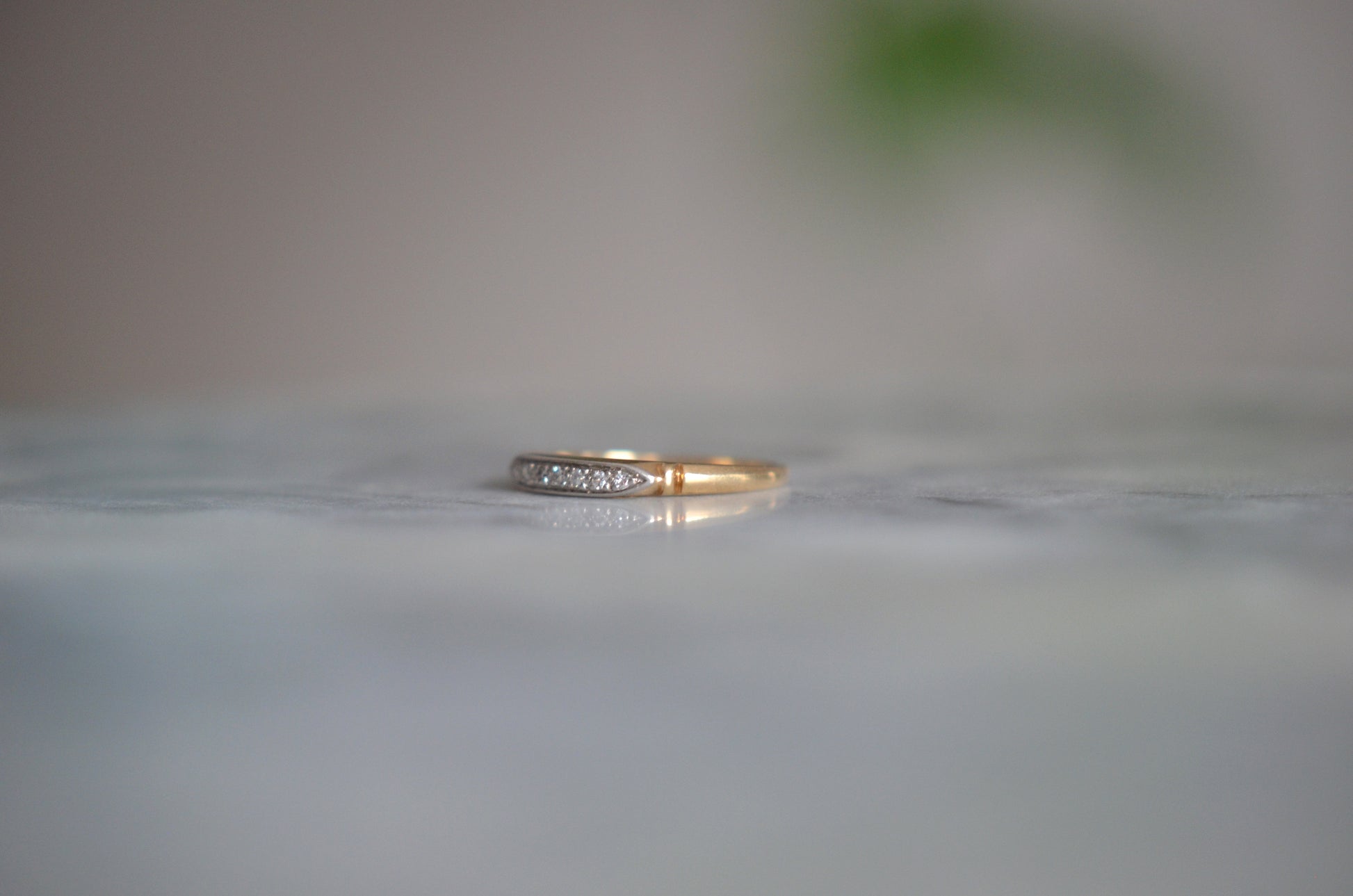 While we're admittedly suckers for yellow gold, there's nothing quite like a white metal to make diamonds shine. This mid-century ring brings the best of both worlds, with a warm yellow band topped with white gold framing seven bead-set, sparkling single cut diamonds.