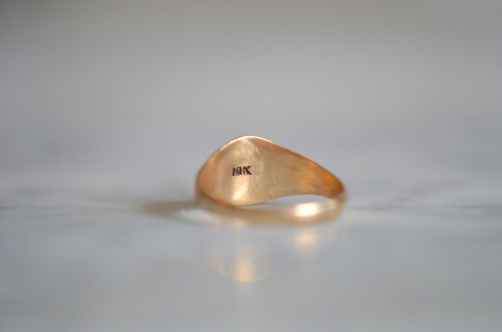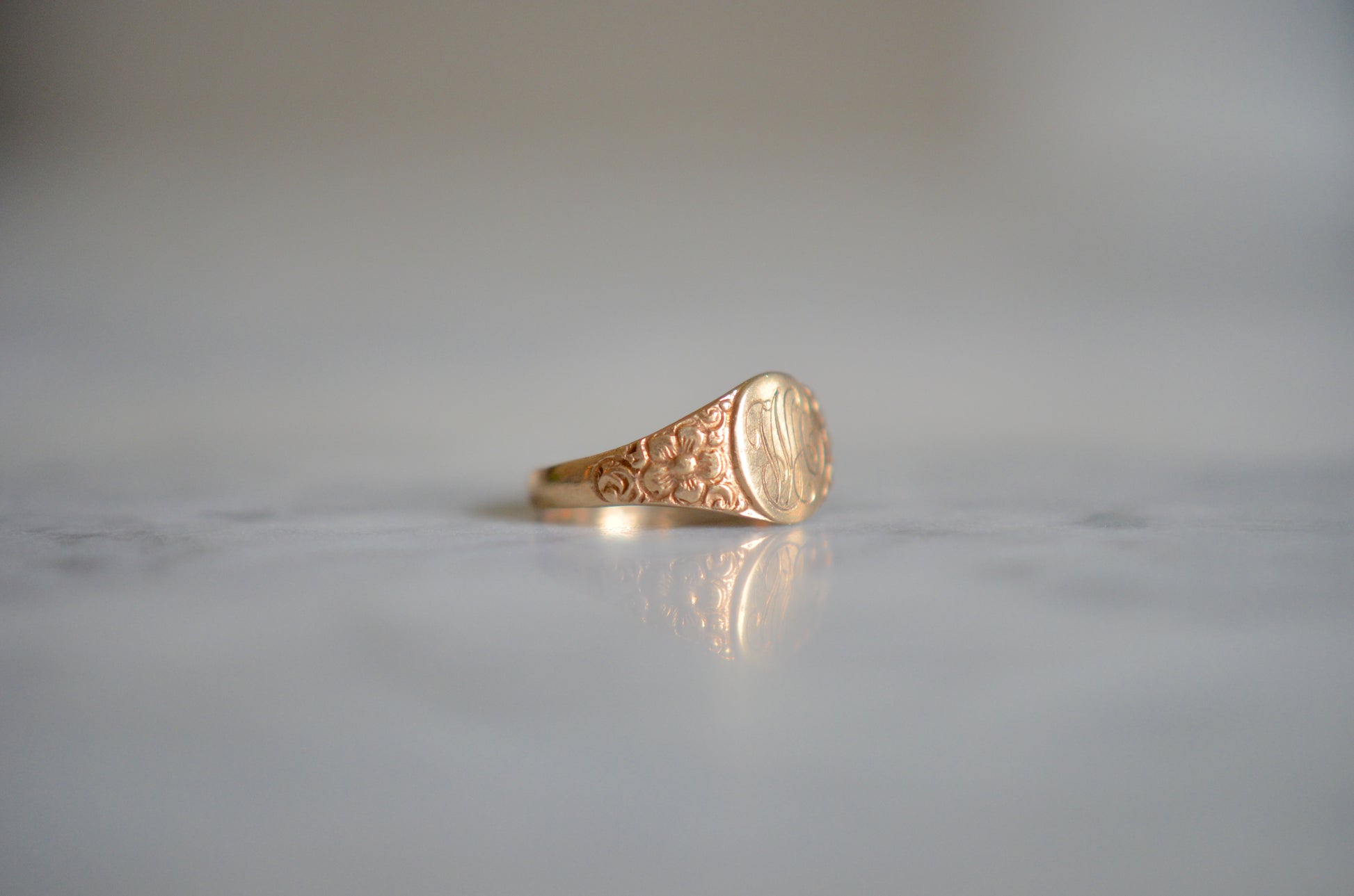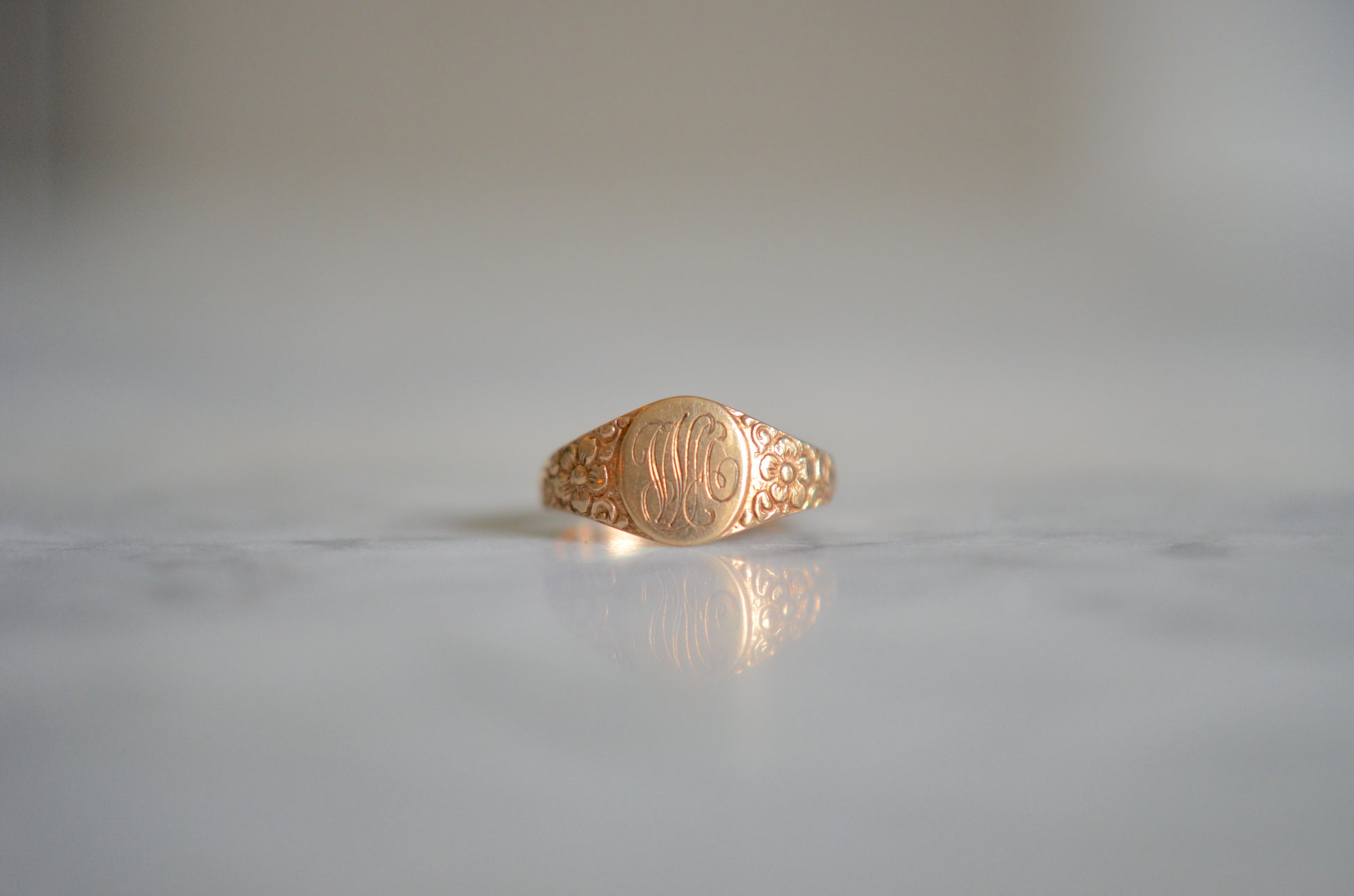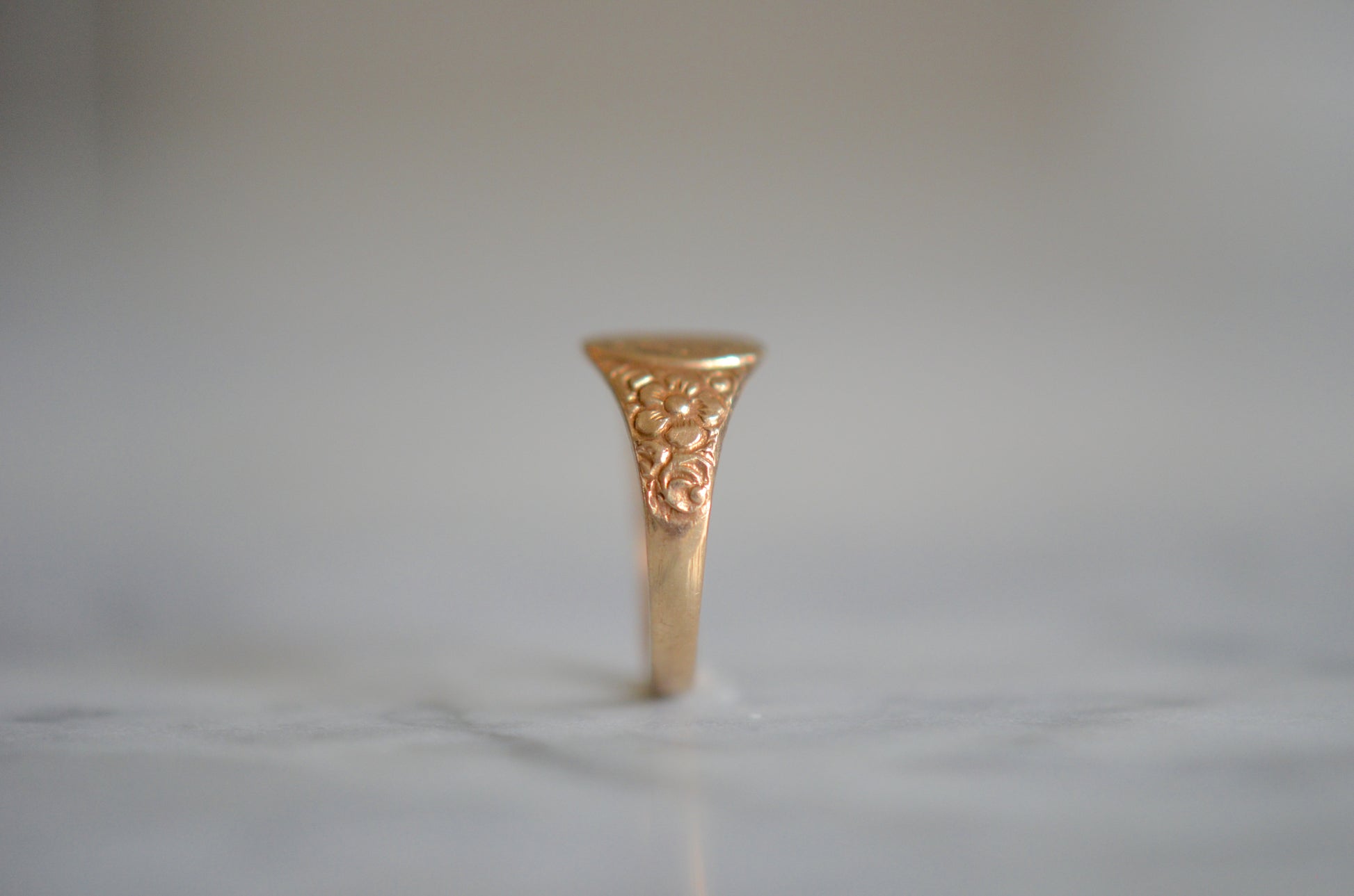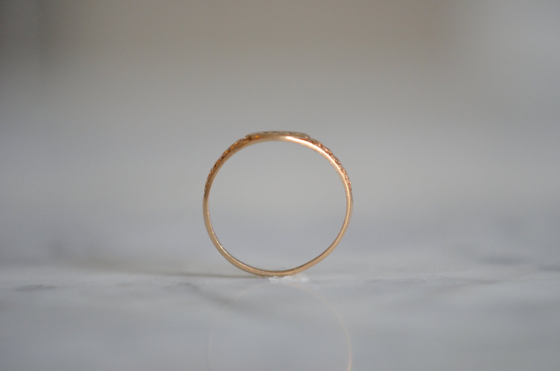 With a name that already tells us more (and more bluntly!) than so many other species and varietals, the forget me not was used to represent a true an undying love, fidelity, friendship, and loyalty, particularly when faced with challenges such as distance, separation, or death. The small size of the ring and the engraved initials indicate that it could possible be a piece commemorating a loss, but its styling is just as likely to have been a token of friendship or love. The chased flowers on the shoulders gently taper into a smooth band, and the face is engraved with initials in script, they appear to be WA but could be open in interpretation.