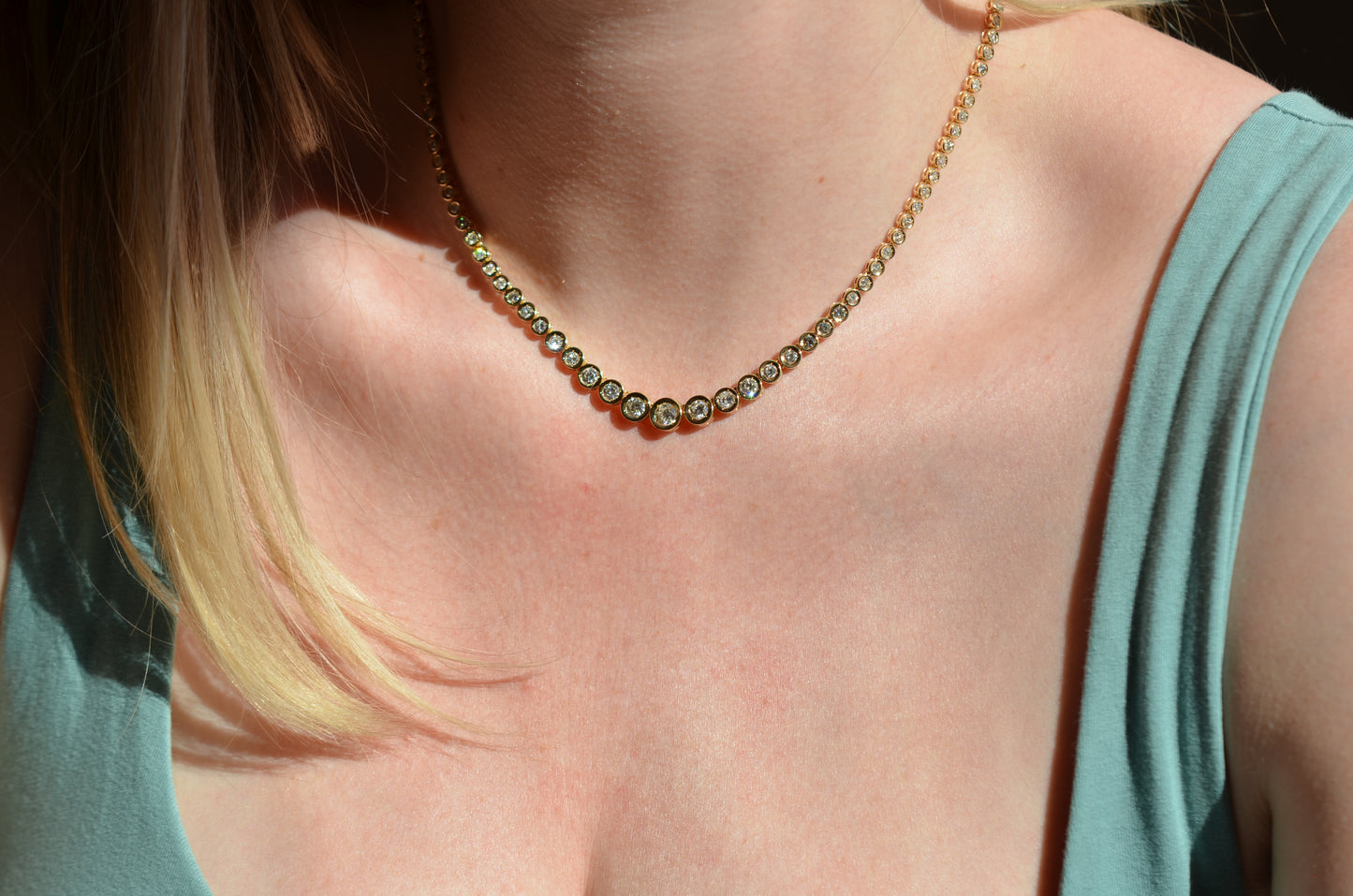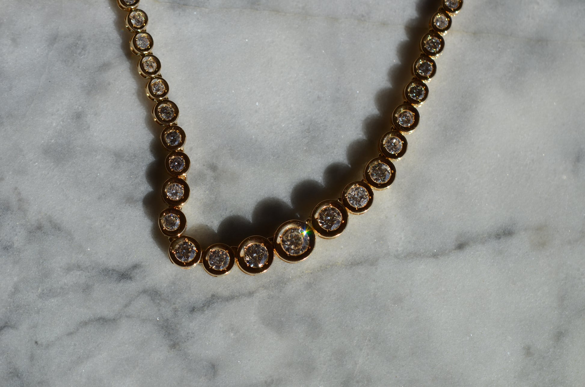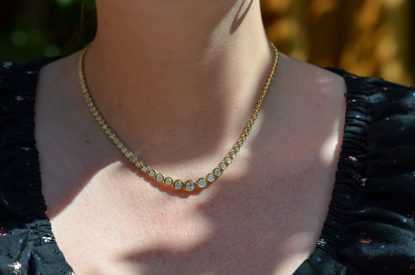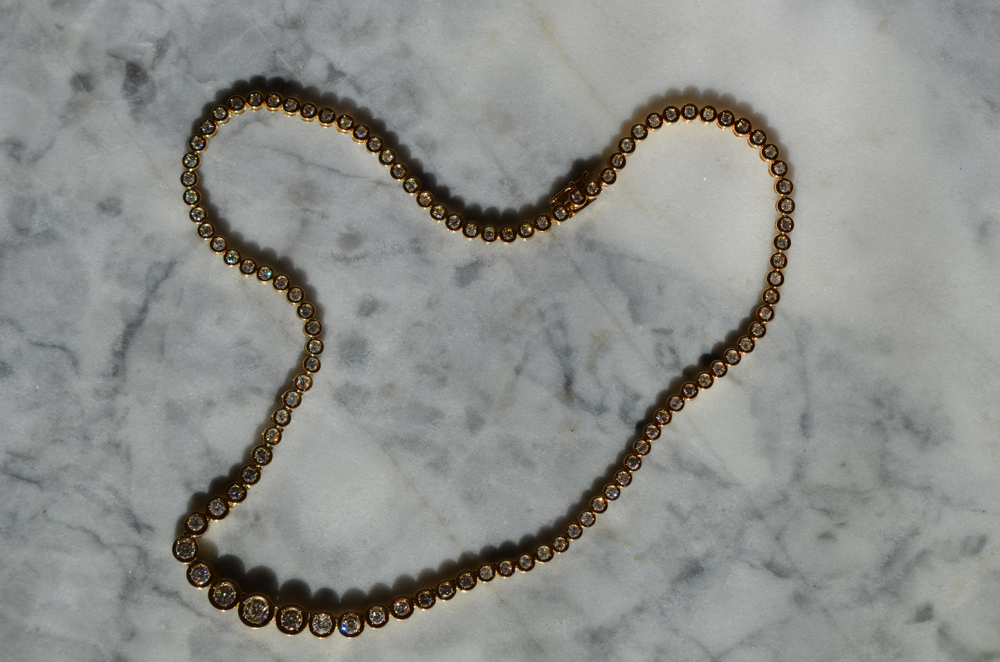 This diamond necklace is an absolutely breathtaking piece that you will always treasure. Stone-set necklaces featuring graduated gemstones - often called rivière or riviera necklaces - have been popular since at least the mid-1800s, and flatter a variety of necklines. This estate piece has been constructed with illusion settings: each diamond sits in its own concave cup-like setting, with tiny gold beads raised up to hold the stones secure. Called illusion settings for their ability to make the diamond appear larger, they give the impression of a bigger stone by mimicking, from a distance, bezel settings but with a larger diameter and covering less of the diamonds' visible surface area. The front portion of the necklace has each link attached on an angle to create a fixed curve in the front that prevents the necklace from flipping over while worn.