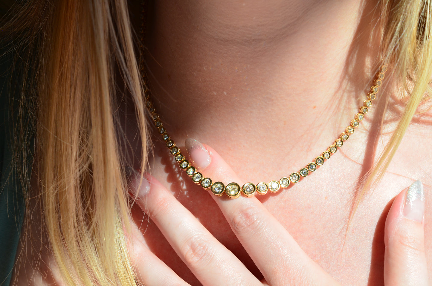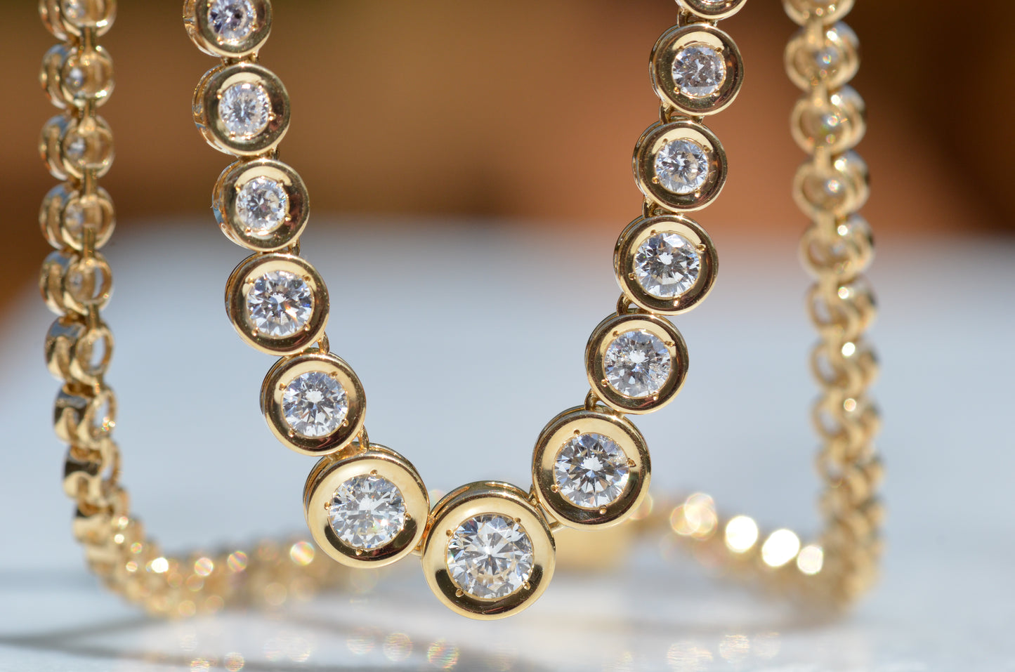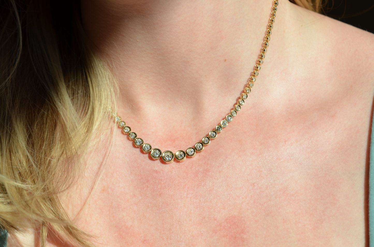 This diamond necklace is an absolutely breathtaking piece that you will always treasure. Stone-set necklaces featuring graduated gemstones - often called rivière or riviera necklaces - have been popular since at least the mid-1800s, and flatter a variety of necklines. This estate piece has been constructed with illusion settings: each diamond sits in its own concave cup-like setting, with tiny gold beads raised up to hold the stones secure. Called illusion settings for their ability to make the diamond appear larger, they give the impression of a bigger stone by mimicking, from a distance, bezel settings but with a larger diameter and covering less of the diamonds' visible surface area. The front portion of the necklace has each link attached on an angle to create a fixed curve in the front that prevents the necklace from flipping over while worn.