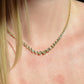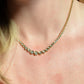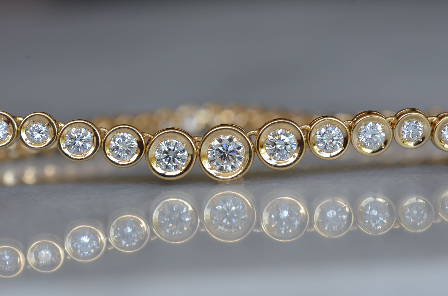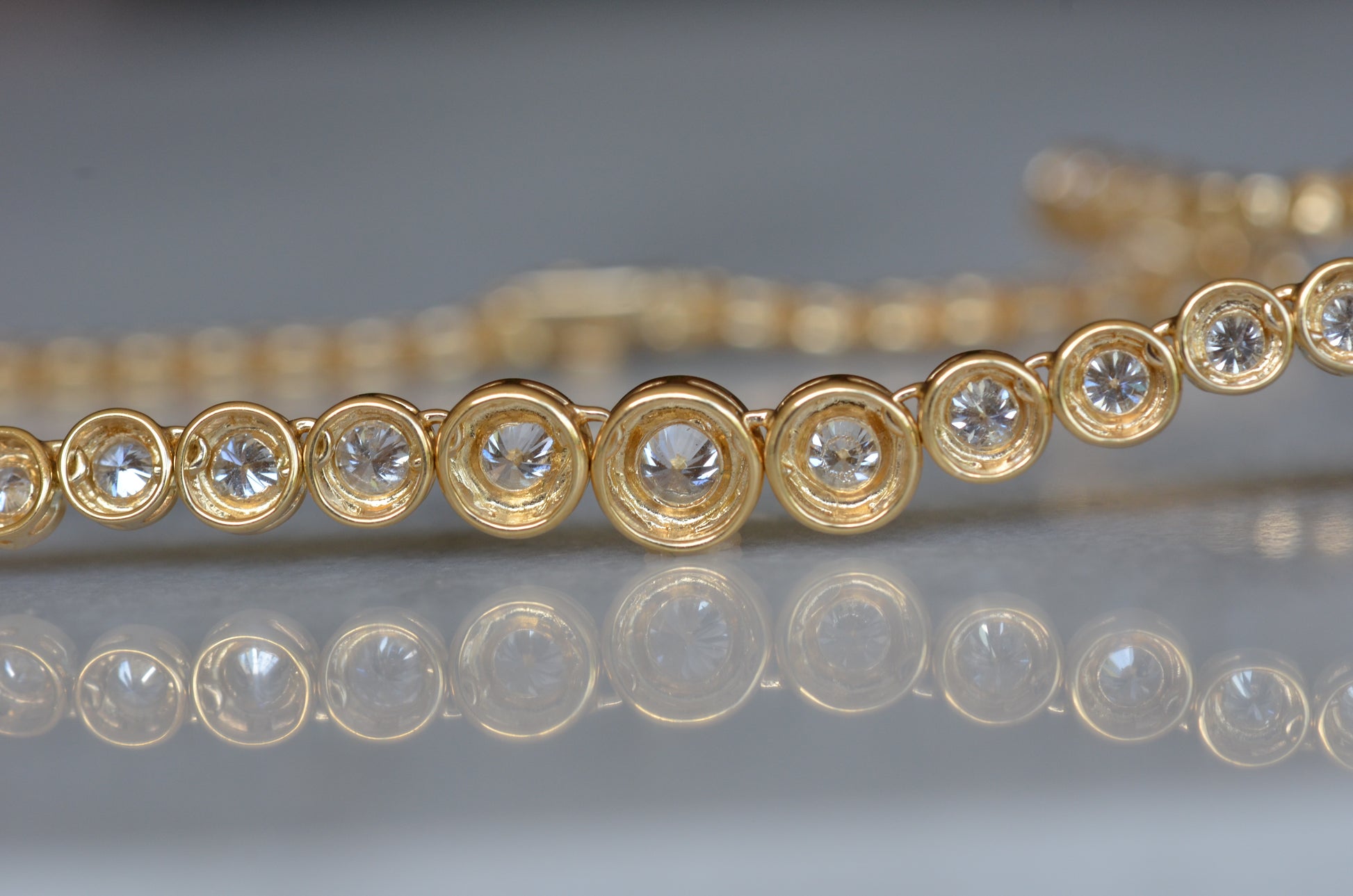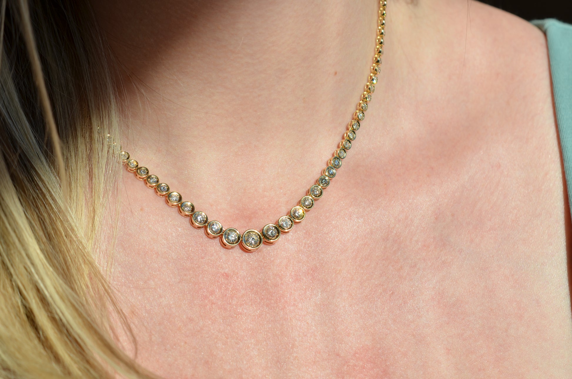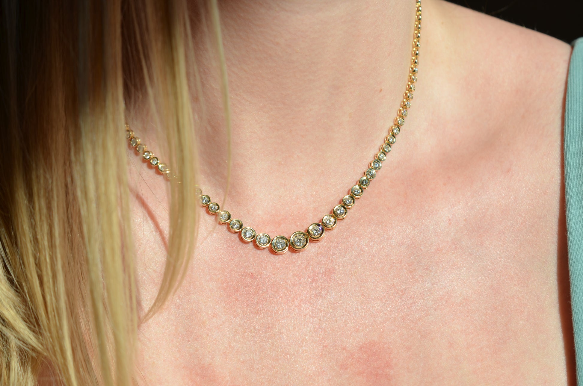 This diamond necklace is an absolutely breathtaking piece that you will always treasure. Stone-set necklaces featuring graduated gemstones - often called rivière or riviera necklaces - have been popular since at least the mid-1800s, and flatter a variety of necklines. This estate piece has been constructed with illusion settings: each diamond sits in its own concave cup-like setting, with tiny gold beads raised up to hold the stones secure. Called illusion settings for their ability to make the diamond appear larger, they give the impression of a bigger stone by mimicking, from a distance, bezel settings but with a larger diameter and covering less of the diamonds' visible surface area. The front portion of the necklace has each link attached on an angle to create a fixed curve in the front that prevents the necklace from flipping over while worn.