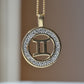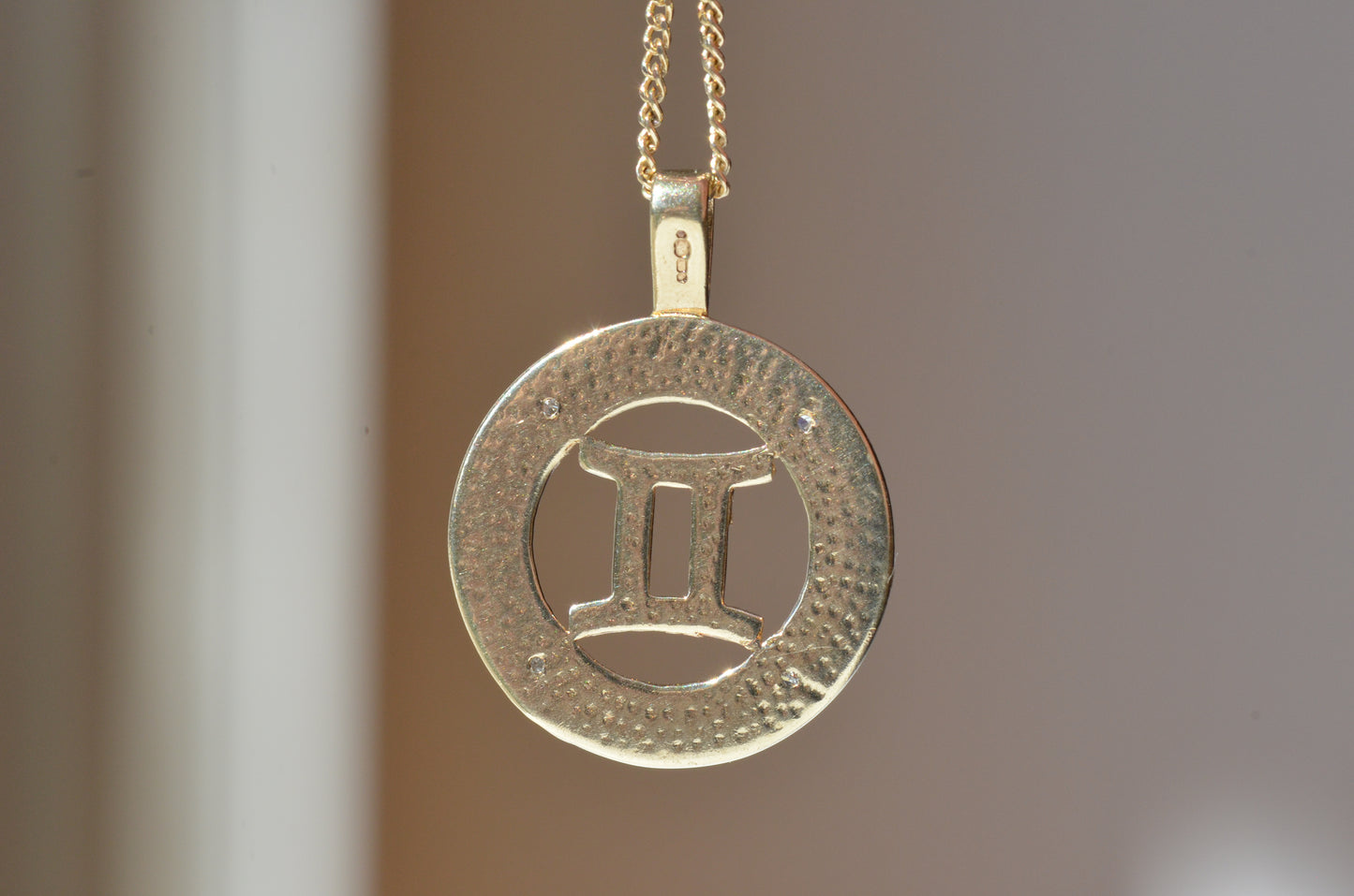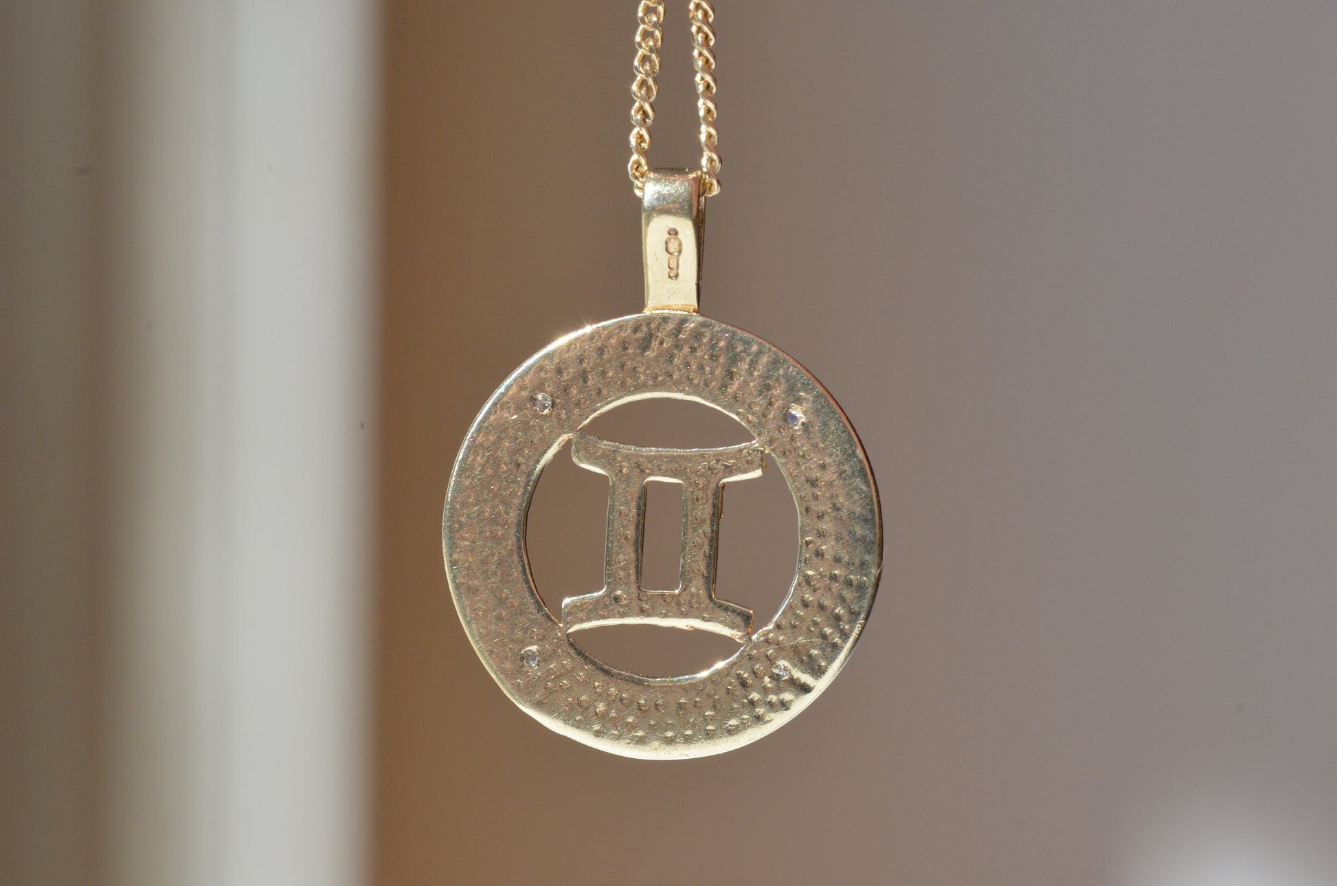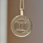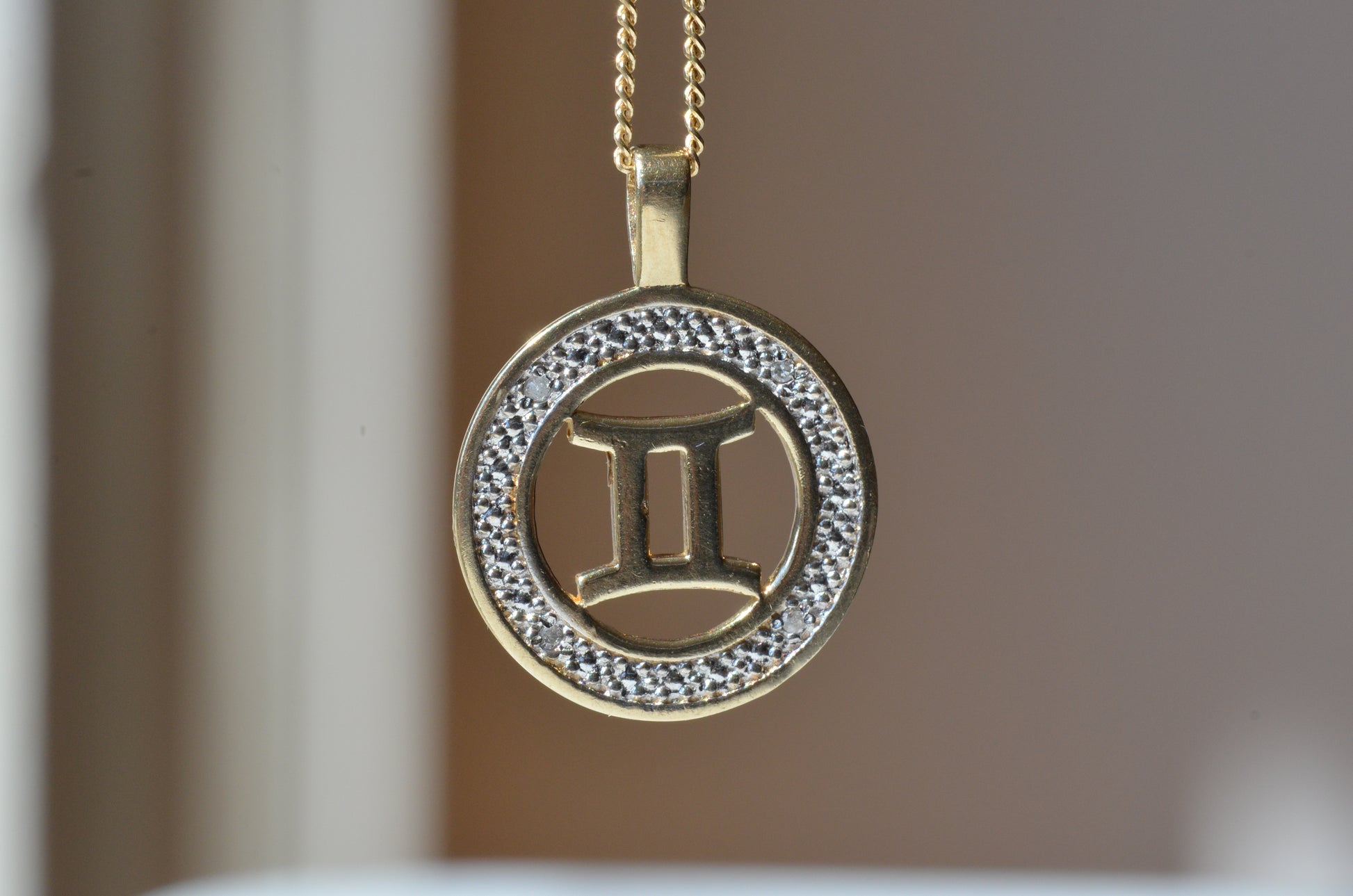 No one has ever claimed a Gemini is subtle, so naturally this medallion takes the classic astrological symbol and cranks it up a notch with two-tone gold and a balanced quartet of wee diamonds in a textured finish to catch the light.