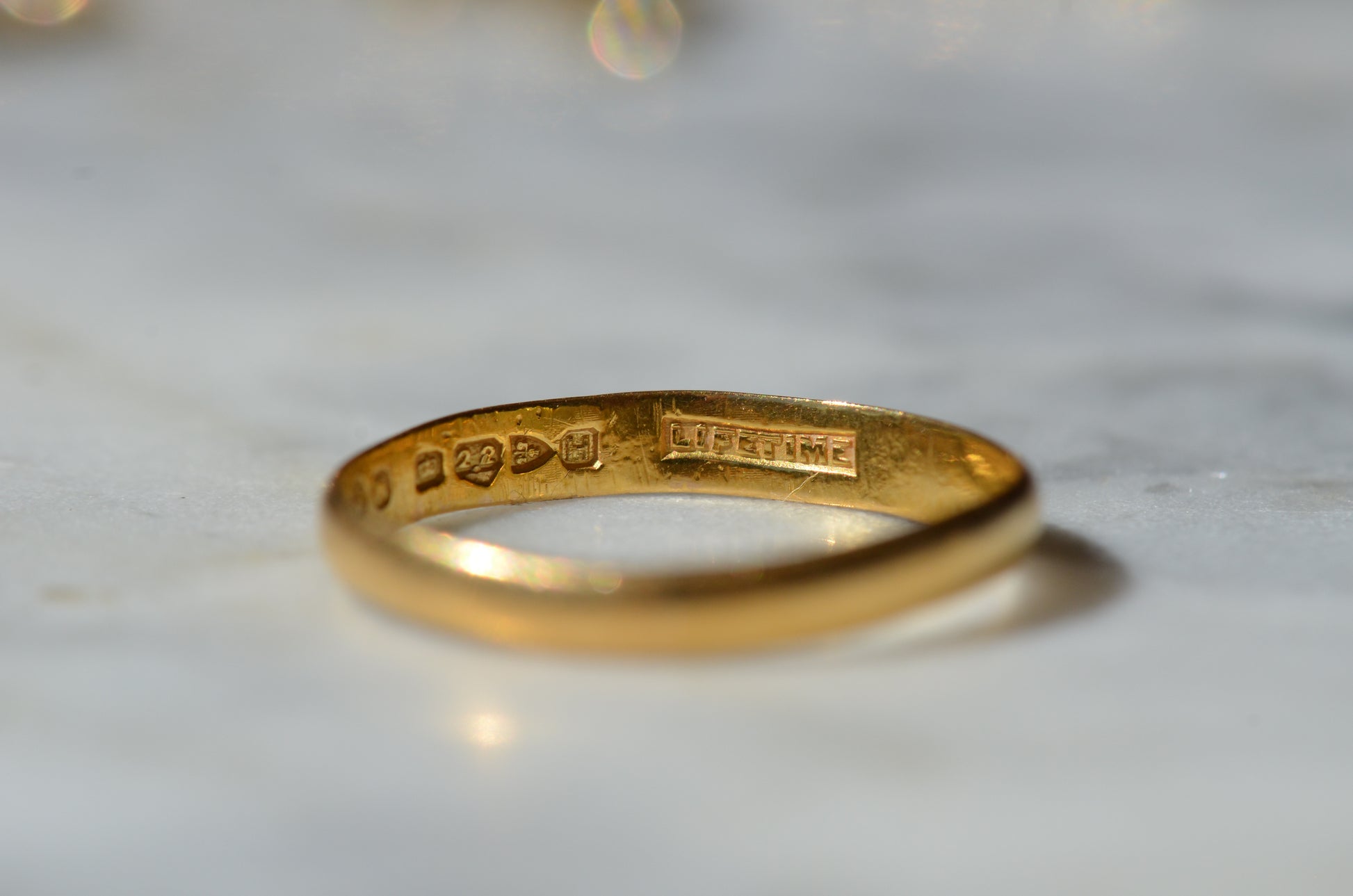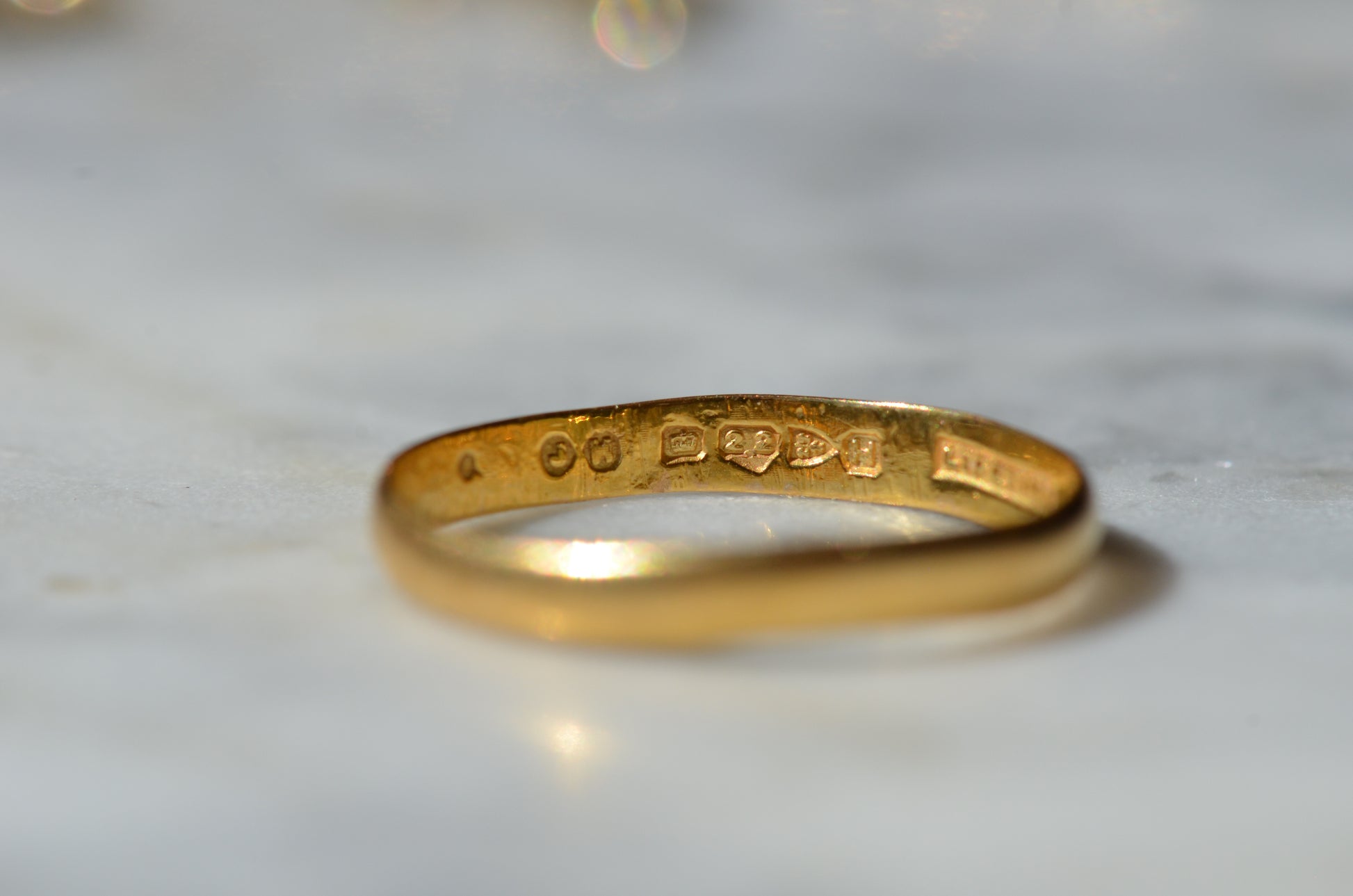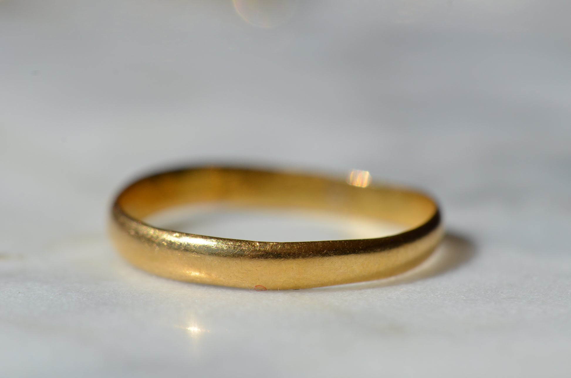 Gold alloys are softer in higher karats, so this old ring has developed some lovely wear over its lifetime with all the little scratches and dings that can't be replicated in a modern piece. While band rings are easy to resize, and often bear evidence of past resizing, we don't recommend it for this ring as that beautiful patina would be lost. This particular ring appears to have been sized up by light stretching, and time and wear have pushed it a little out of shape - resulting in a dip that, as though by kismet, snuggles subtly yet perfectly around stone-set rings.