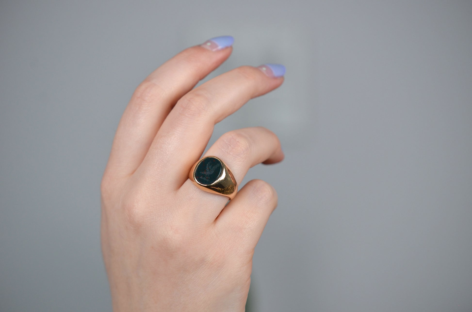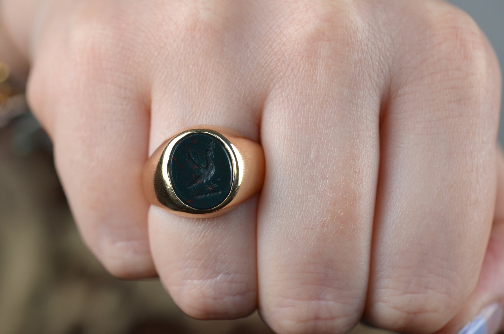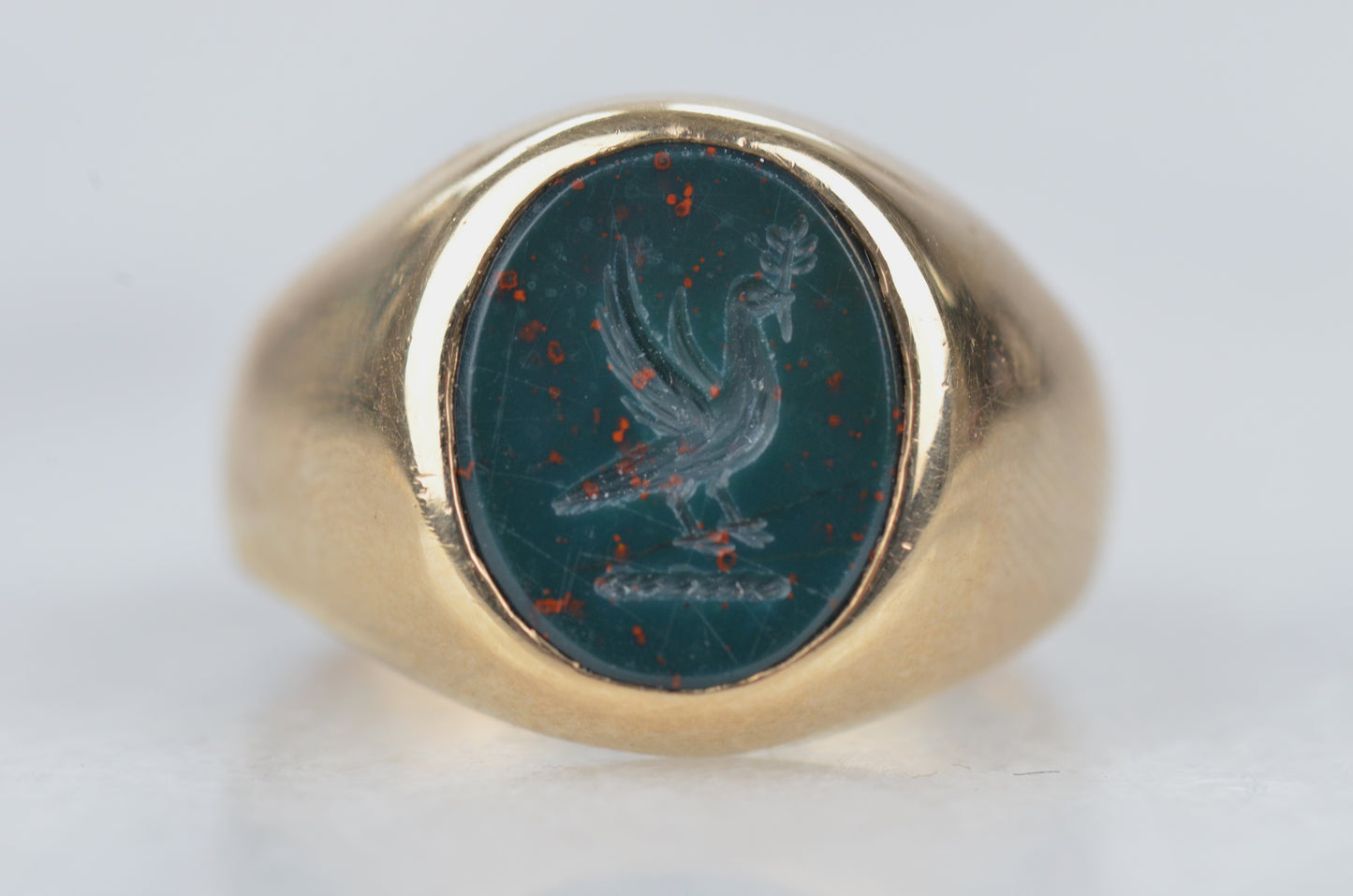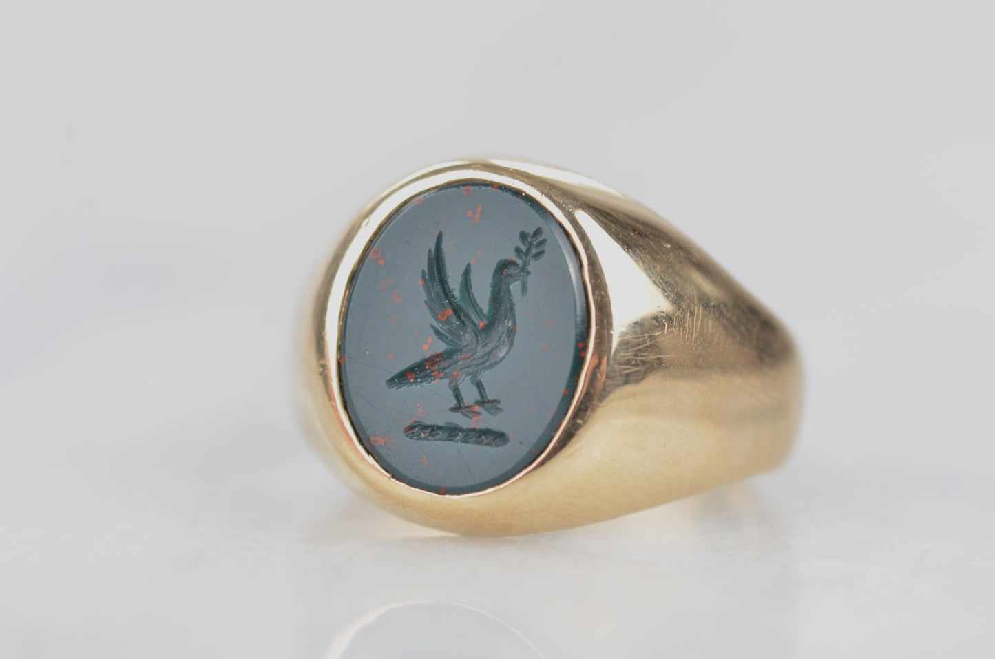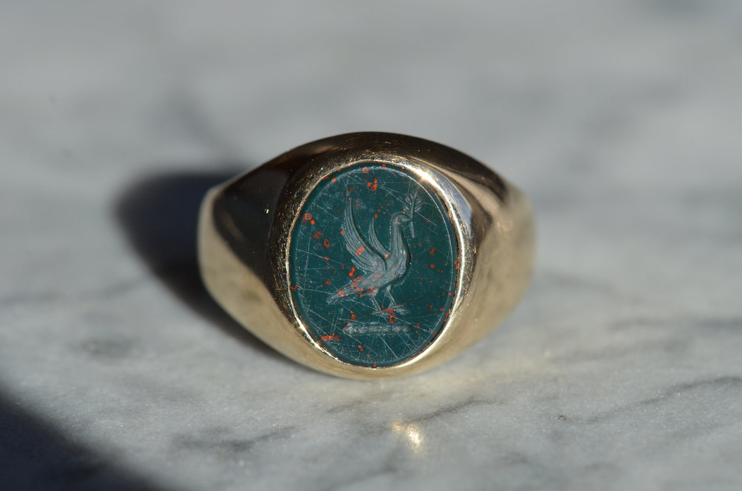 A breathtaking signet ring with an expertly carved intaglio depicted a dove extending an olive branch in its beak. Two powerful symbols of peace, love, and reconciliation in a dramatic stone and rich, heavy band make a statement ring indeed. The bloodstone is a deep saturation, looking almost black under regular indoor lighting, but when caught in the sunlight it sings a velvety forest green, flecked throughout with the telltale red specks that lend the gem its name. Though the back of the ring is lightly hollowed out, it still comes in at a very substantial 7 grams and feels weighty and beautiful on the hand.