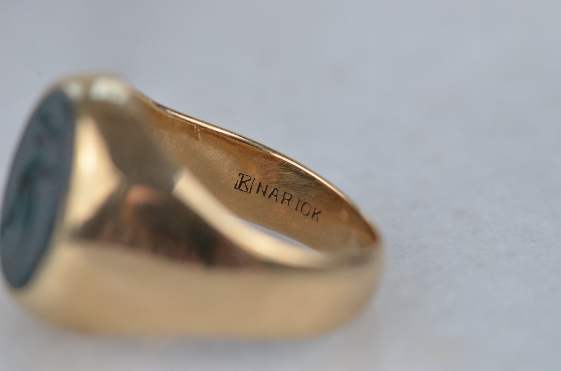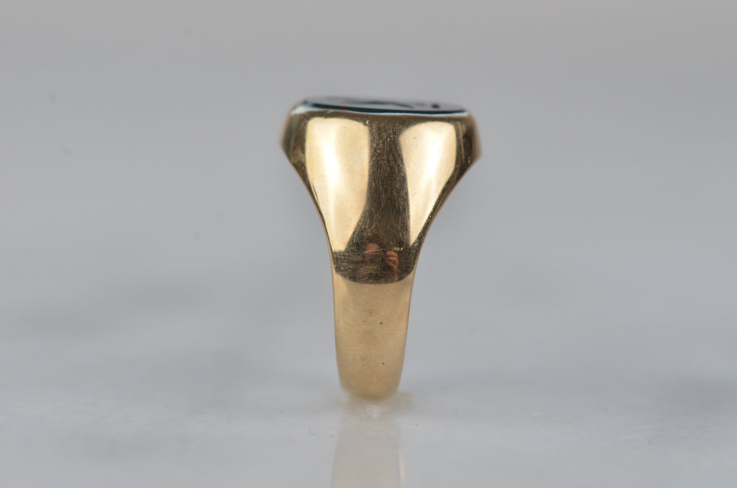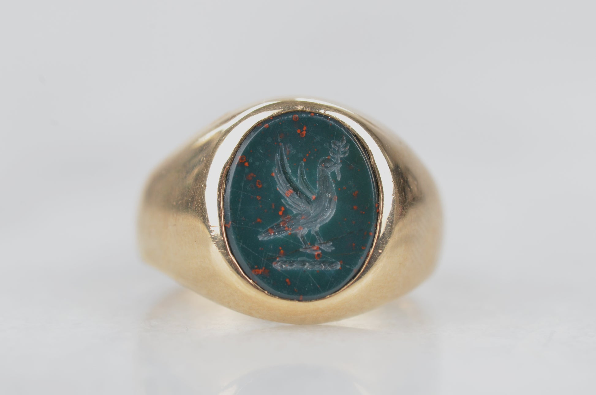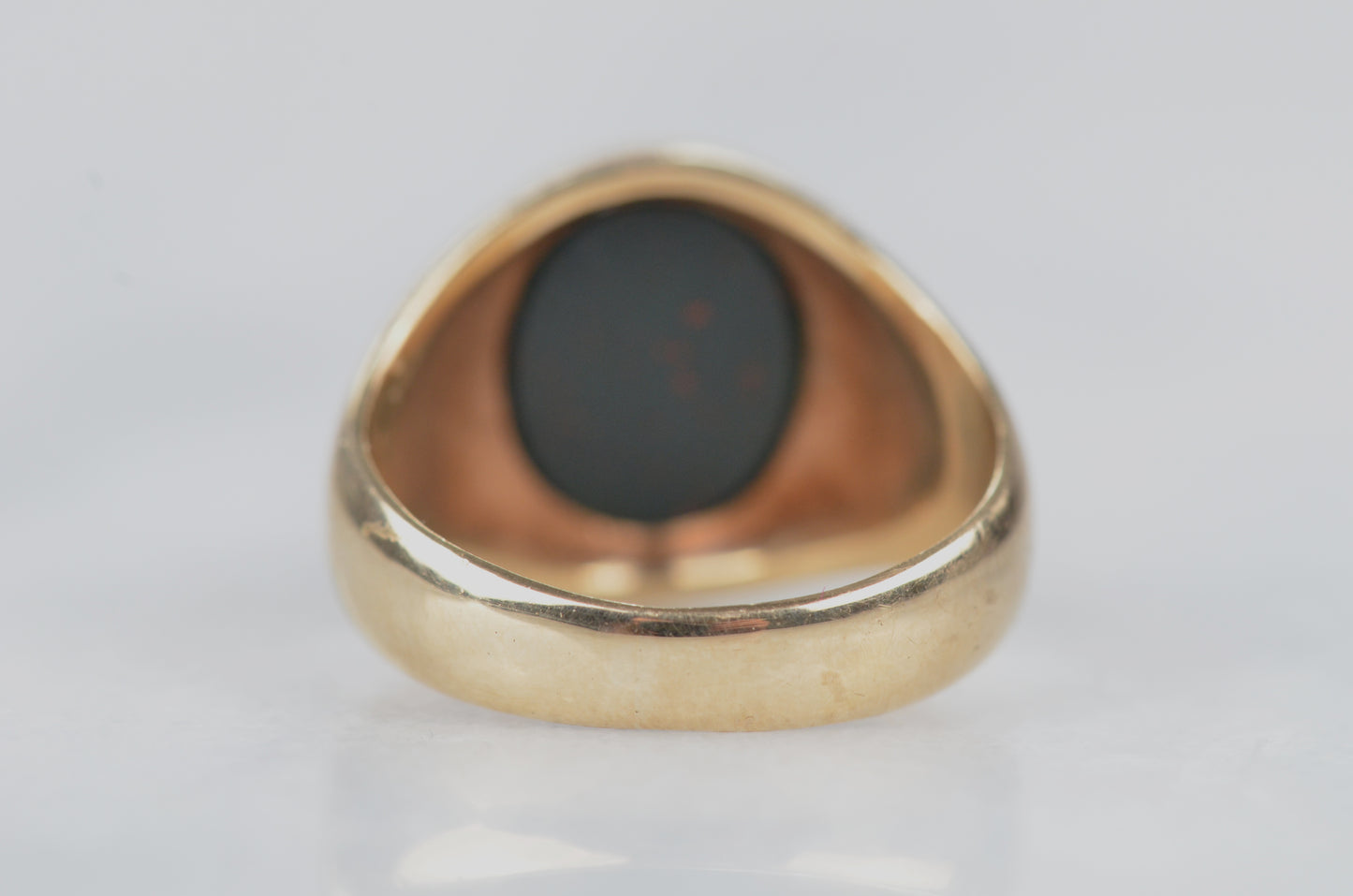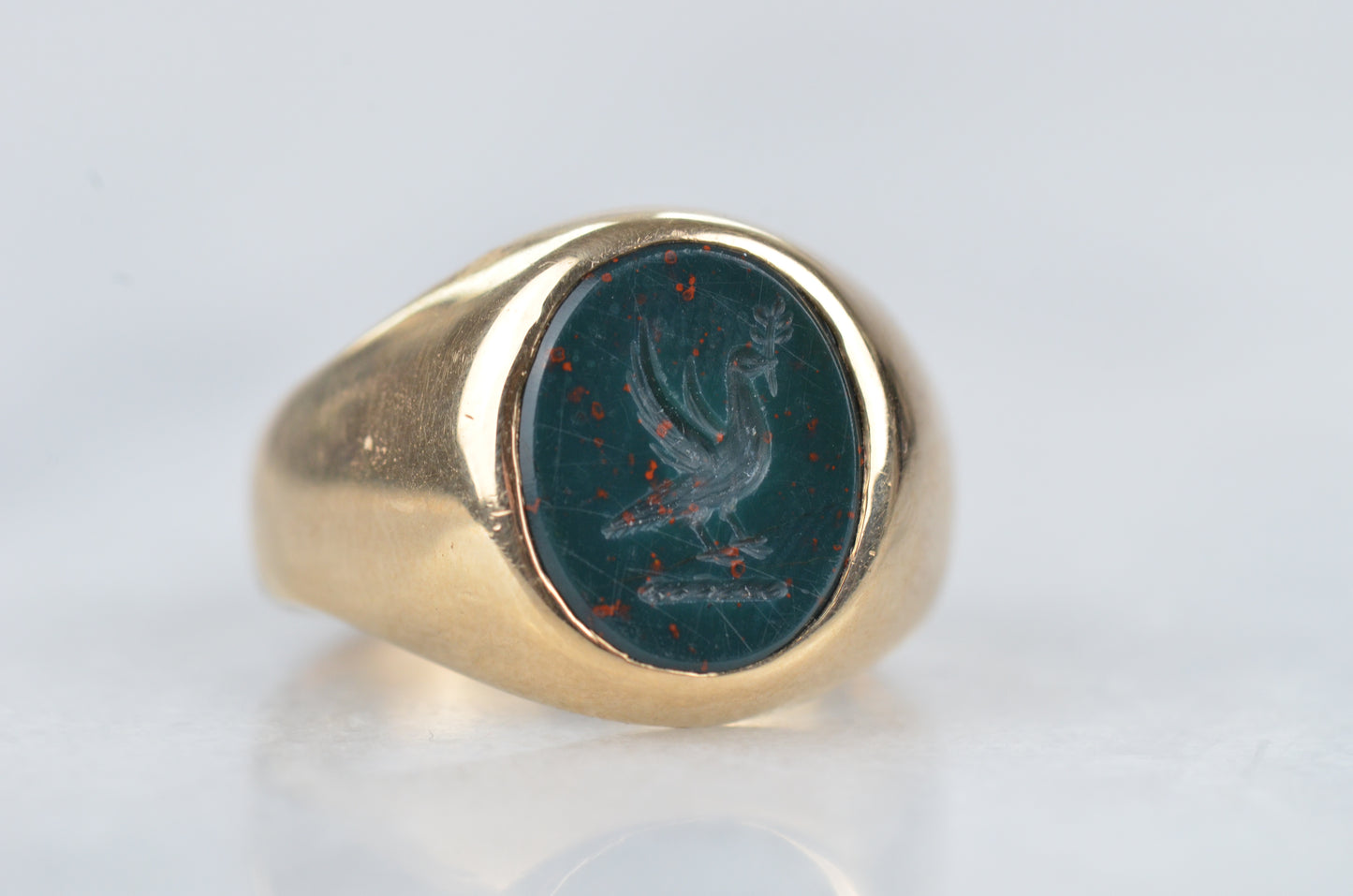 A breathtaking signet ring with an expertly carved intaglio depicted a dove extending an olive branch in its beak. Two powerful symbols of peace, love, and reconciliation in a dramatic stone and rich, heavy band make a statement ring indeed. The bloodstone is a deep saturation, looking almost black under regular indoor lighting, but when caught in the sunlight it sings a velvety forest green, flecked throughout with the telltale red specks that lend the gem its name. Though the back of the ring is lightly hollowed out, it still comes in at a very substantial 7 grams and feels weighty and beautiful on the hand.