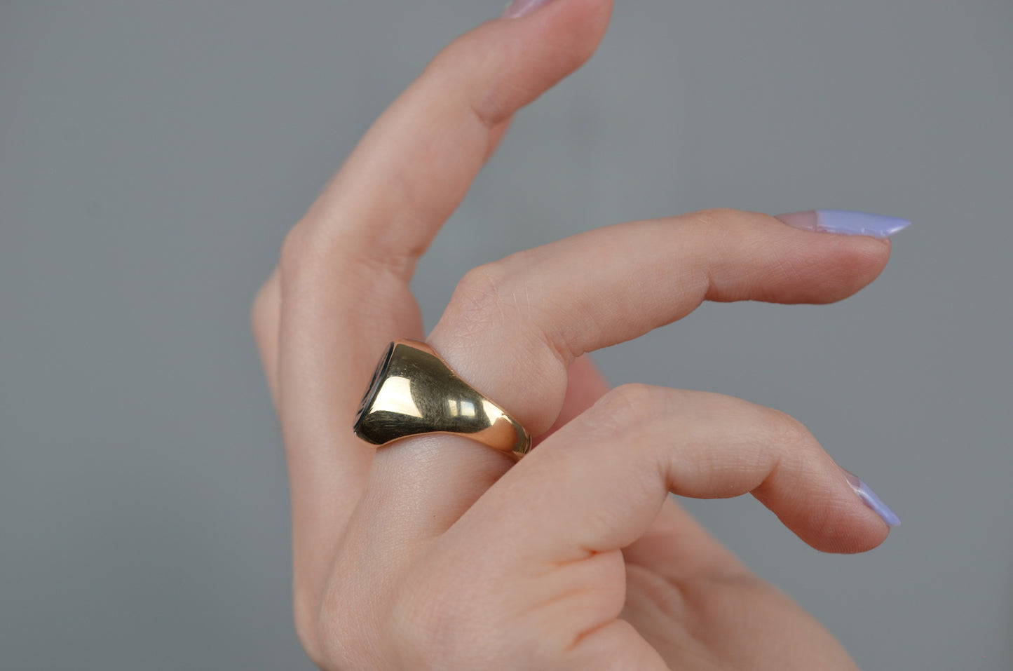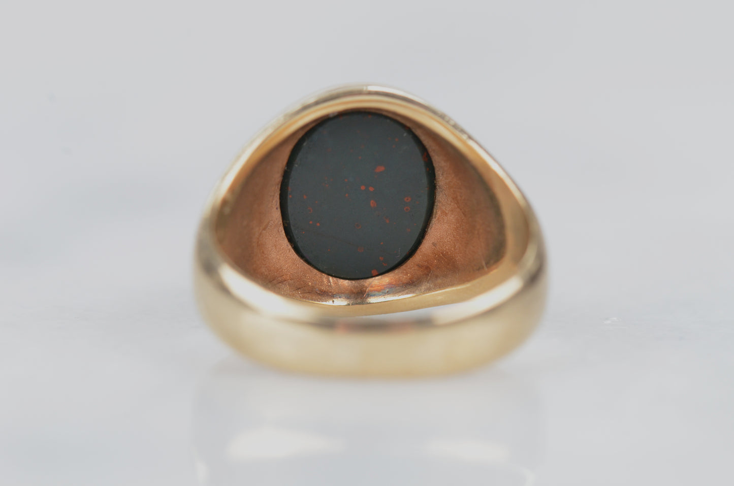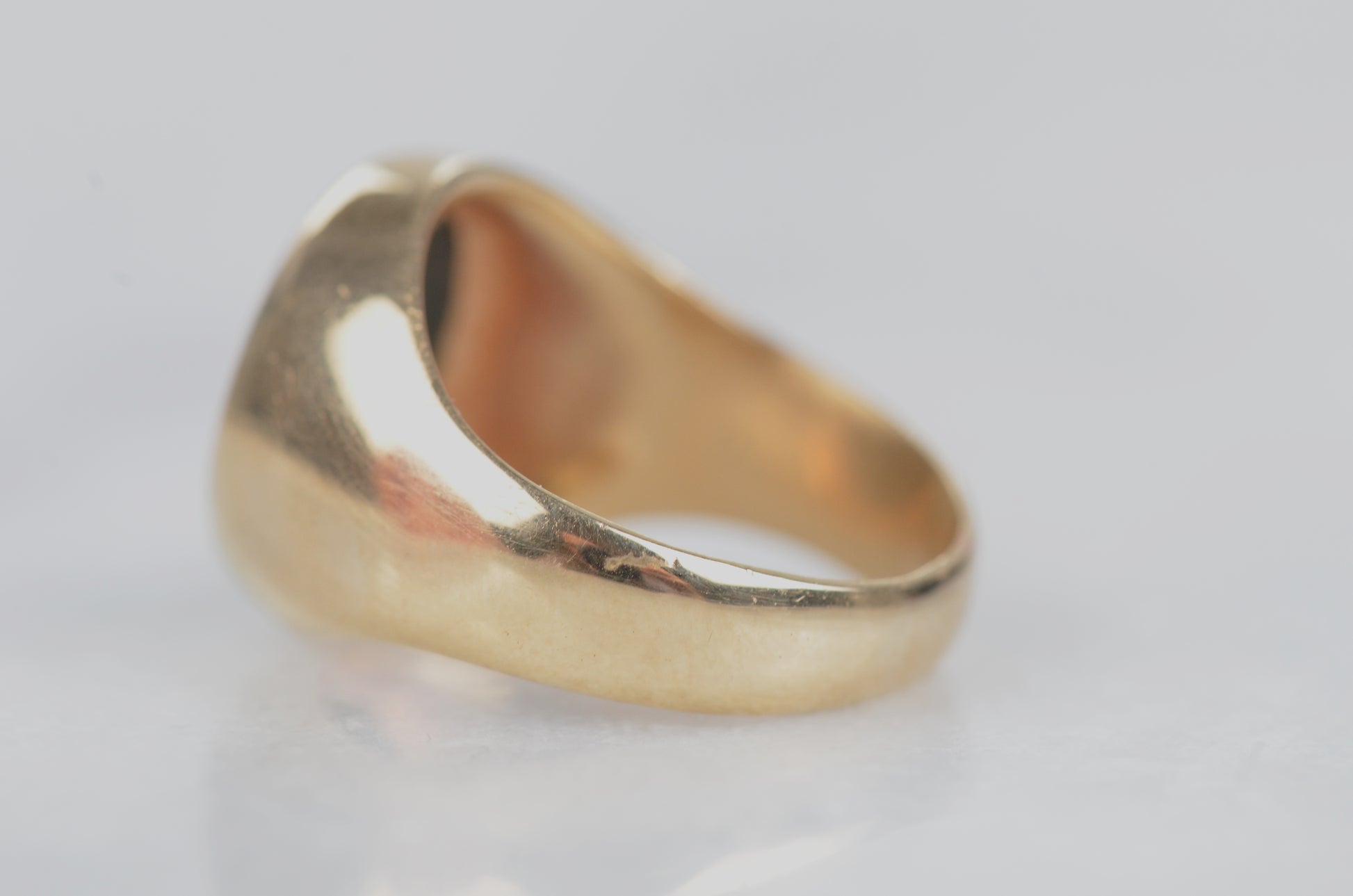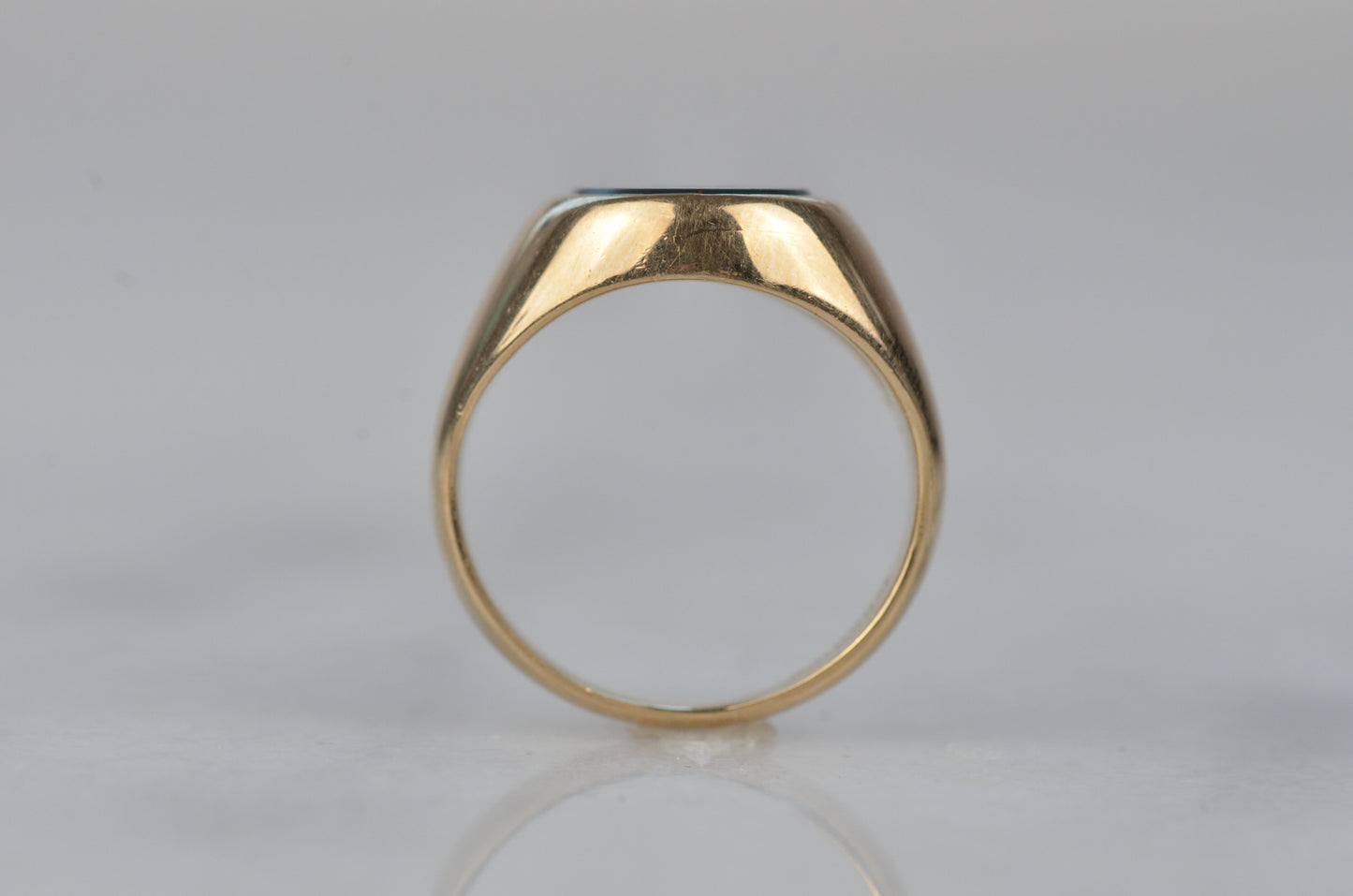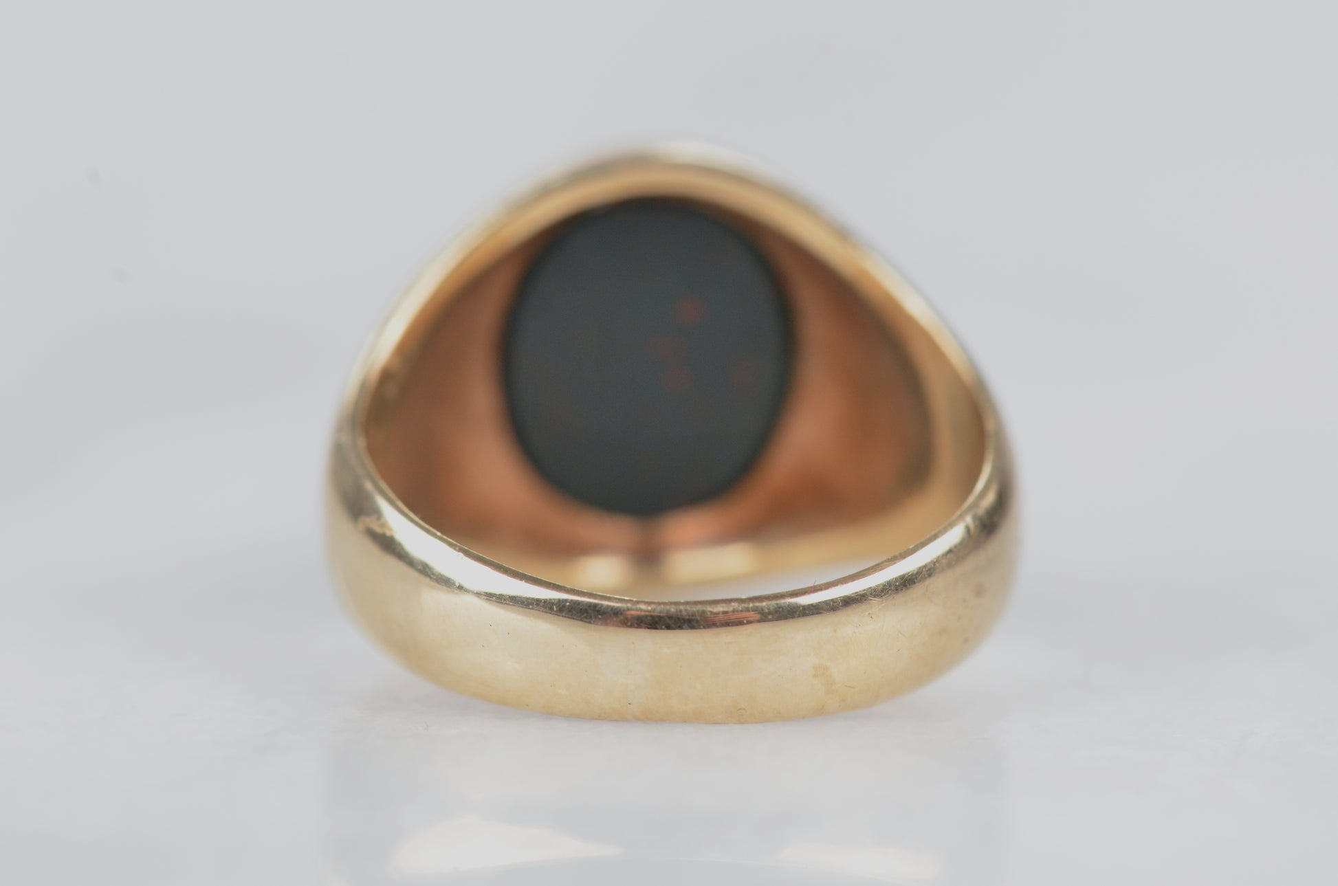 A breathtaking signet ring with an expertly carved intaglio depicted a dove extending an olive branch in its beak. Two powerful symbols of peace, love, and reconciliation in a dramatic stone and rich, heavy band make a statement ring indeed. The bloodstone is a deep saturation, looking almost black under regular indoor lighting, but when caught in the sunlight it sings a velvety forest green, flecked throughout with the telltale red specks that lend the gem its name. Though the back of the ring is lightly hollowed out, it still comes in at a very substantial 7 grams and feels weighty and beautiful on the hand.