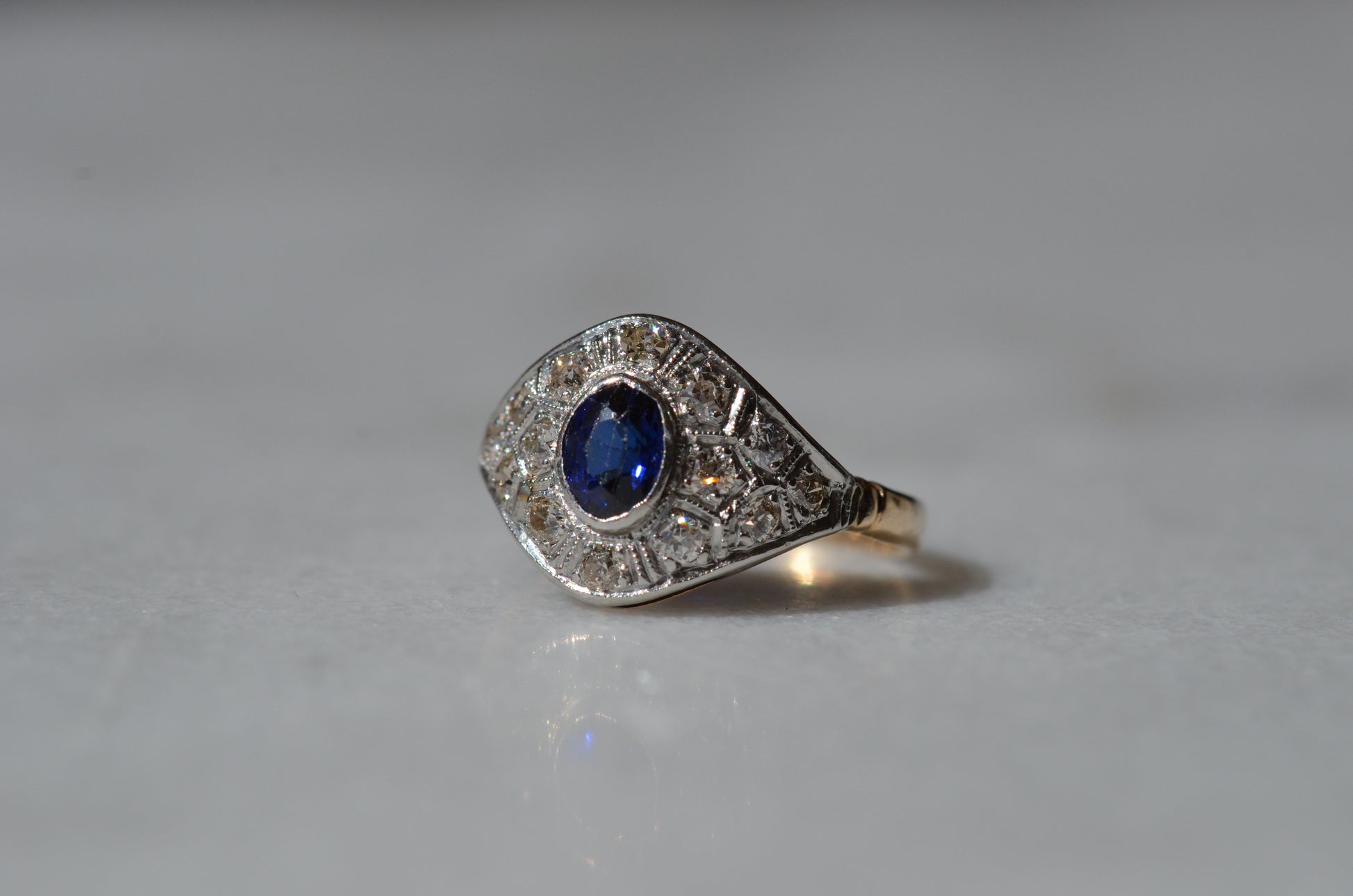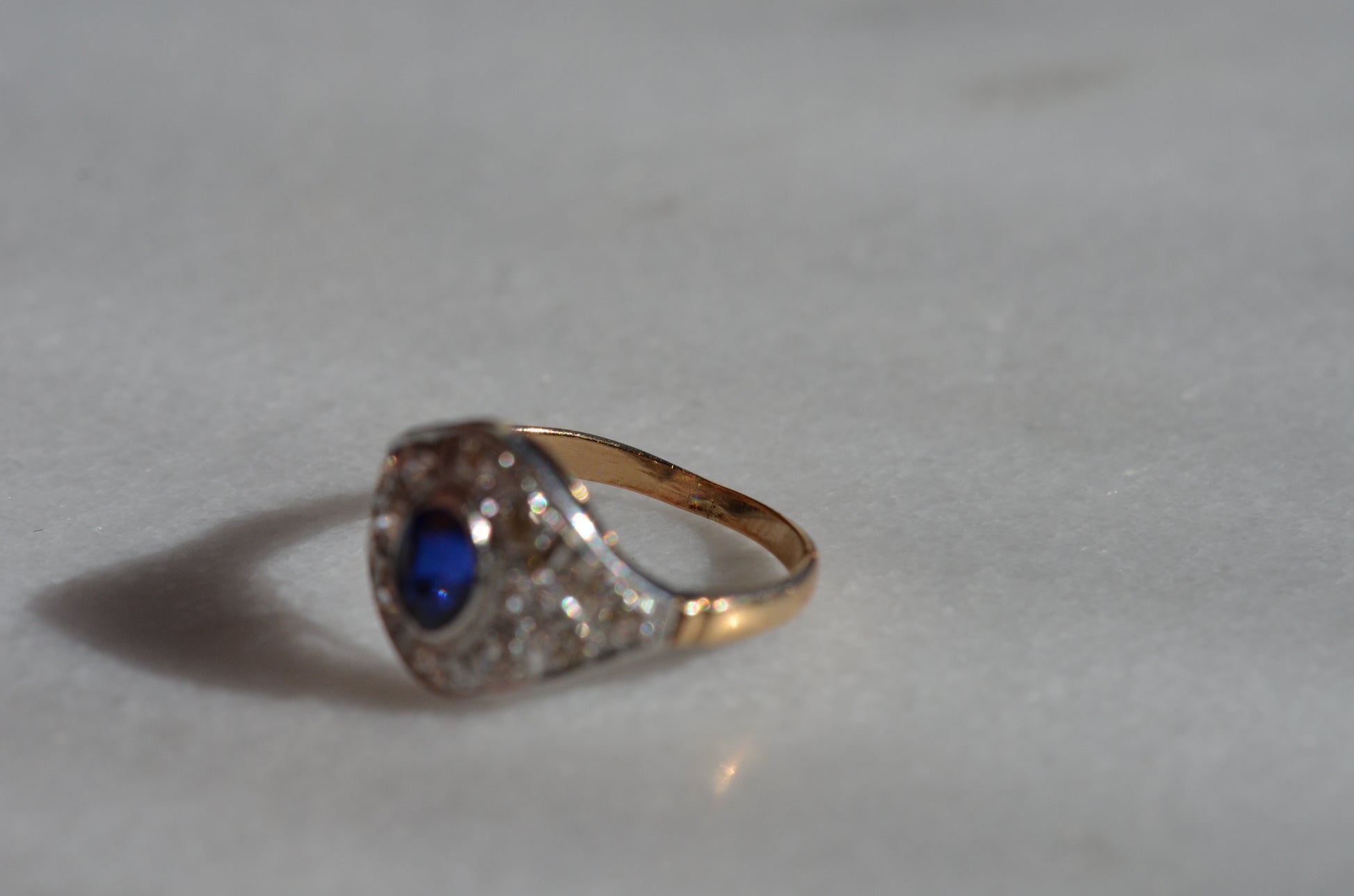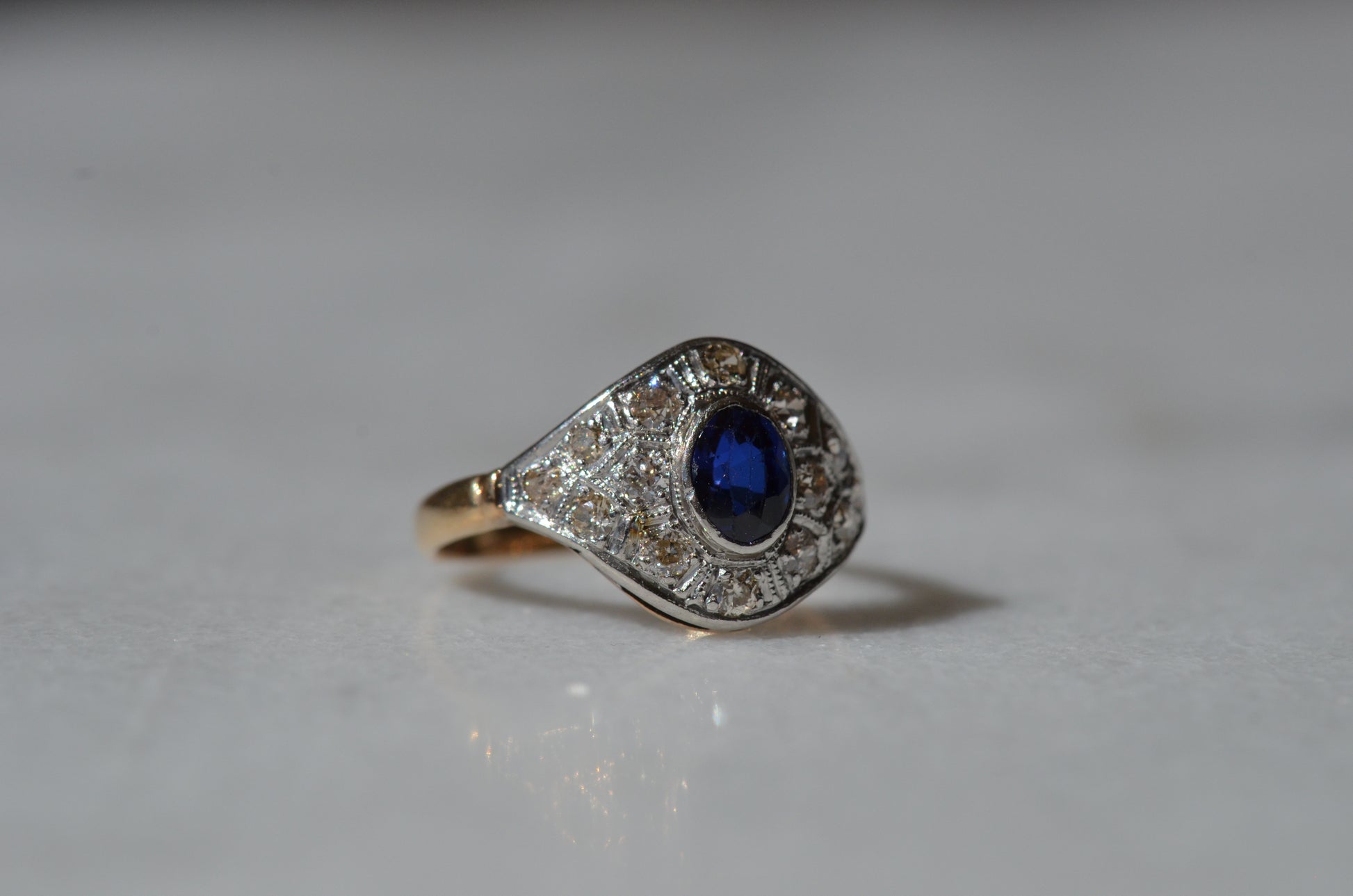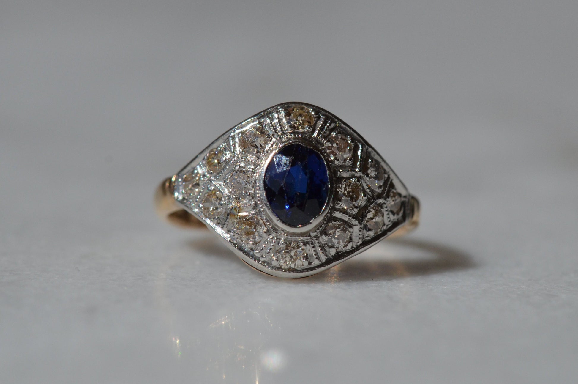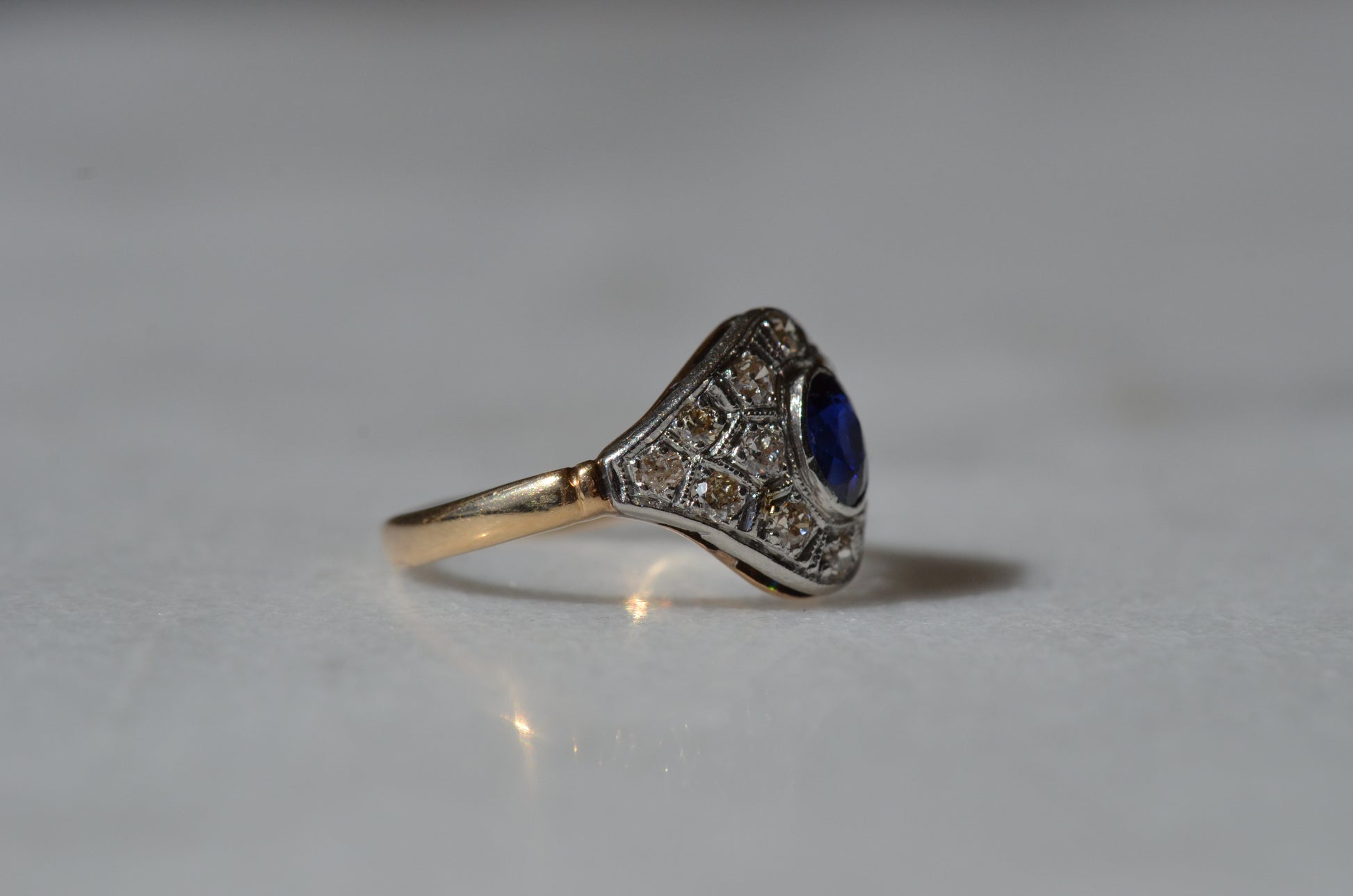 • One oval cut synthetic sapphire, 13 transitional cut diamonds and one single cut diamond approximately 0.82ctw