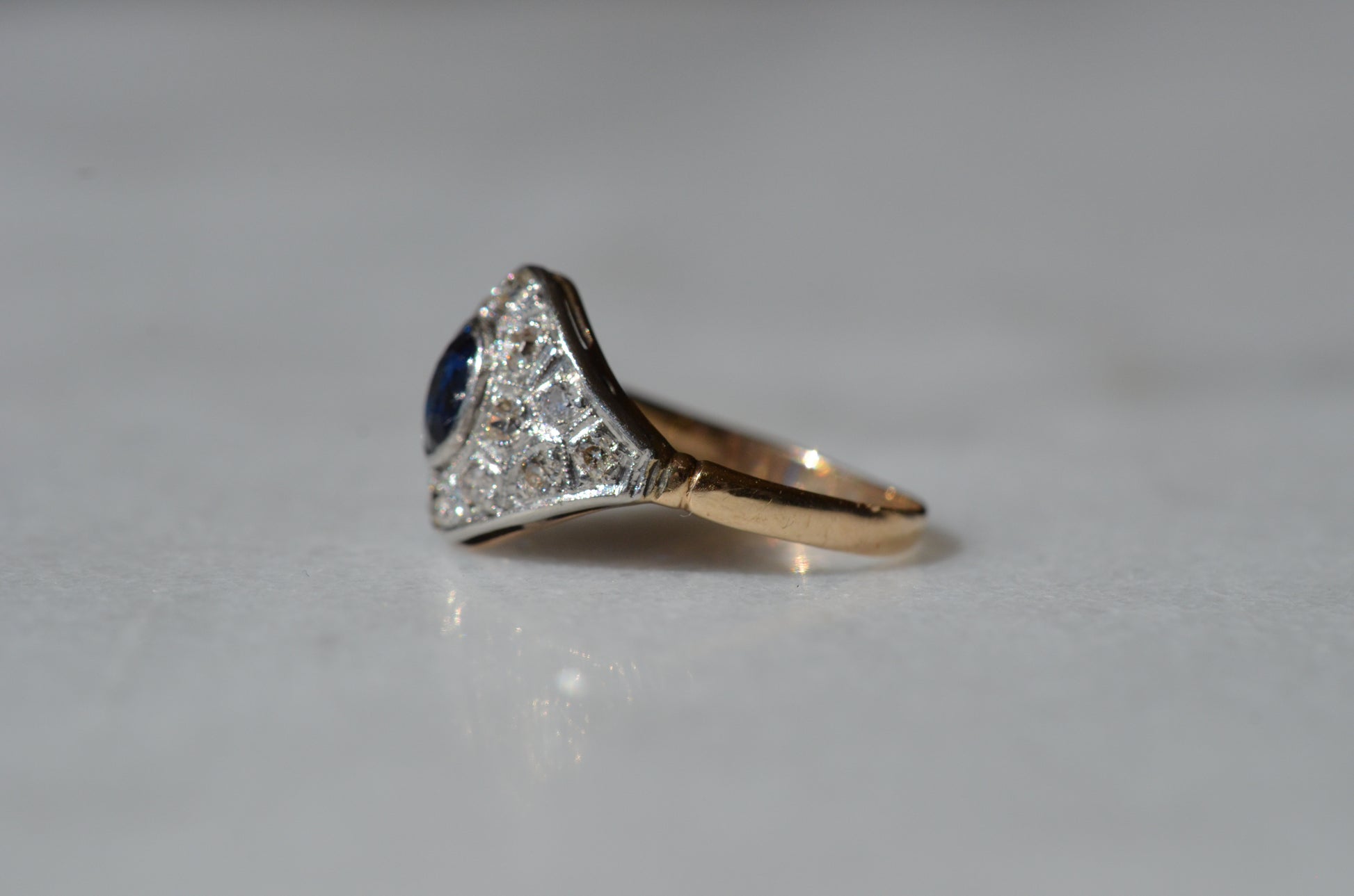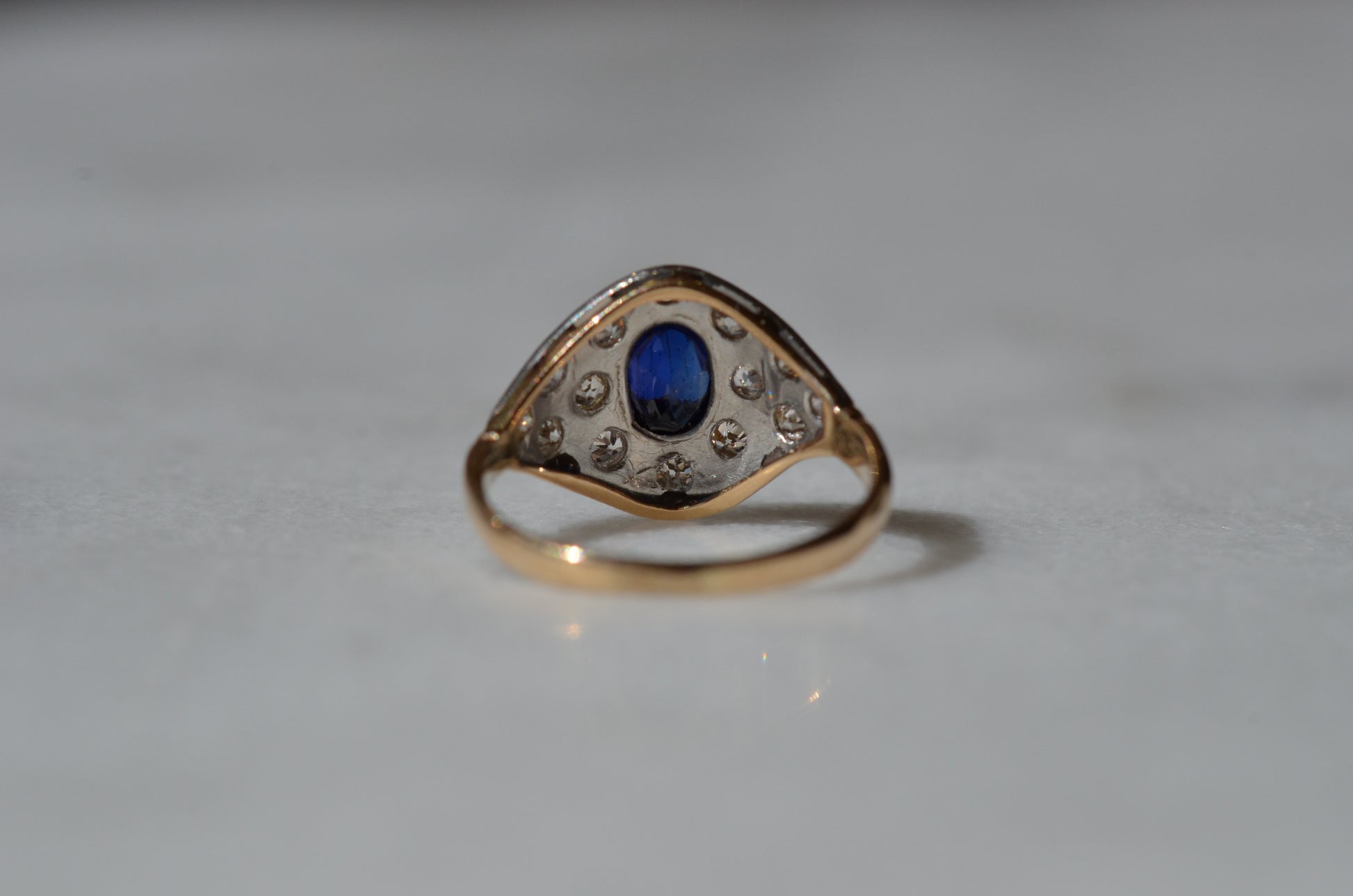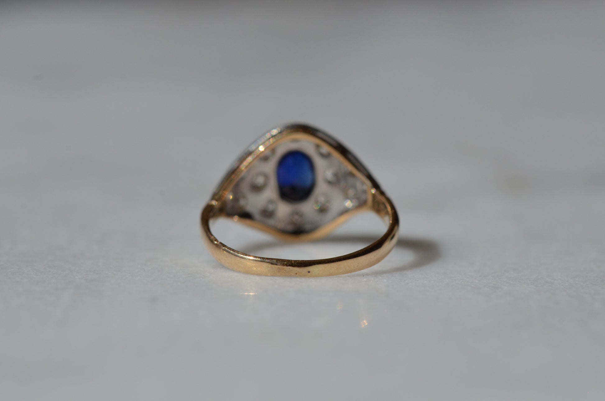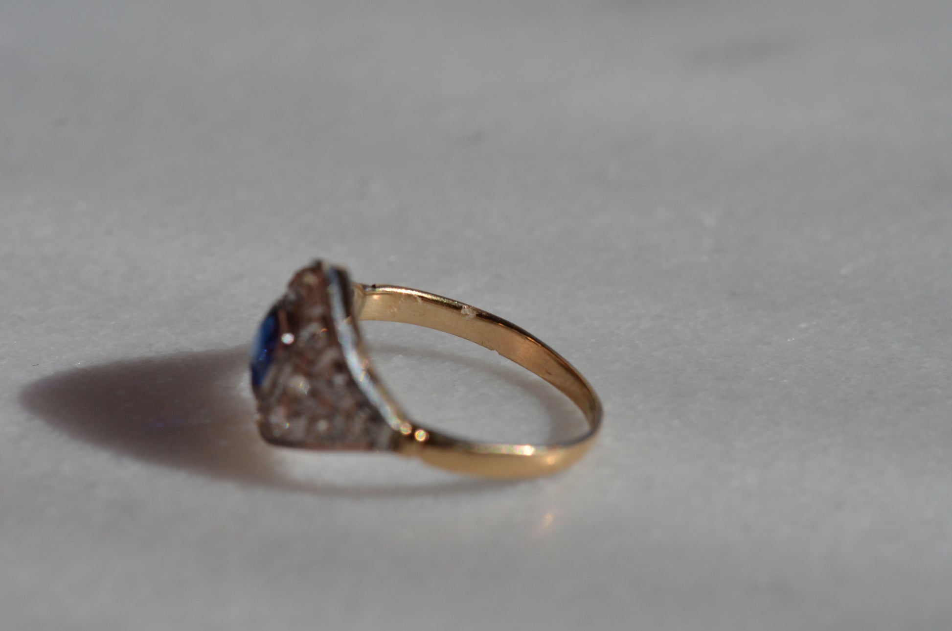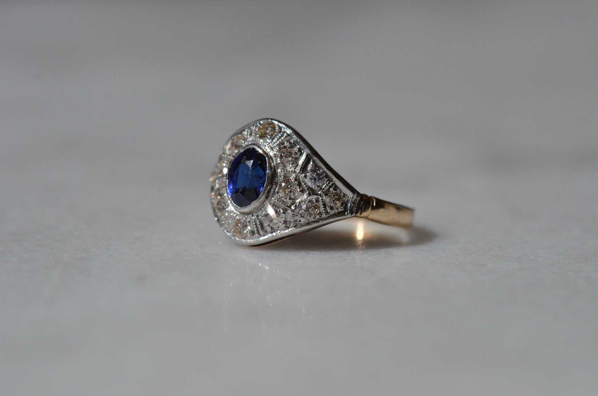 • One oval cut synthetic sapphire, 13 transitional cut diamonds and one single cut diamond approximately 0.82ctw