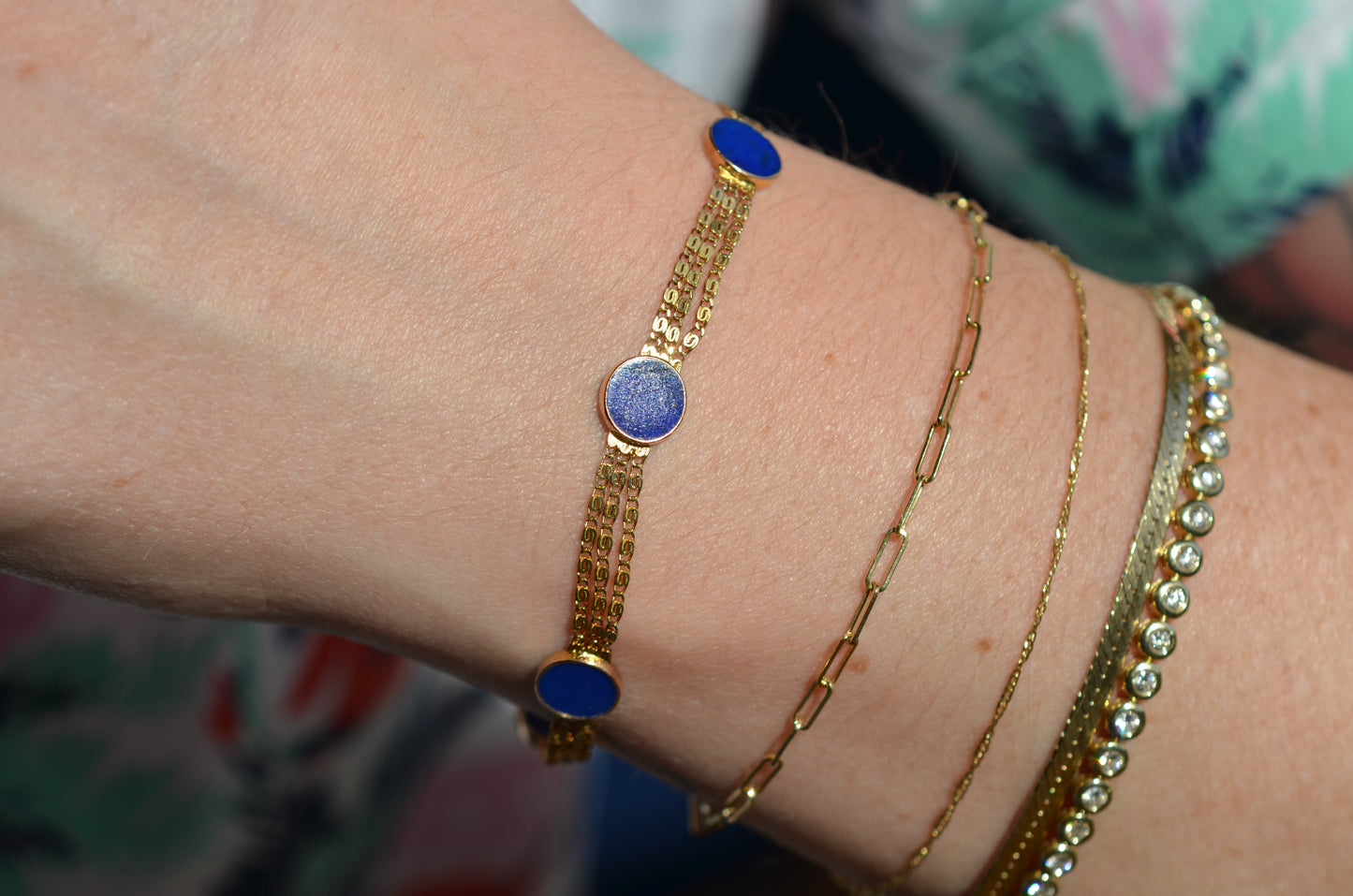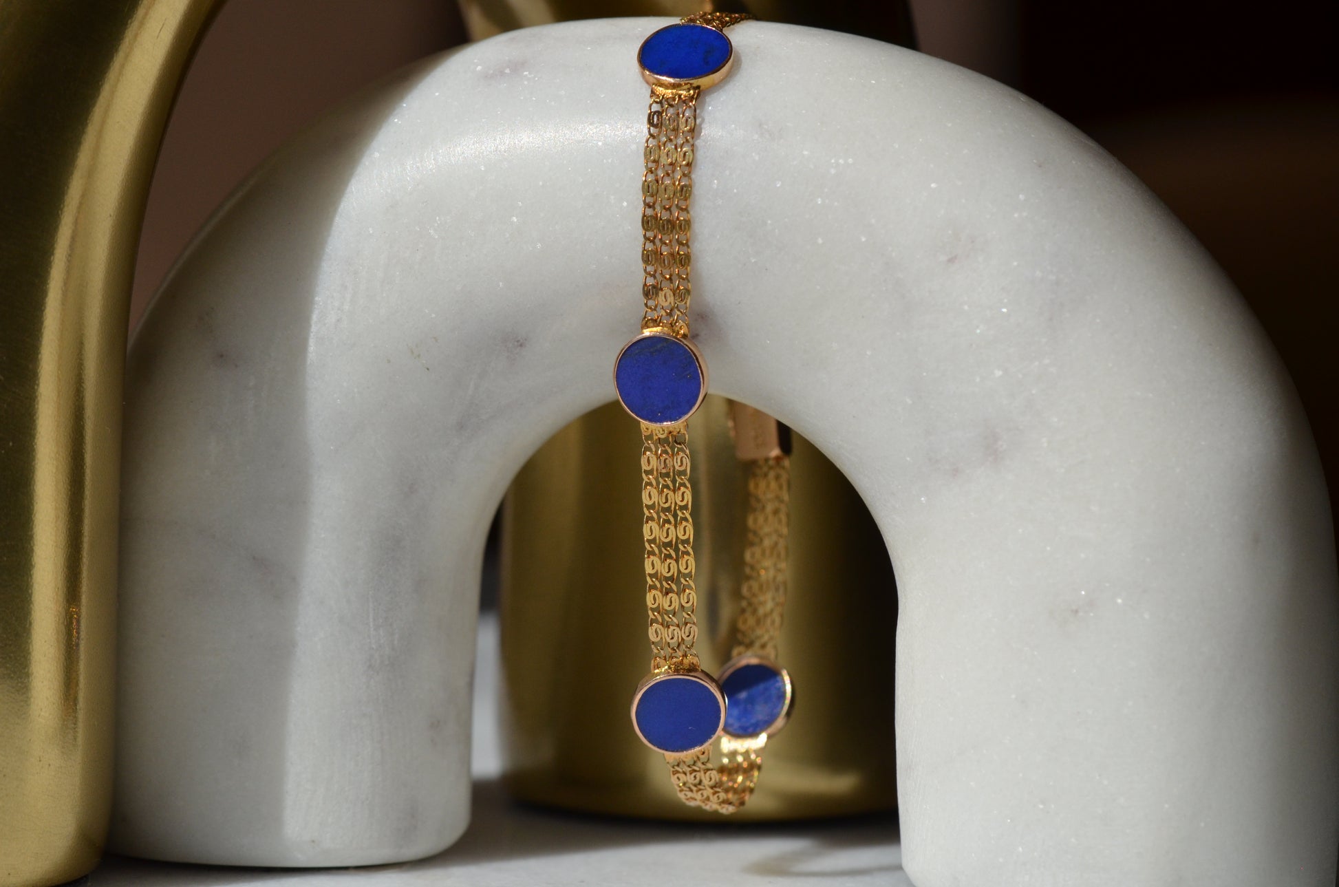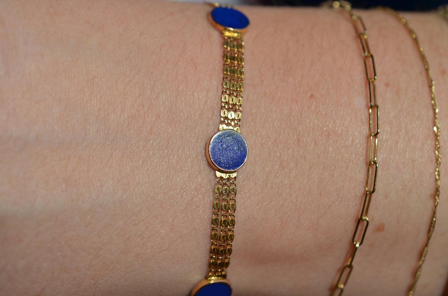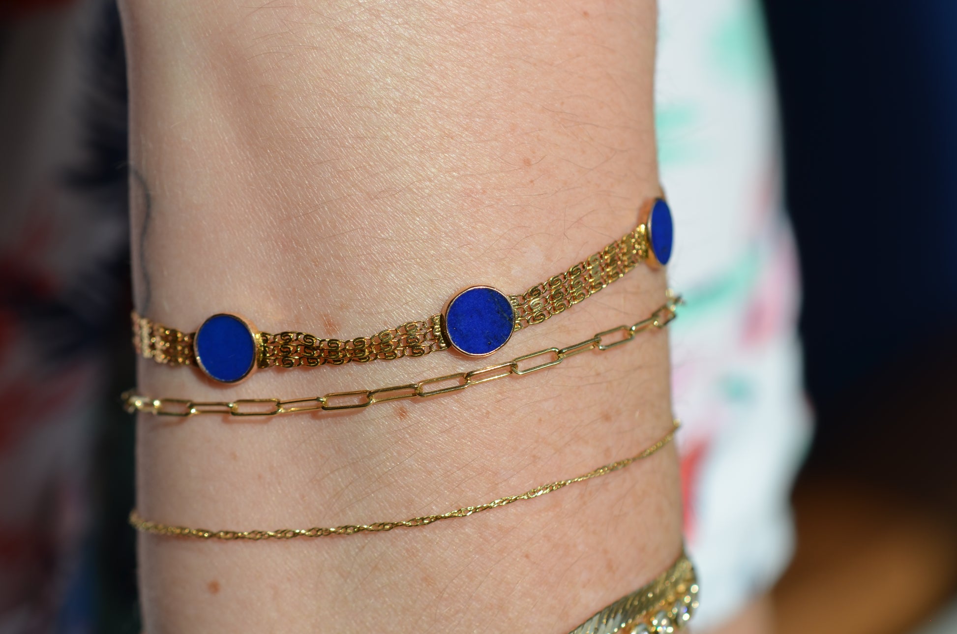 Like a night sky dotted with twinkling stars, deep ultramarine lapis lazuli flecked with golden pyrite has captivated for thousands of years. The warm yellow gold of the bezels and bracelet is the perfect complement to the cool blue of the stone. With swirling lines and bold presence, this bracelet would be perfect alone or in a stack.