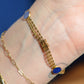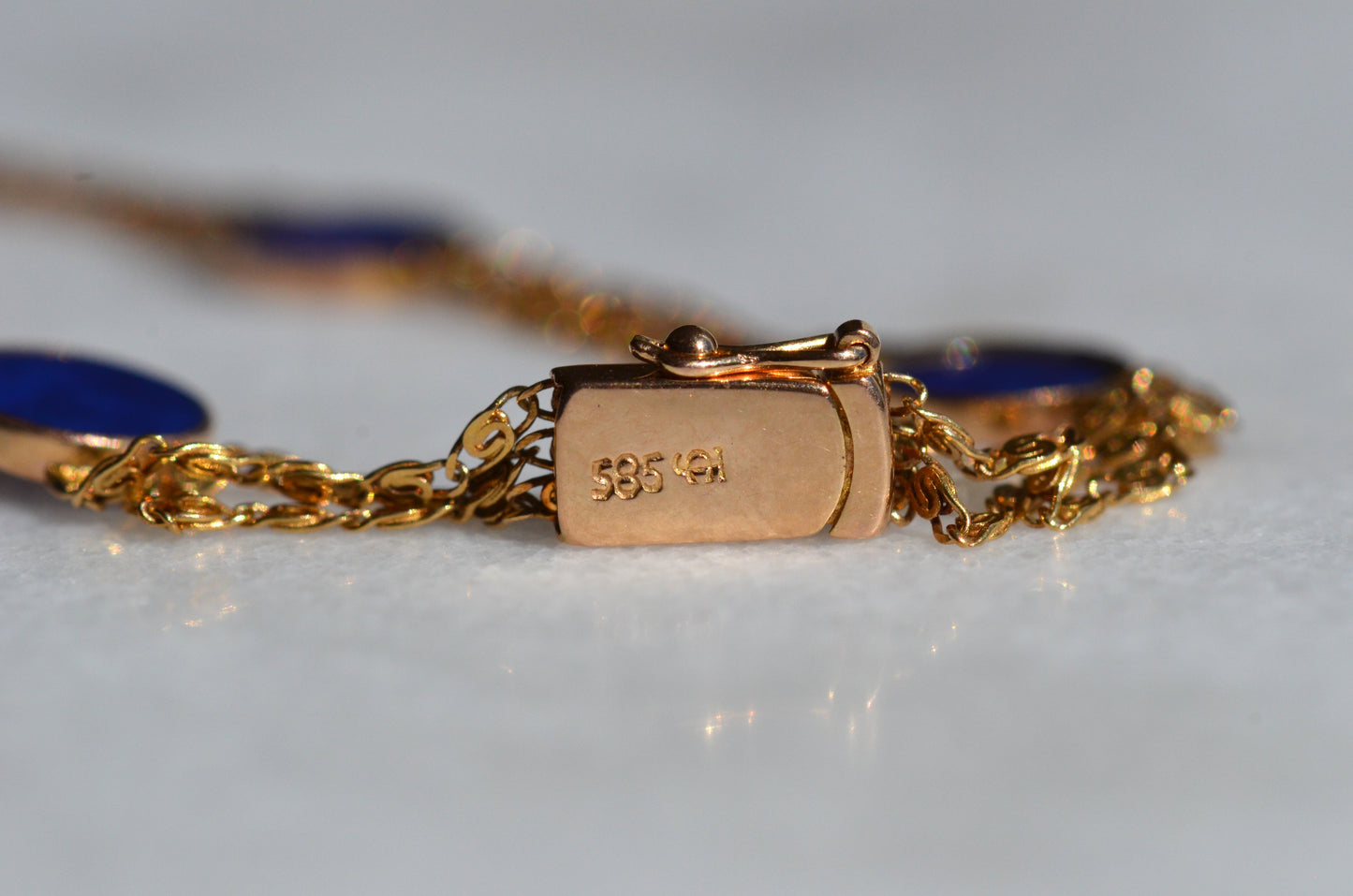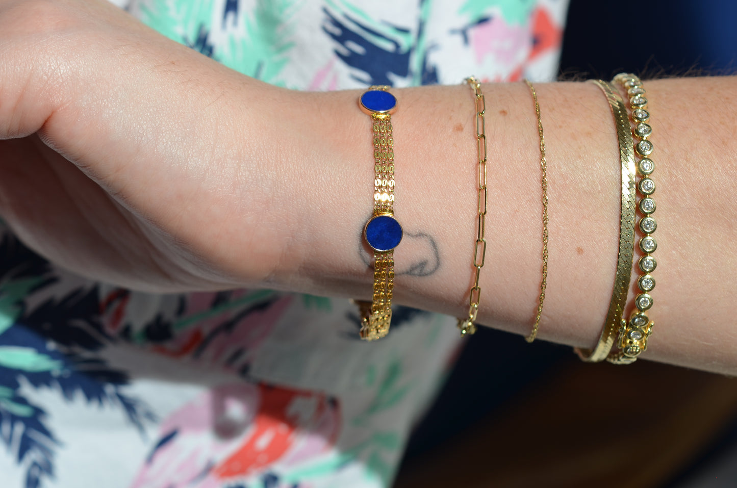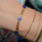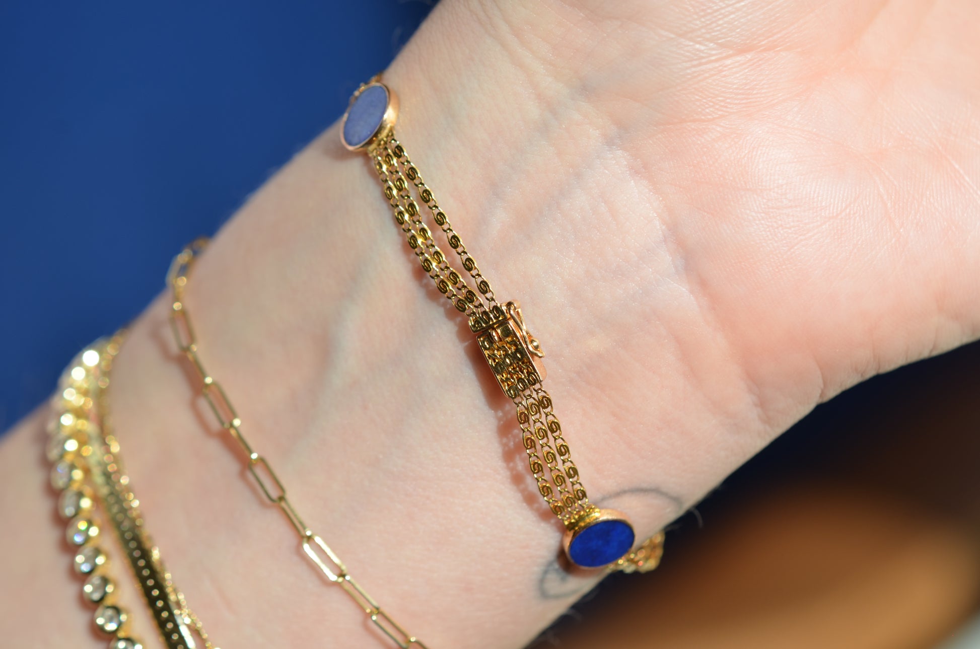 Like a night sky dotted with twinkling stars, deep ultramarine lapis lazuli flecked with golden pyrite has captivated for thousands of years. The warm yellow gold of the bezels and bracelet is the perfect complement to the cool blue of the stone. With swirling lines and bold presence, this bracelet would be perfect alone or in a stack.