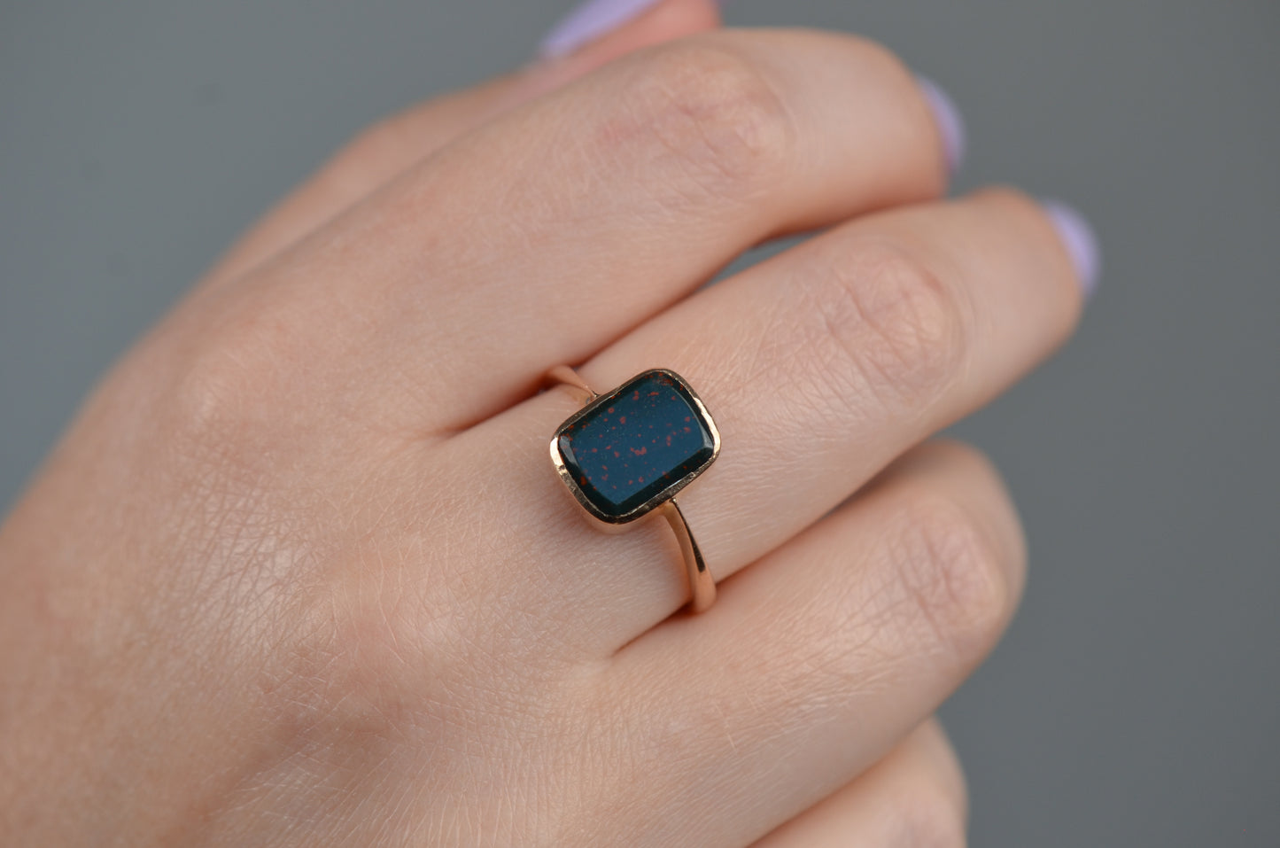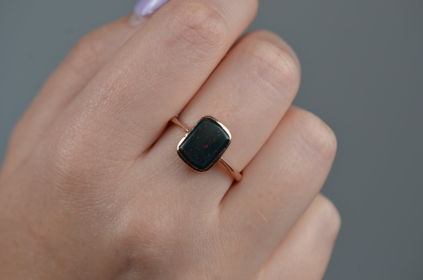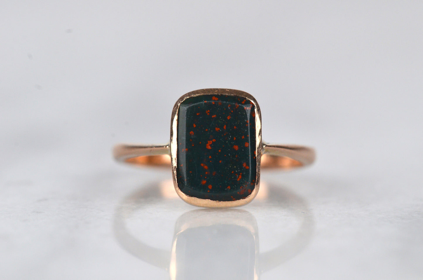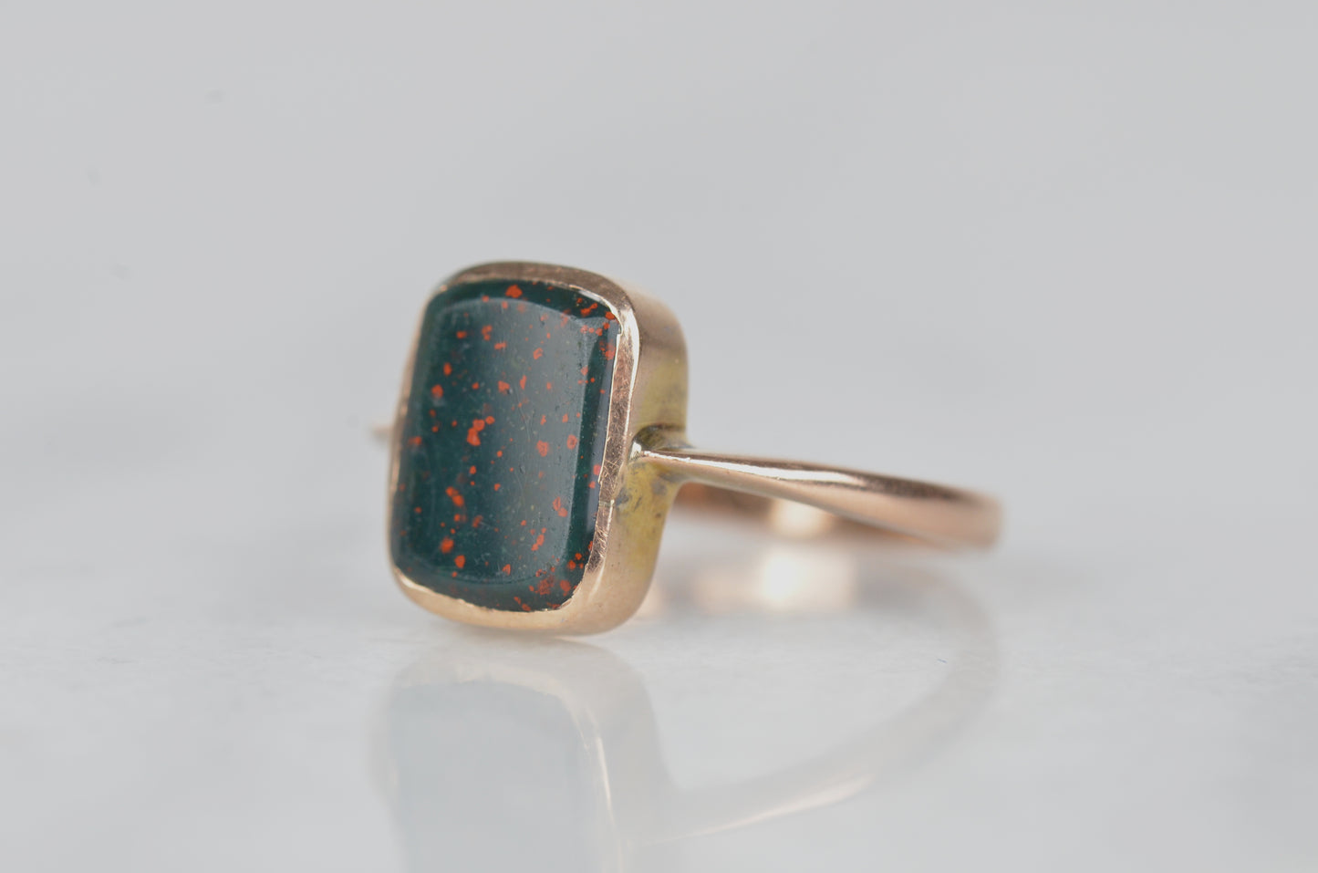 Rich and moody, we love the red-flecked field of inky green that makes bloodstone so unique and mysterious. In this Victorian-inspired ring, the stone takes centre stage in a simple bezel setting with a plain band that pinches at the shoulders to draw the eye further in. Bloodstone, an alternate birthstone for March, has been worn for amuletic purposes (believed to have healing powers, especially for open wounds) for thousands of years across many cultures. While we can't vouch for those particular virtues, we're all in on the dramatic look.