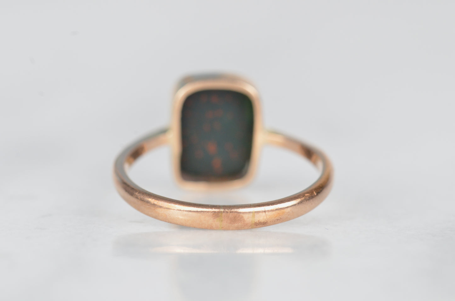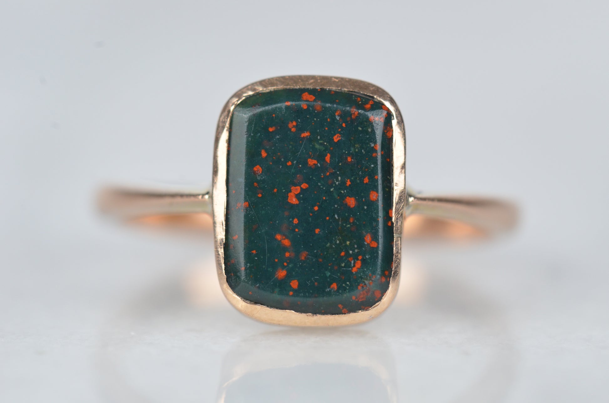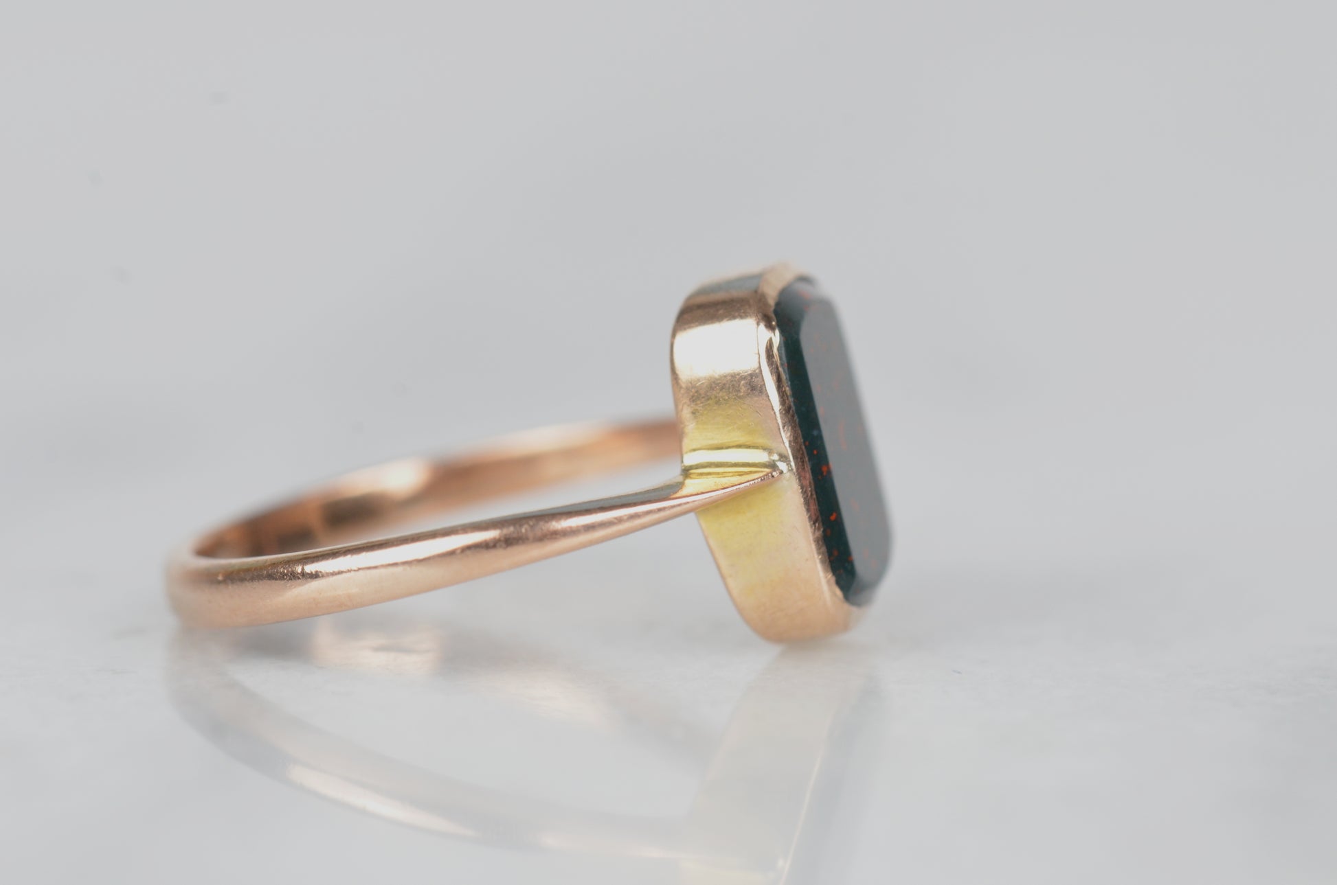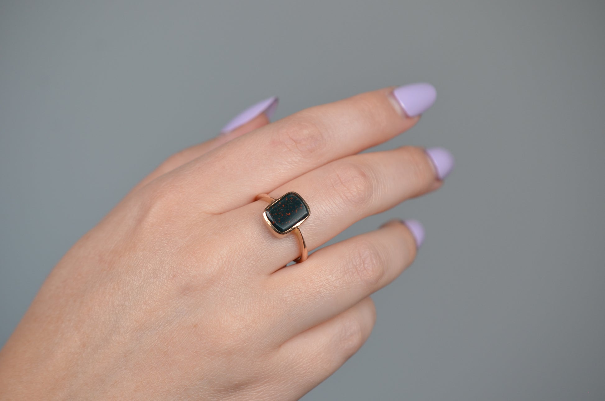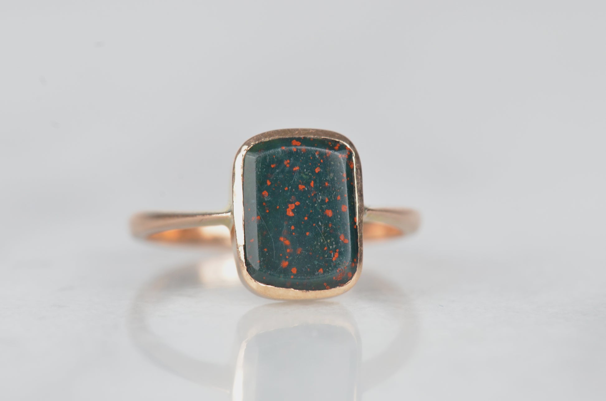 Rich and moody, we love the red-flecked field of inky green that makes bloodstone so unique and mysterious. In this Victorian-inspired ring, the stone takes centre stage in a simple bezel setting with a plain band that pinches at the shoulders to draw the eye further in. Bloodstone, an alternate birthstone for March, has been worn for amuletic purposes (believed to have healing powers, especially for open wounds) for thousands of years across many cultures. While we can't vouch for those particular virtues, we're all in on the dramatic look.