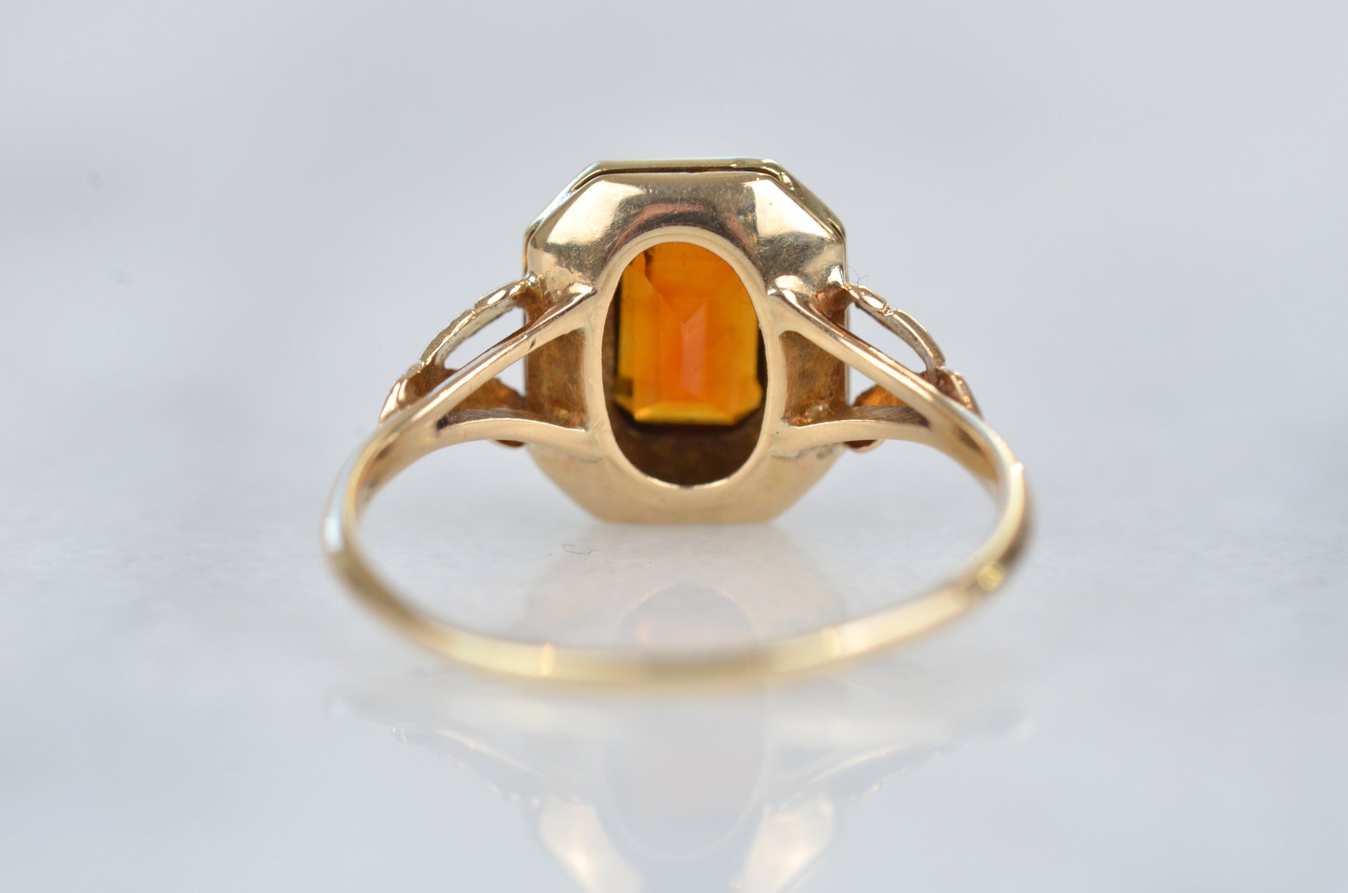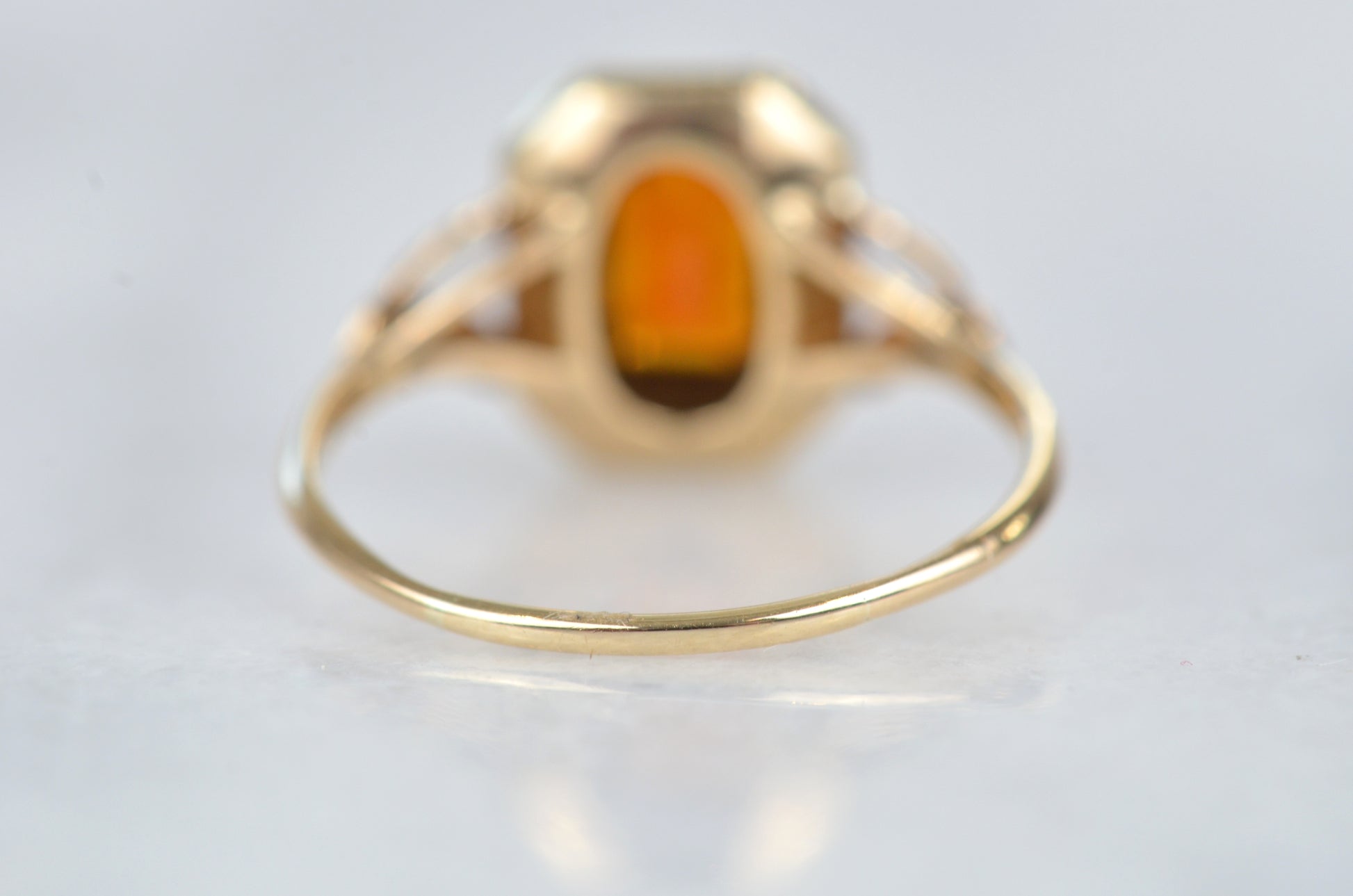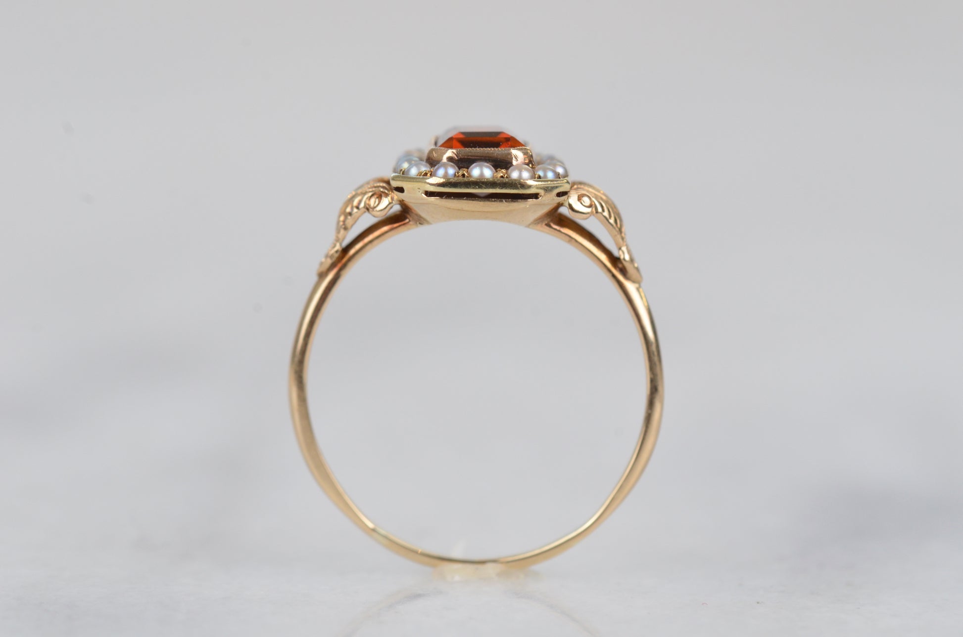 A luxurious cognac-coloured citrine in a crisp emerald cut and milgrained bezel is softened by a halo of seed pearls in this antique-inspired late 20th century ring. Unlike its sunnier yellow siblings, the deep warm tones of this gemstone evoke worn, plush leather chairs, dark wood bookcases, and a lowball of whiskey.