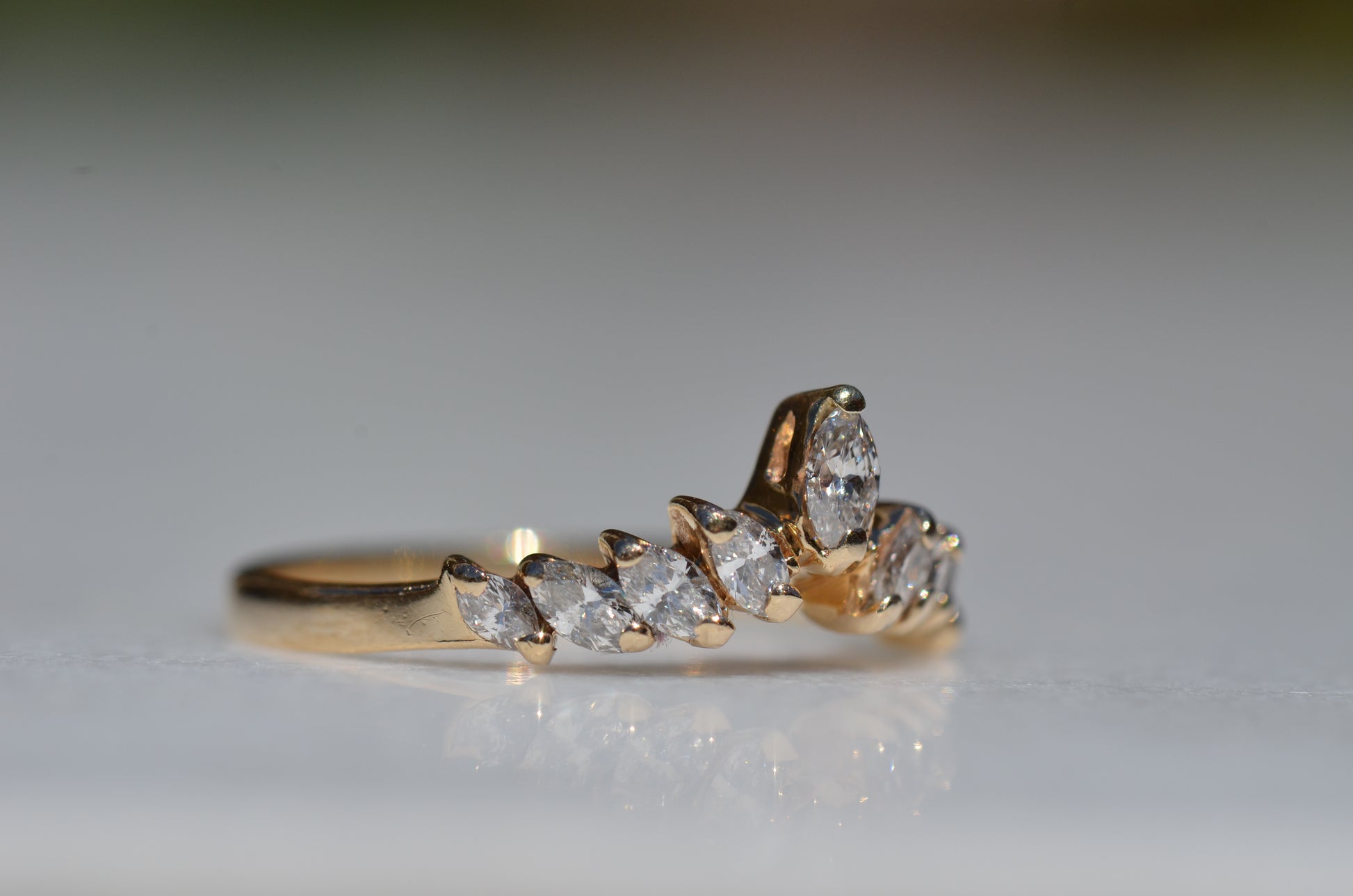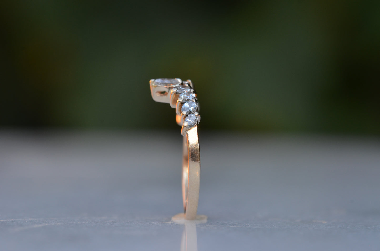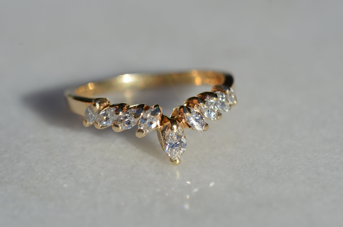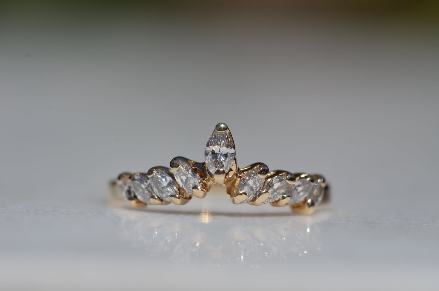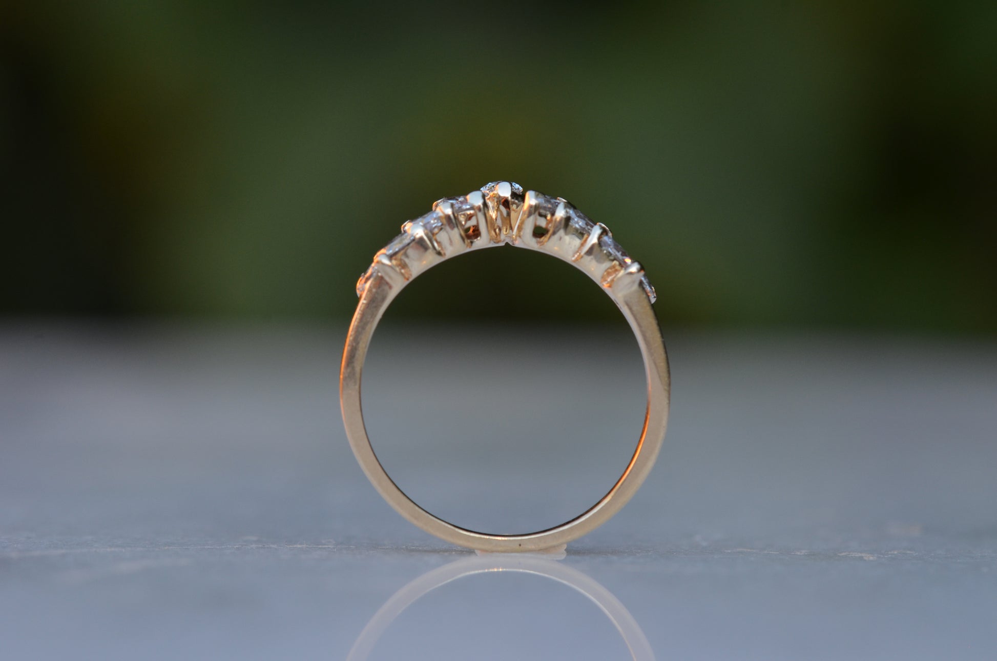 Positively striking, this dipped (or "contour") band showcases a spray of marquise-cut diamonds radiating out from the centre, allowing it to serve as the perfect enhancement to another ring - though not with such a big dip as to make it look as though something is missing if worn alone. Perfectly styled solo, below another ring as a dramatic base or above another as a crown, we love the versatility of this vintage piece.
