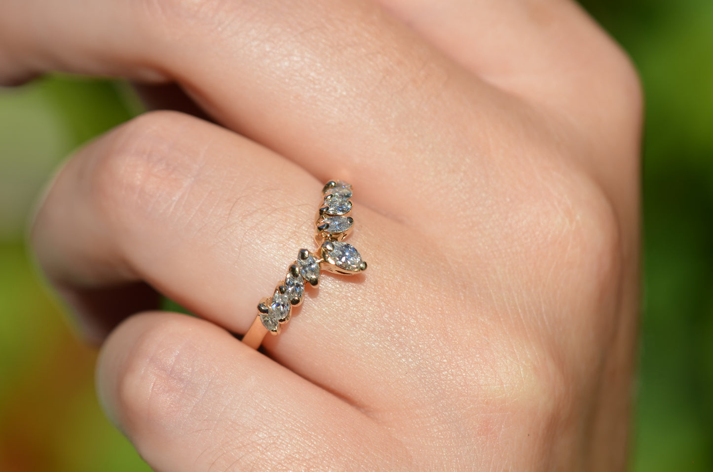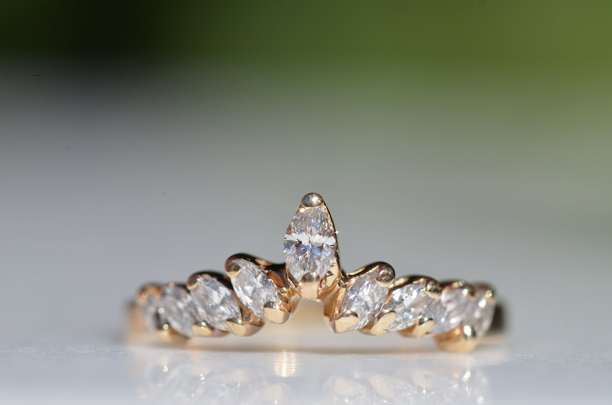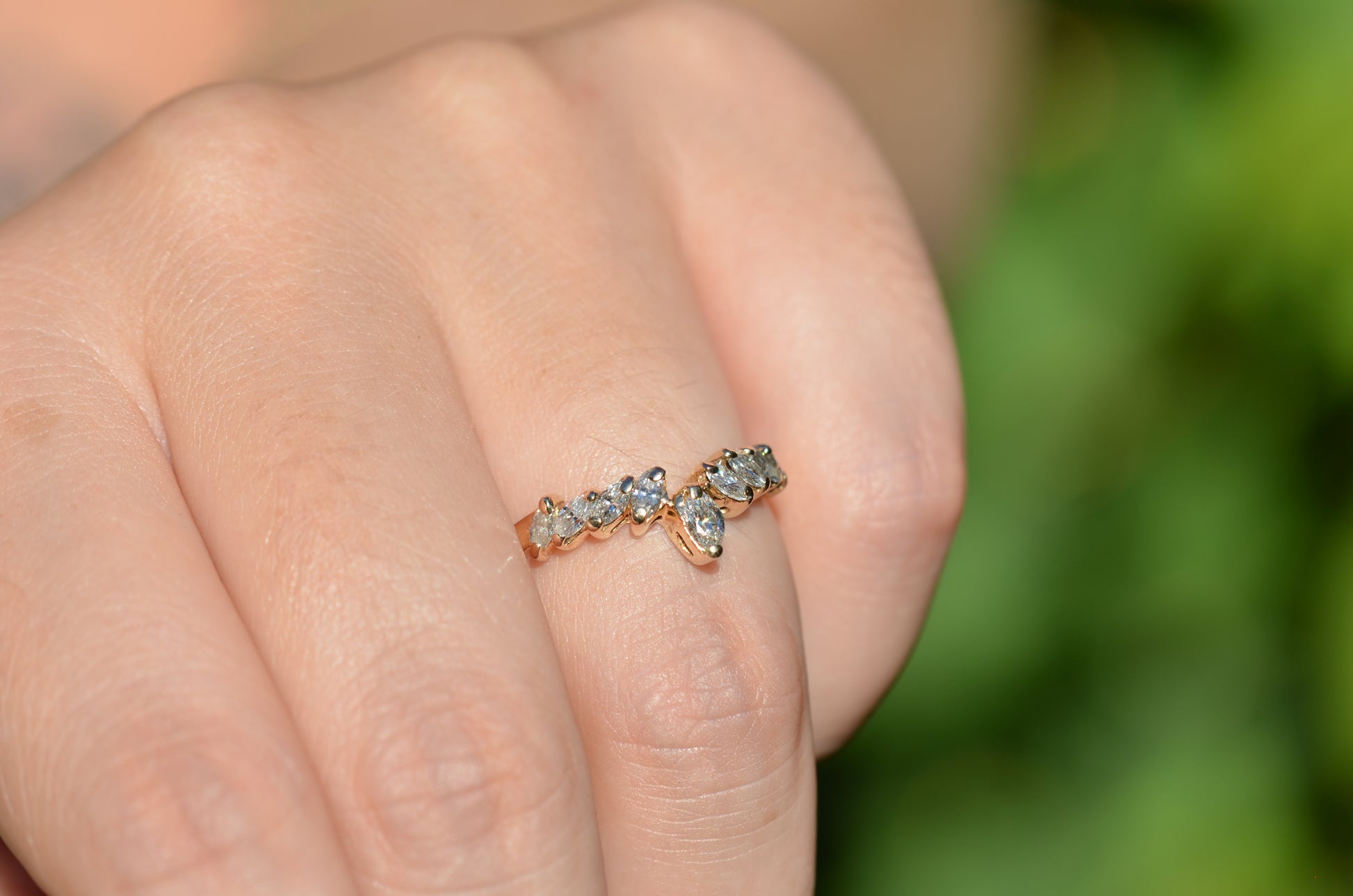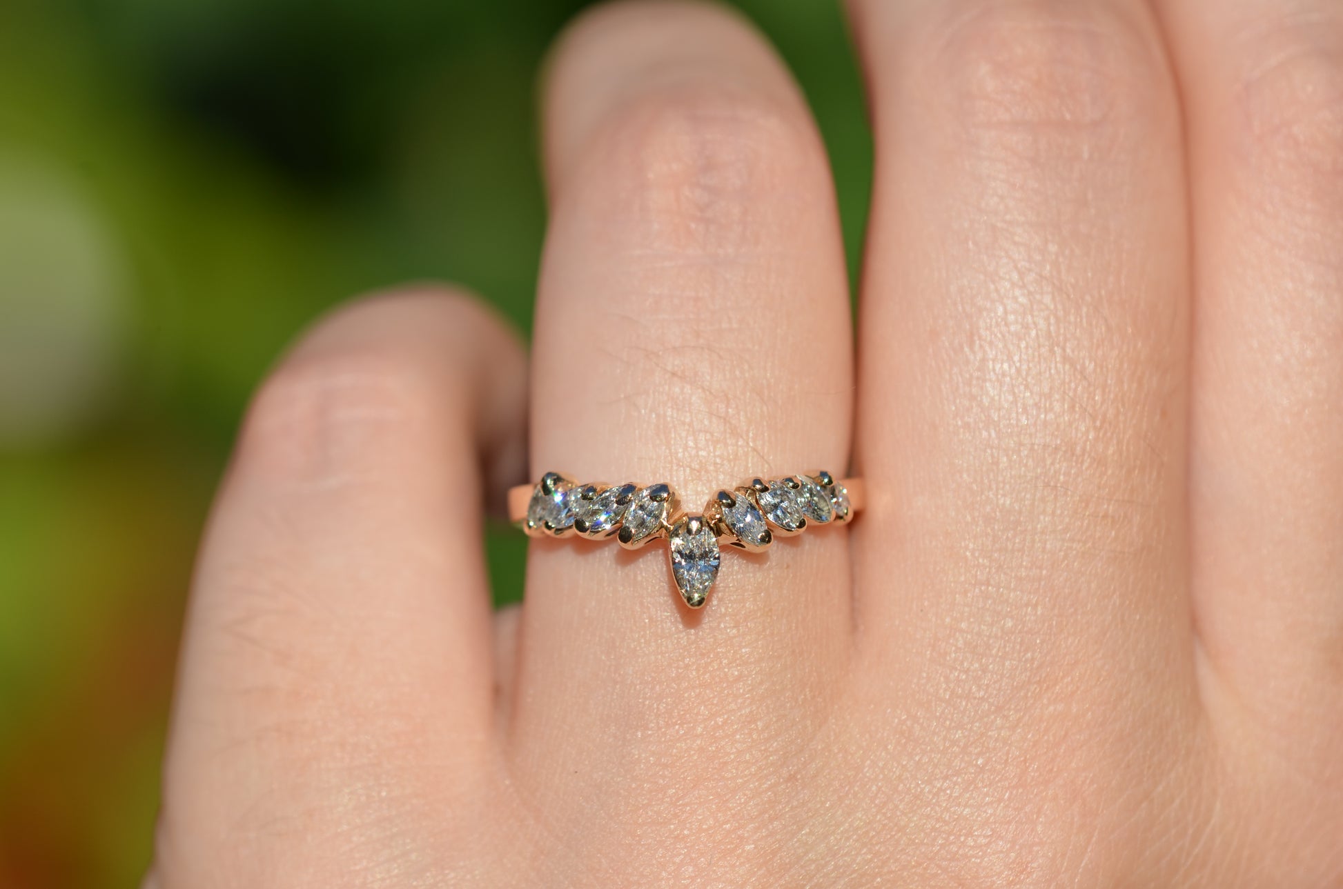Positively striking, this dipped (or "contour") band showcases a spray of marquise-cut diamonds radiating out from the centre, allowing it to serve as the perfect enhancement to another ring - though not with such a big dip as to make it look as though something is missing if worn alone. Perfectly styled solo, below another ring as a dramatic base or above another as a crown, we love the versatility of this vintage piece.
