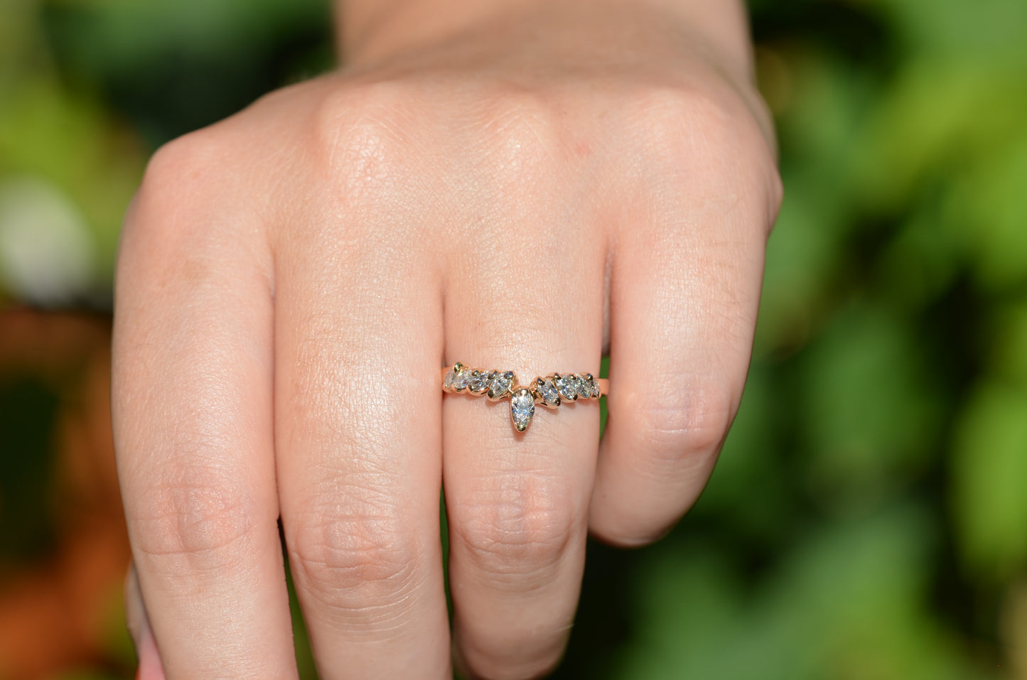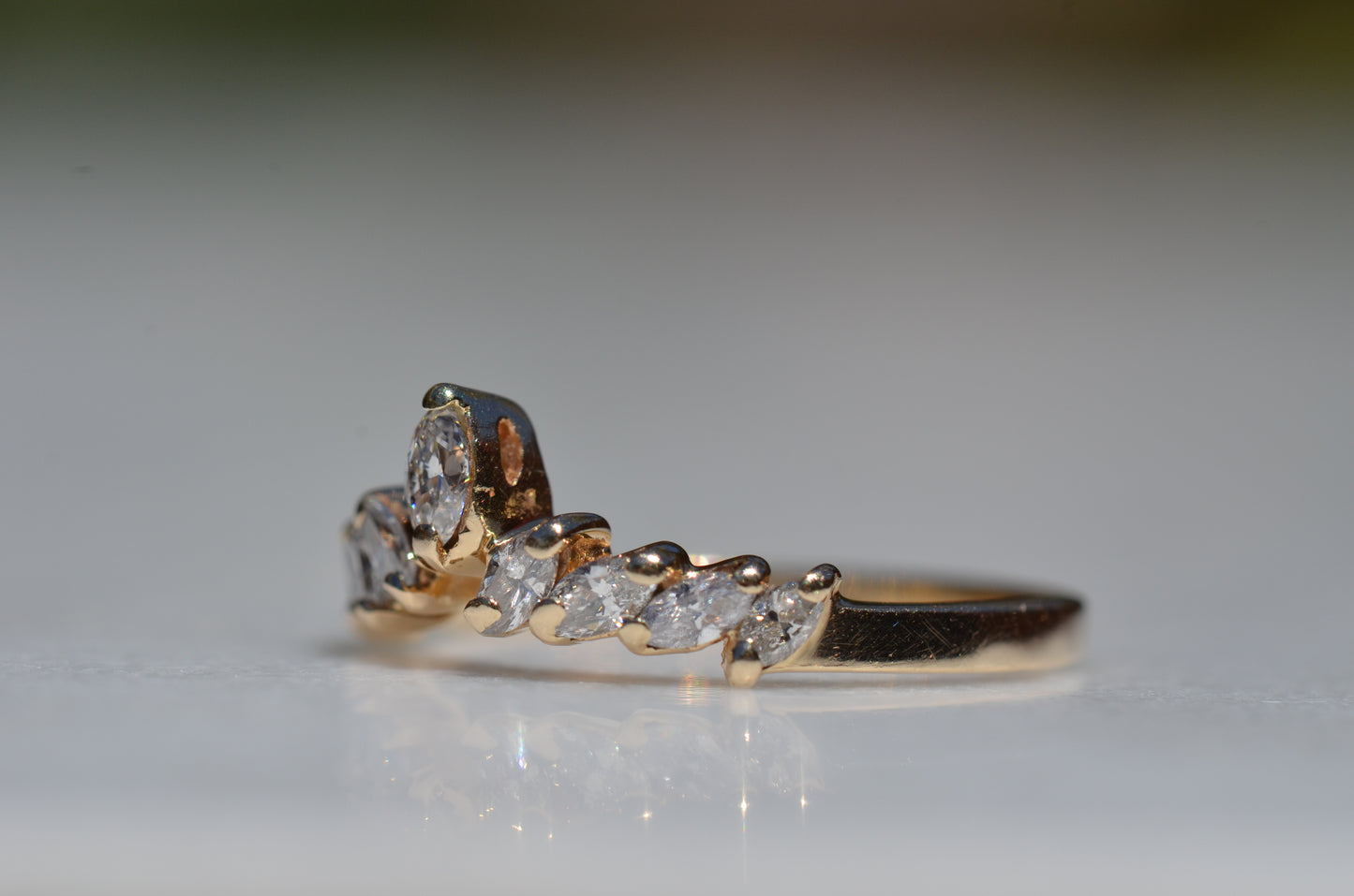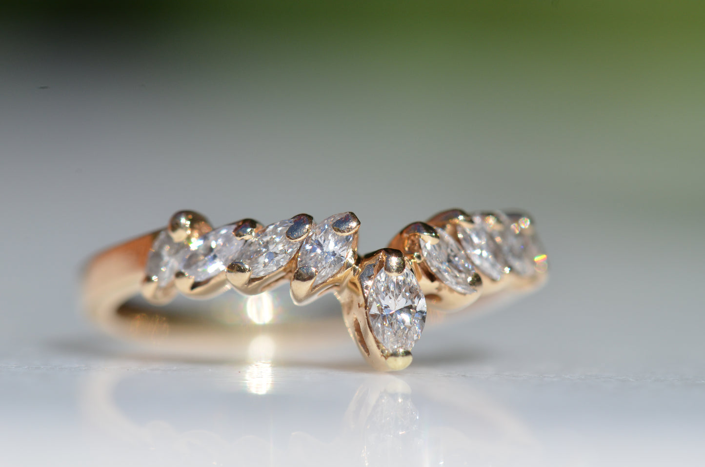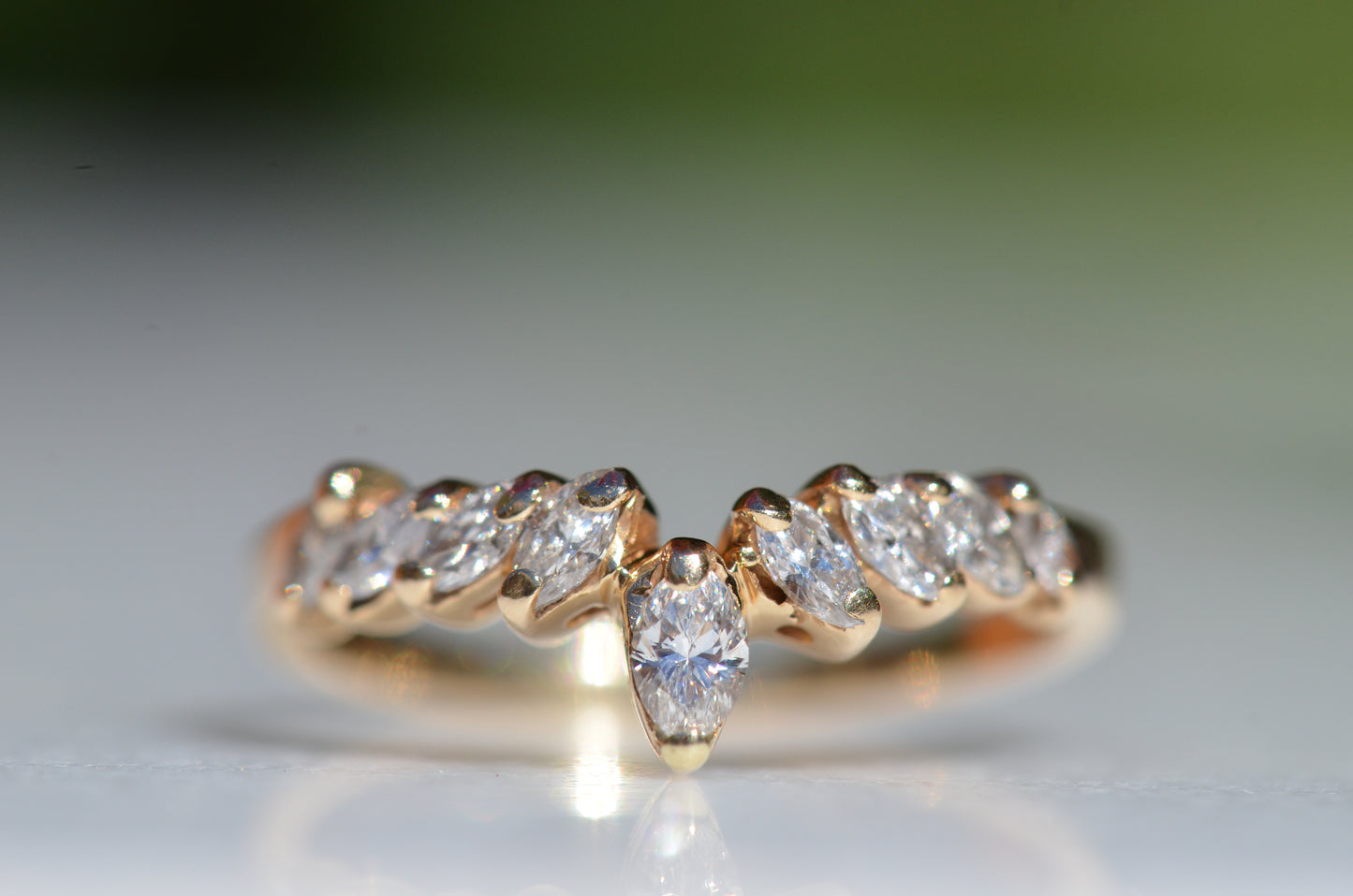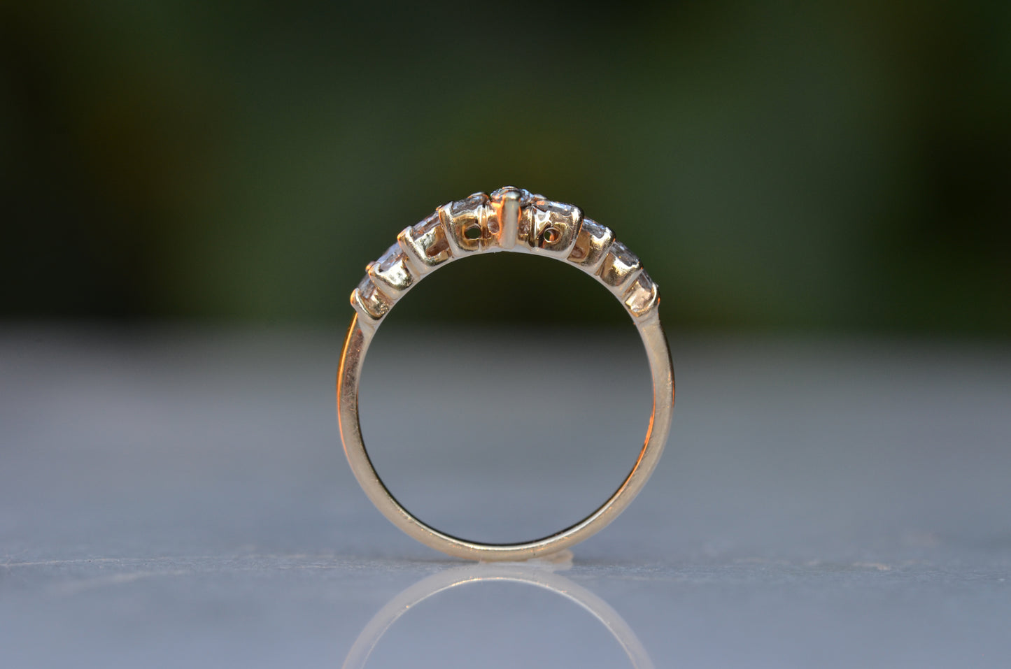 Positively striking, this dipped (or "contour") band showcases a spray of marquise-cut diamonds radiating out from the centre, allowing it to serve as the perfect enhancement to another ring - though not with such a big dip as to make it look as though something is missing if worn alone. Perfectly styled solo, below another ring as a dramatic base or above another as a crown, we love the versatility of this vintage piece.
